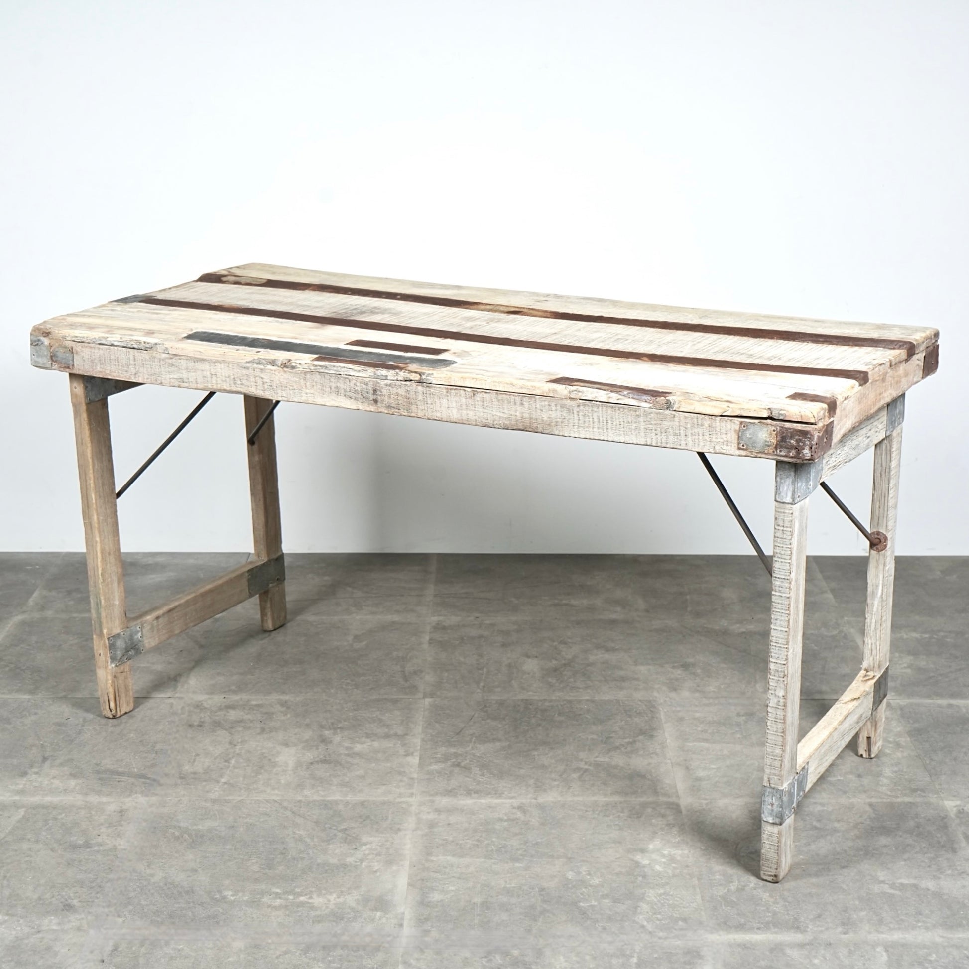 こちらのフォールディングテーブルは、長い年月を経過した無垢材を長時間ブリーチすることで完成するSun Finishと呼ばれる技法で仕上げられており、そのユニークな乾いた美しい質感が最大の魅力。