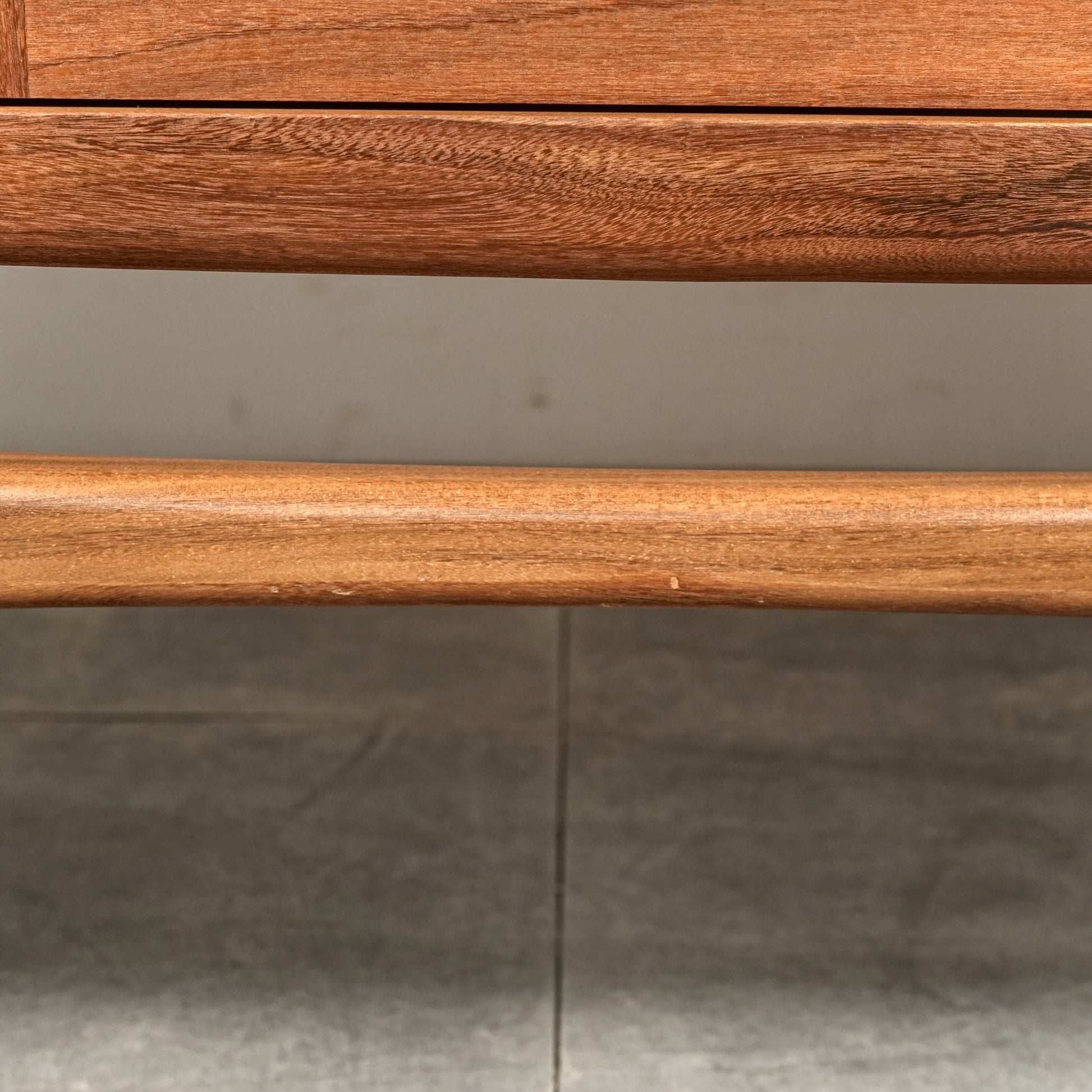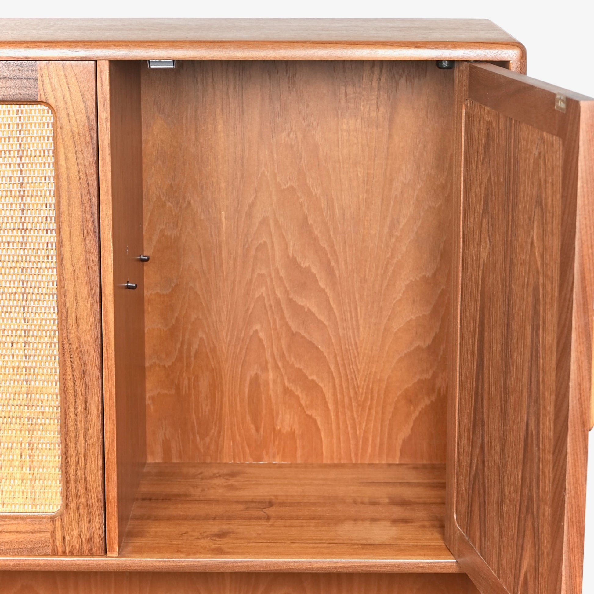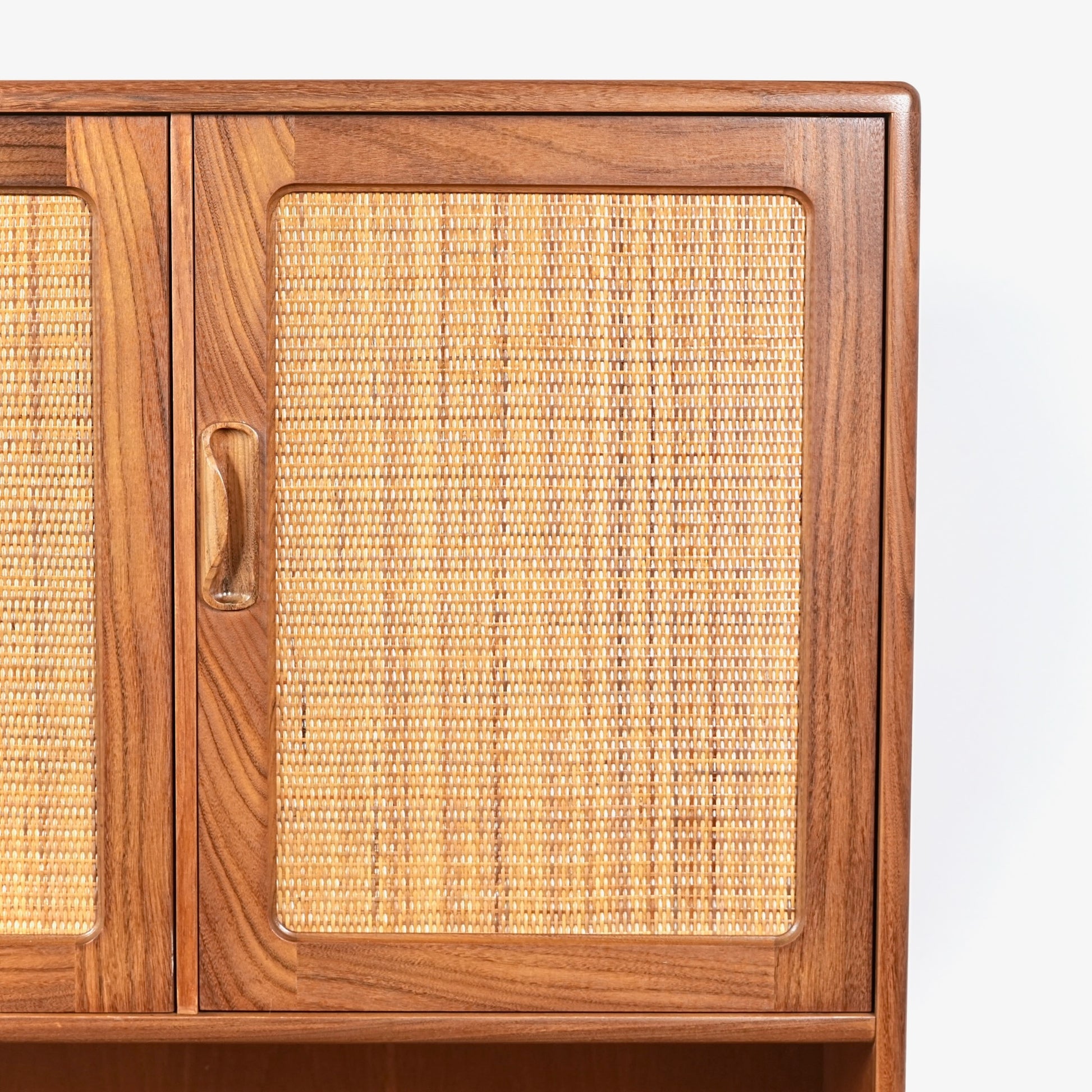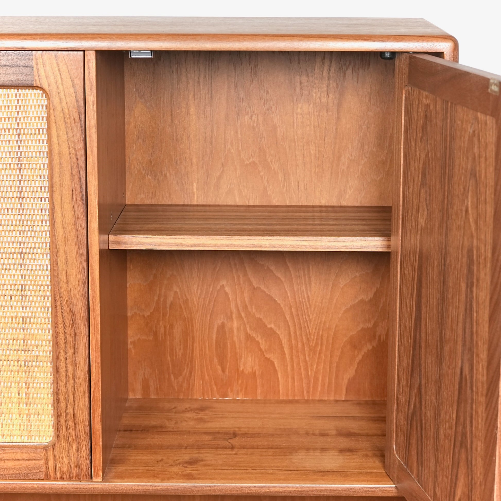 上質なチーク材の美しい木目に加えて、Frescoシリーズの特徴でもある削り出しで作られた可愛らしい取手が印象的で、扉に使用されたラタンという異素材がアクセントとなった本当に見事なデザイン。