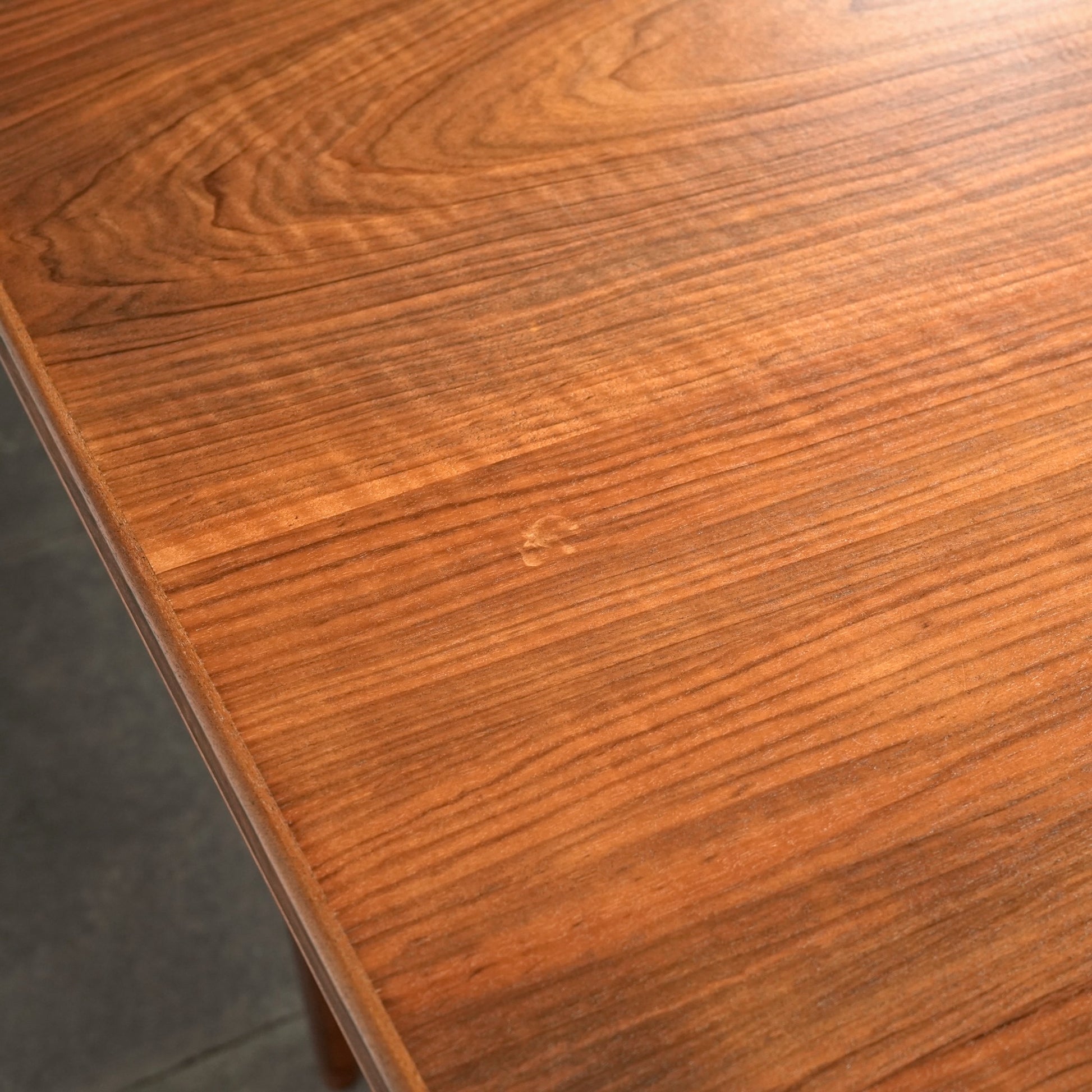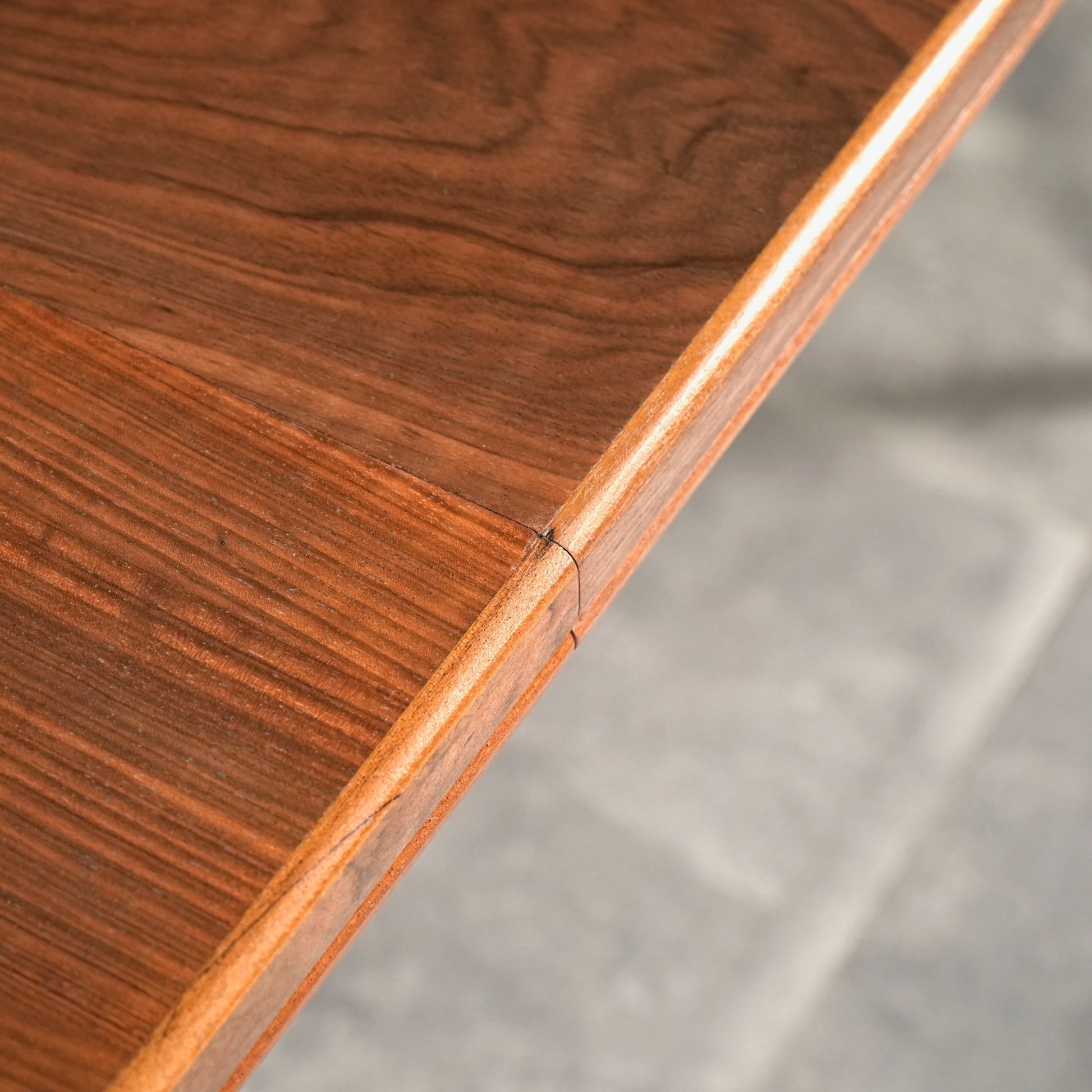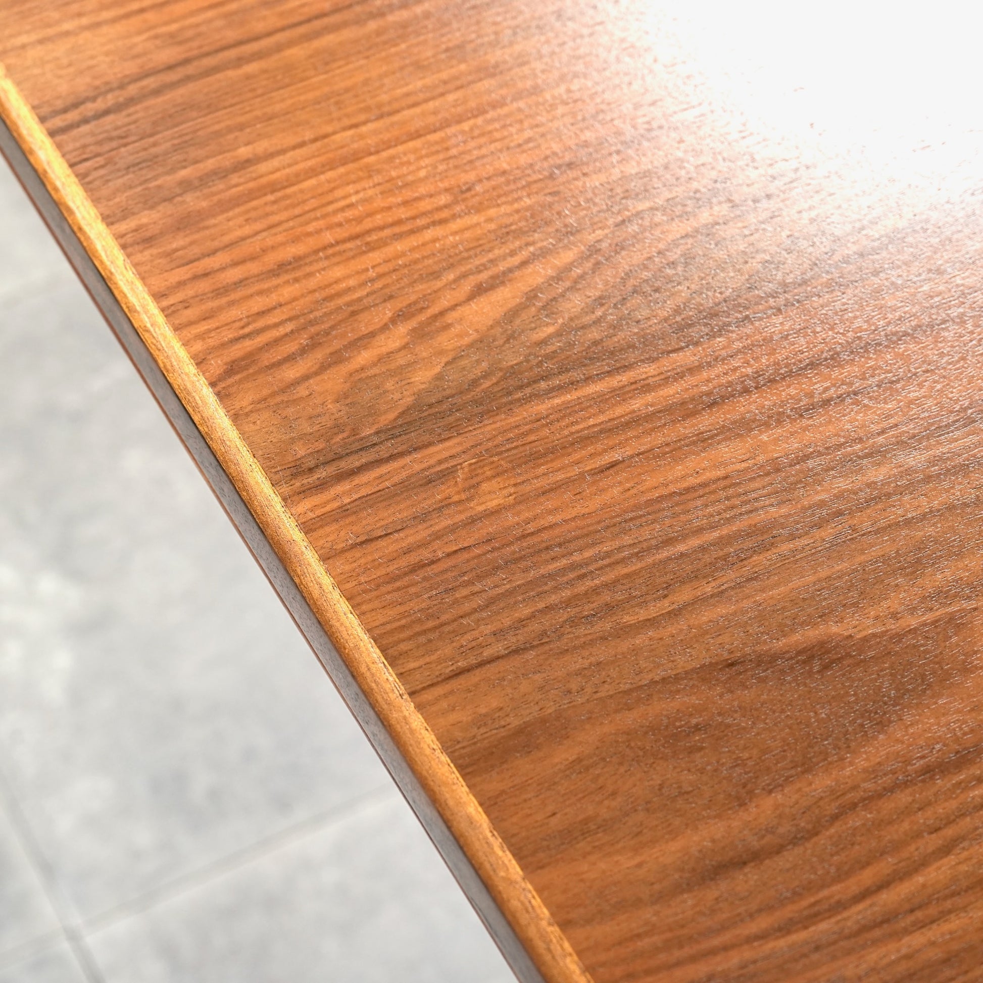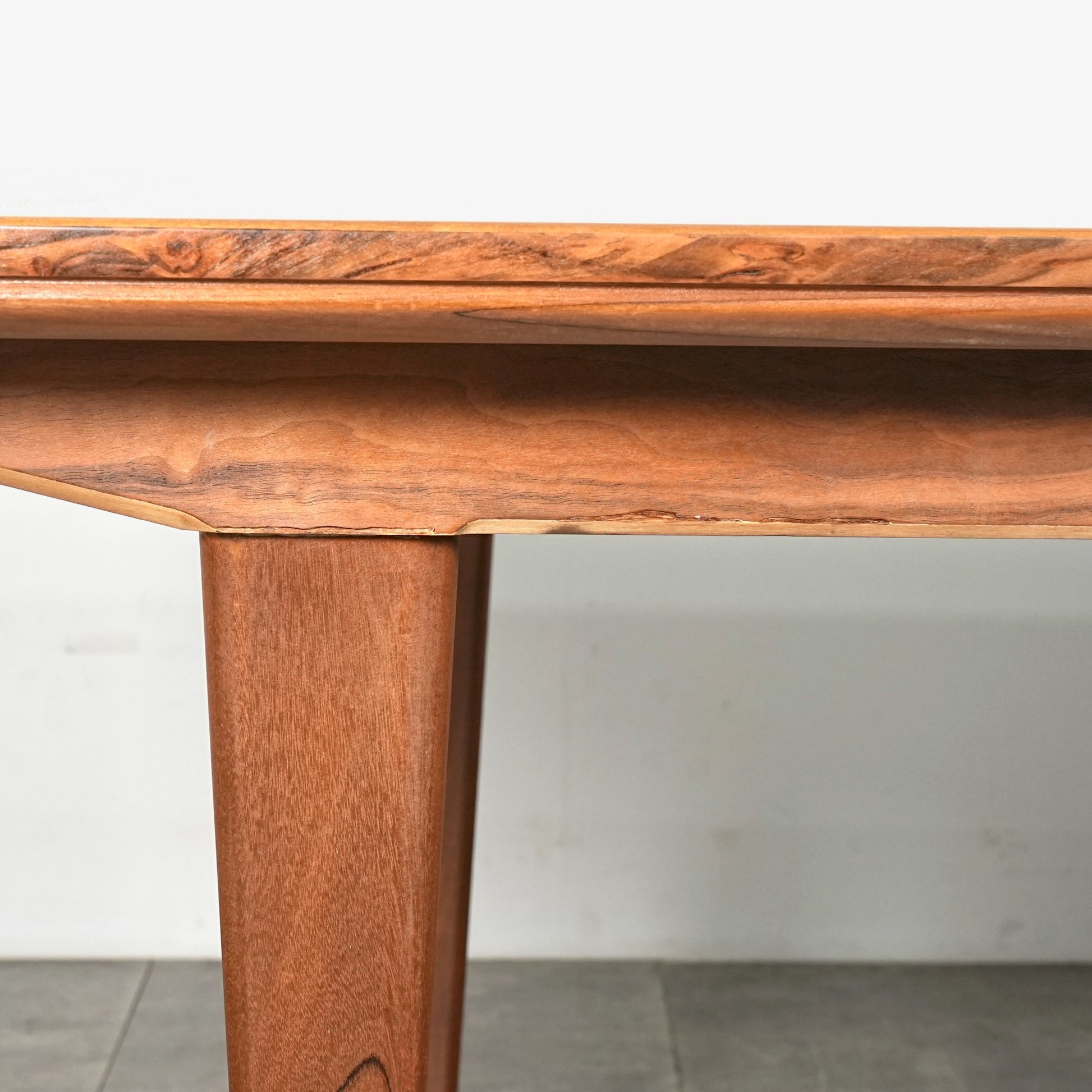 天板は高品質なウォルナット材ならではの見事な木目と質感が印象的で、シャープなフォルムの脚部にはチーク材を使用しており、素材のコントラストも見事なバランス。