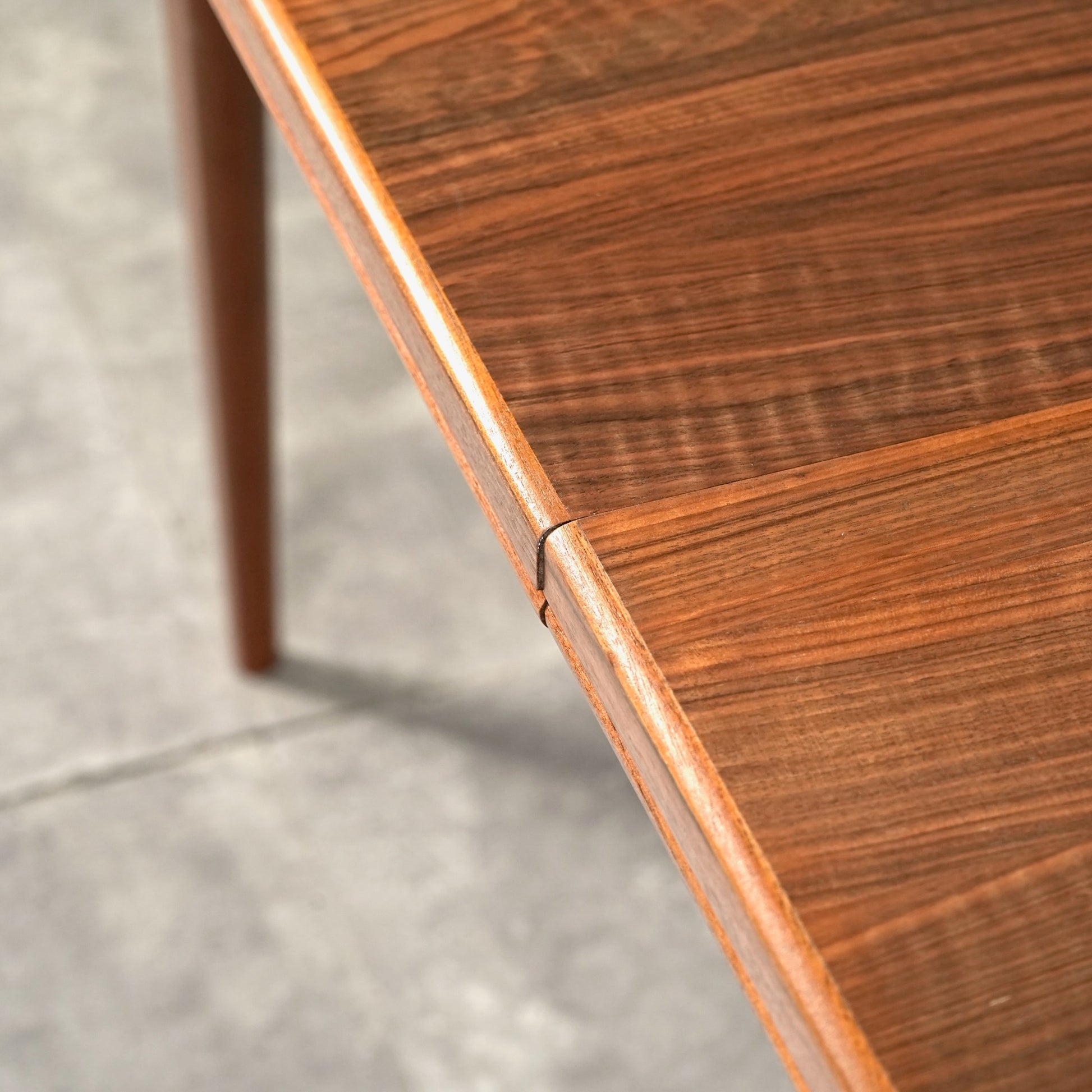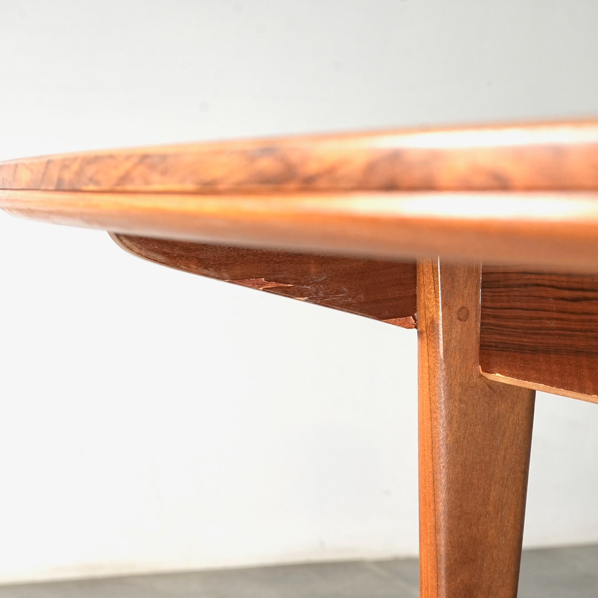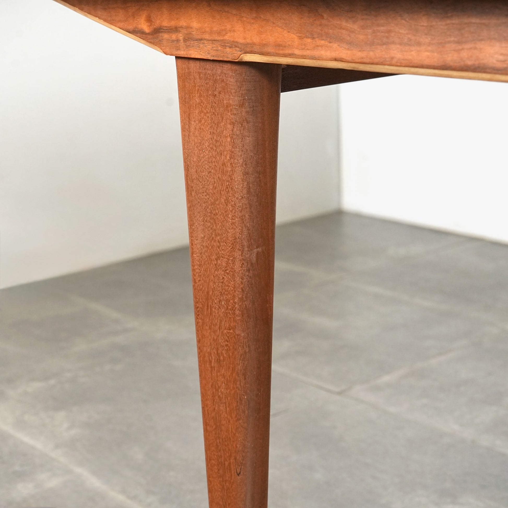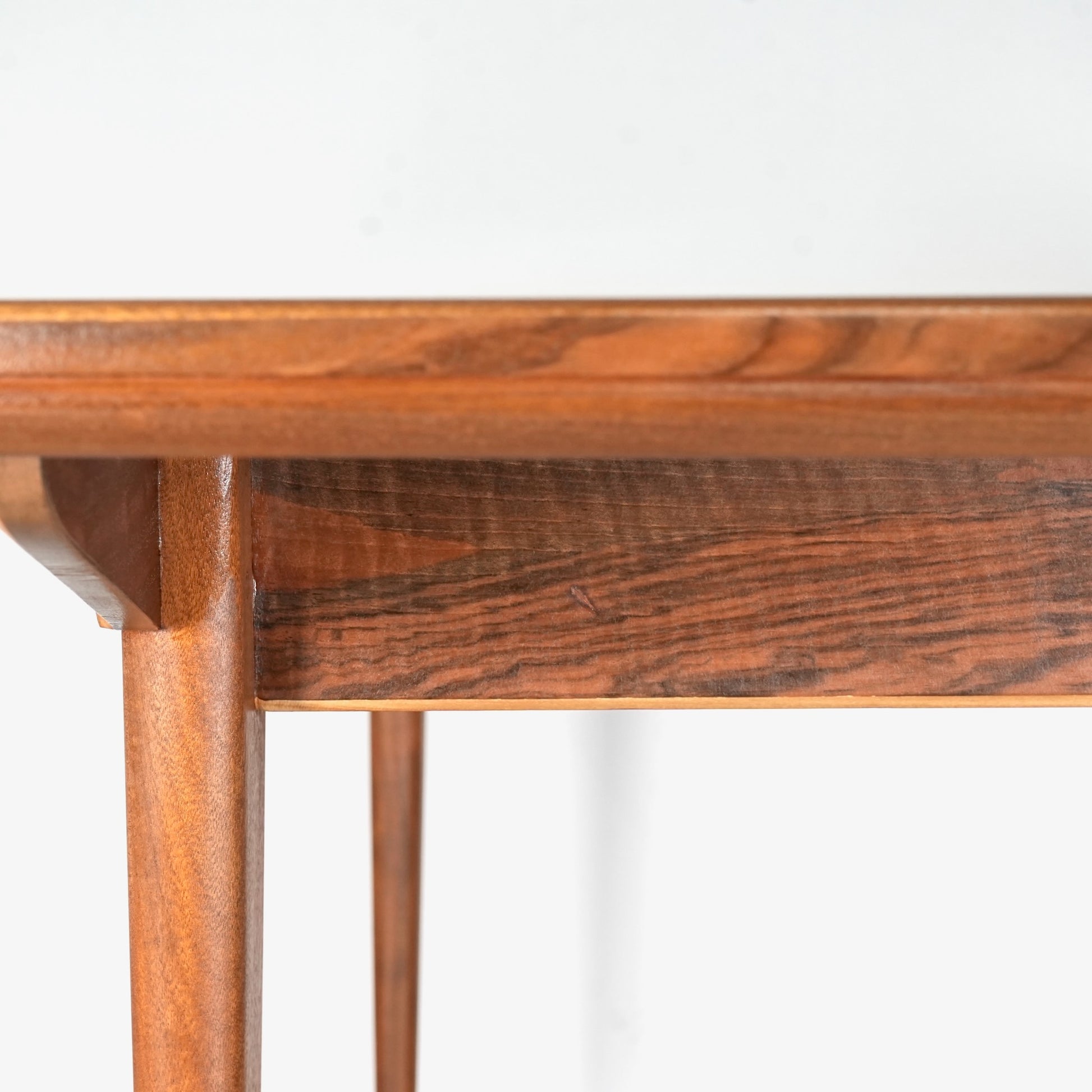 天板は高品質なウォルナット材ならではの見事な木目と質感が印象的で、シャープなフォルムの脚部にはチーク材を使用しており、素材のコントラストも見事なバランス。