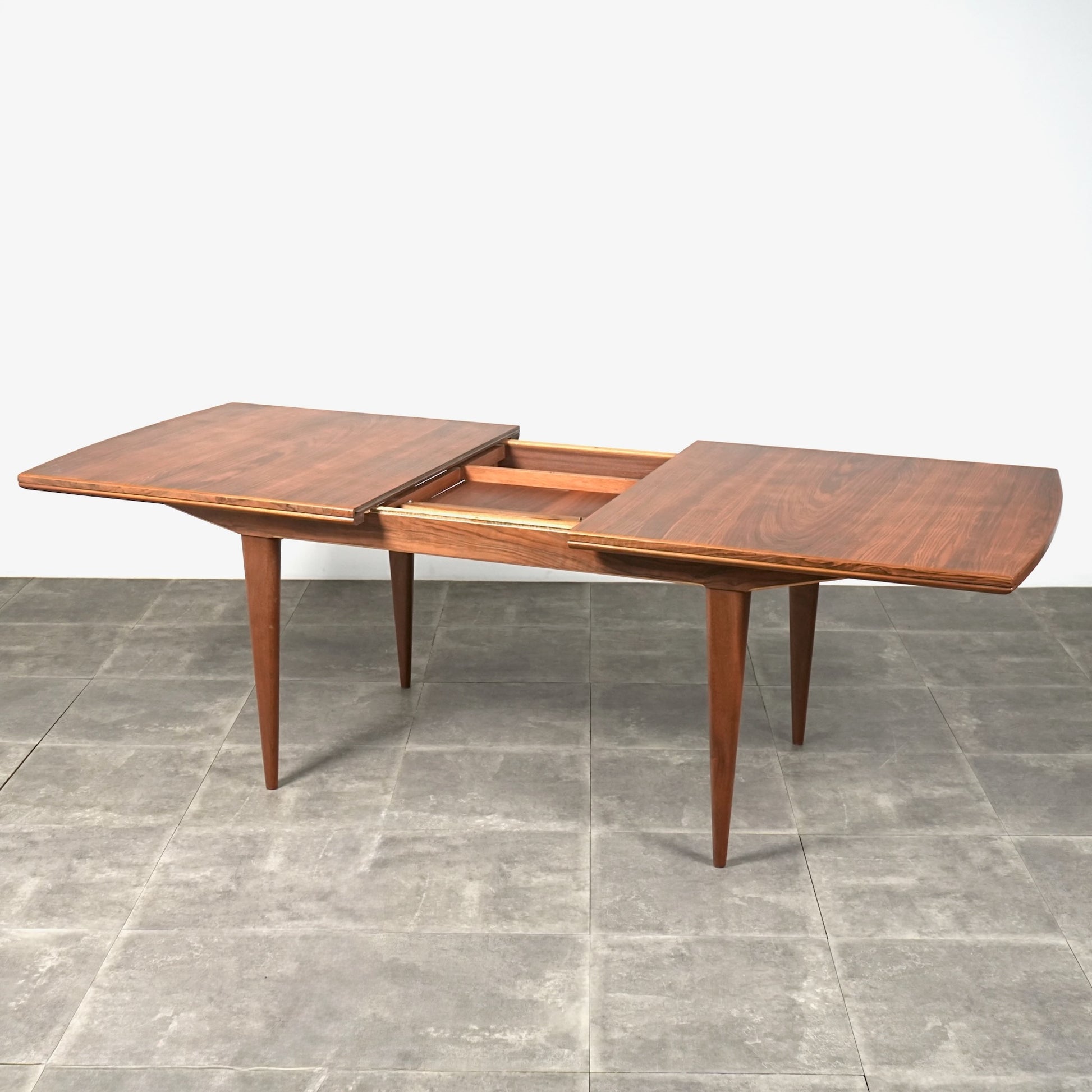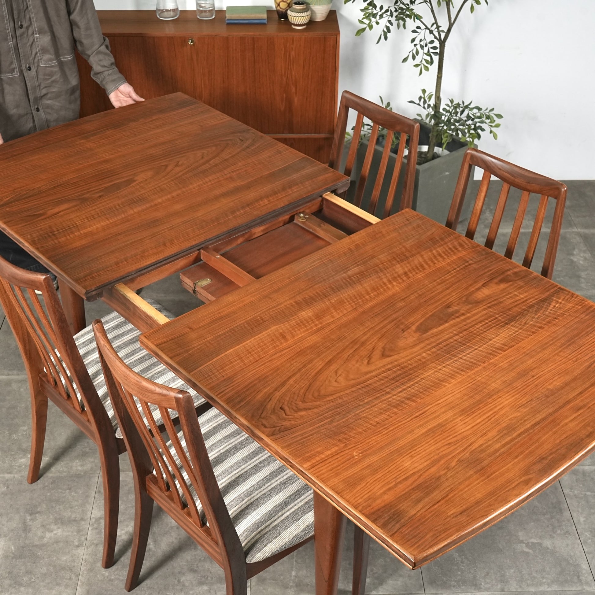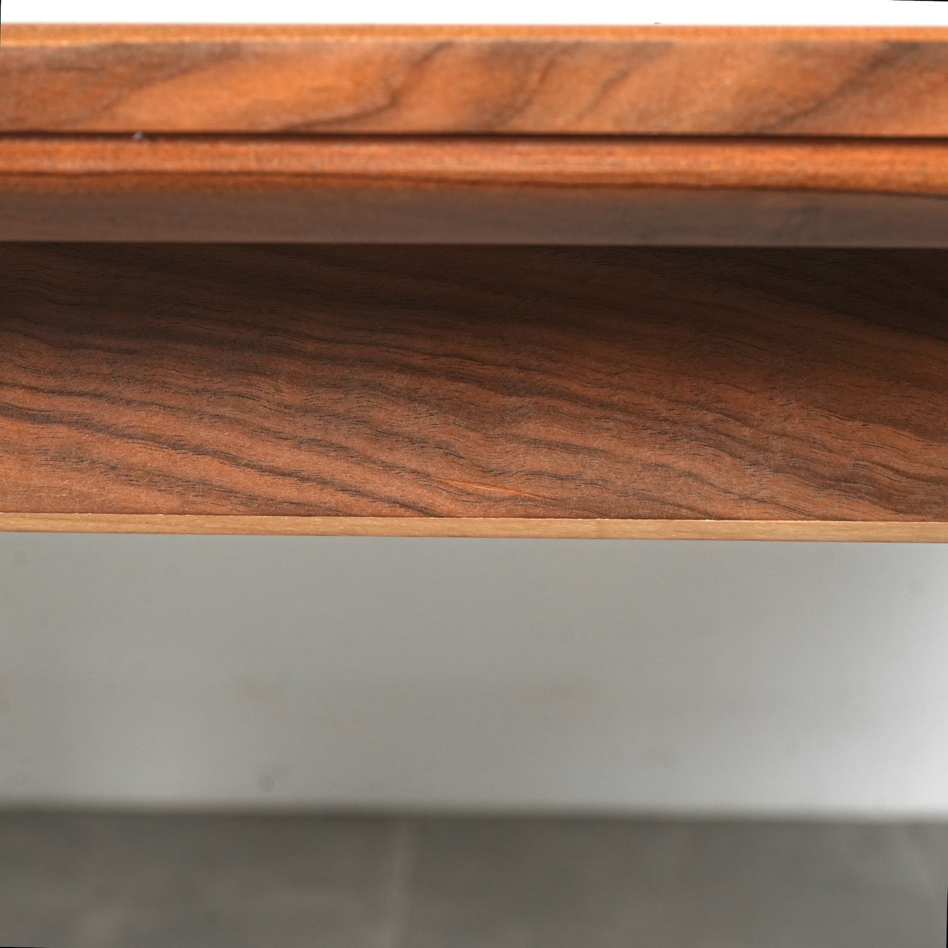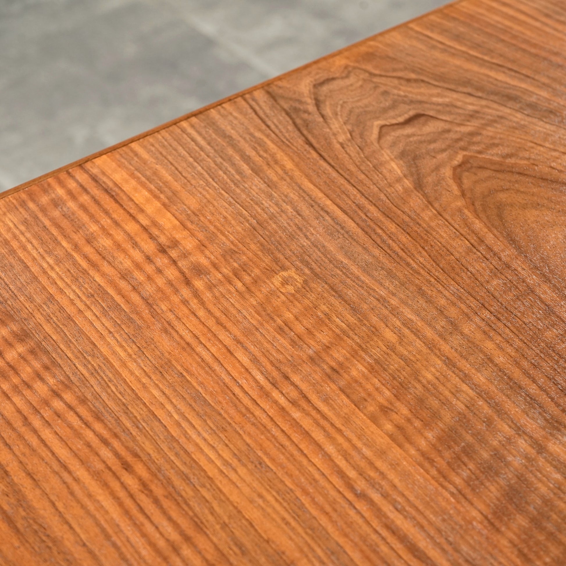 天板は高品質なウォルナット材ならではの見事な木目と質感が印象的で、シャープなフォルムの脚部にはチーク材を使用しており、素材のコントラストも見事なバランス。