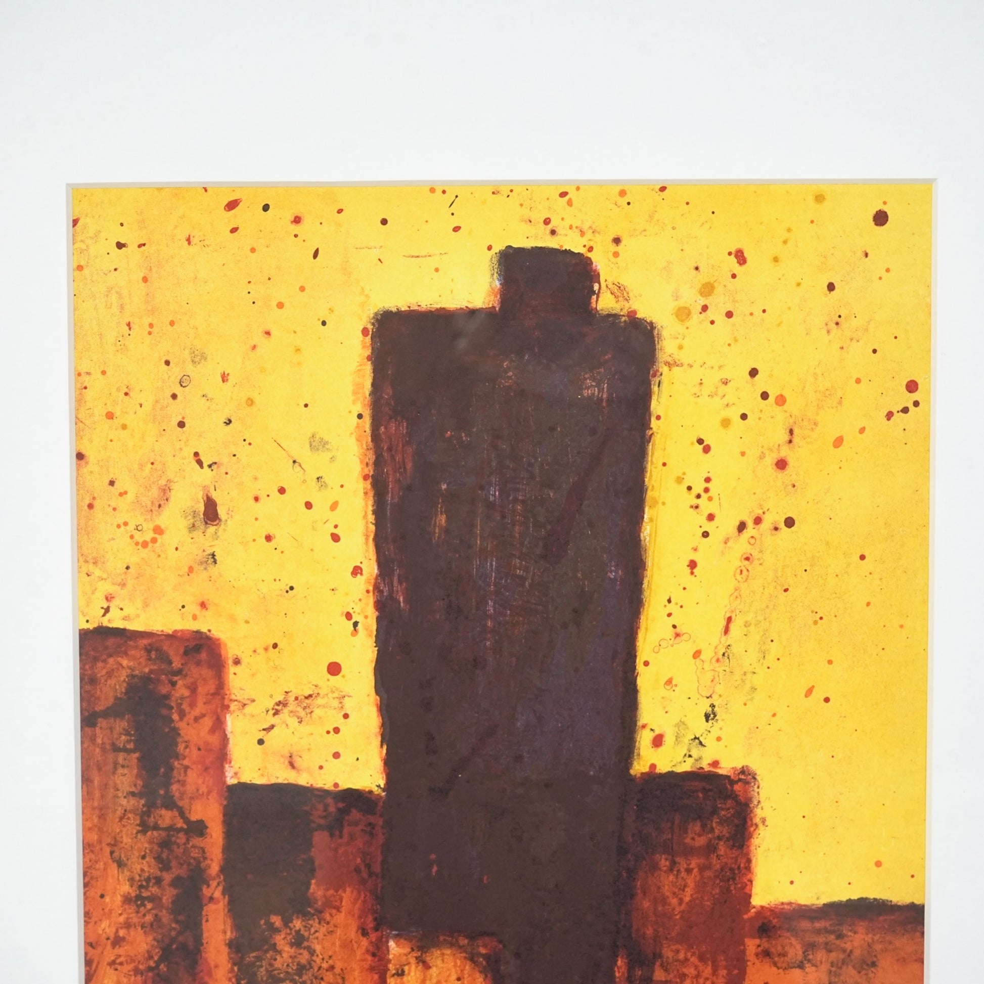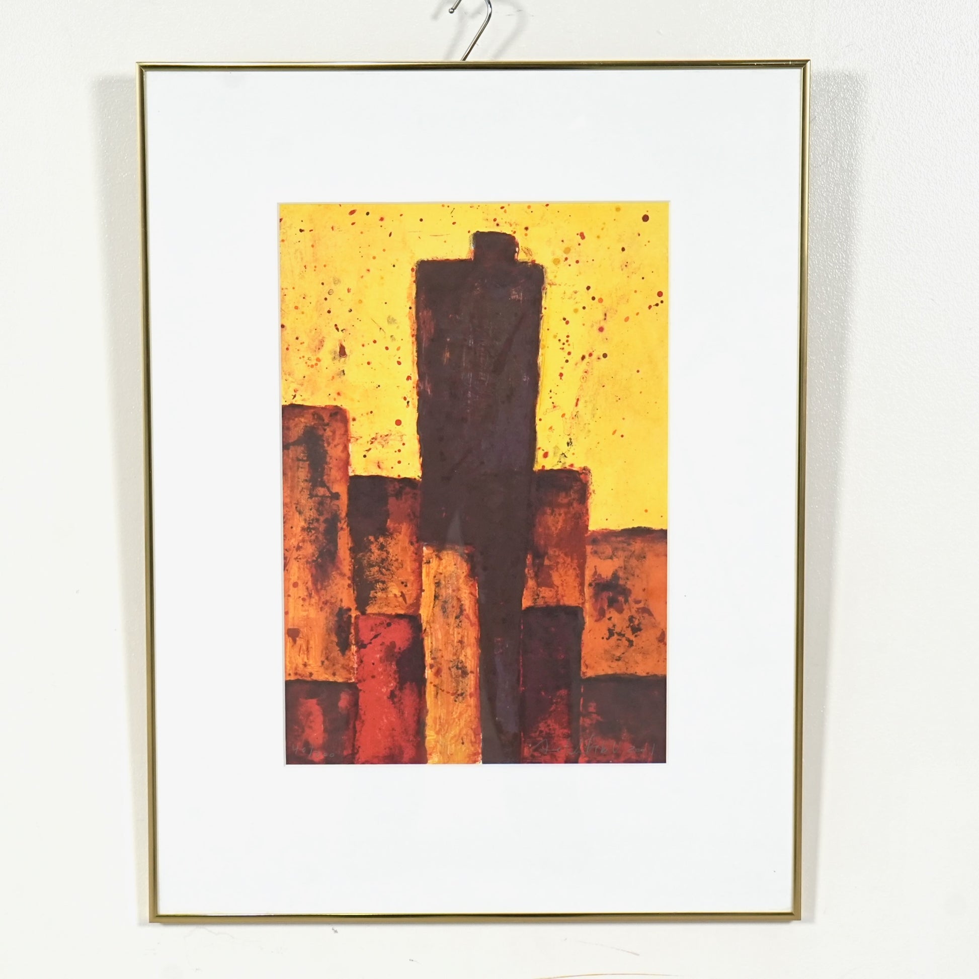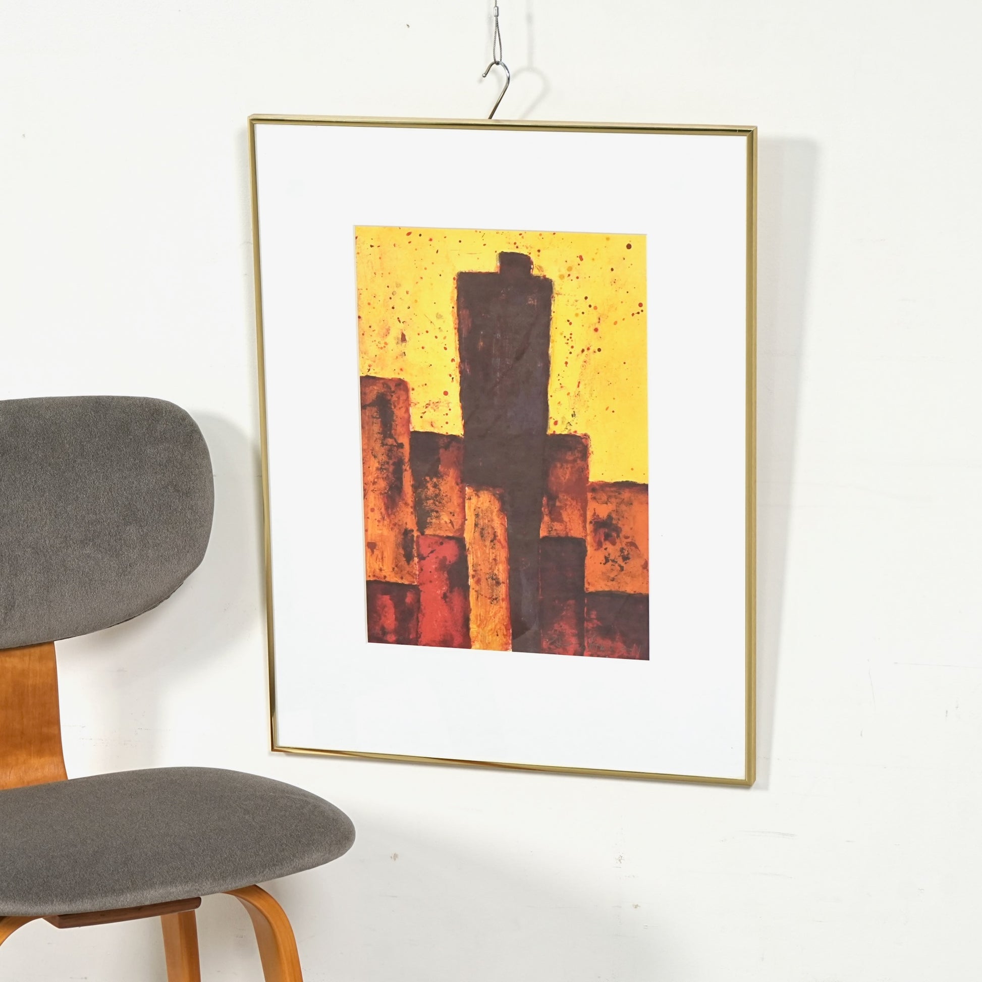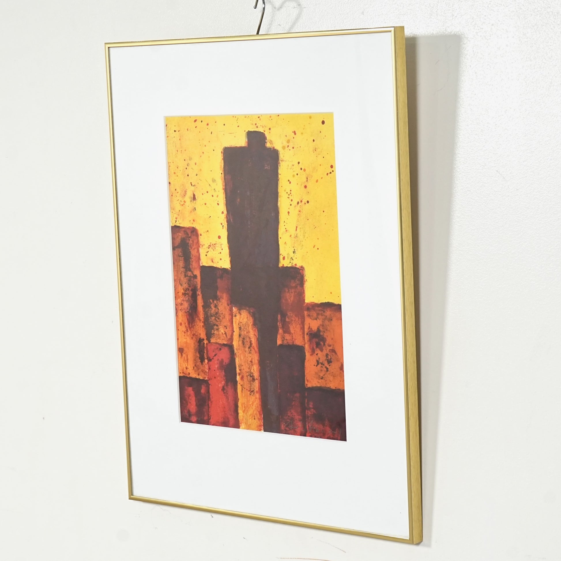 燃えるようなレッドやイエロー、深みのあるブラウンを重ねた構成は都市の風景を連想させる力強い表現で、彼女の特徴である素材感と色彩の対話が存分に感じられる一枚です。