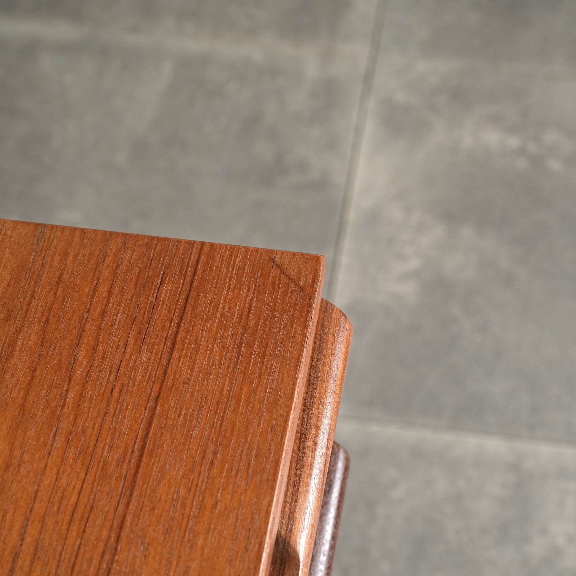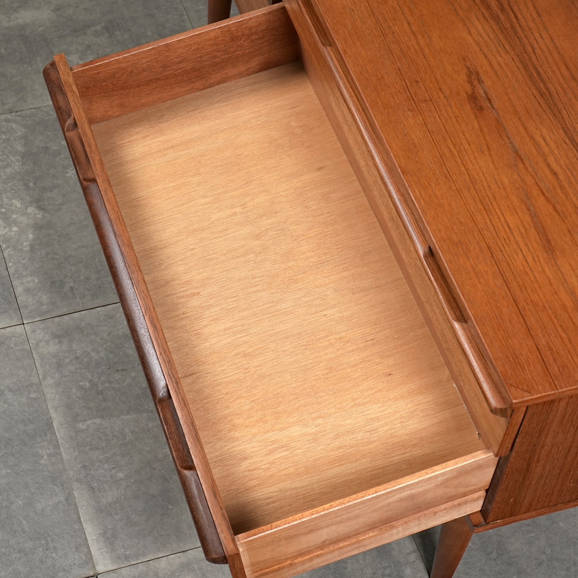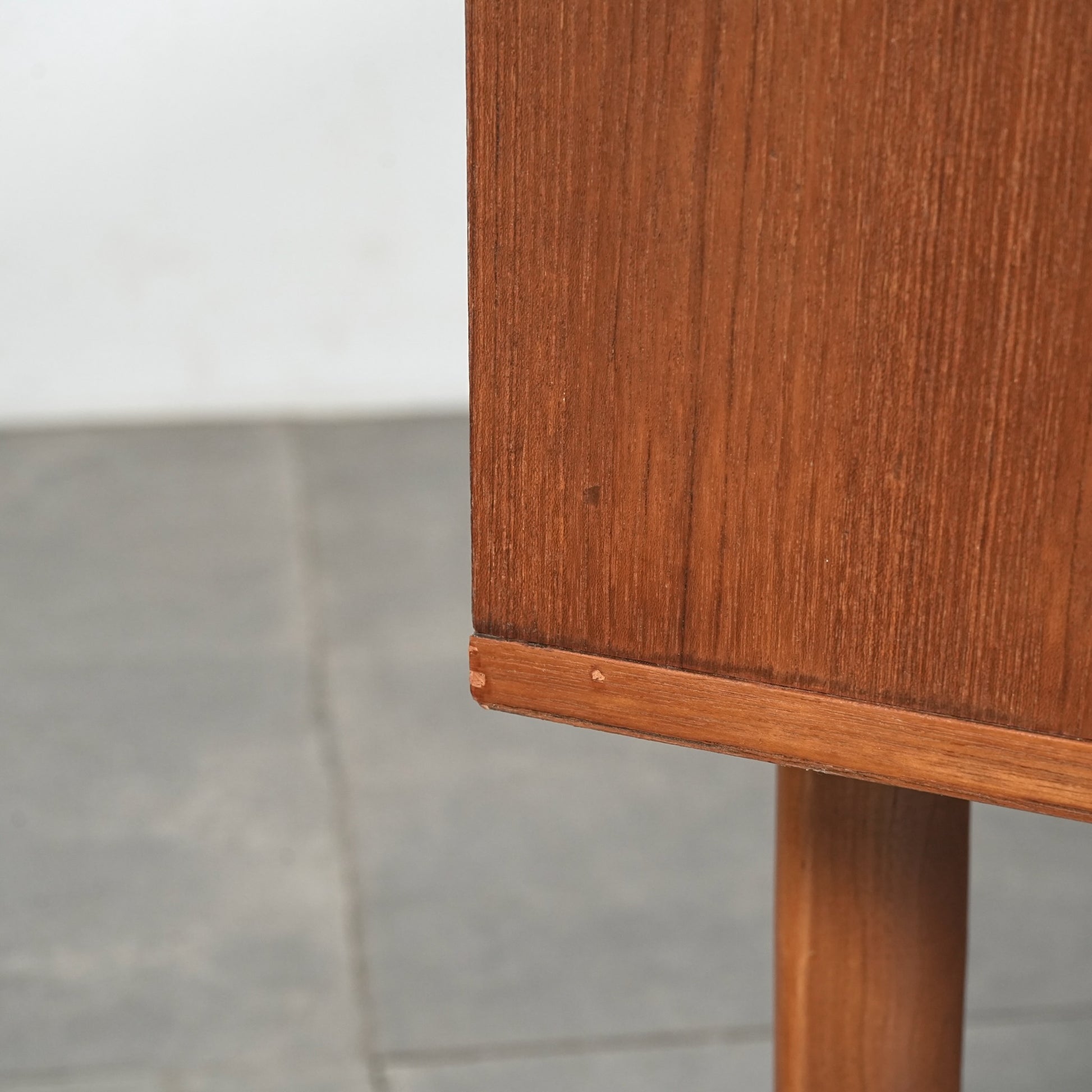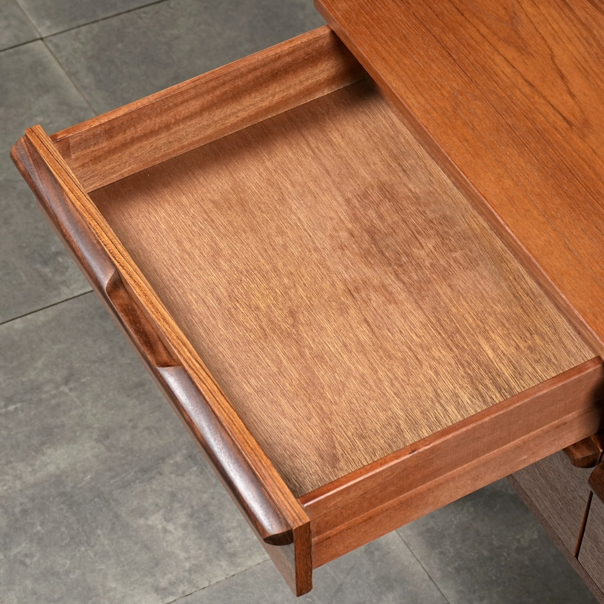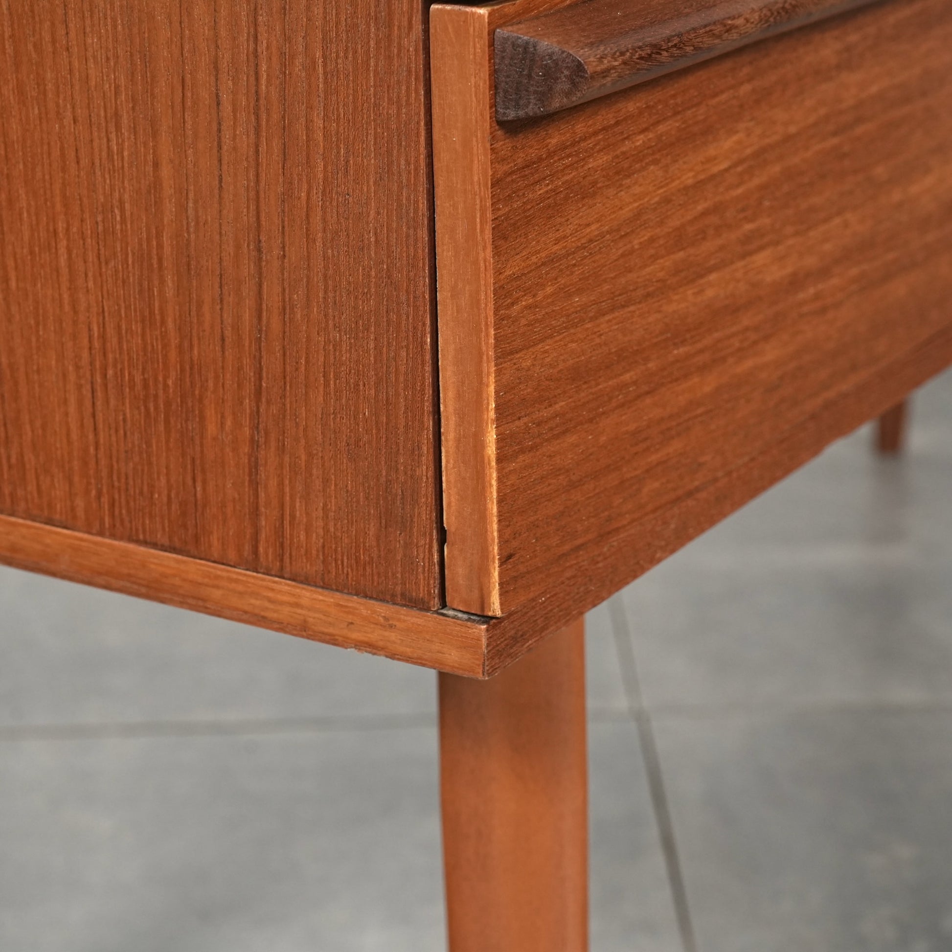 デンマークをはじめとするスカンジナビアスタイル(北欧デザイン)の影響を感じさせる佇まいで、良質なチーク材の見事な質感の中に削り出しで作られたシャープな取手が良いアクセントとなったています。