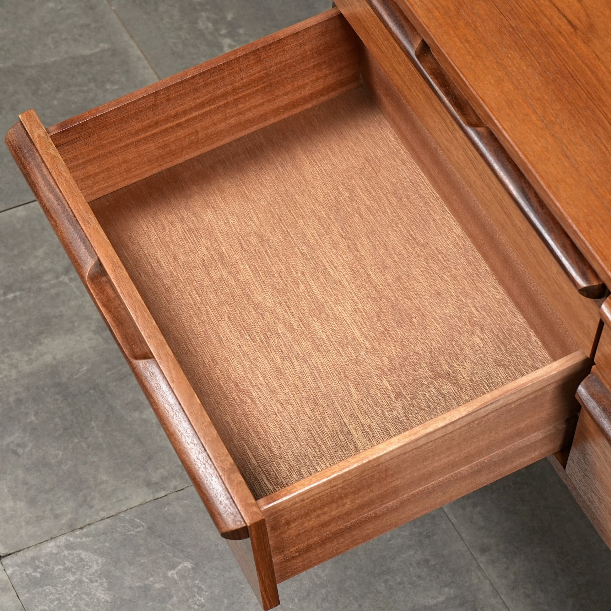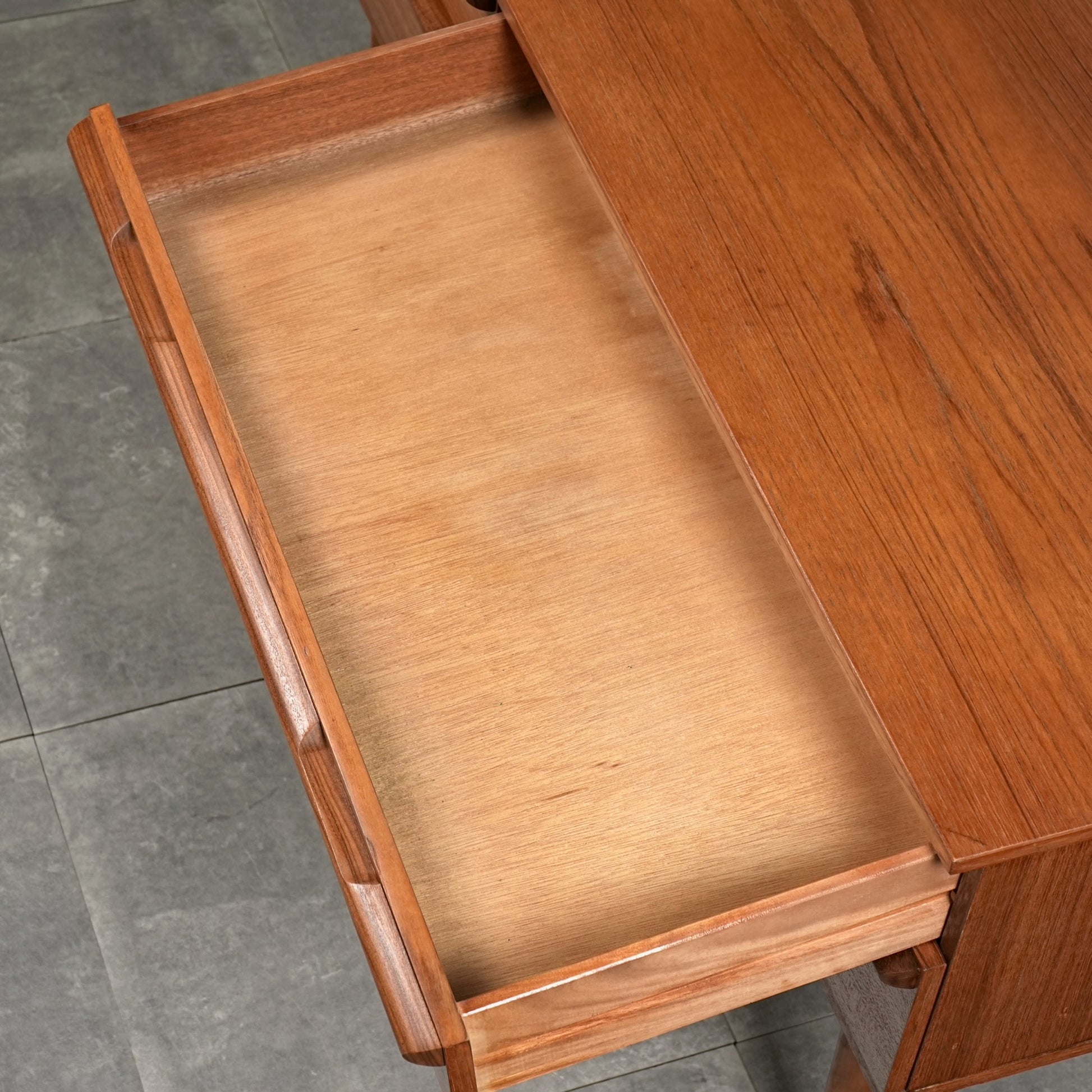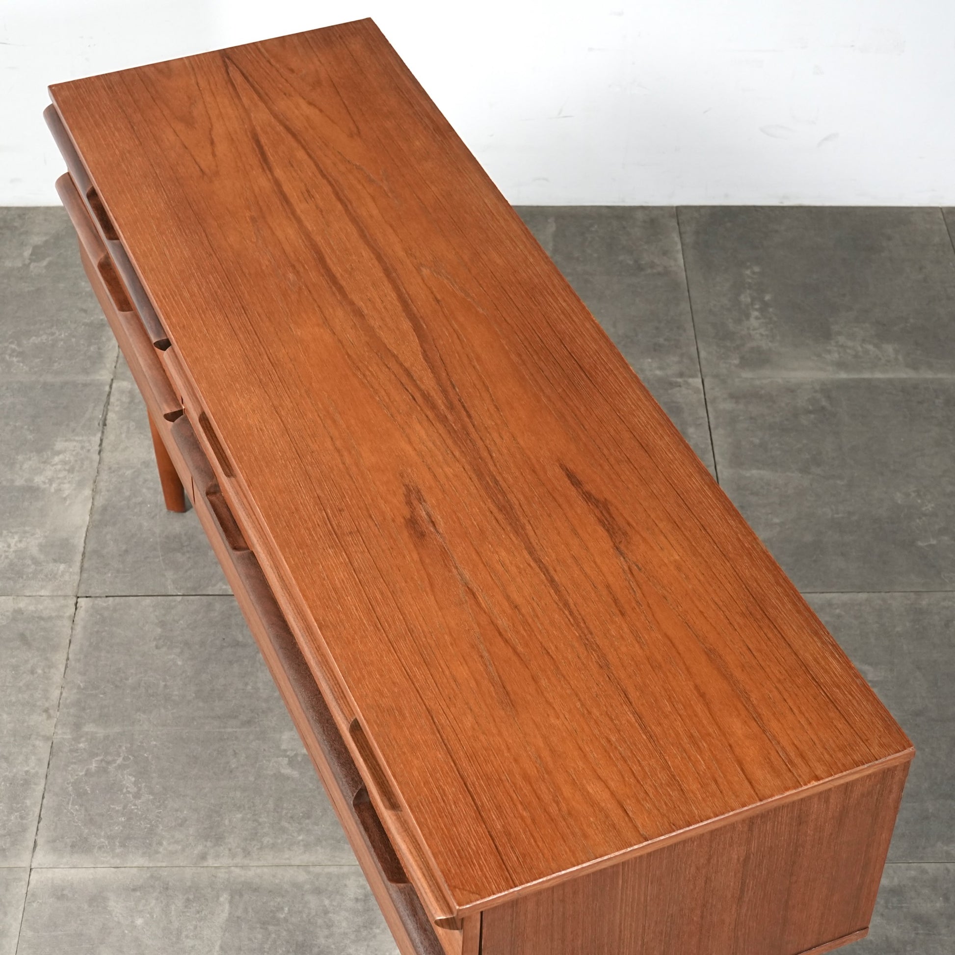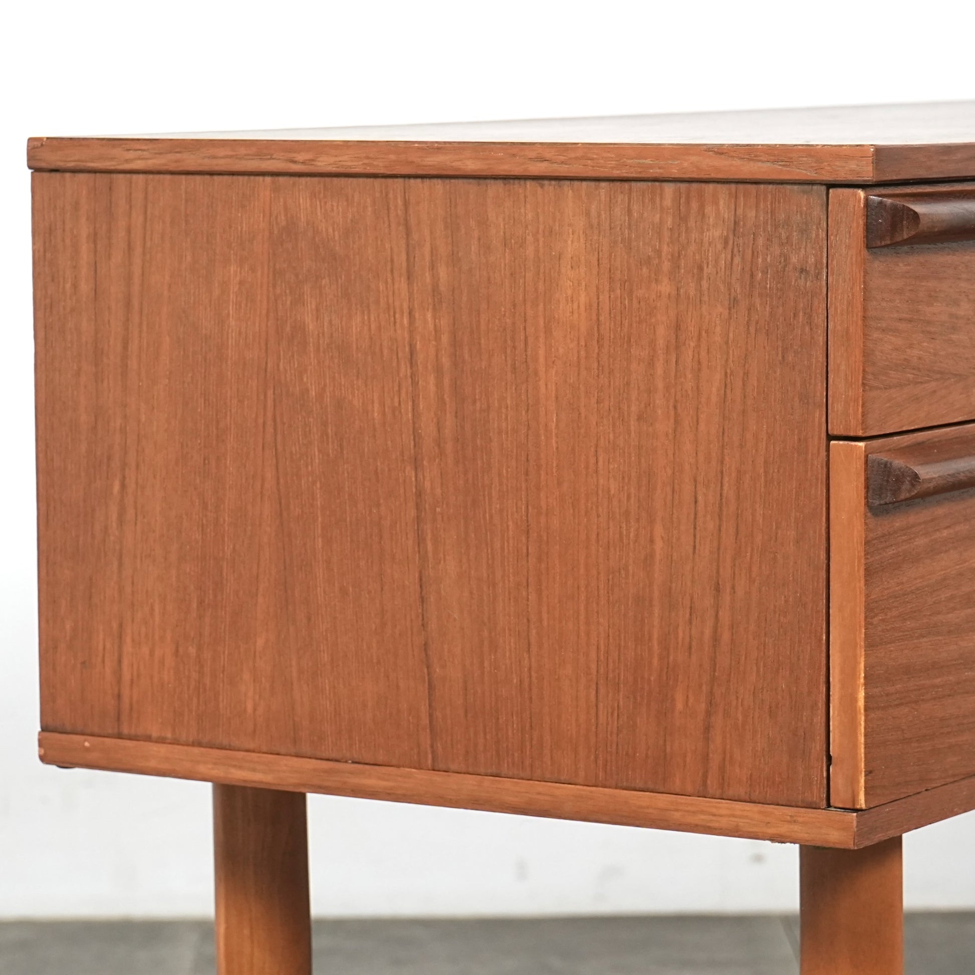 デンマークをはじめとするスカンジナビアスタイル(北欧デザイン)の影響を感じさせる佇まいで、良質なチーク材の見事な質感の中に削り出しで作られたシャープな取手が良いアクセントとなったています。