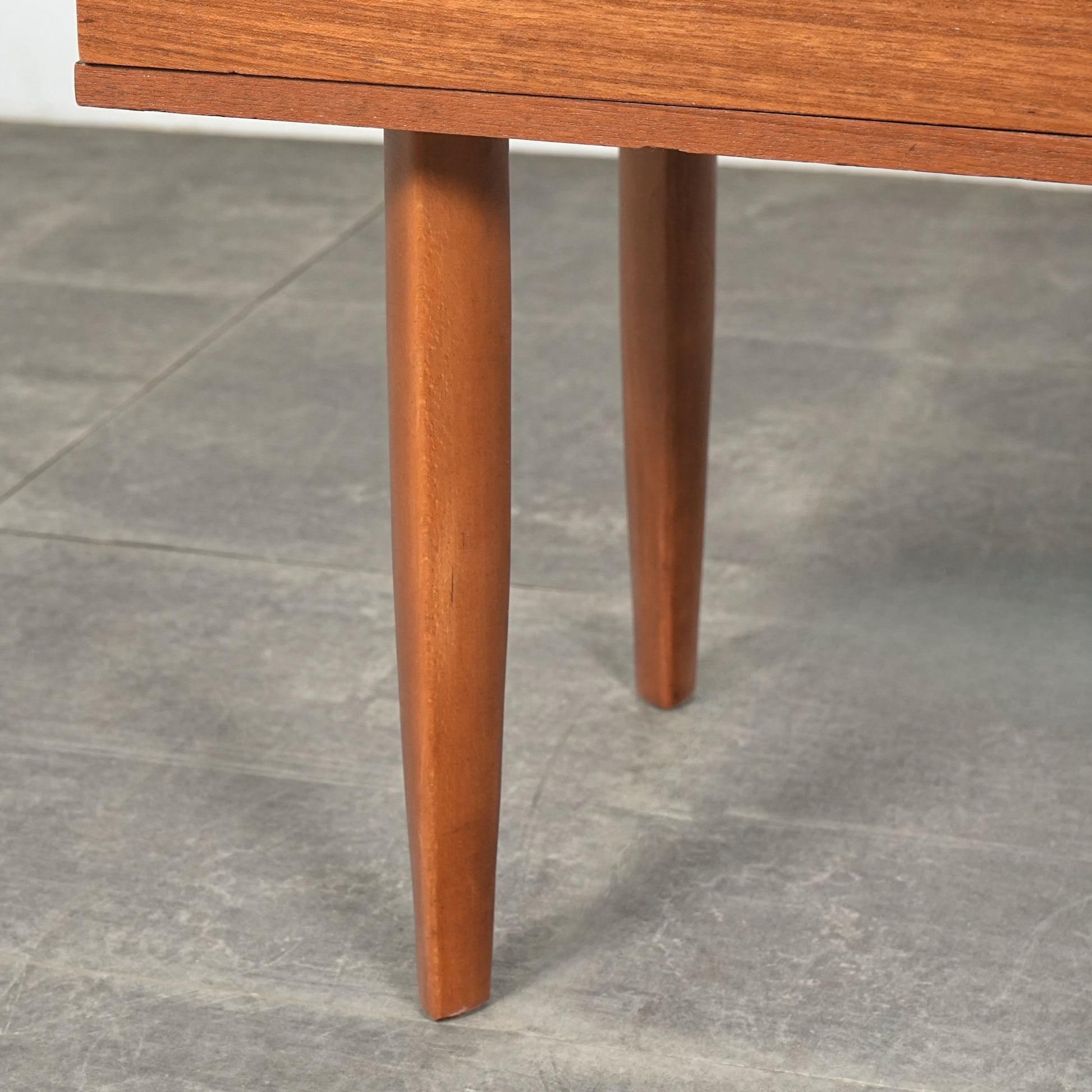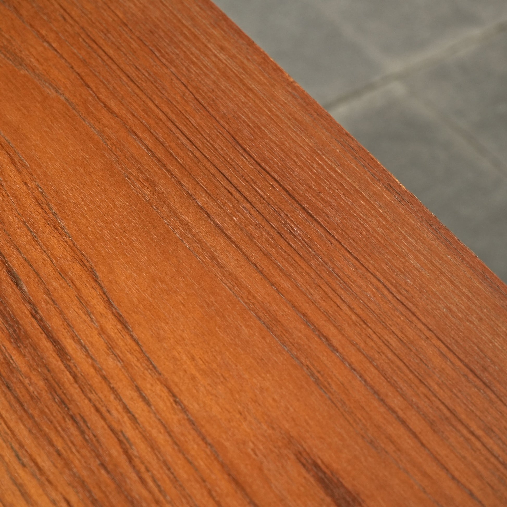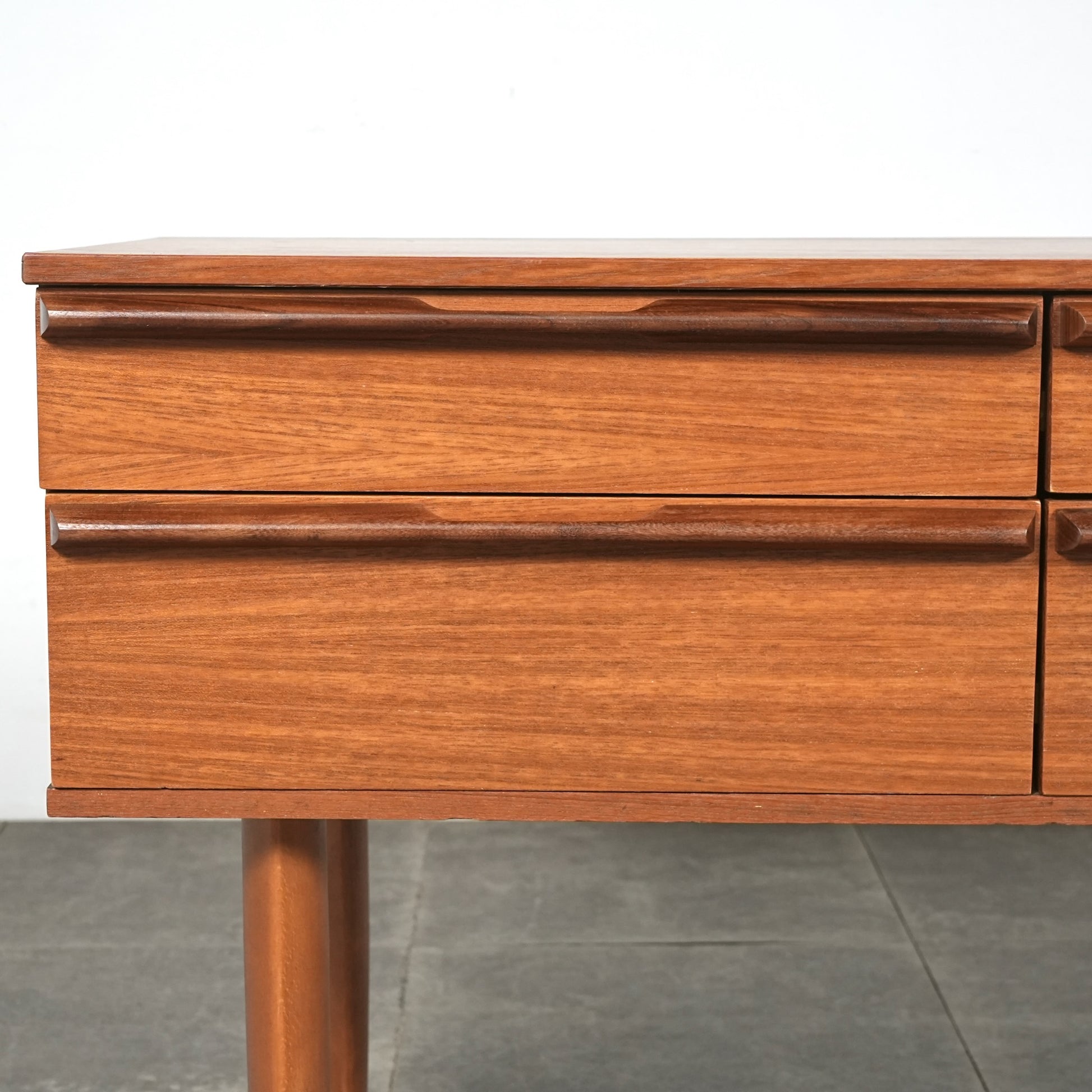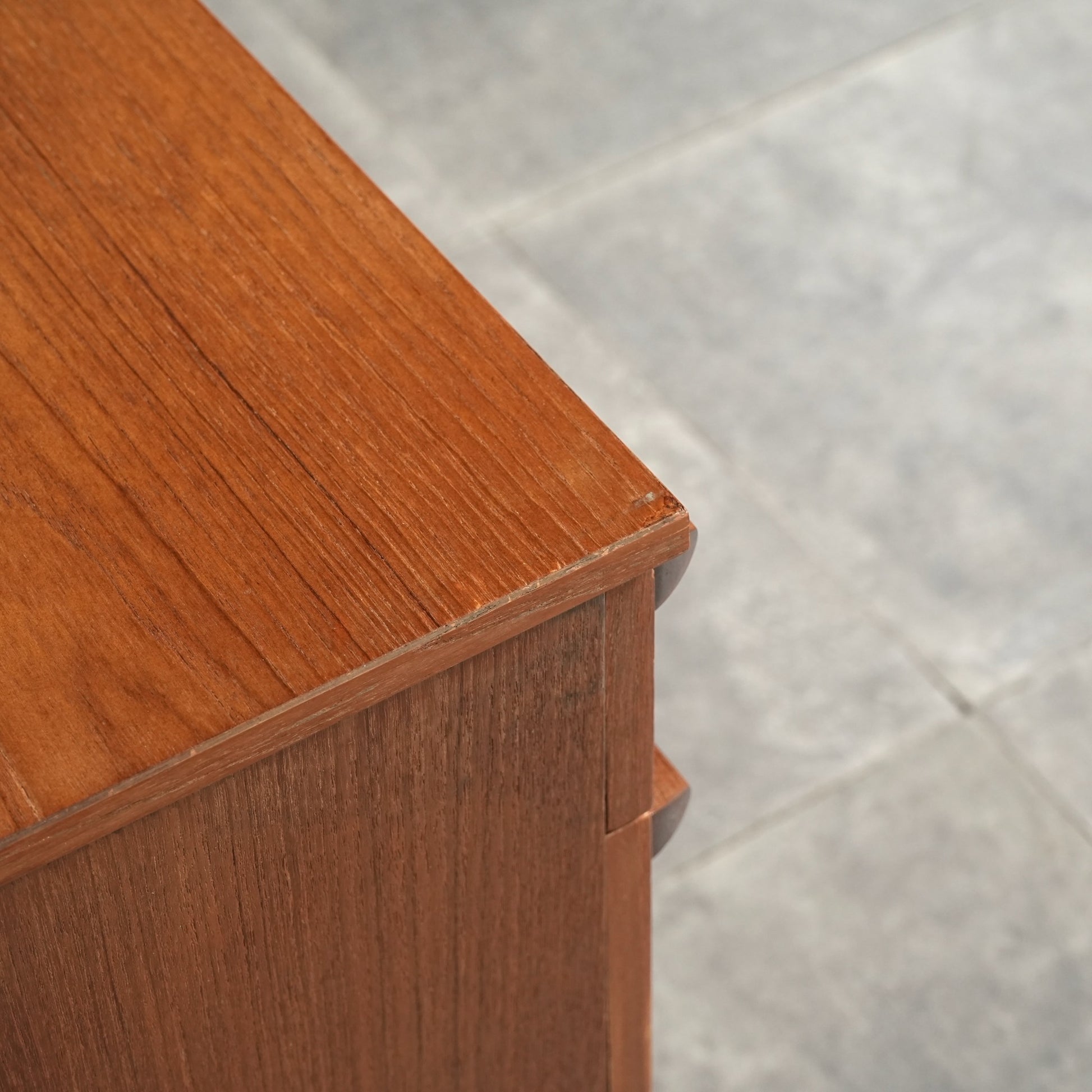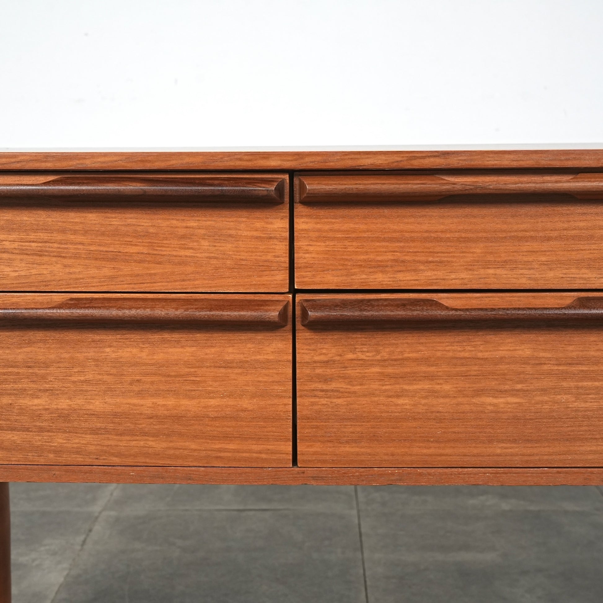 デンマークをはじめとするスカンジナビアスタイル(北欧デザイン)の影響を感じさせる佇まいで、良質なチーク材の見事な質感の中に削り出しで作られたシャープな取手が良いアクセントとなったています。