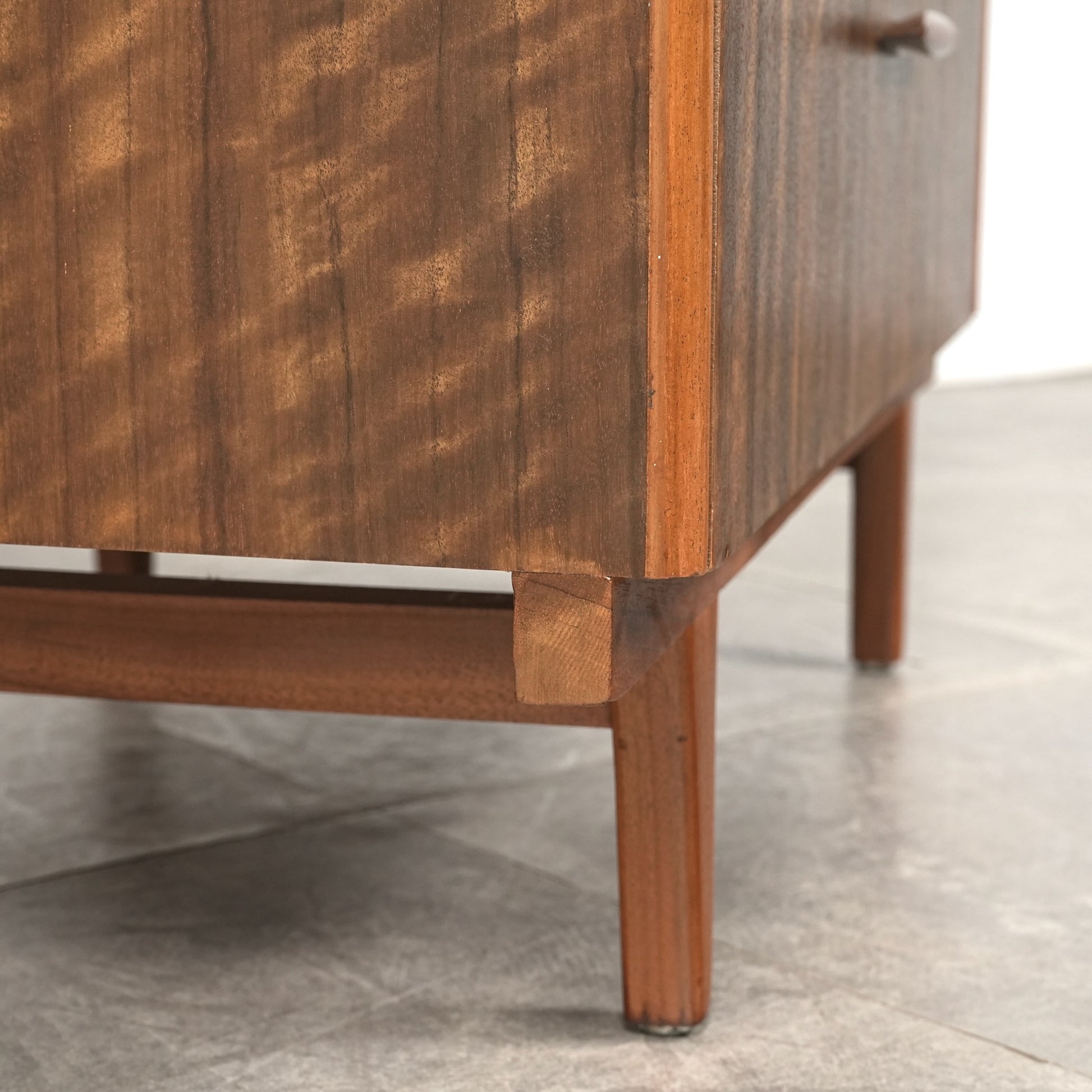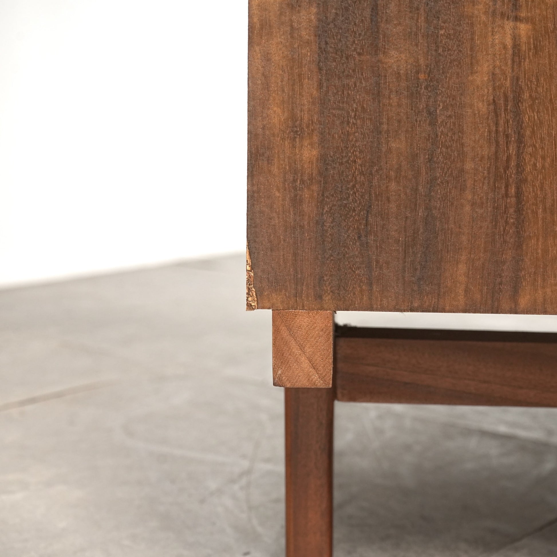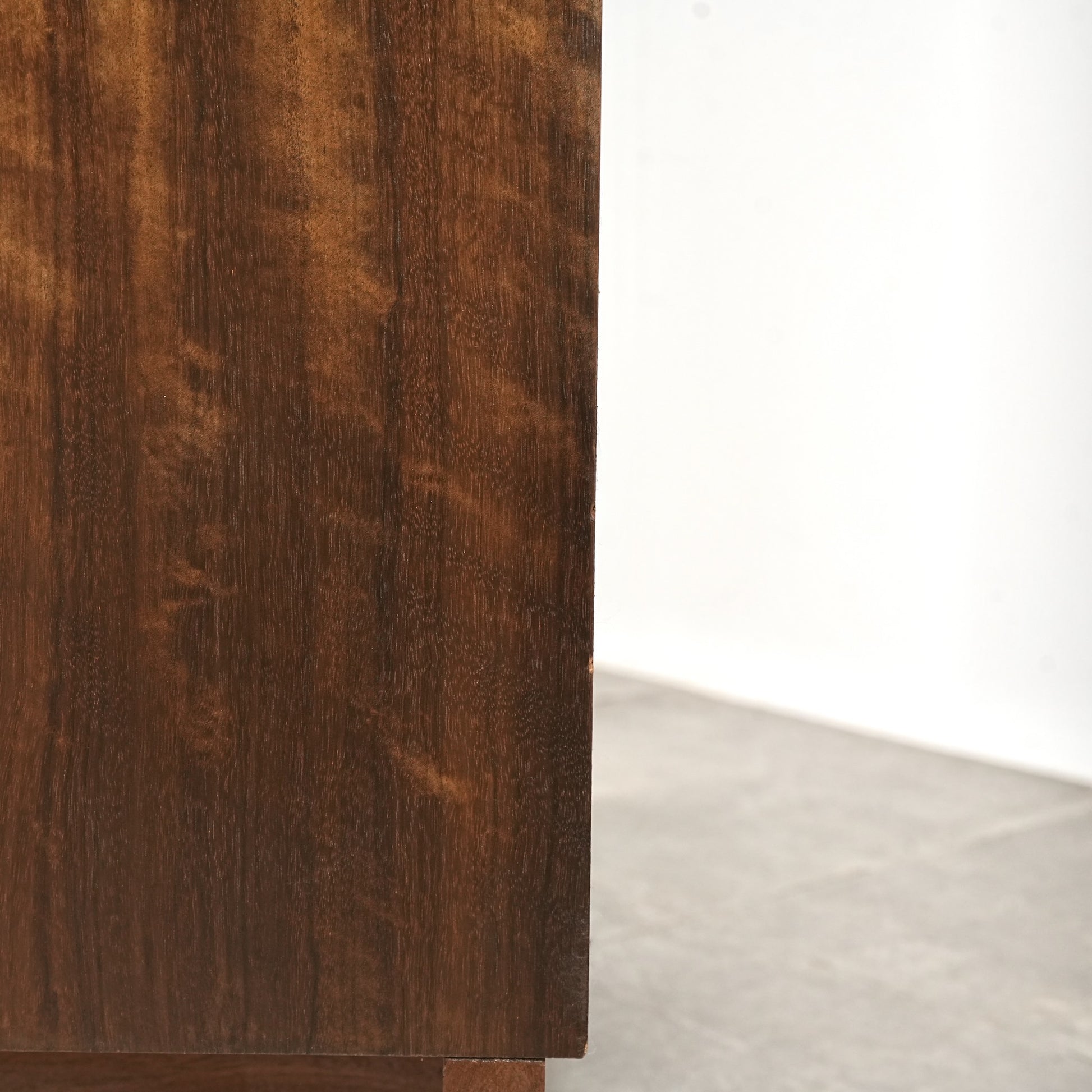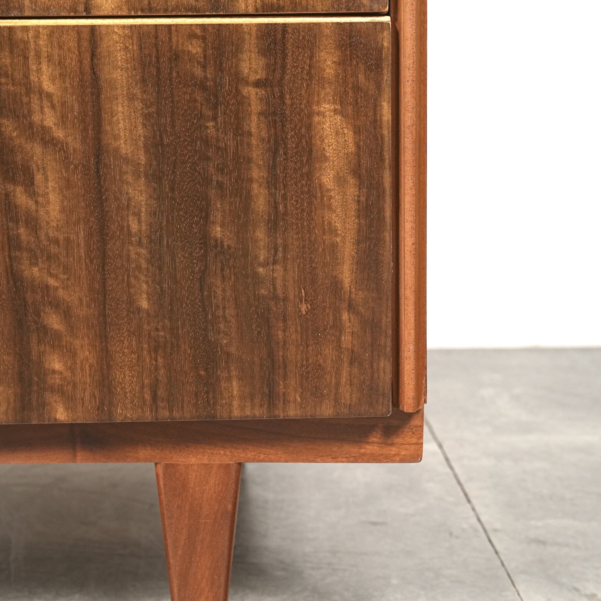 良質なウォルナット材のユニークな木目と質感が際立つ美しいデザインで、削り出しの取手やシャープな脚部も良いアクセントとなっています。