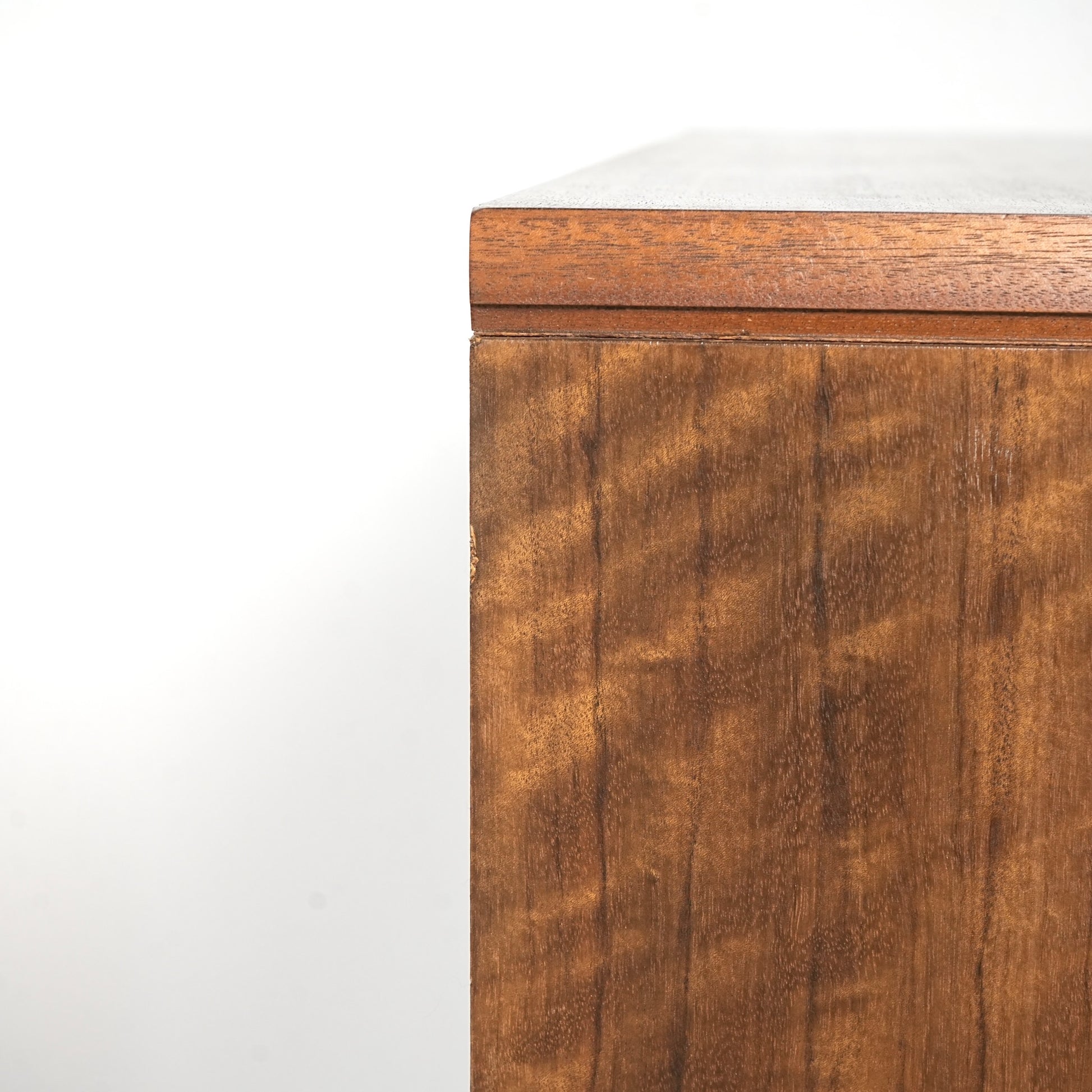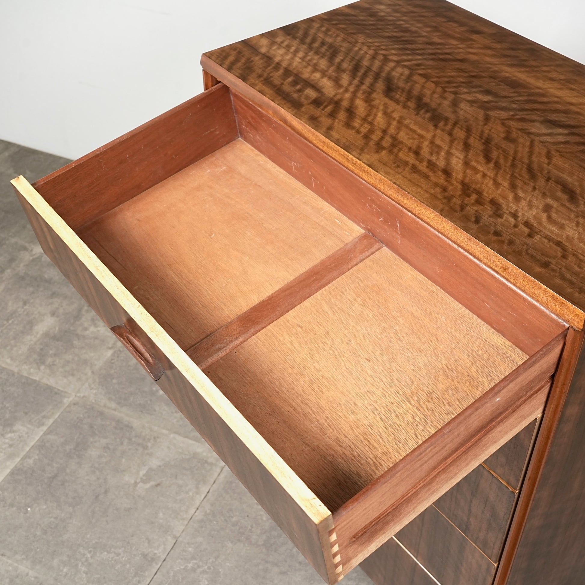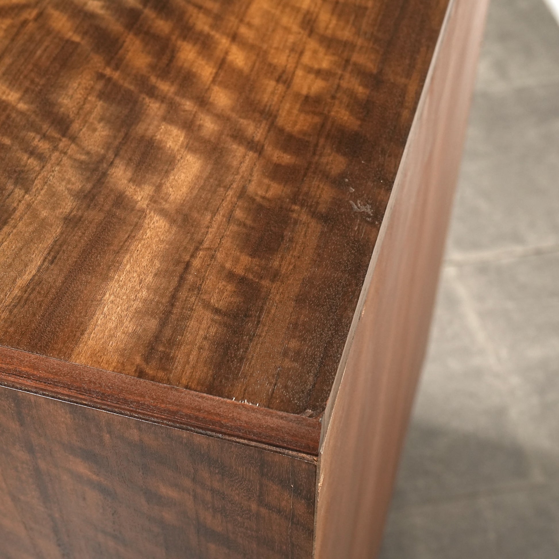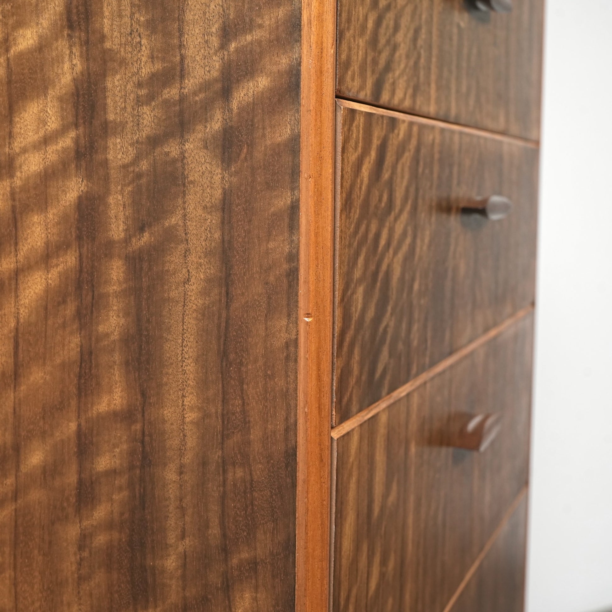 良質なウォルナット材のユニークな木目と質感が際立つ美しいデザインで、削り出しの取手やシャープな脚部も良いアクセントとなっています。