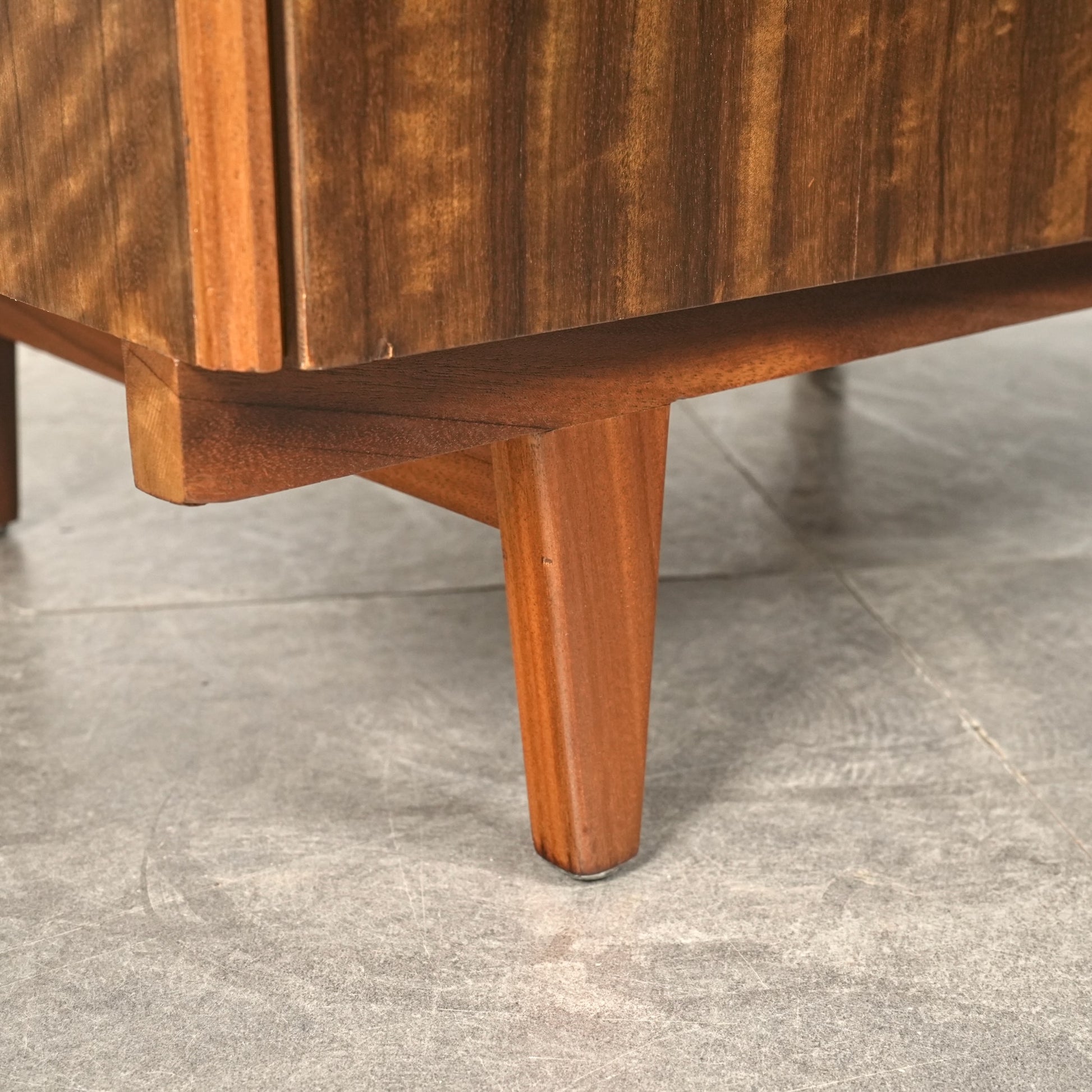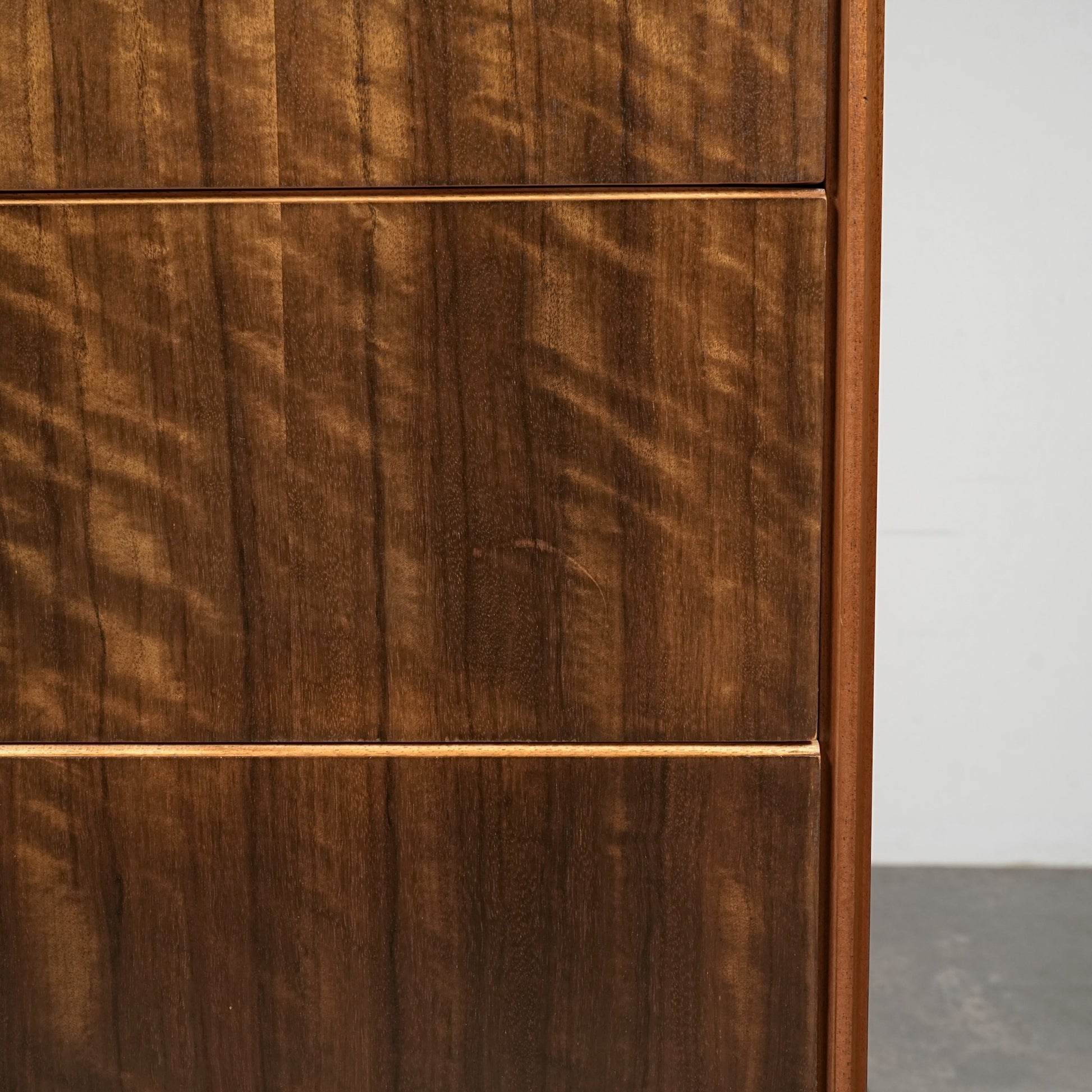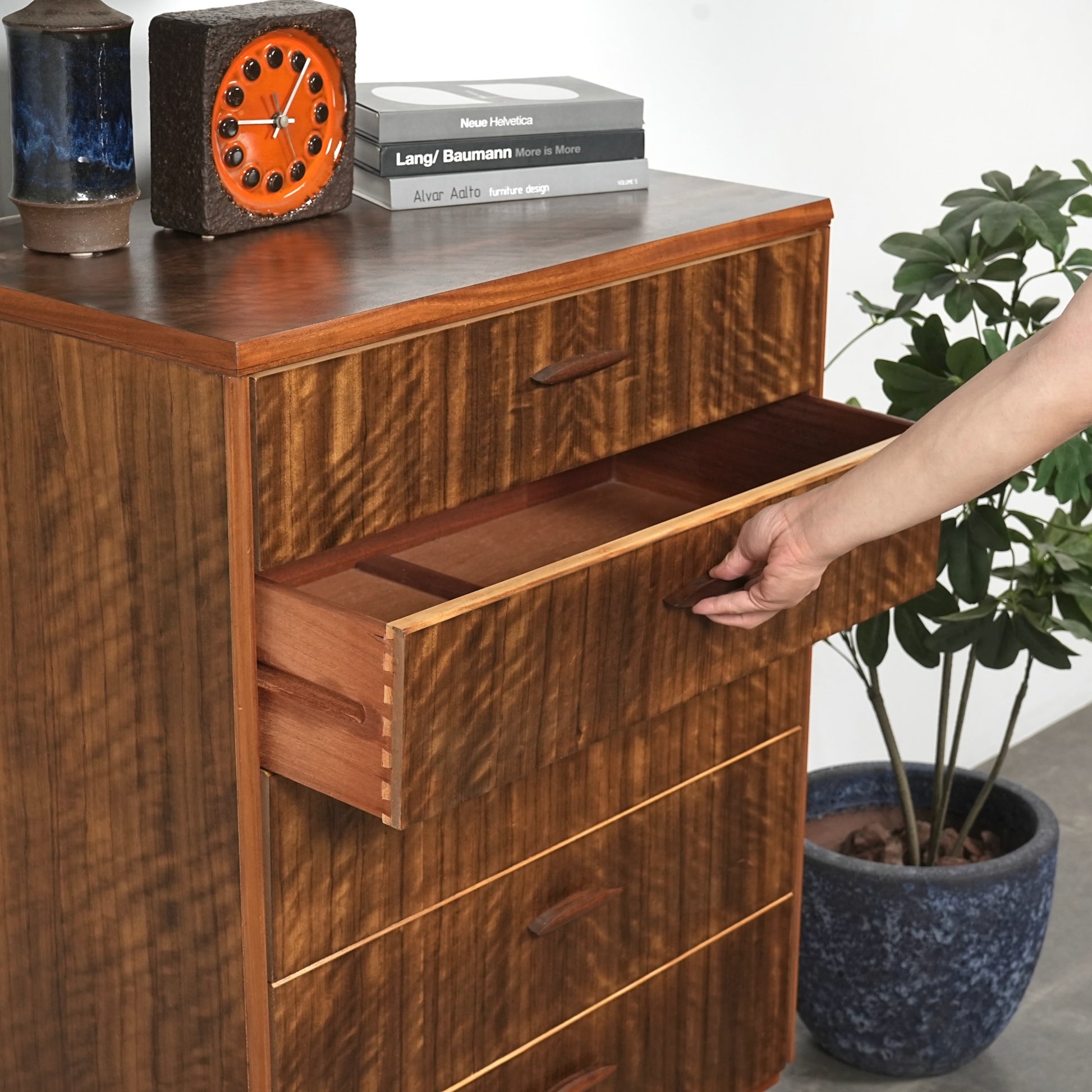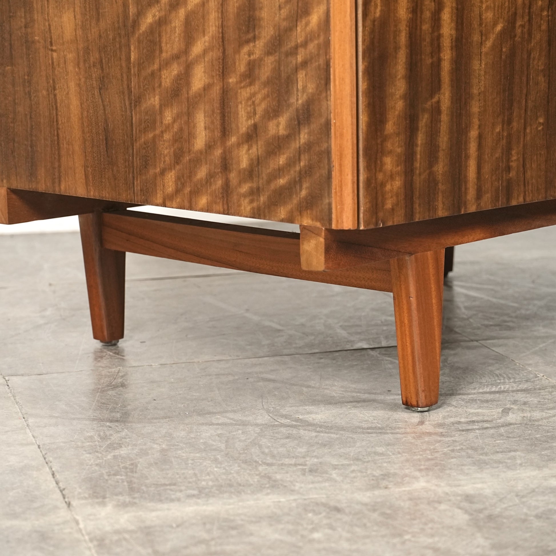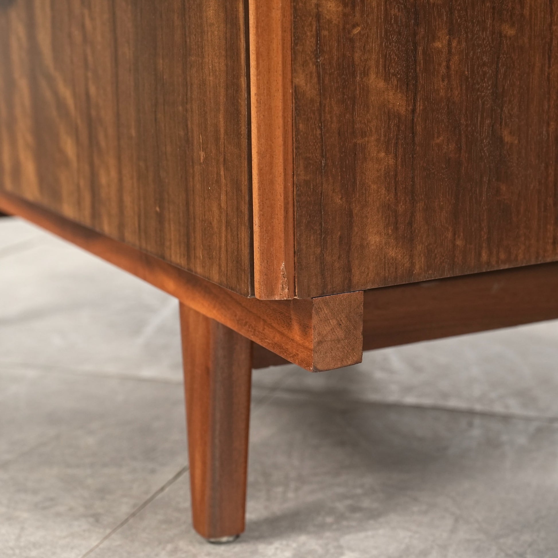 良質なウォルナット材のユニークな木目と質感が際立つ美しいデザインで、削り出しの取手やシャープな脚部も良いアクセントとなっています。