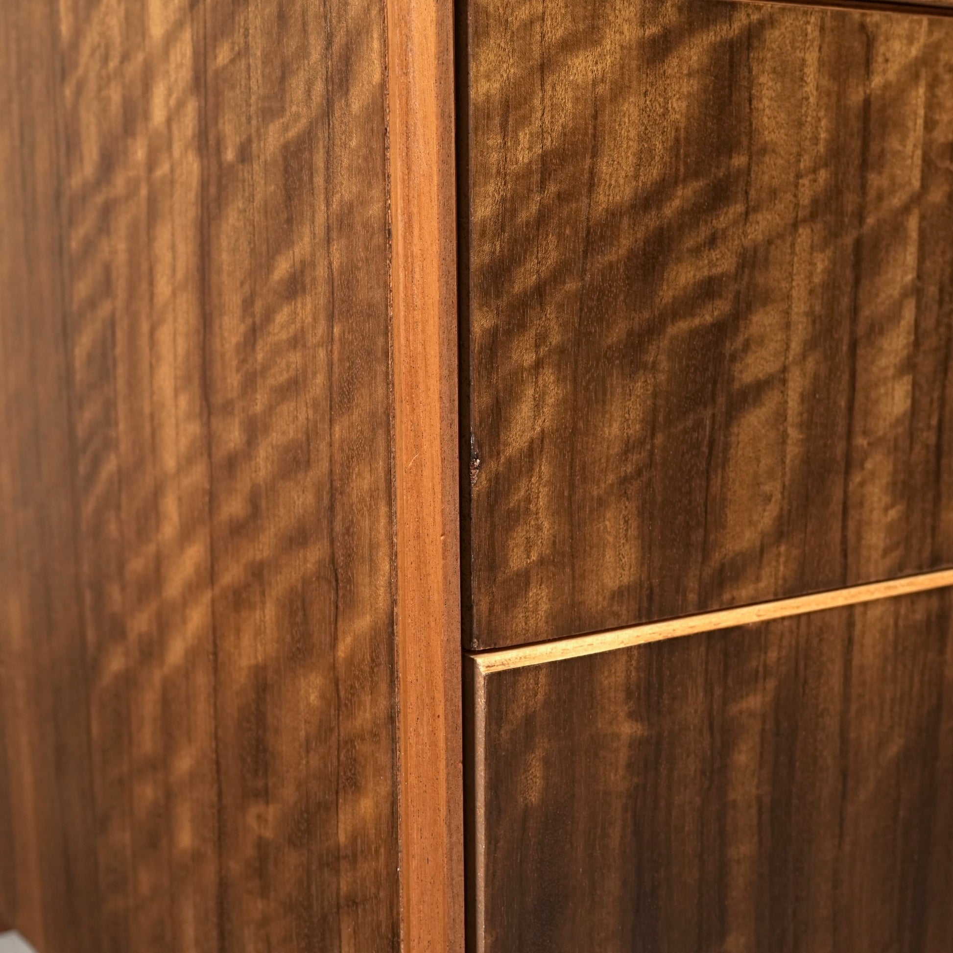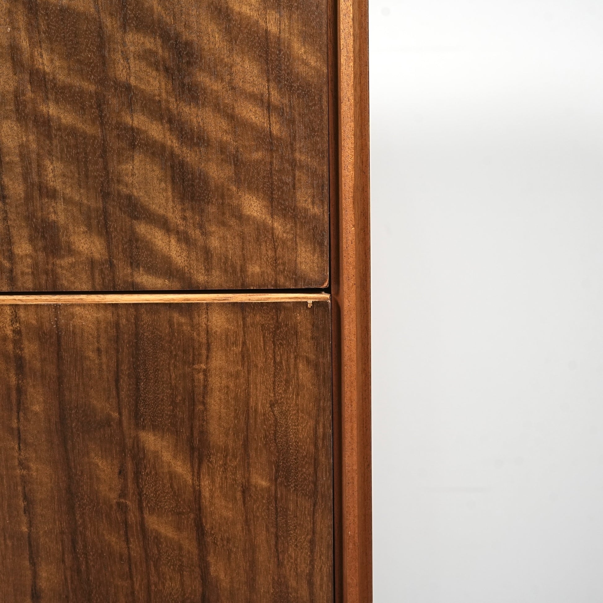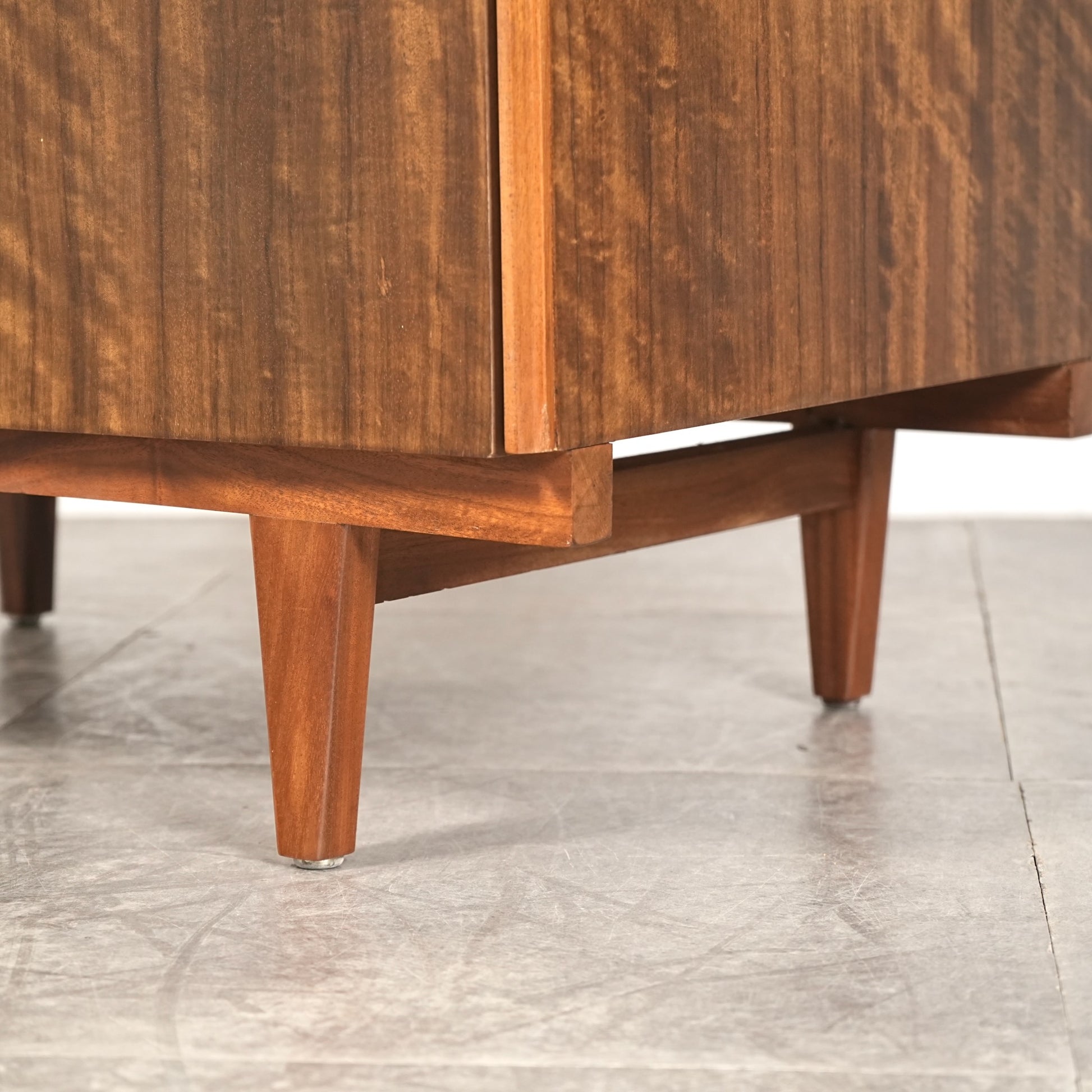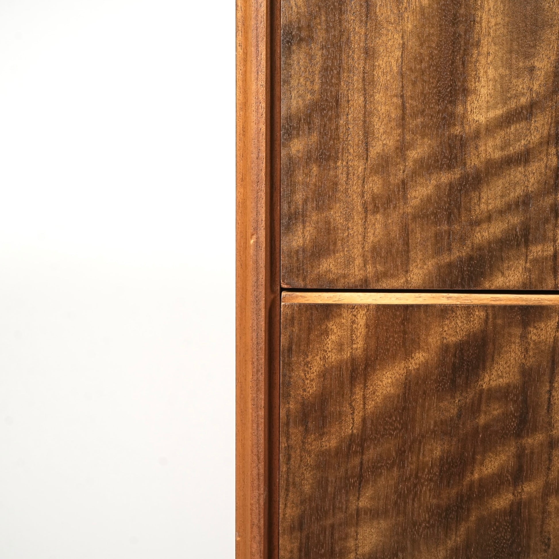 良質なウォルナット材のユニークな木目と質感が際立つ美しいデザインで、削り出しの取手やシャープな脚部も良いアクセントとなっています。