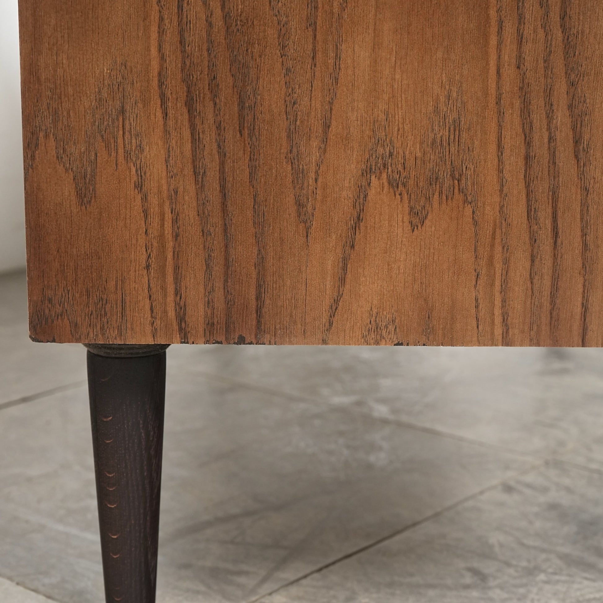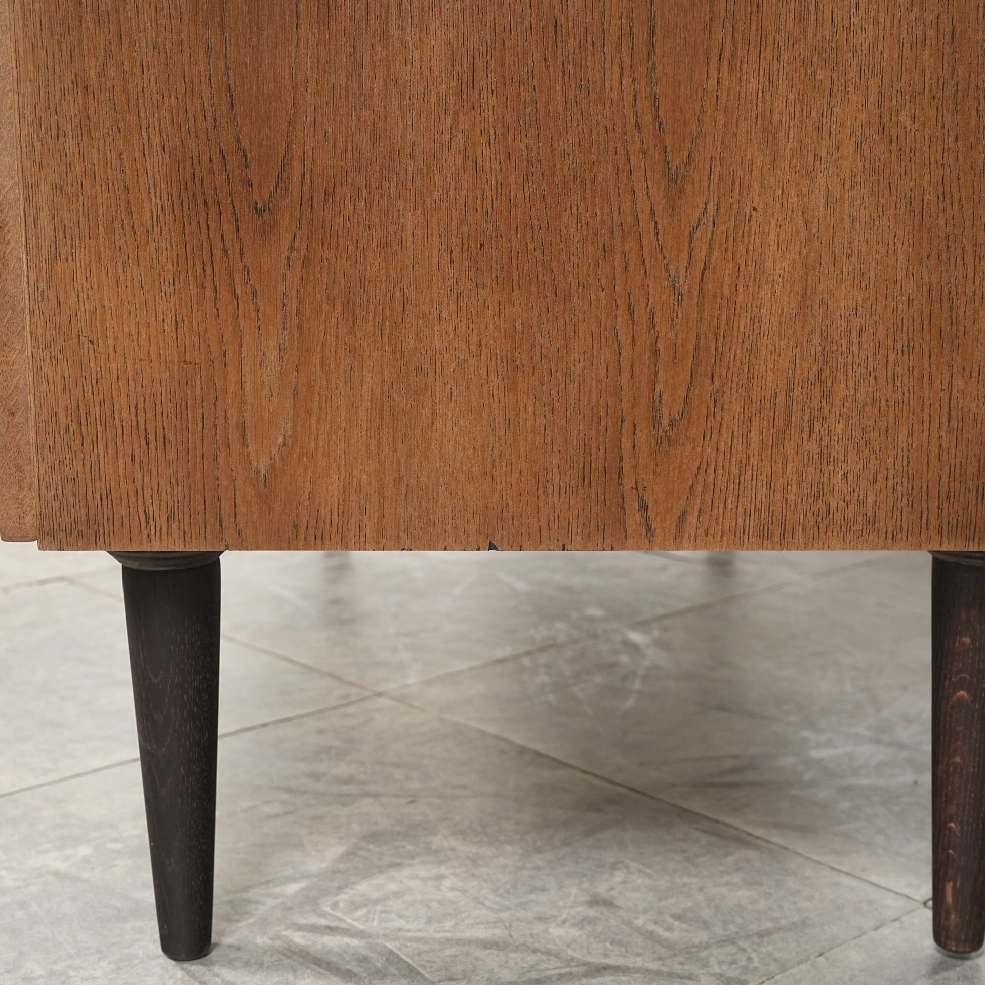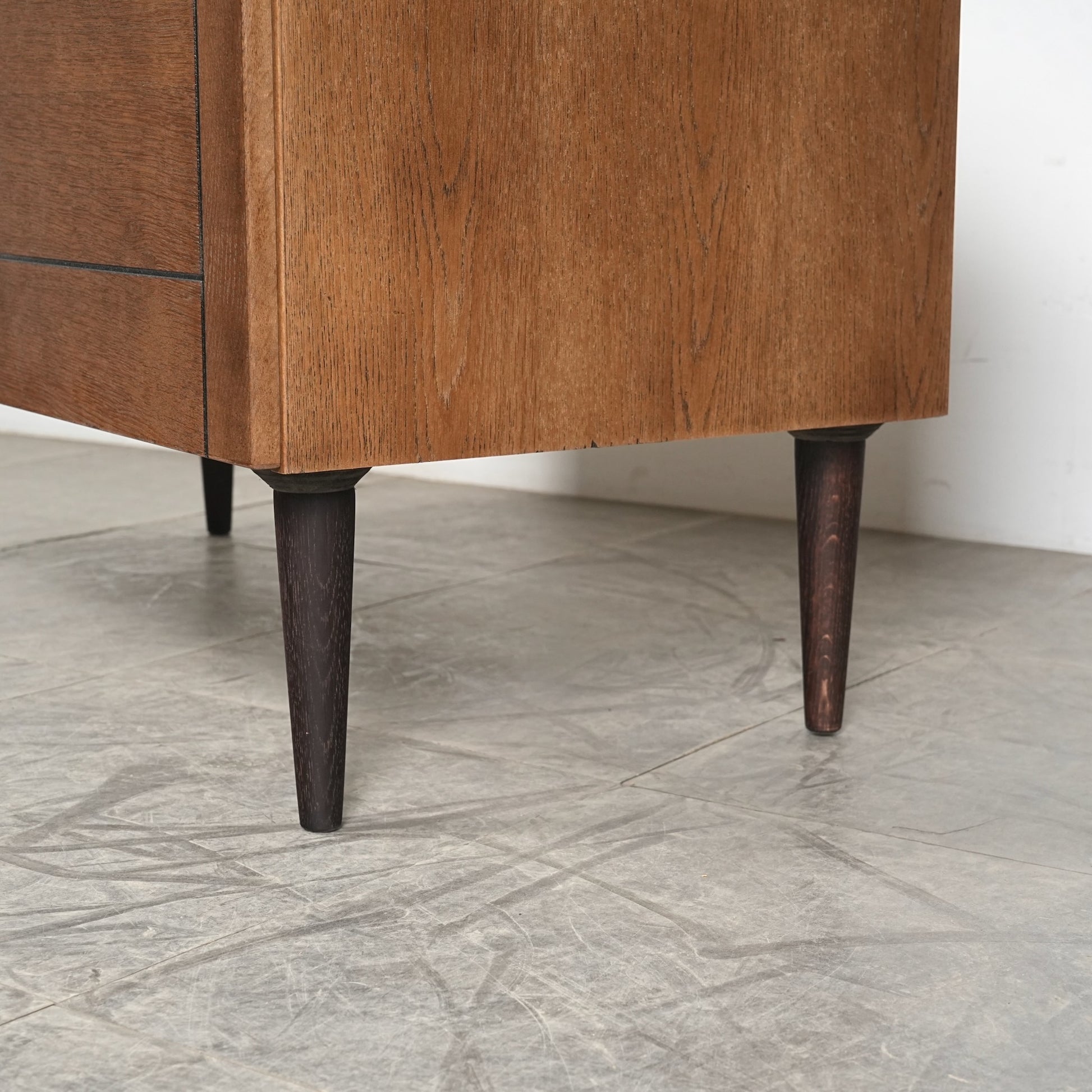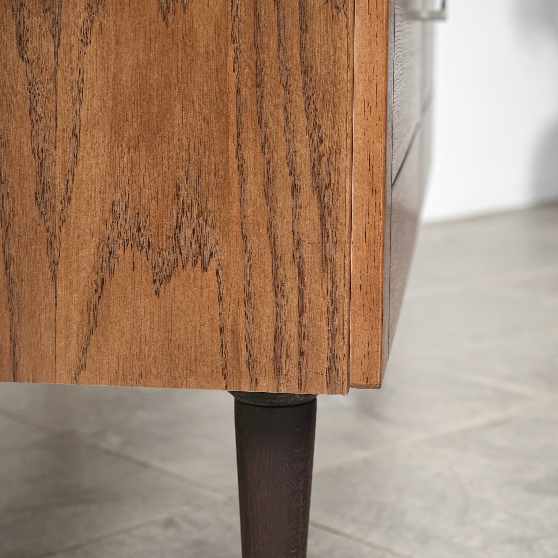 上質なオーク材の質感が際立つ見事なデザインで、異素材のユニークな取手や全体の落ち着いたトーンも絶妙なバランス。