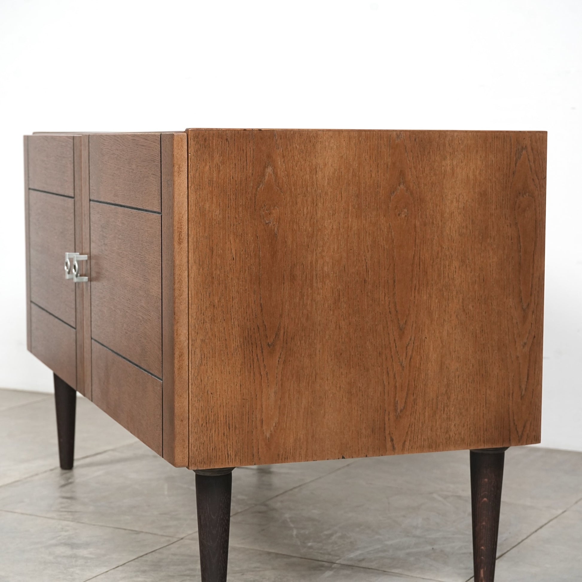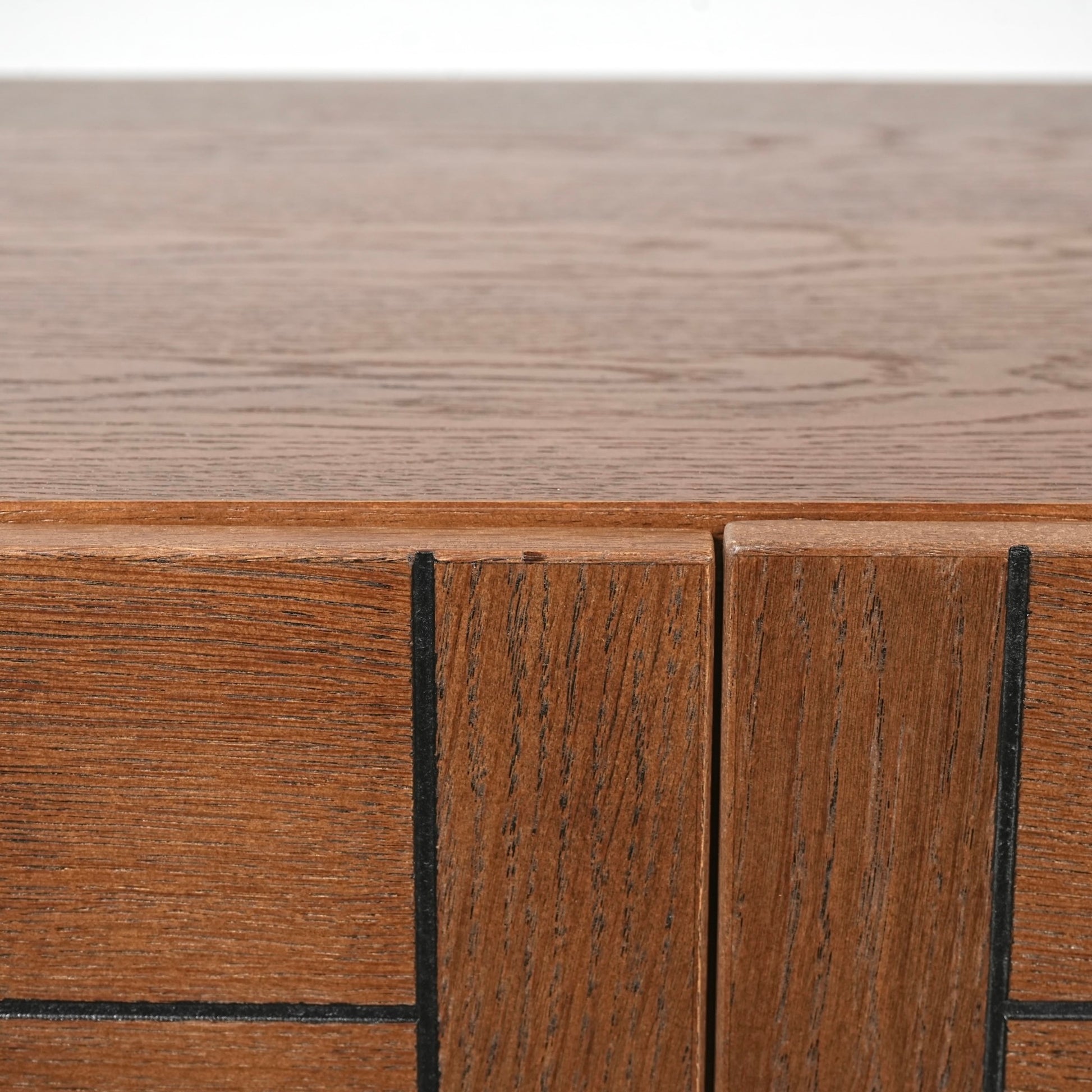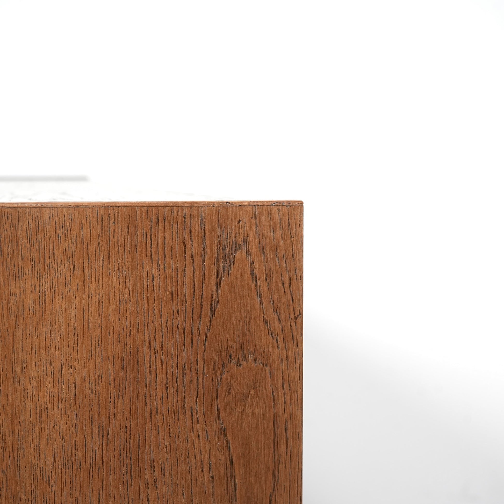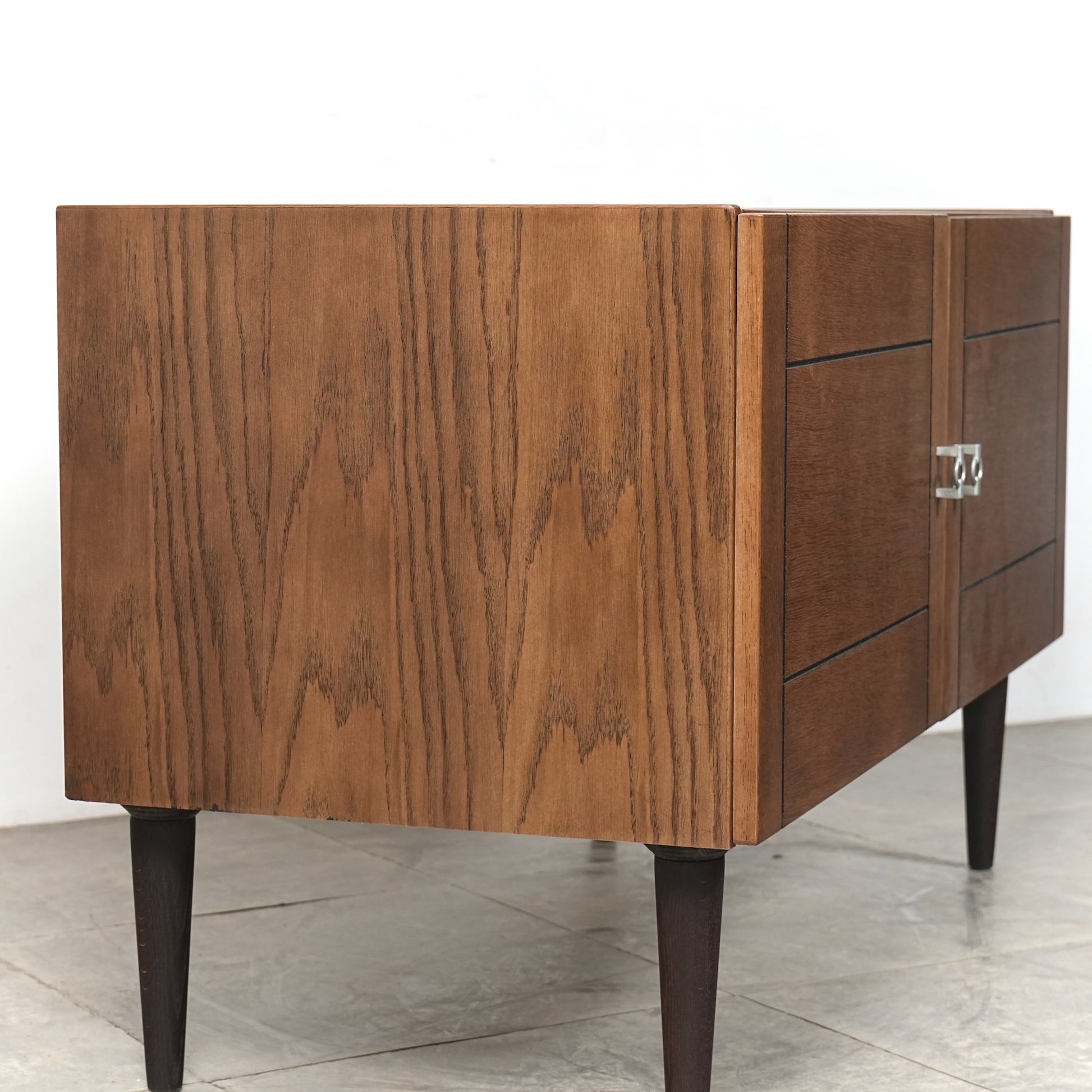 上質なオーク材の質感が際立つ見事なデザインで、異素材のユニークな取手や全体の落ち着いたトーンも絶妙なバランス。