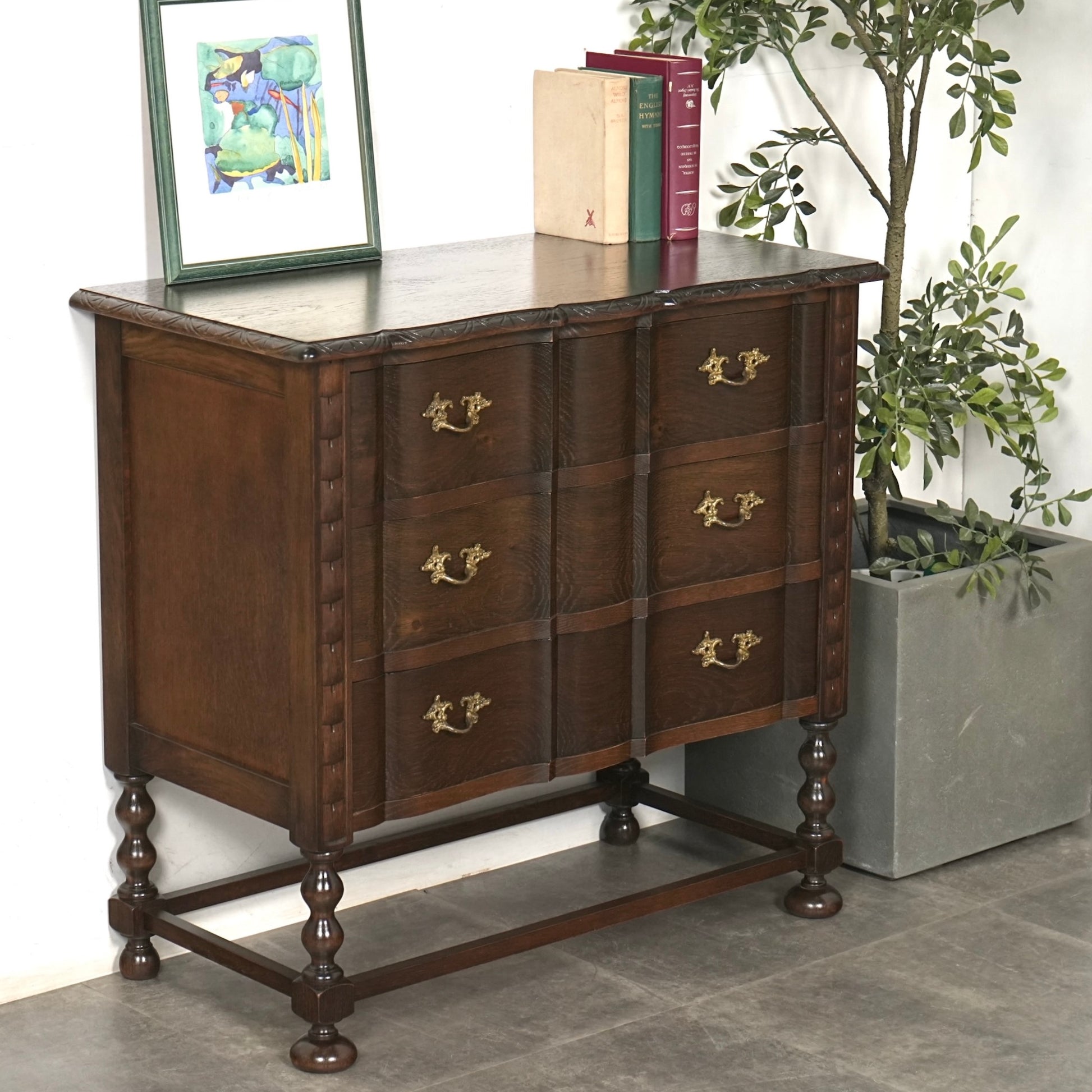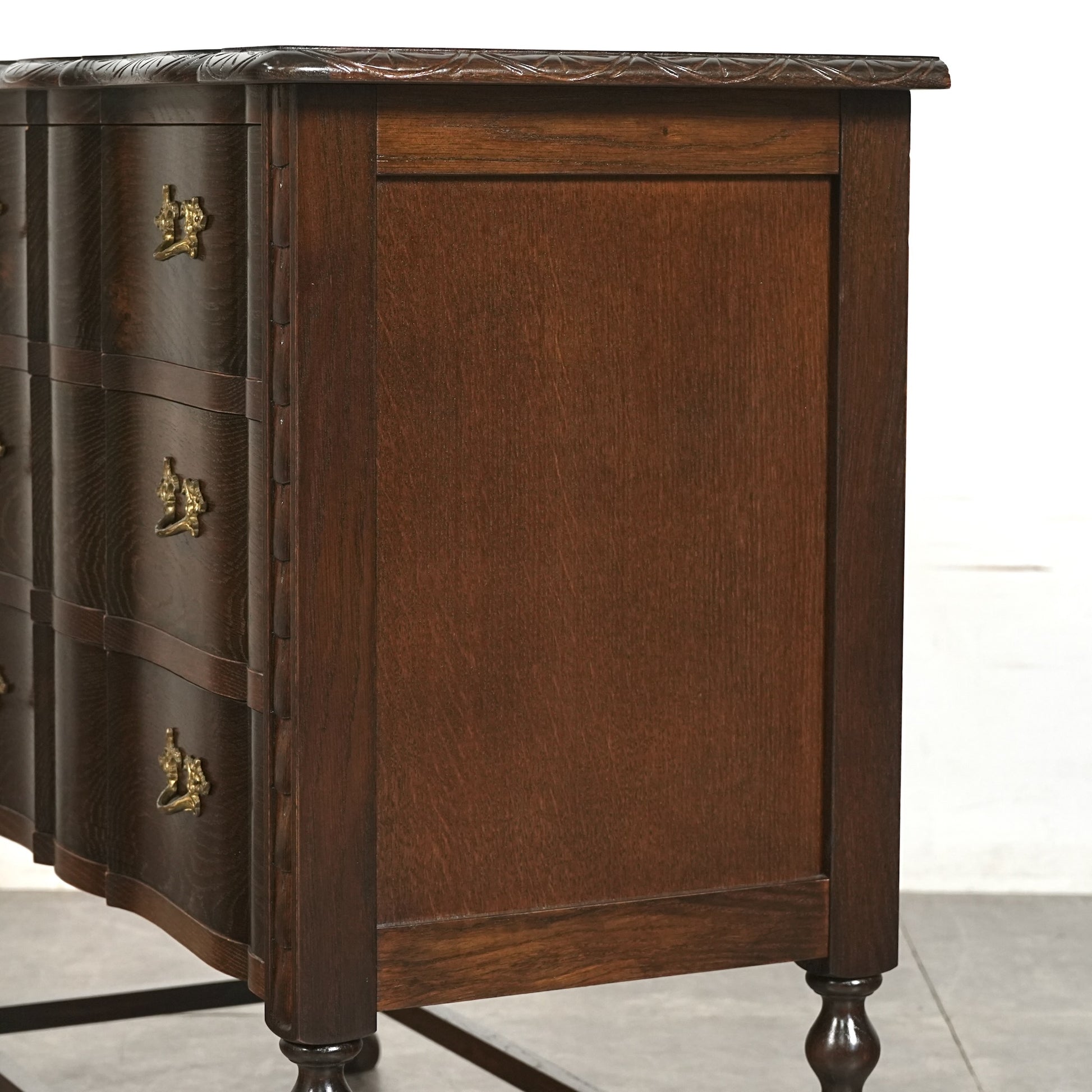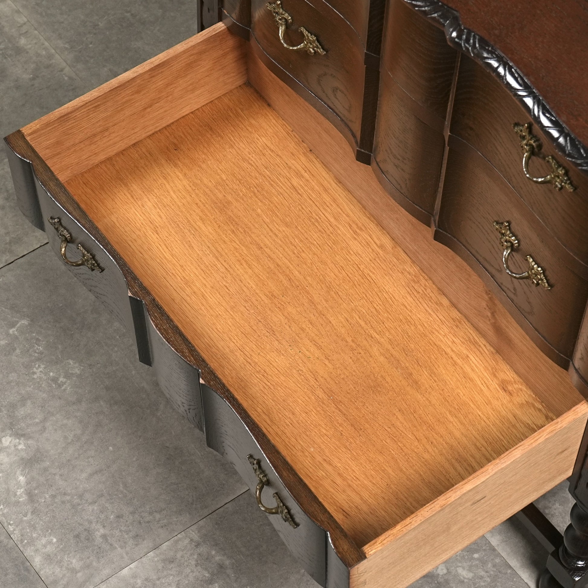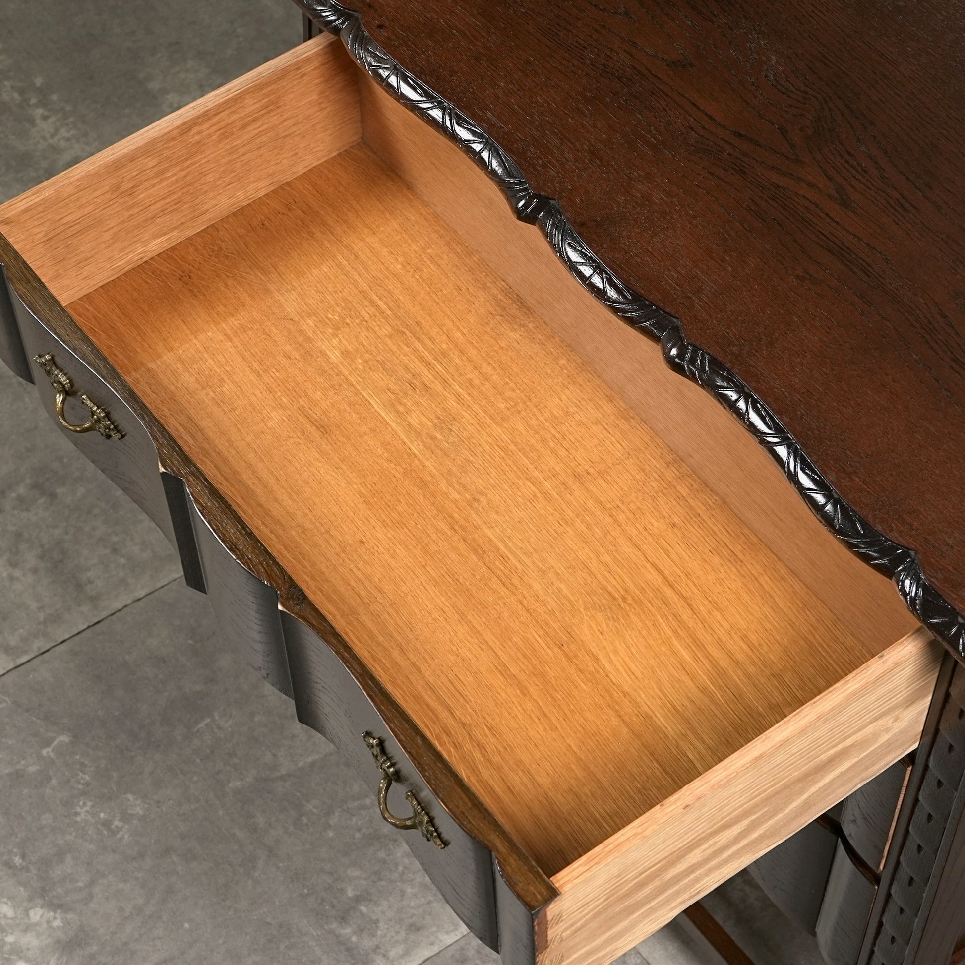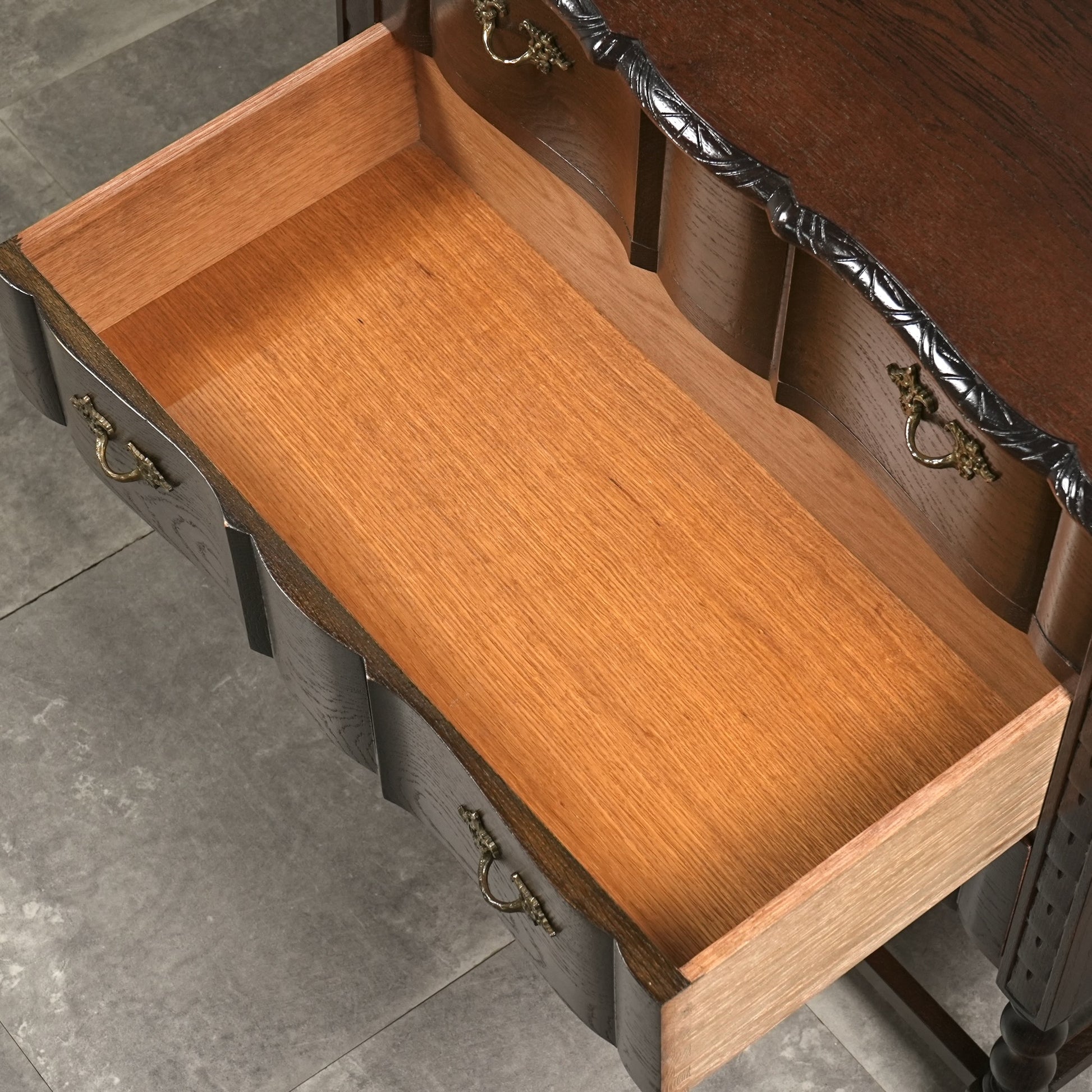 艶やかなオーク材の質感が際立つ仕上がりで、前面の波打つような立体的なデザインがひときわ目を引きます。