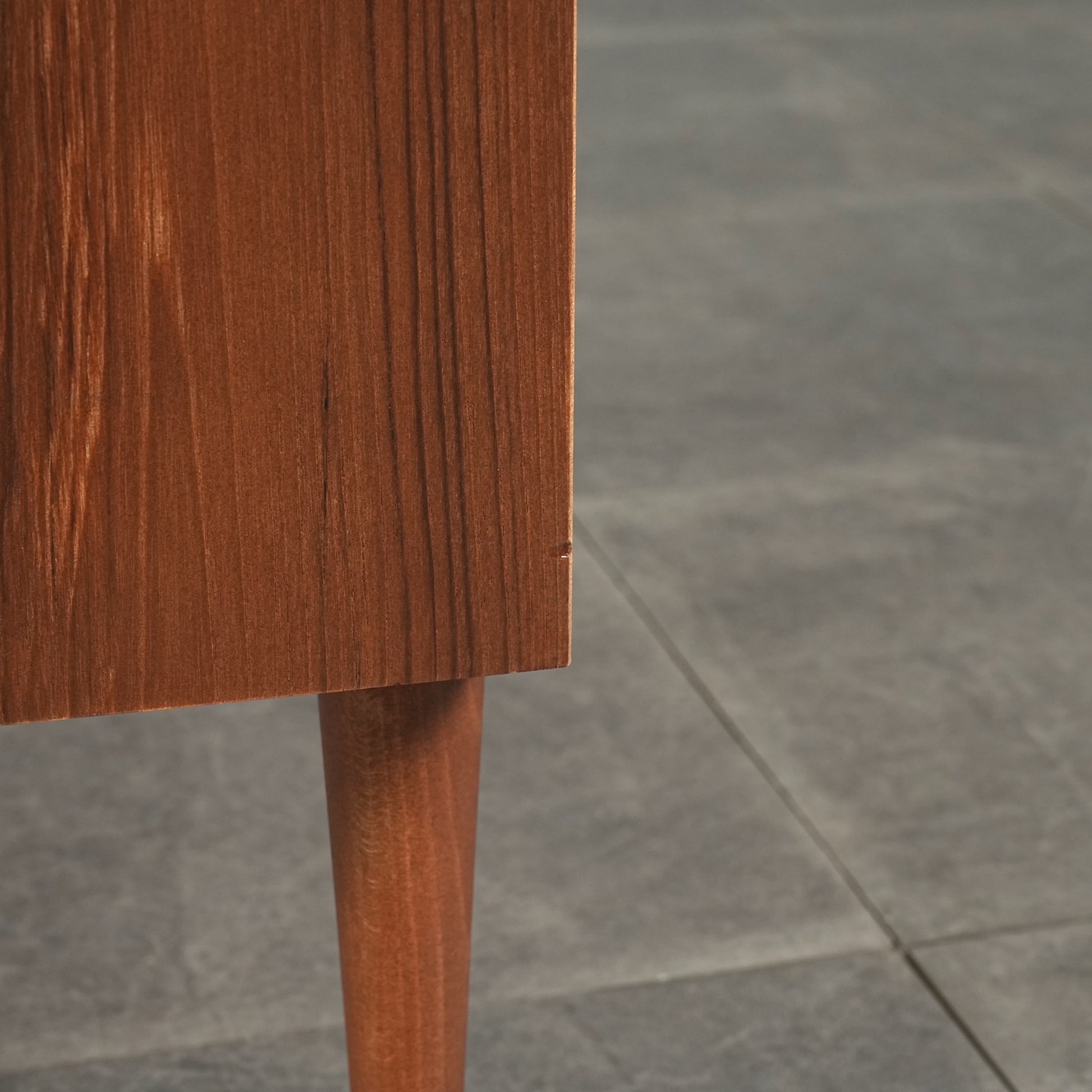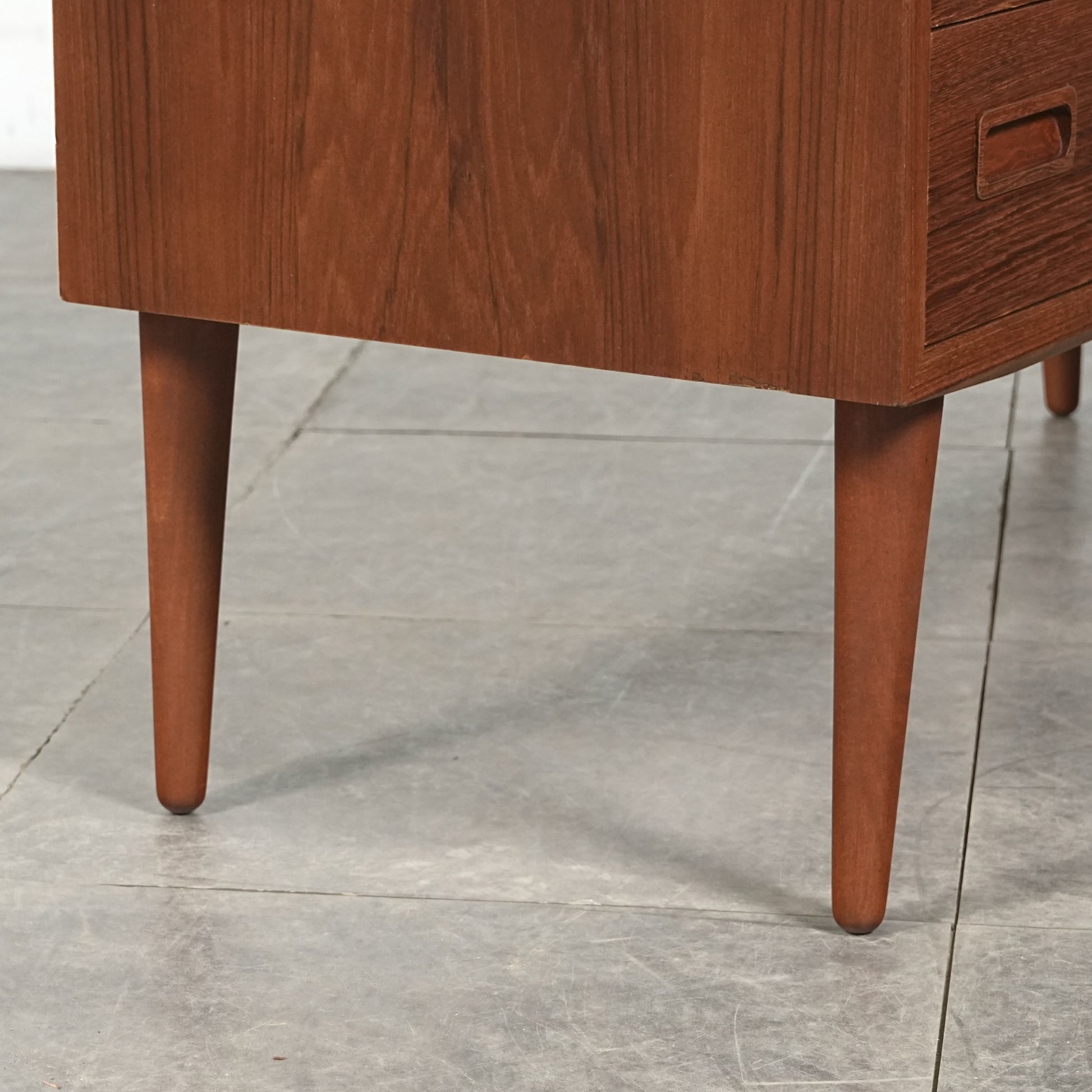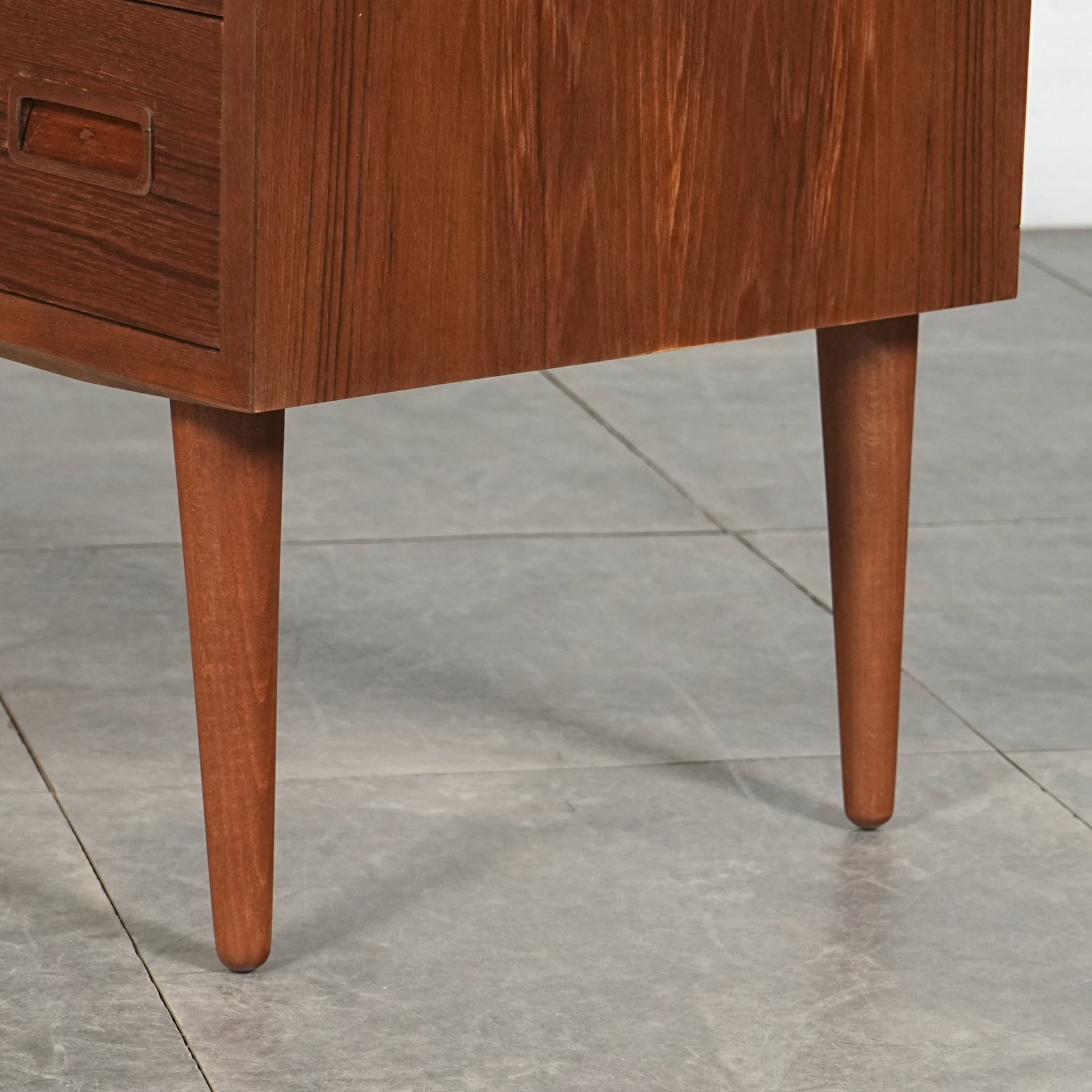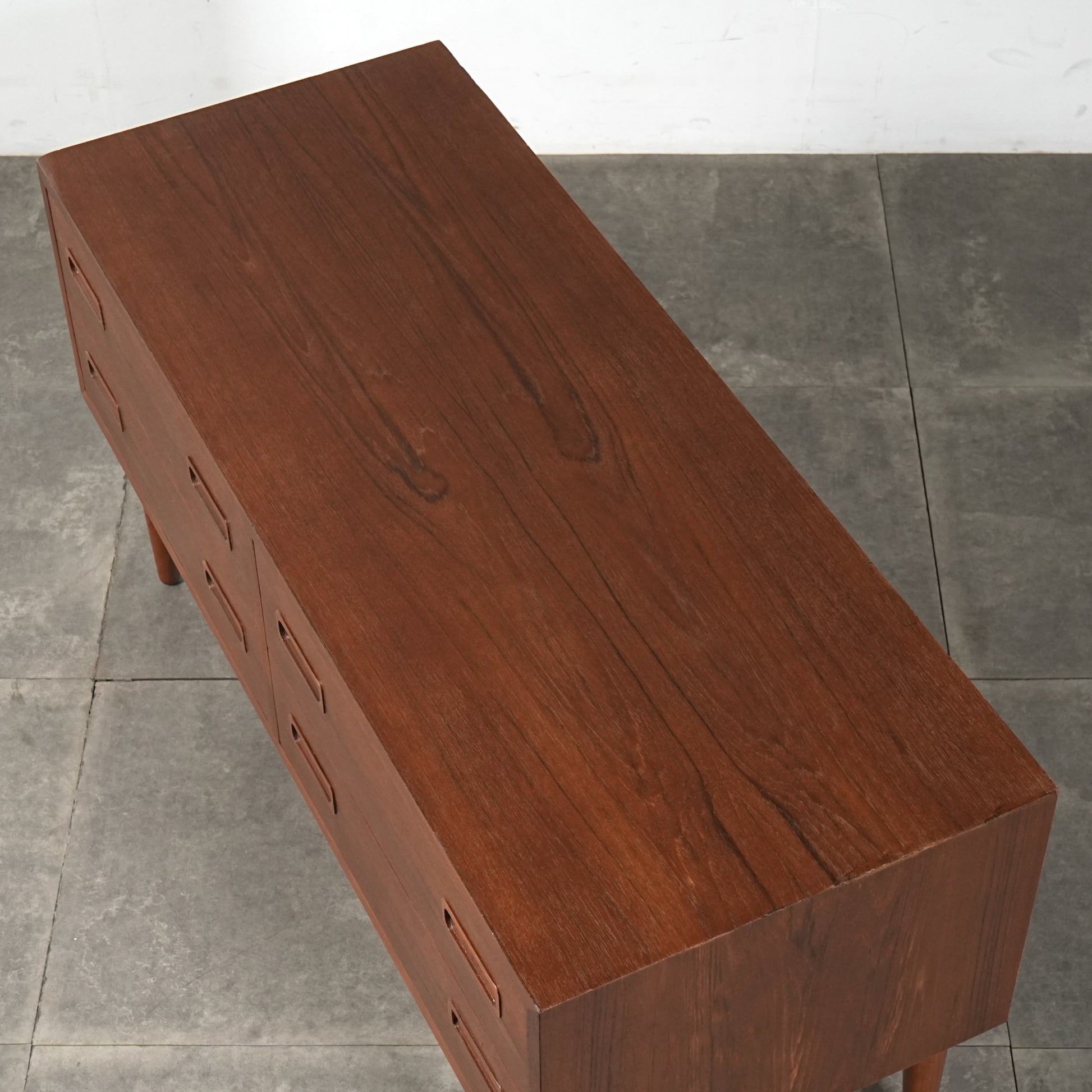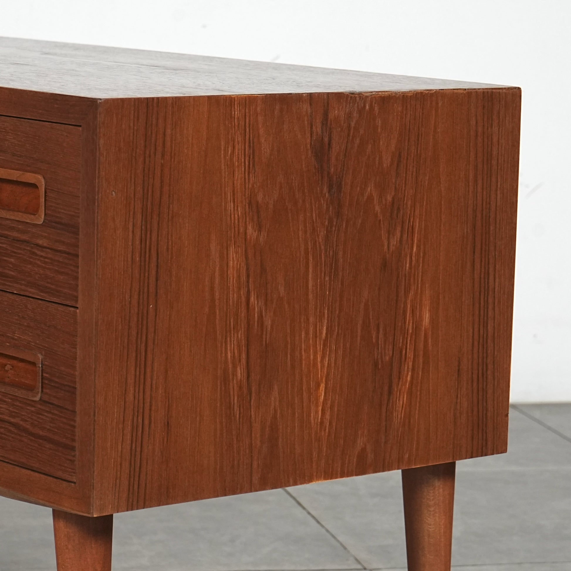 チーク特有のしっとりとした質感と美しい木目だけでなく、可愛らしい取手やシャープな脚部など、シンプルながらも細部に宿るこだわりが見受けられます。