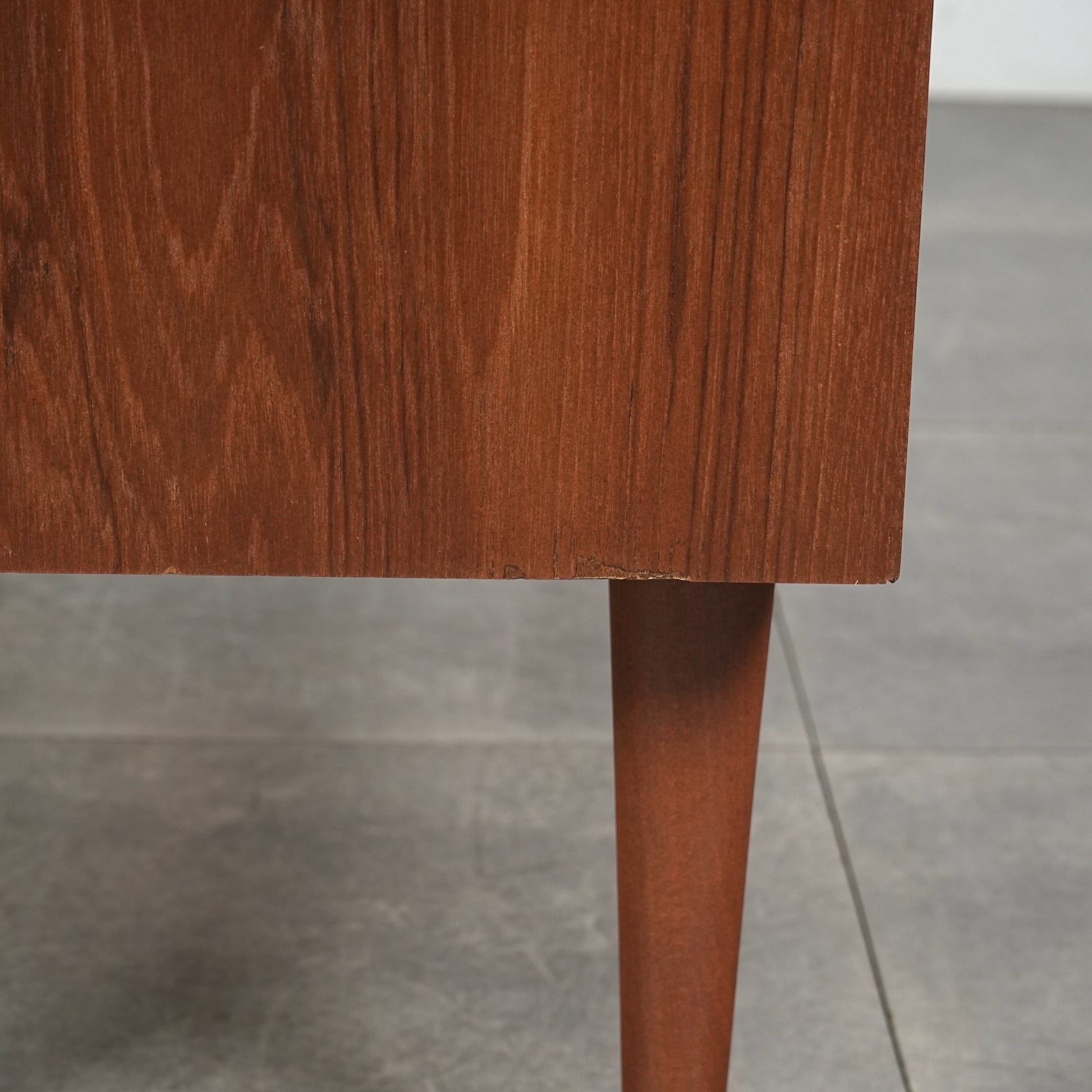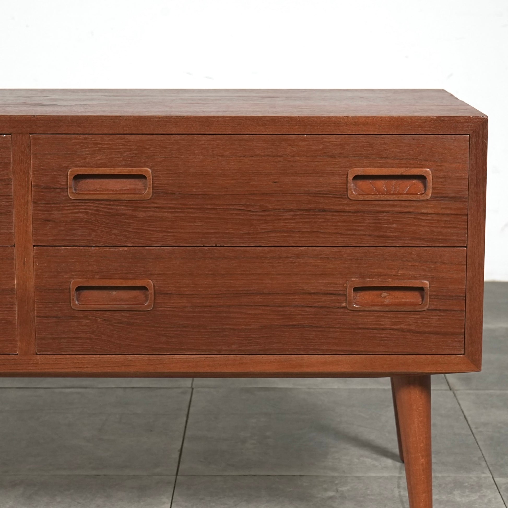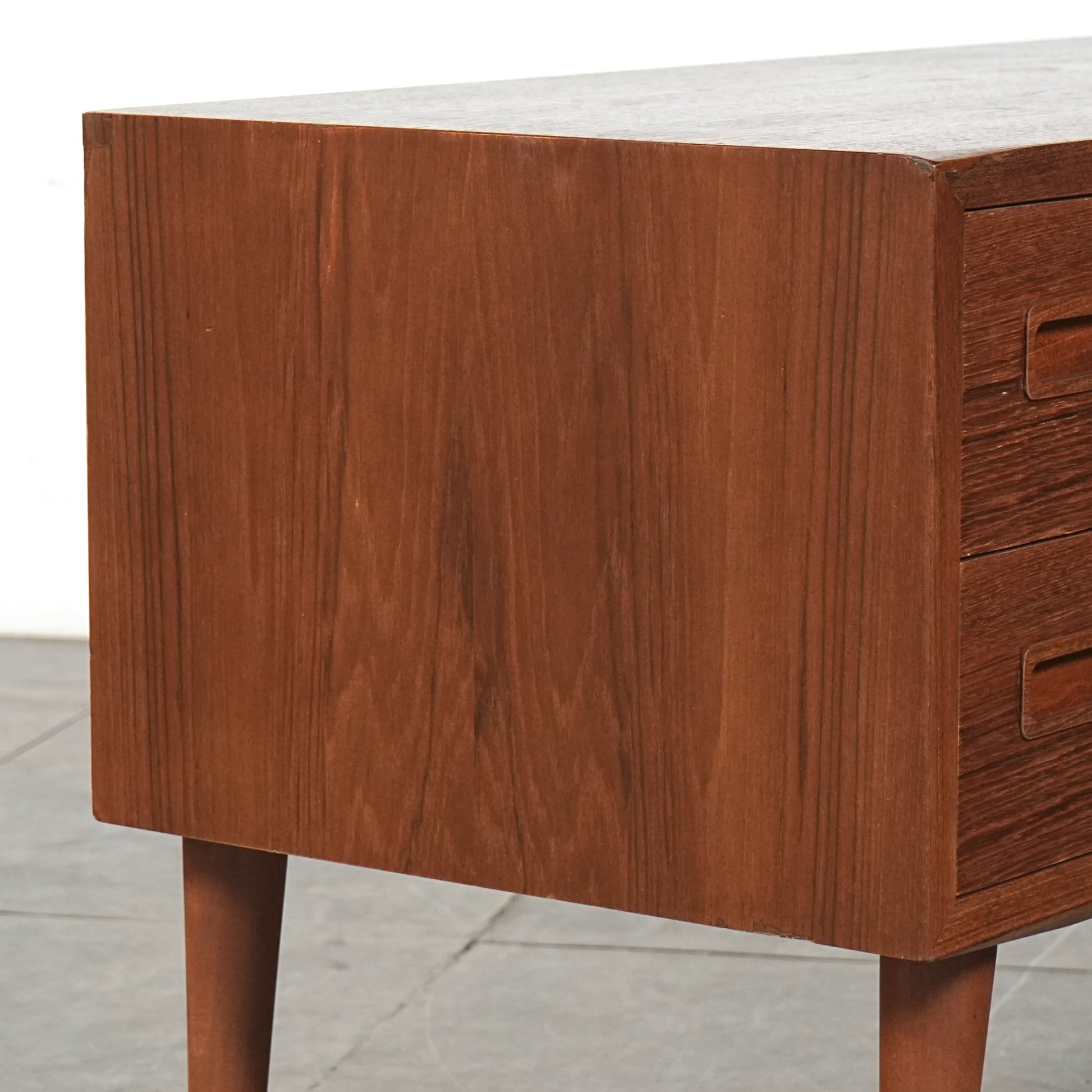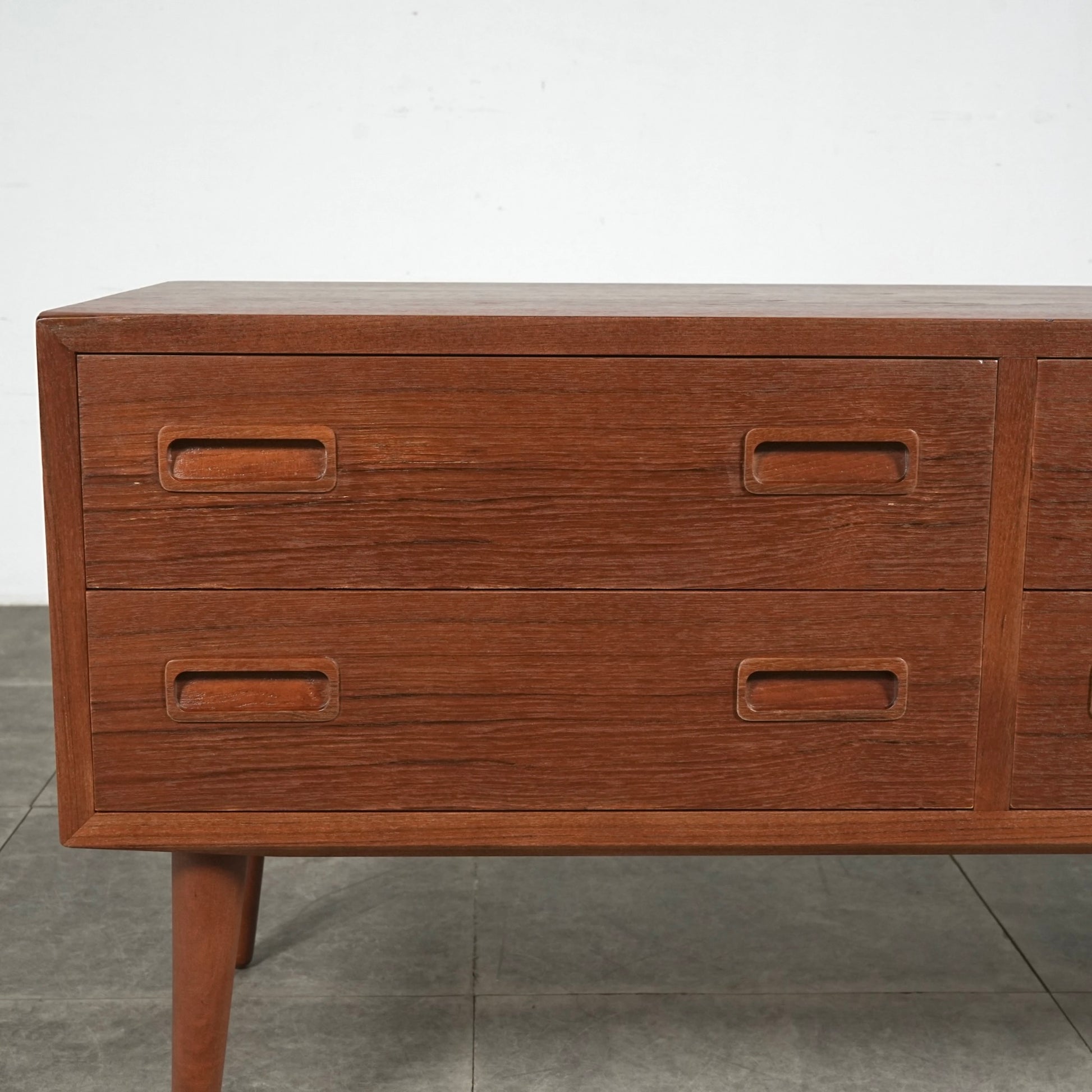 チーク特有のしっとりとした質感と美しい木目だけでなく、可愛らしい取手やシャープな脚部など、シンプルながらも細部に宿るこだわりが見受けられます。
