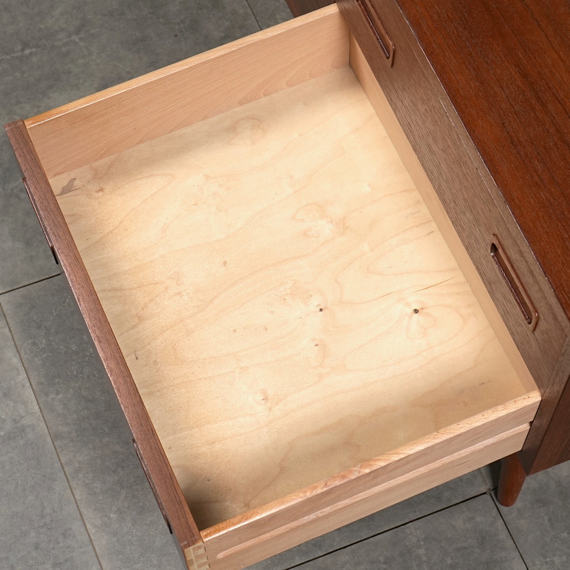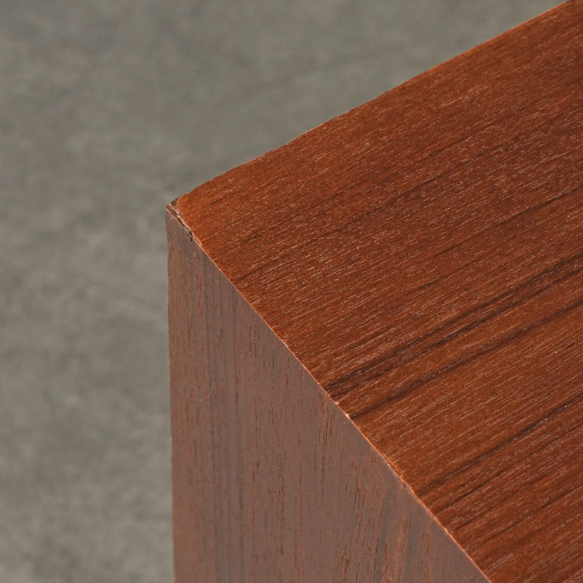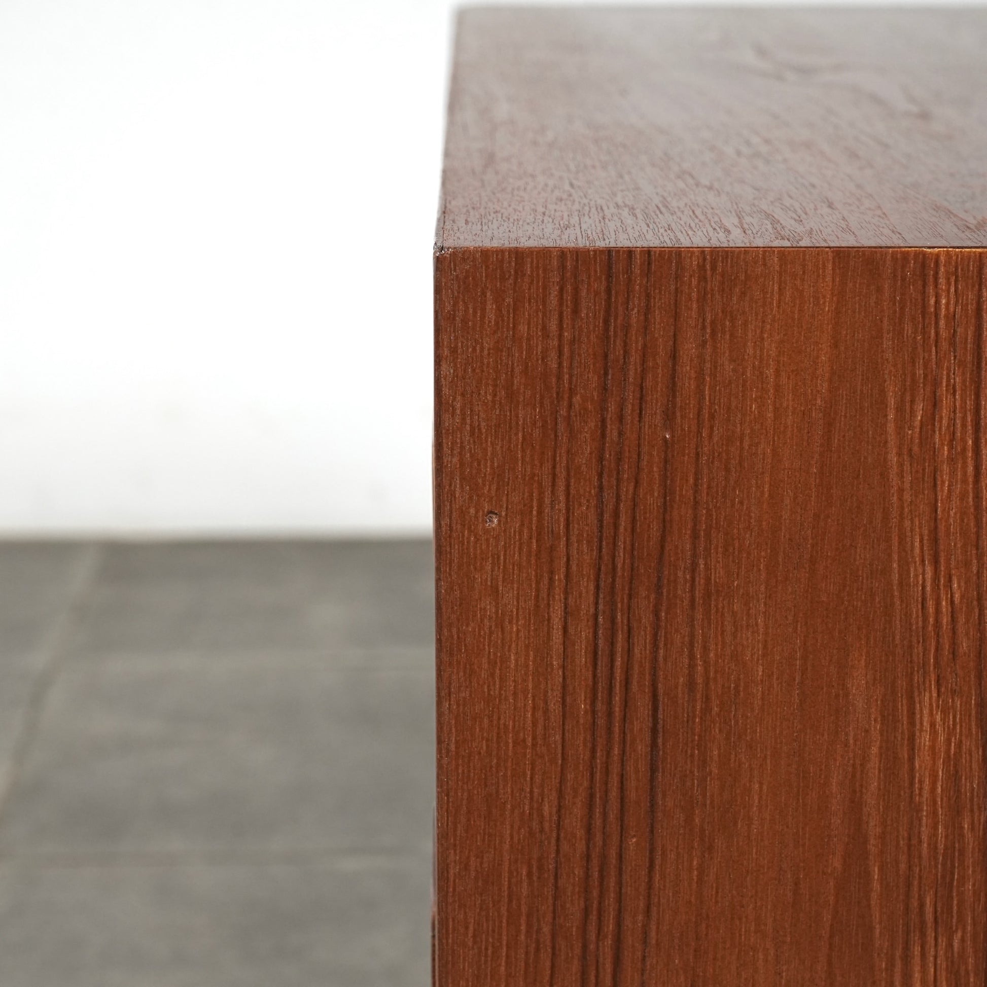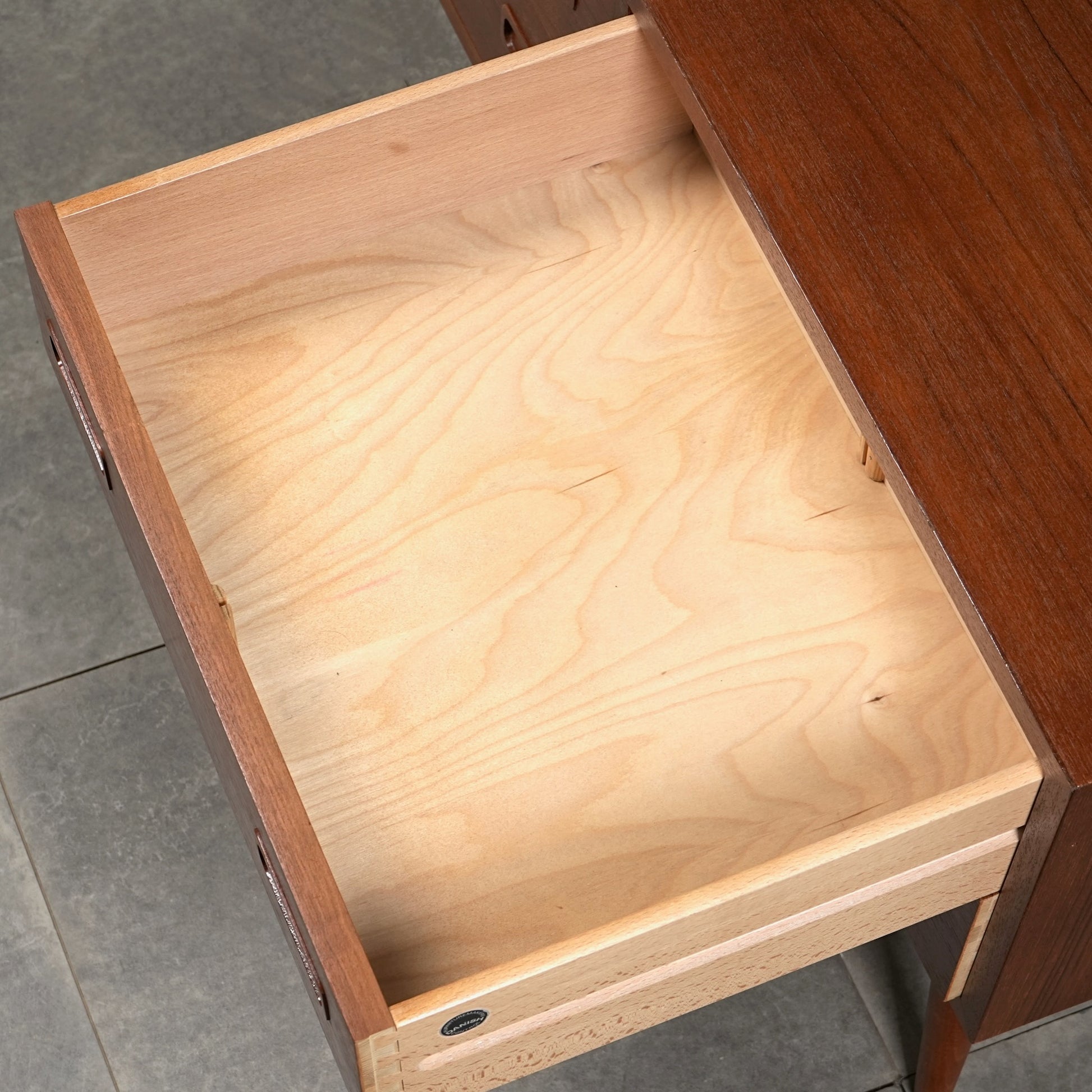 チーク特有のしっとりとした質感と美しい木目だけでなく、可愛らしい取手やシャープな脚部など、シンプルながらも細部に宿るこだわりが見受けられます。