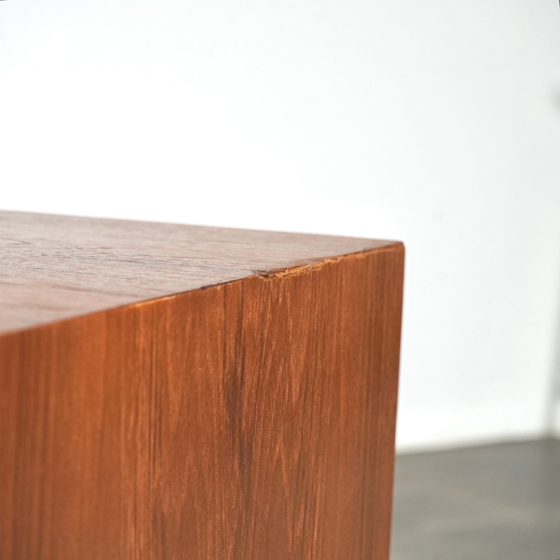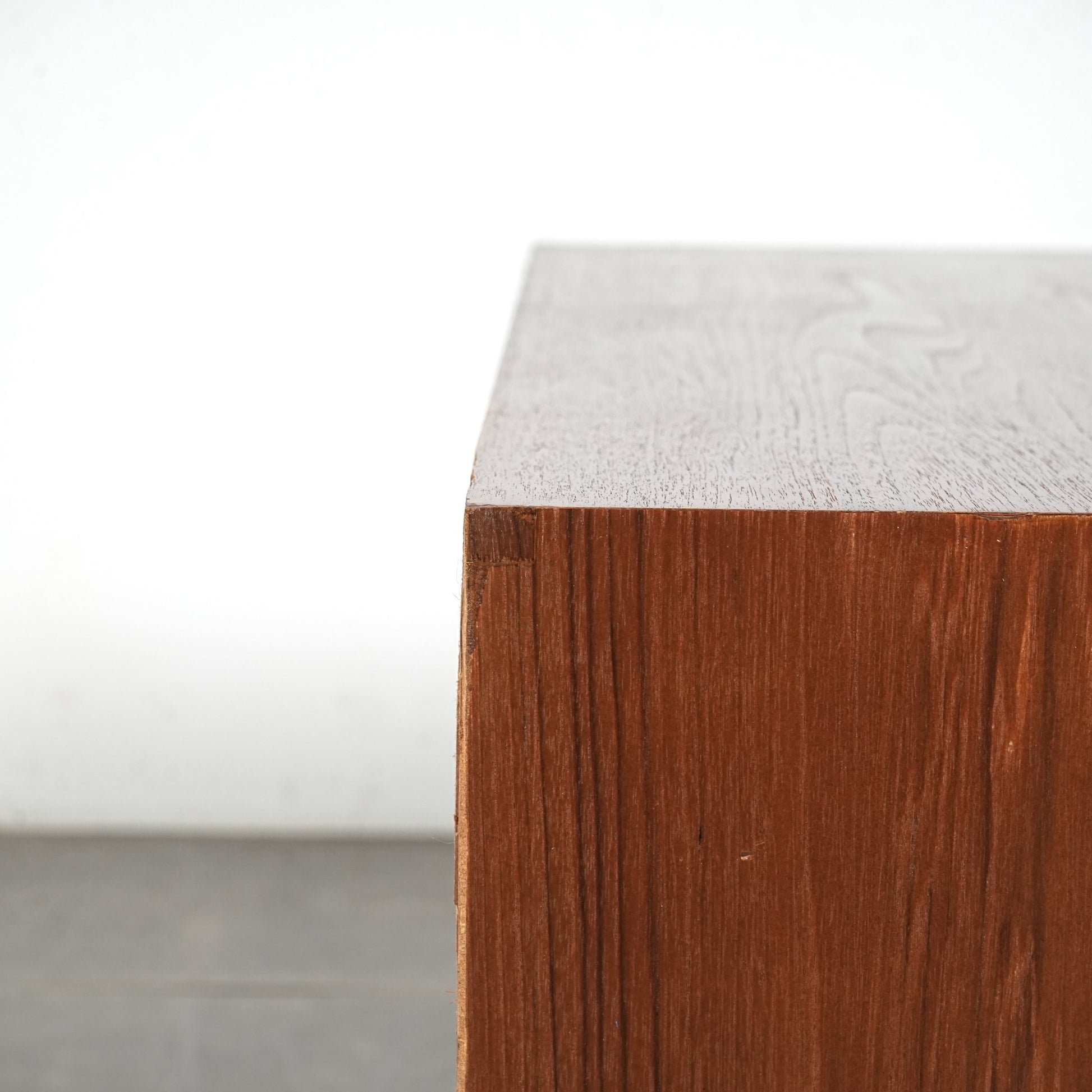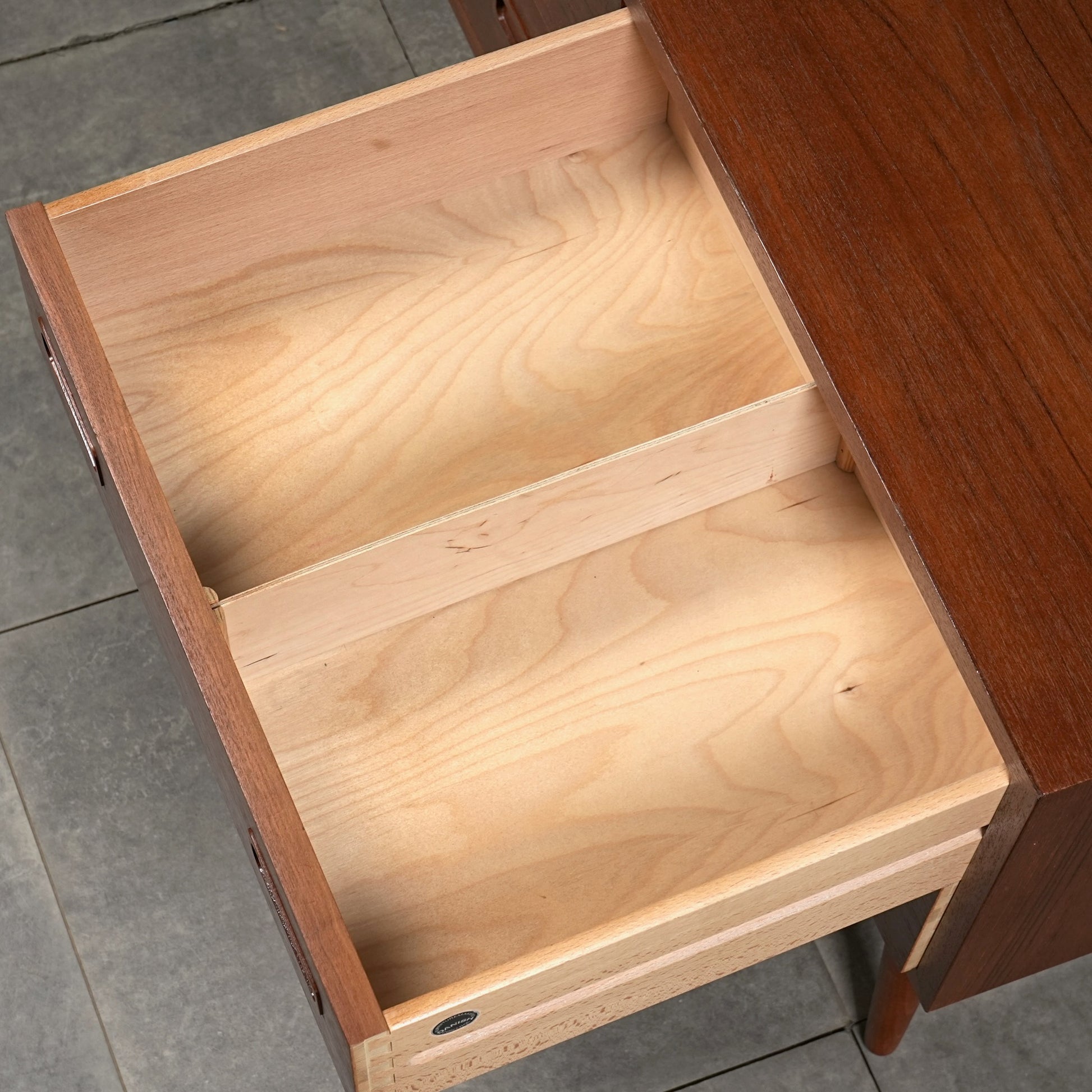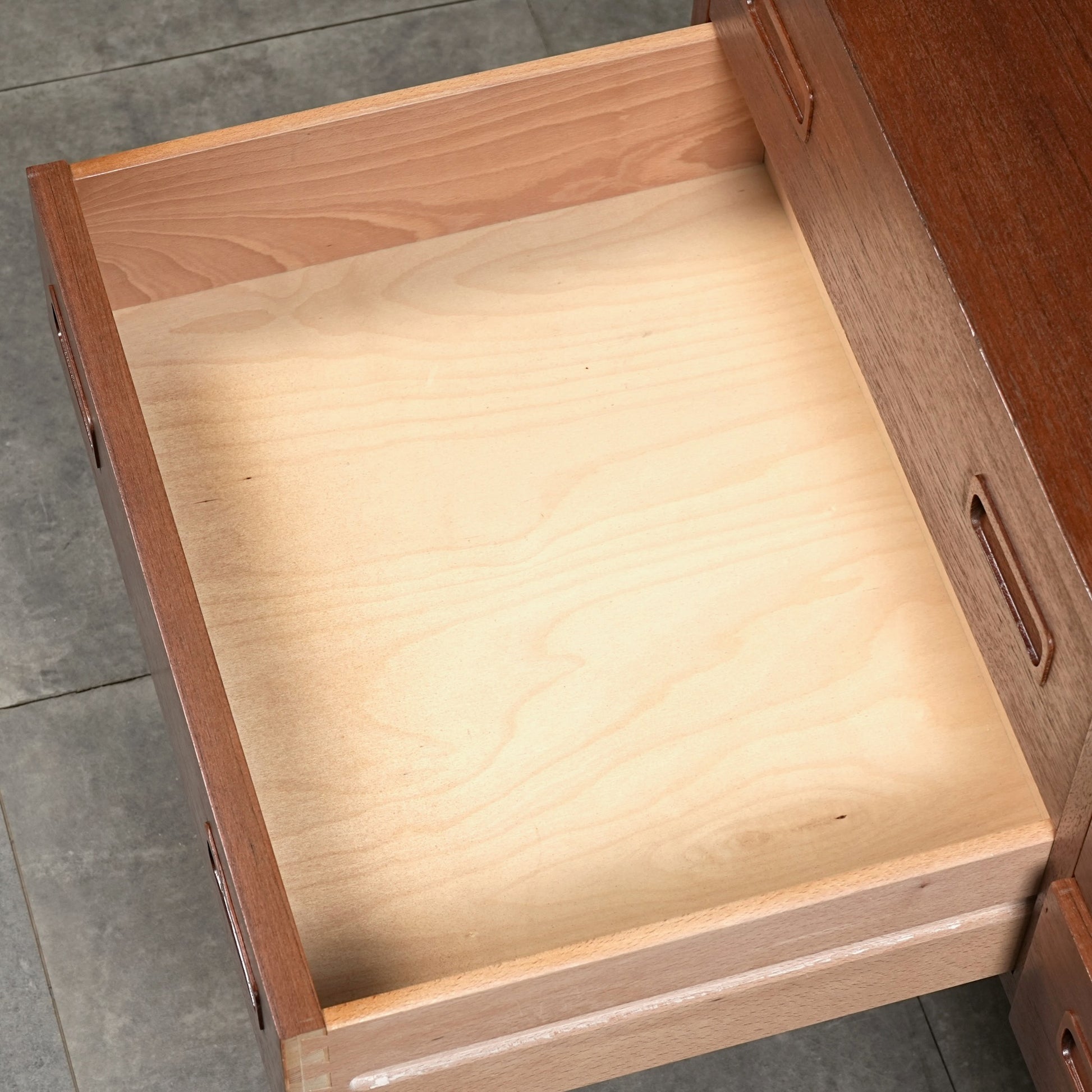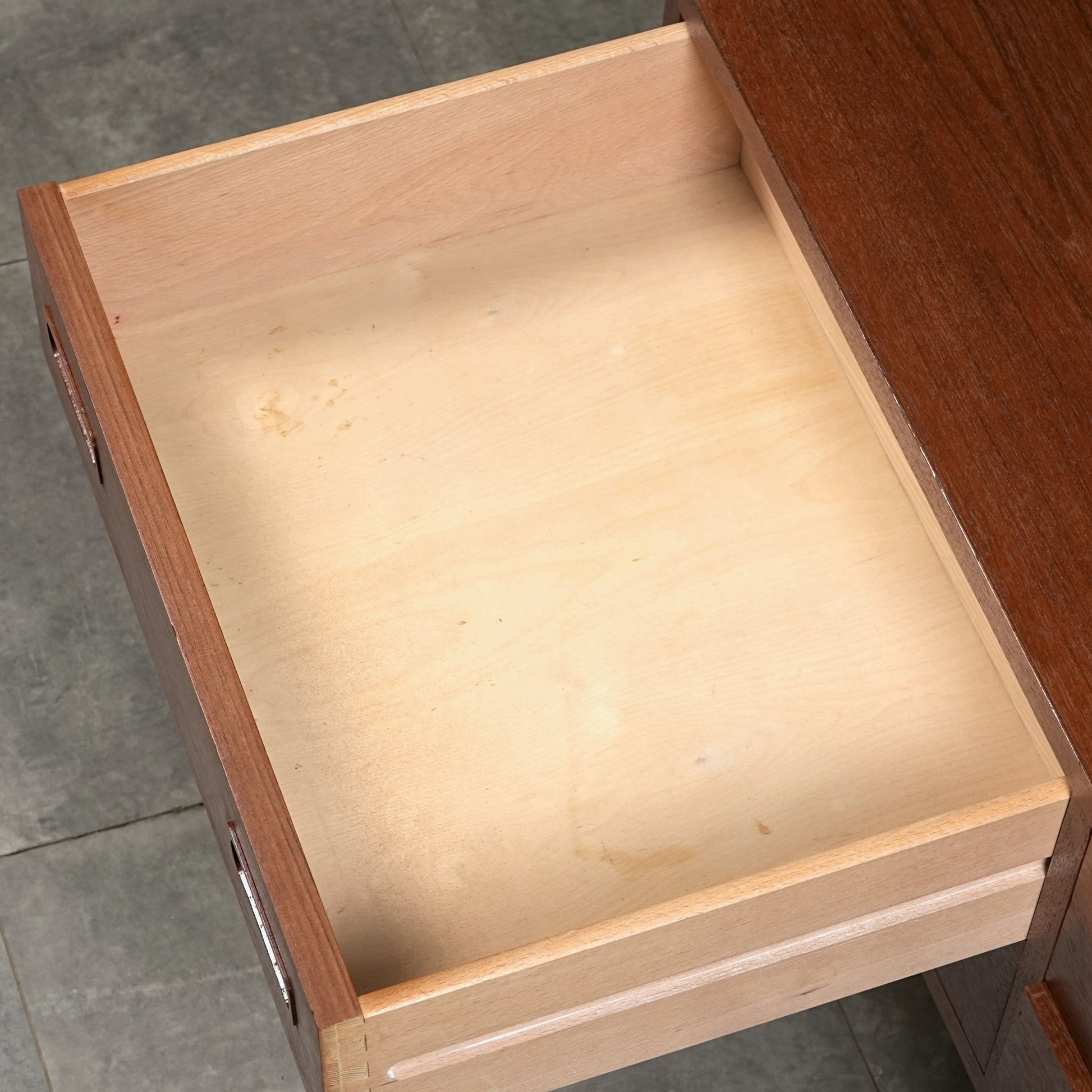 チーク特有のしっとりとした質感と美しい木目だけでなく、可愛らしい取手やシャープな脚部など、シンプルながらも細部に宿るこだわりが見受けられます。