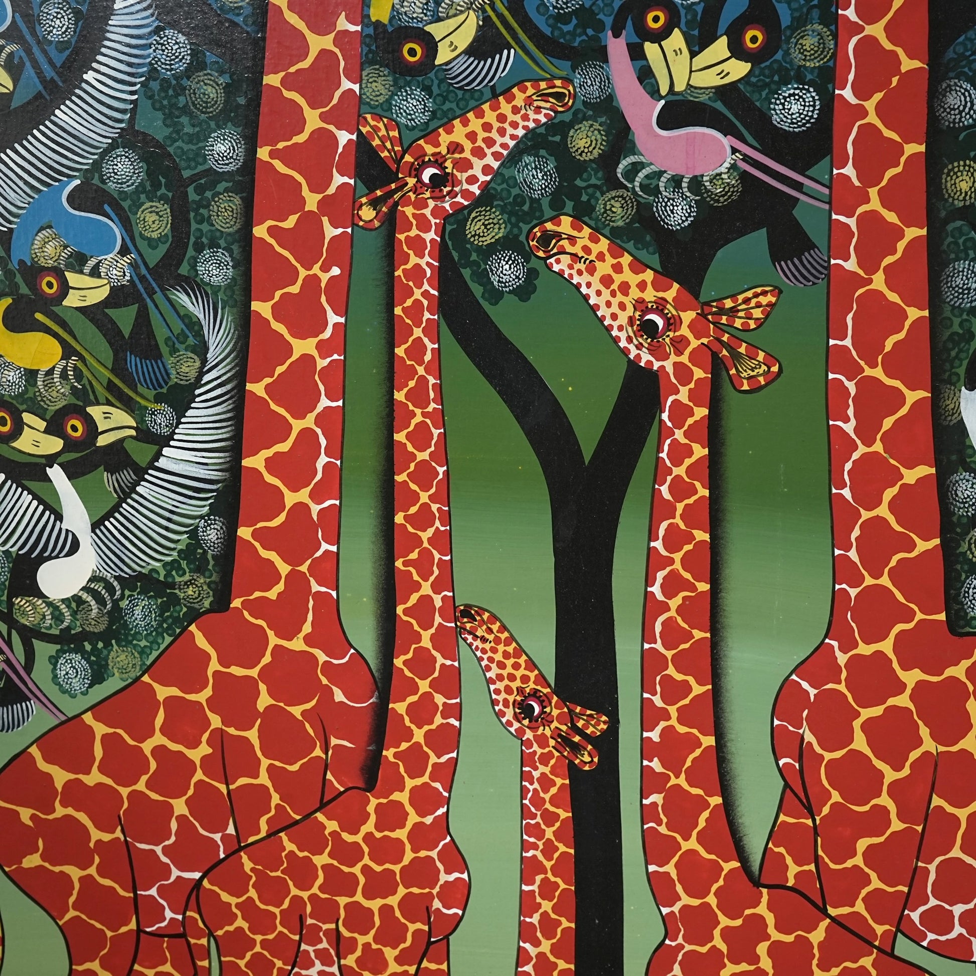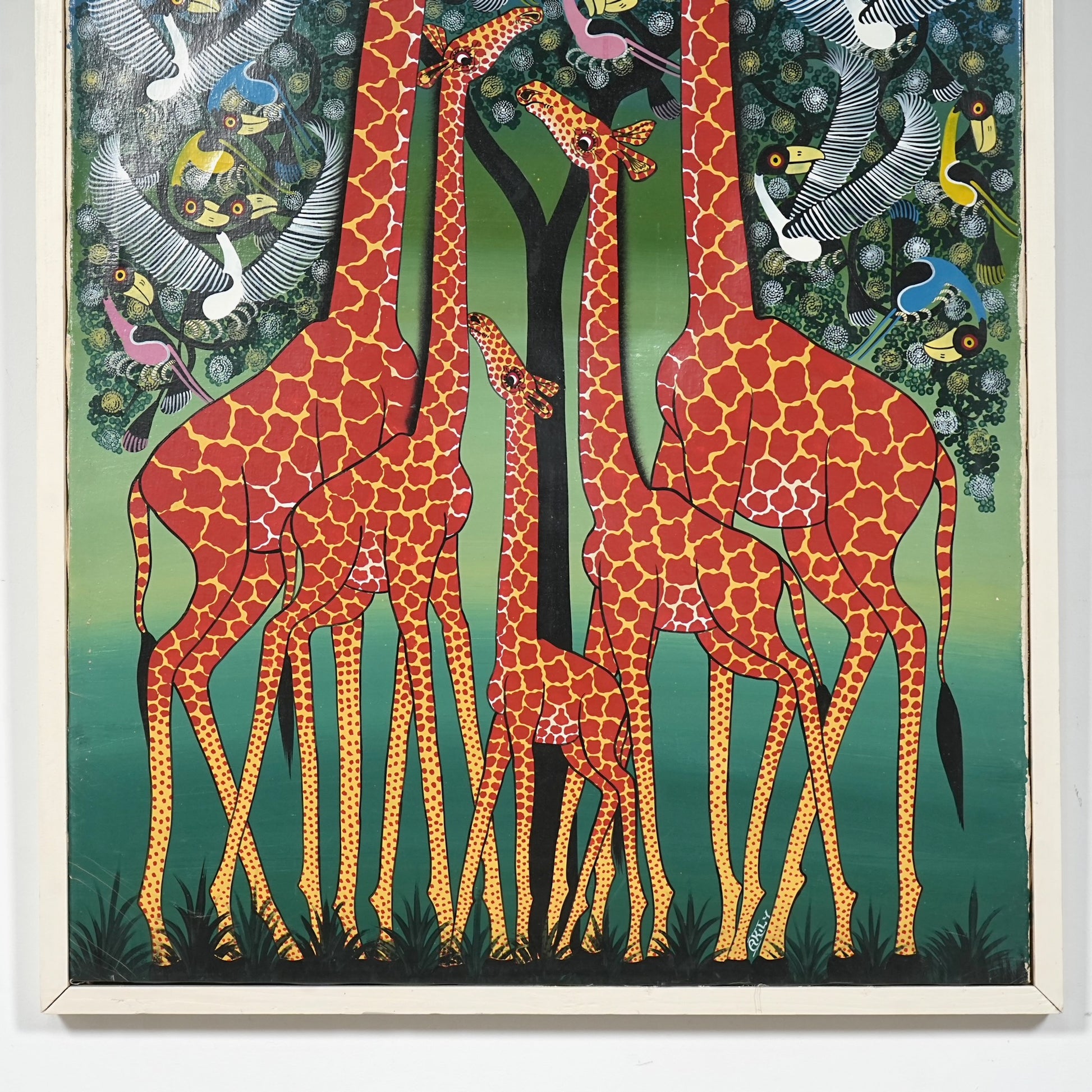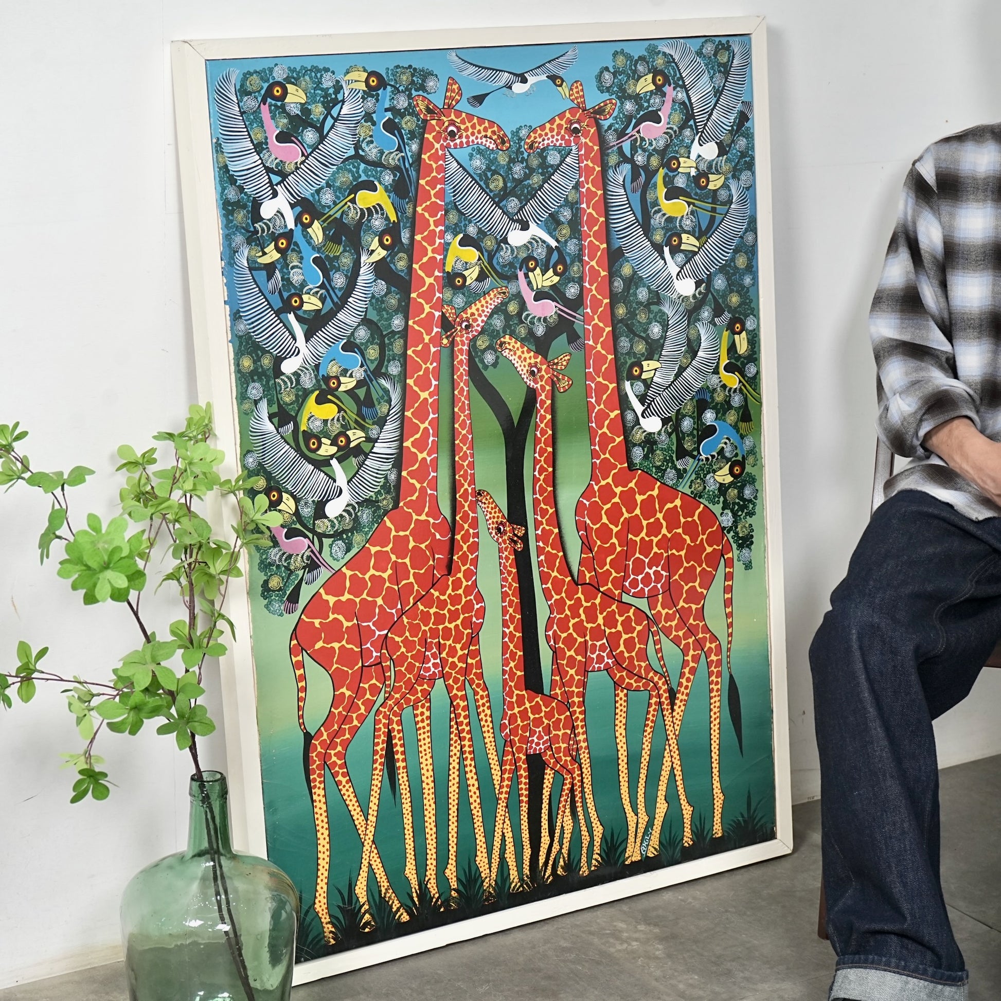 本作では、キリンの親子と木々を舞う鳥たちがリズミカルに描かれており、生命力と伸びやかな躍動感に満ちた一枚。
