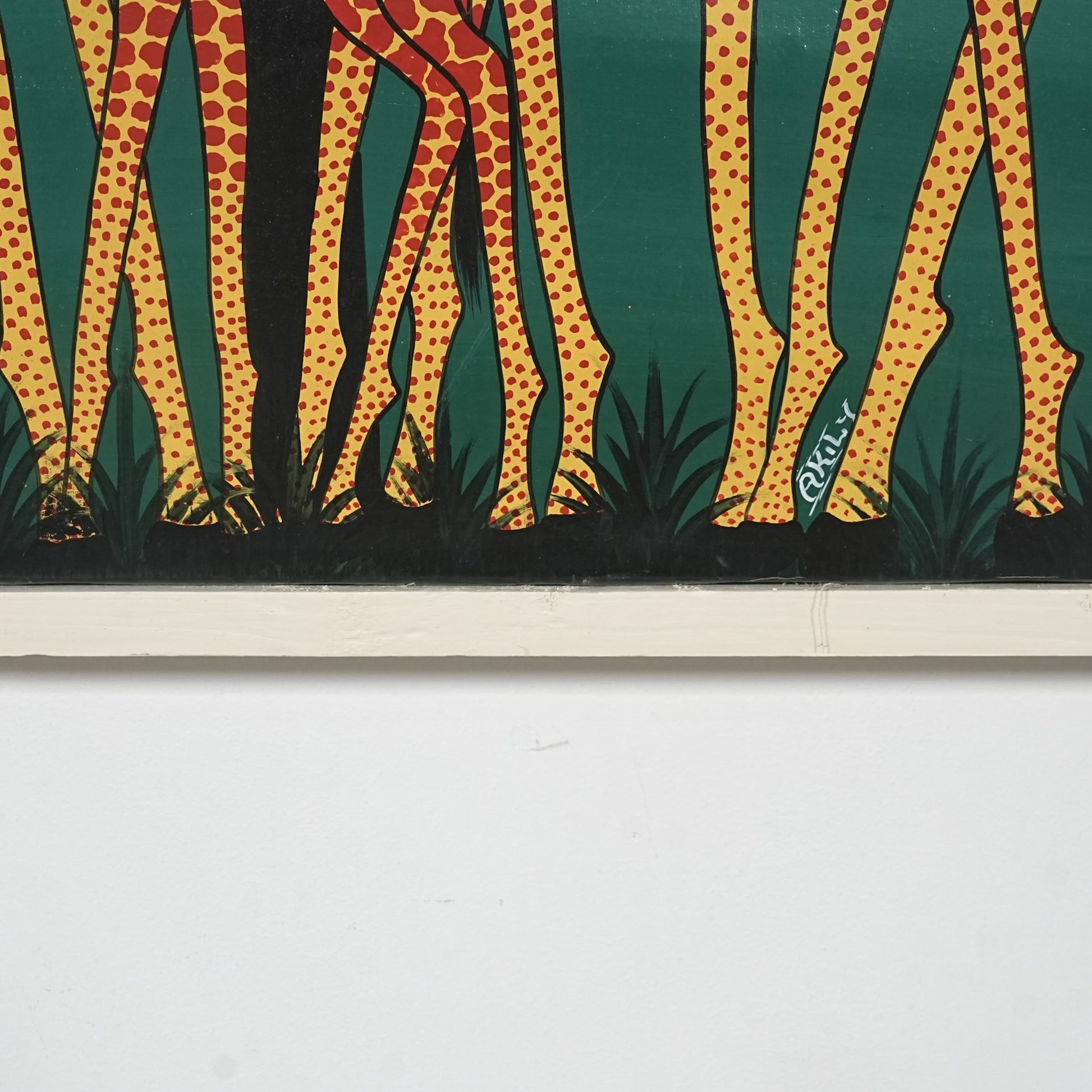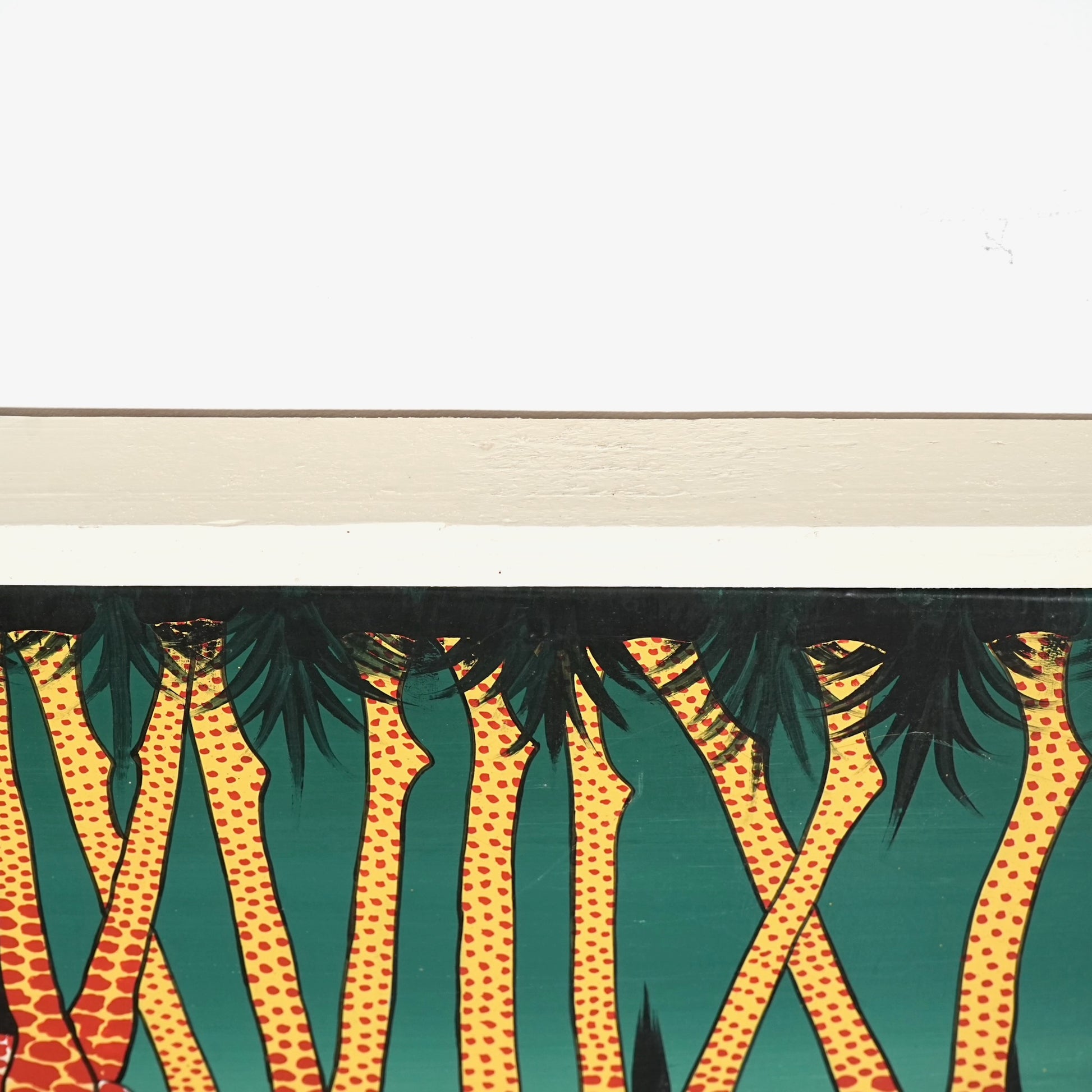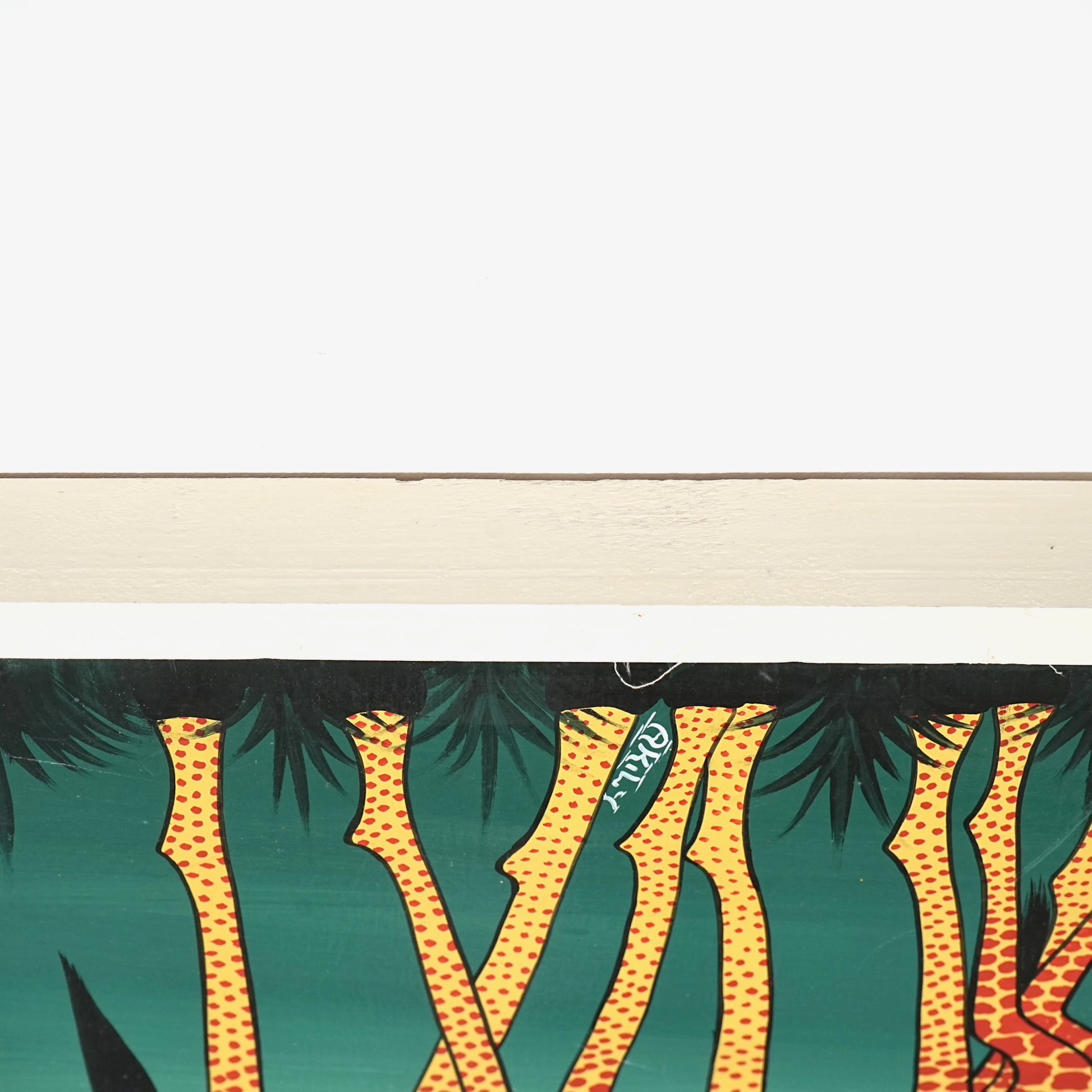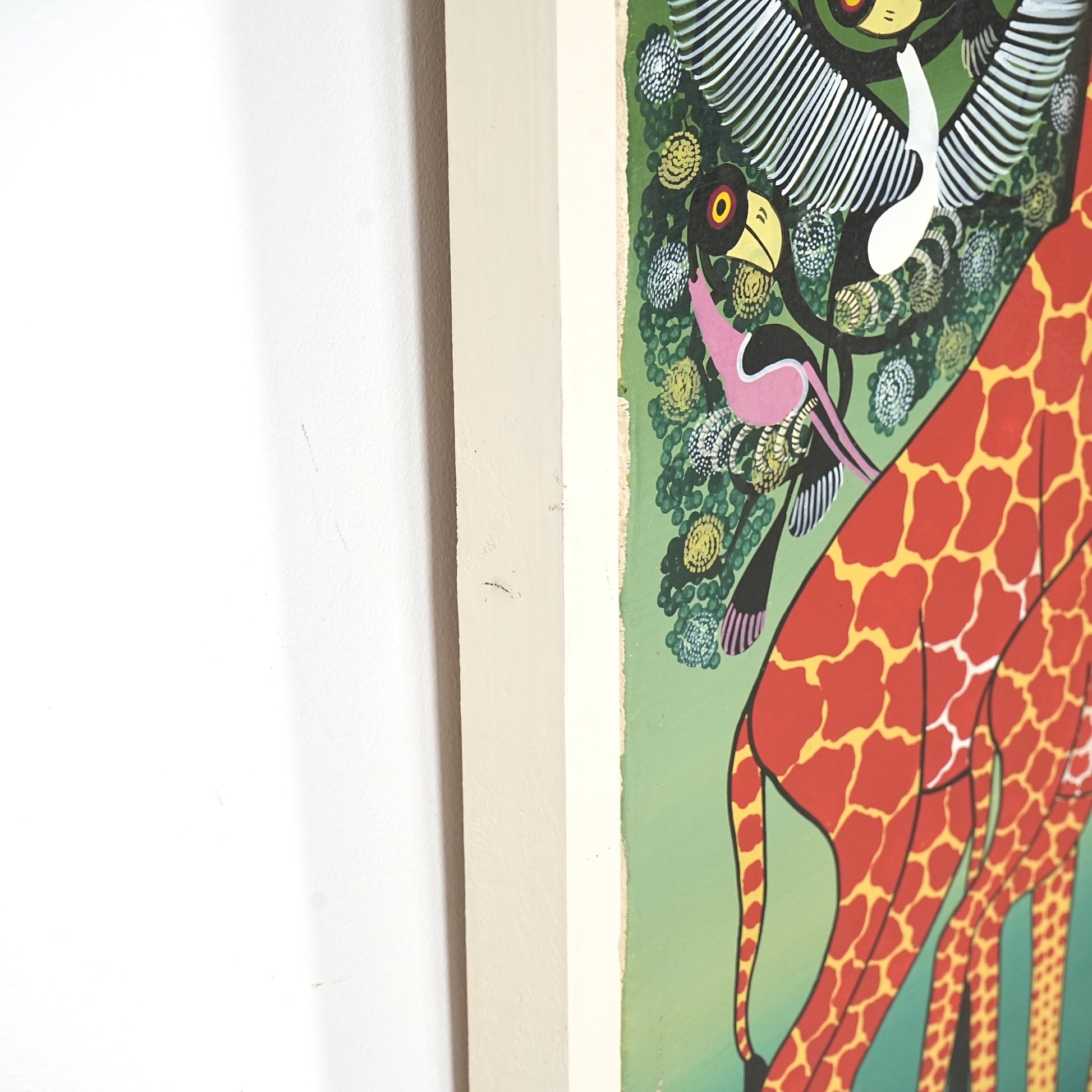 本作では、キリンの親子と木々を舞う鳥たちがリズミカルに描かれており、生命力と伸びやかな躍動感に満ちた一枚。