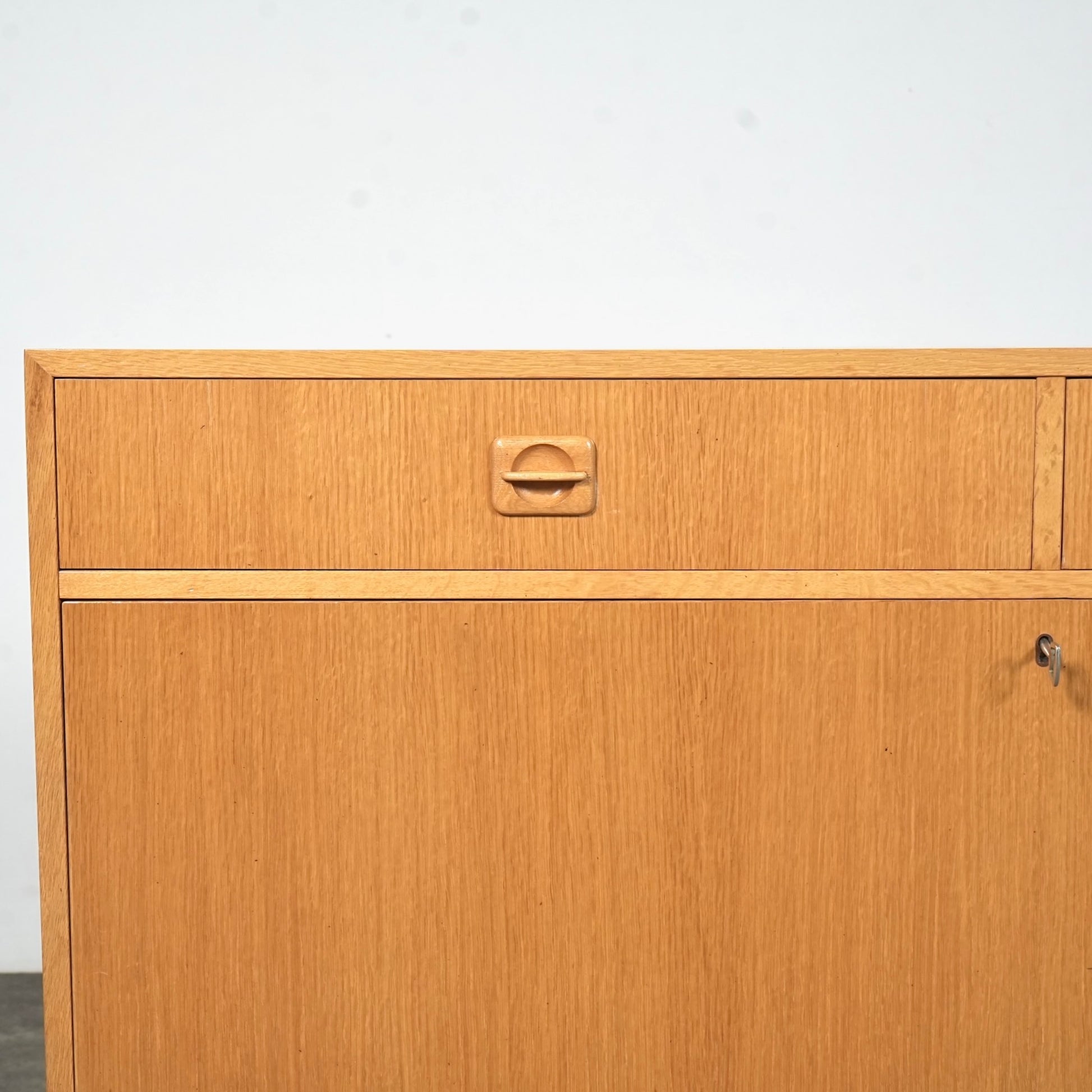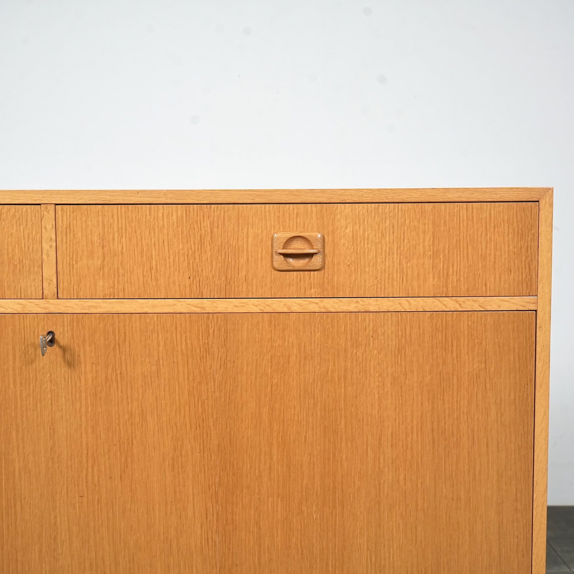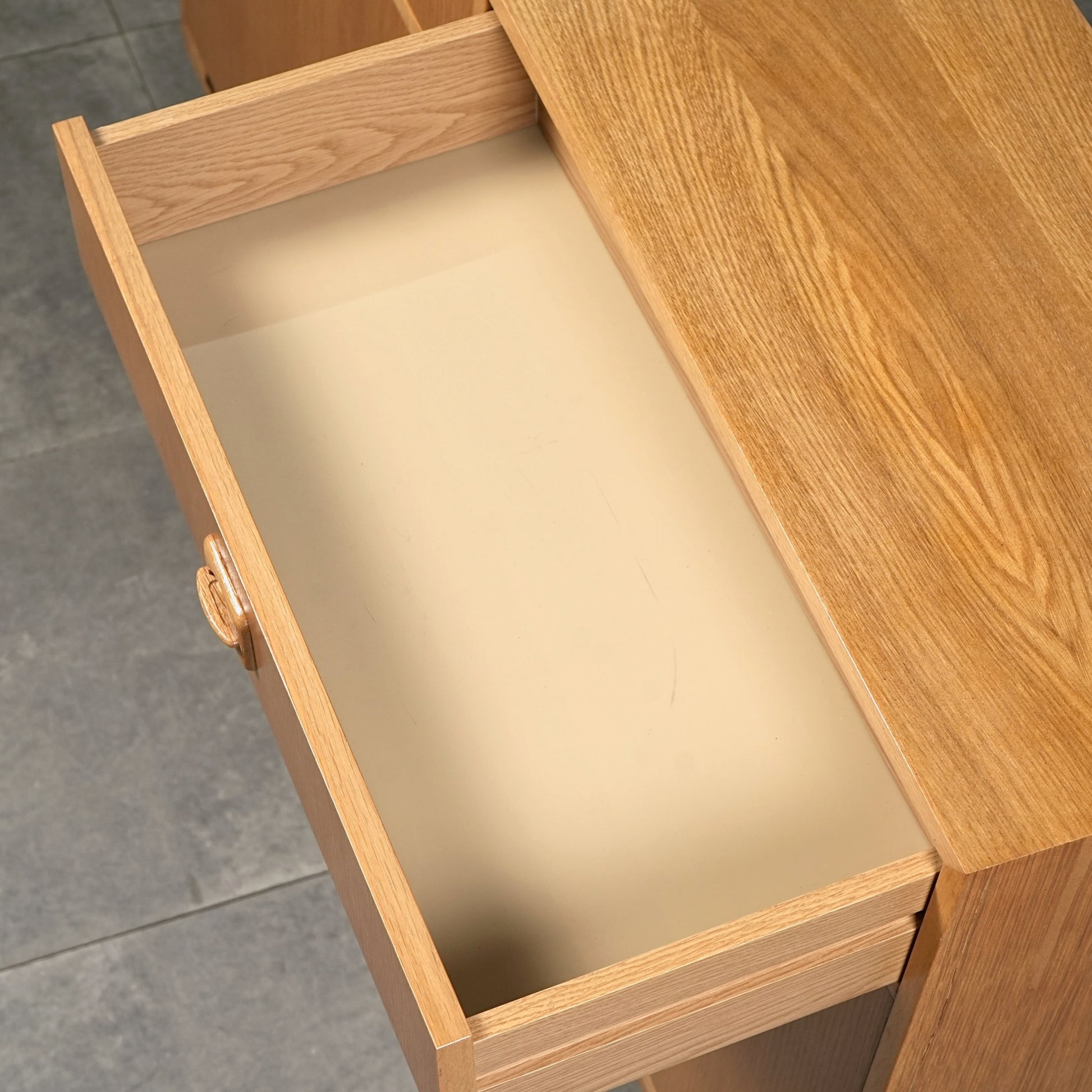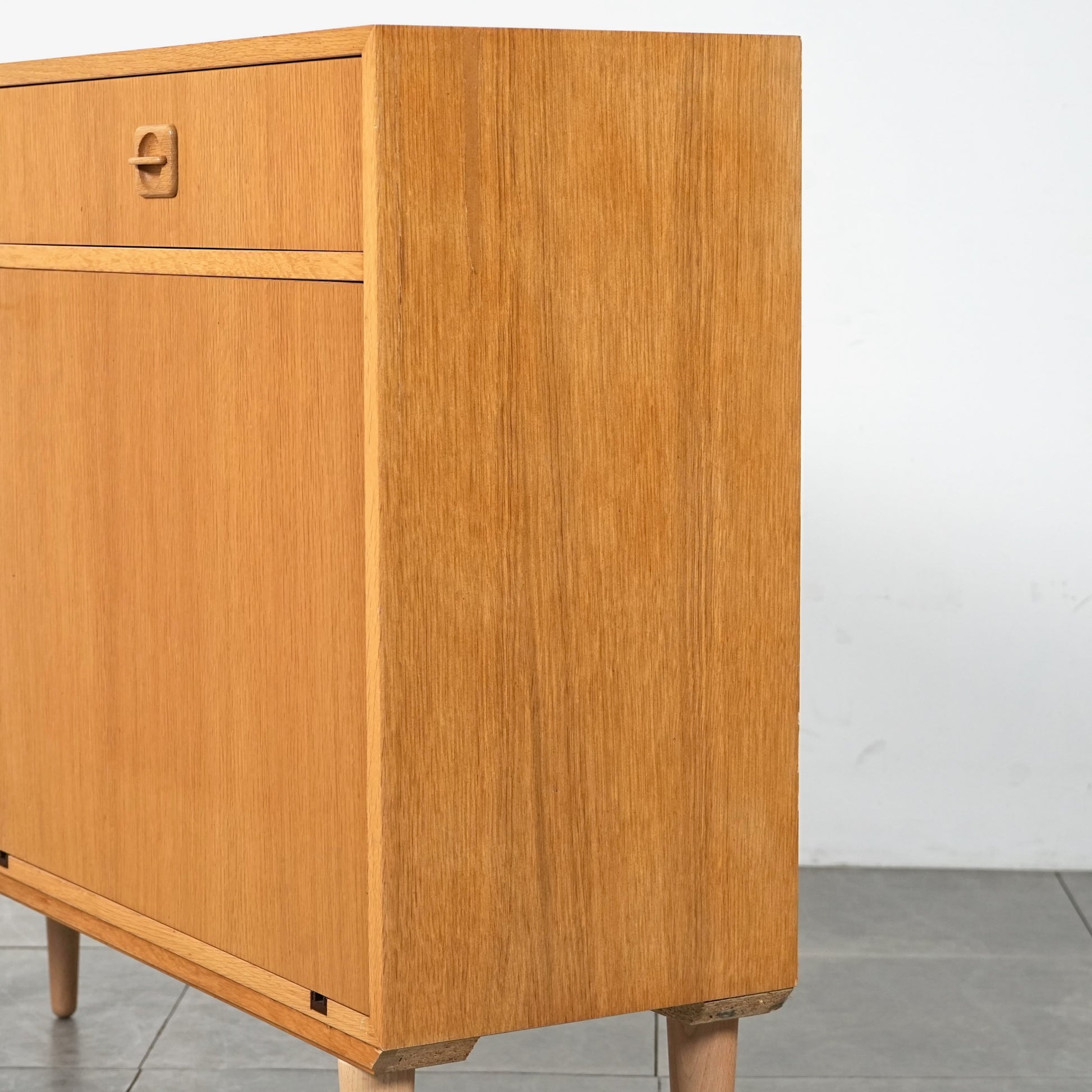 チーク材のキャビネットとはまた一味違った魅力を楽しんで頂ける高品質なオーク材を使用しており、現代の住環境にも違和感なく馴染むバランスの良いデザインの中に、削り出しの可愛らしい取手や脚部のシャープなラインが良いアクセントとなっています。