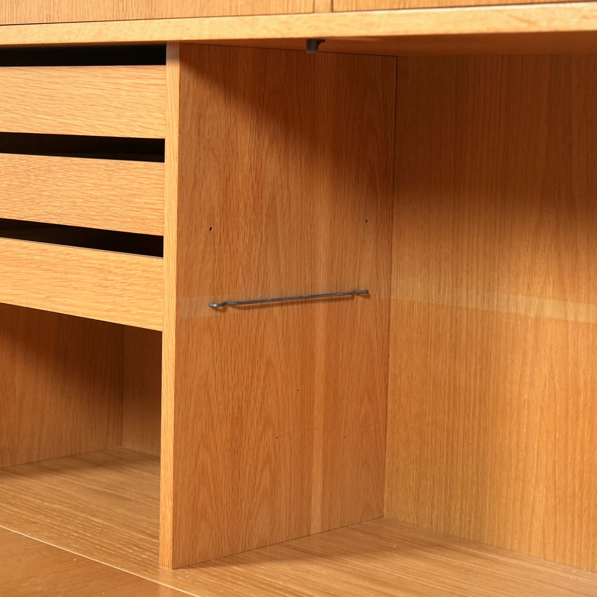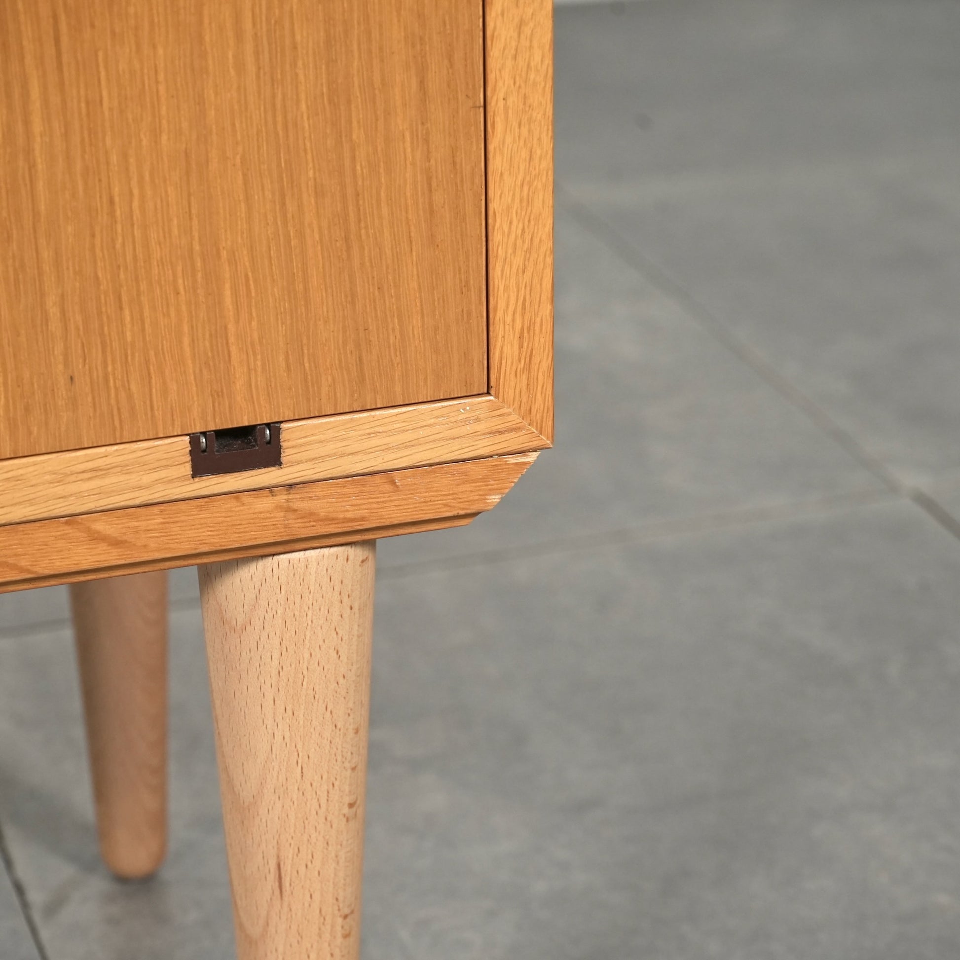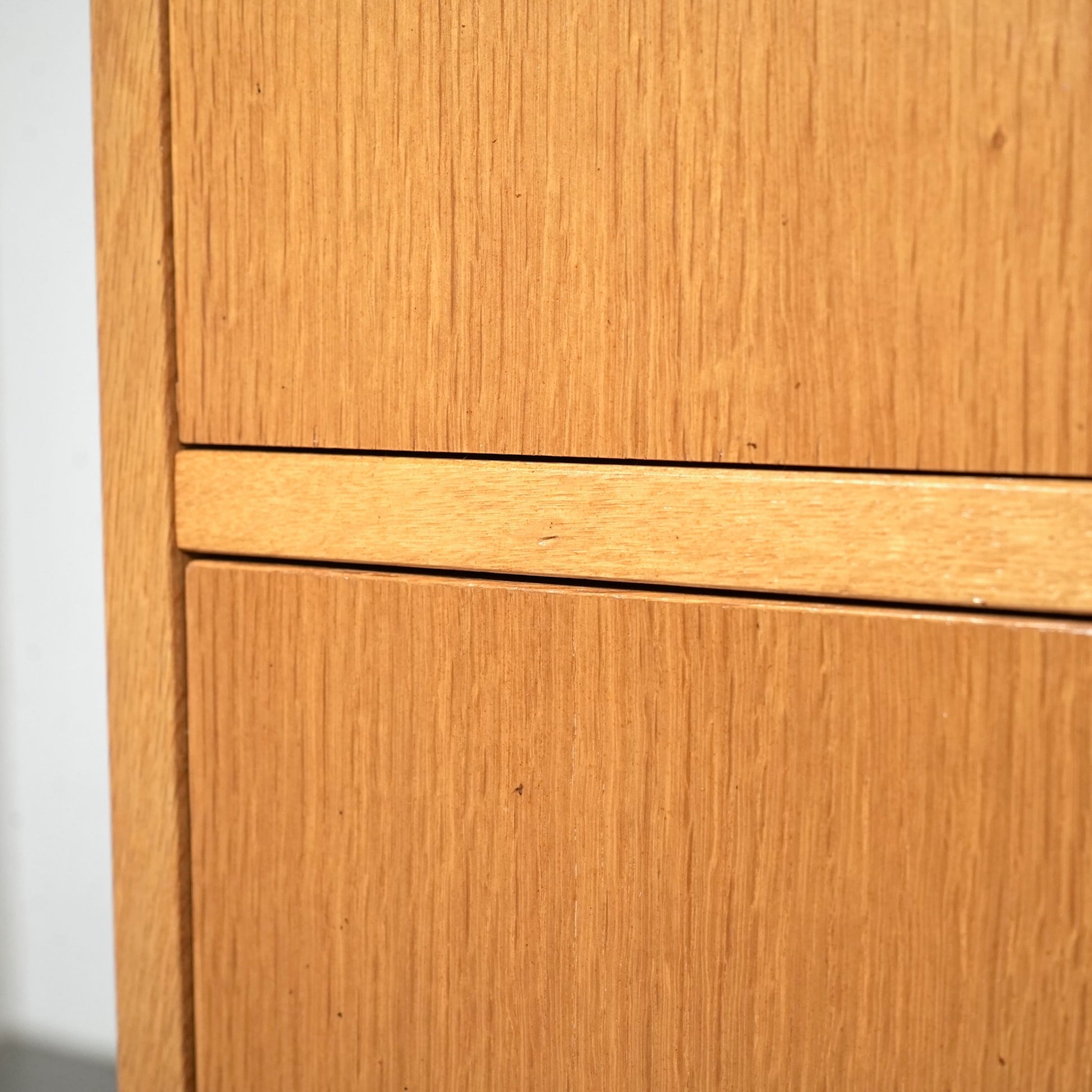 チーク材のキャビネットとはまた一味違った魅力を楽しんで頂ける高品質なオーク材を使用しており、現代の住環境にも違和感なく馴染むバランスの良いデザインの中に、削り出しの可愛らしい取手や脚部のシャープなラインが良いアクセントとなっています。