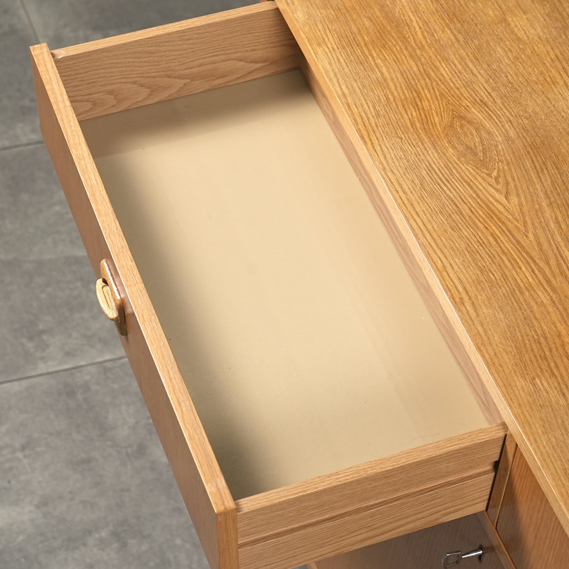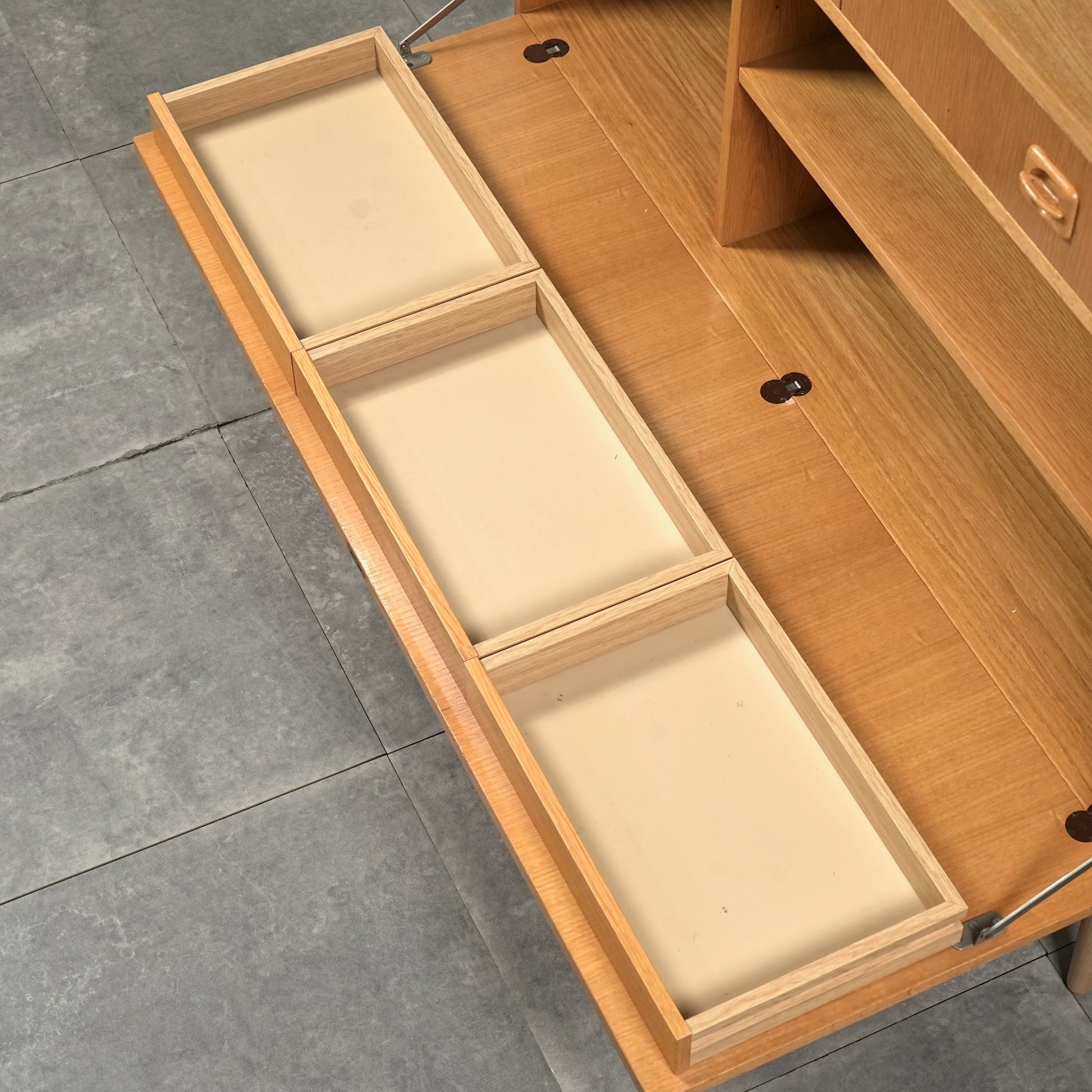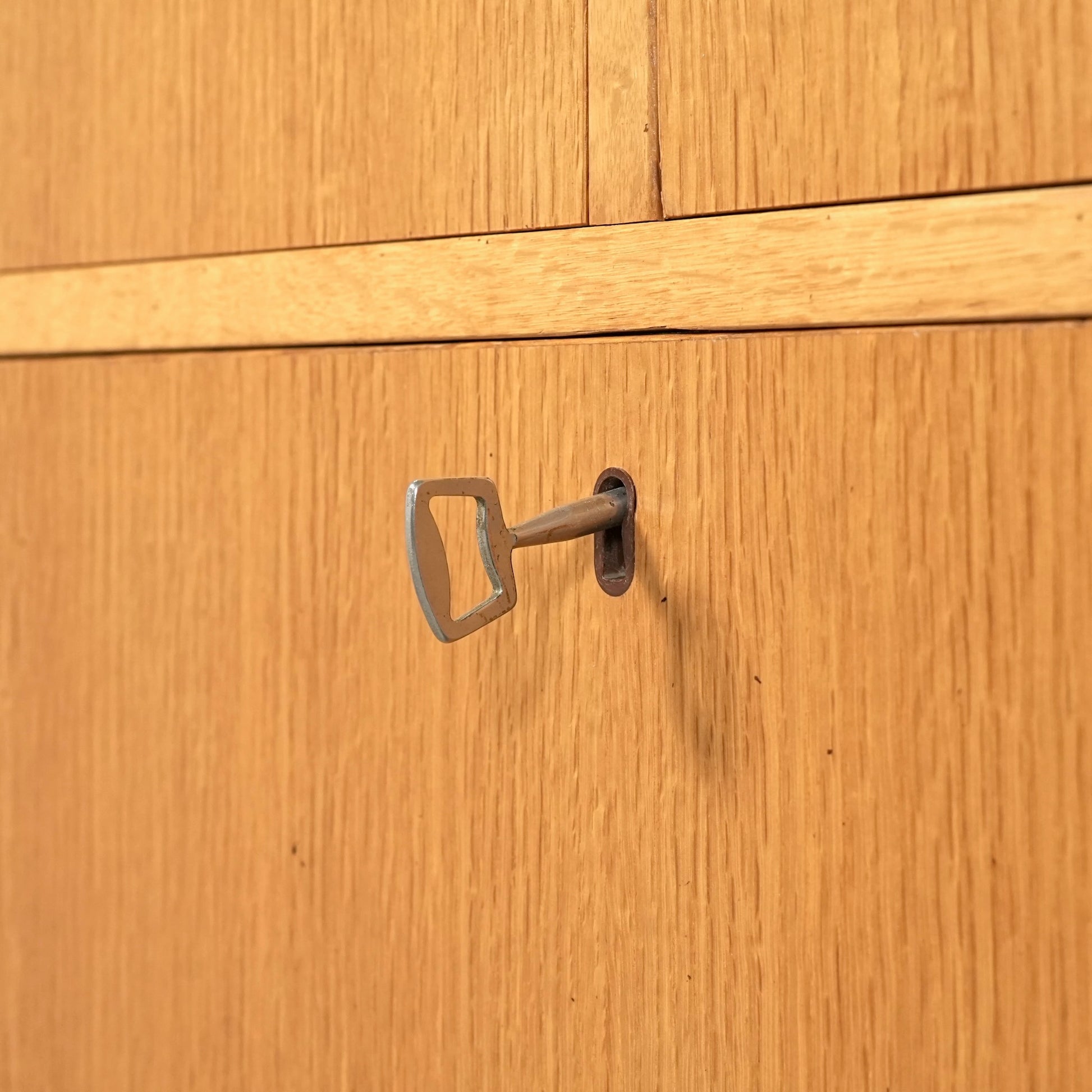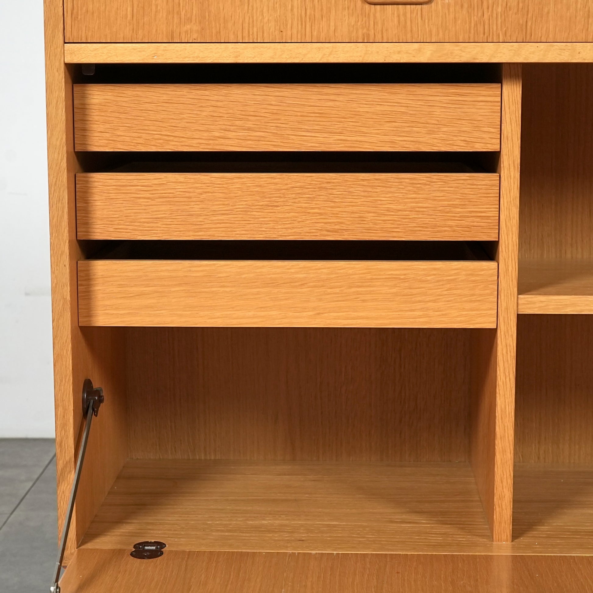 チーク材のキャビネットとはまた一味違った魅力を楽しんで頂ける高品質なオーク材を使用しており、現代の住環境にも違和感なく馴染むバランスの良いデザインの中に、削り出しの可愛らしい取手や脚部のシャープなラインが良いアクセントとなっています。