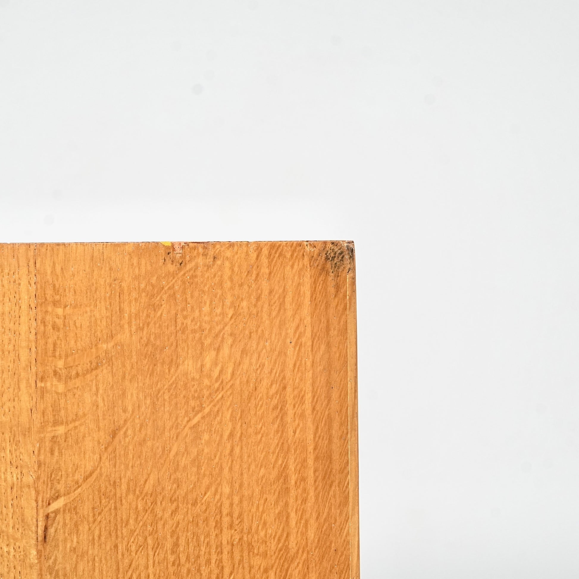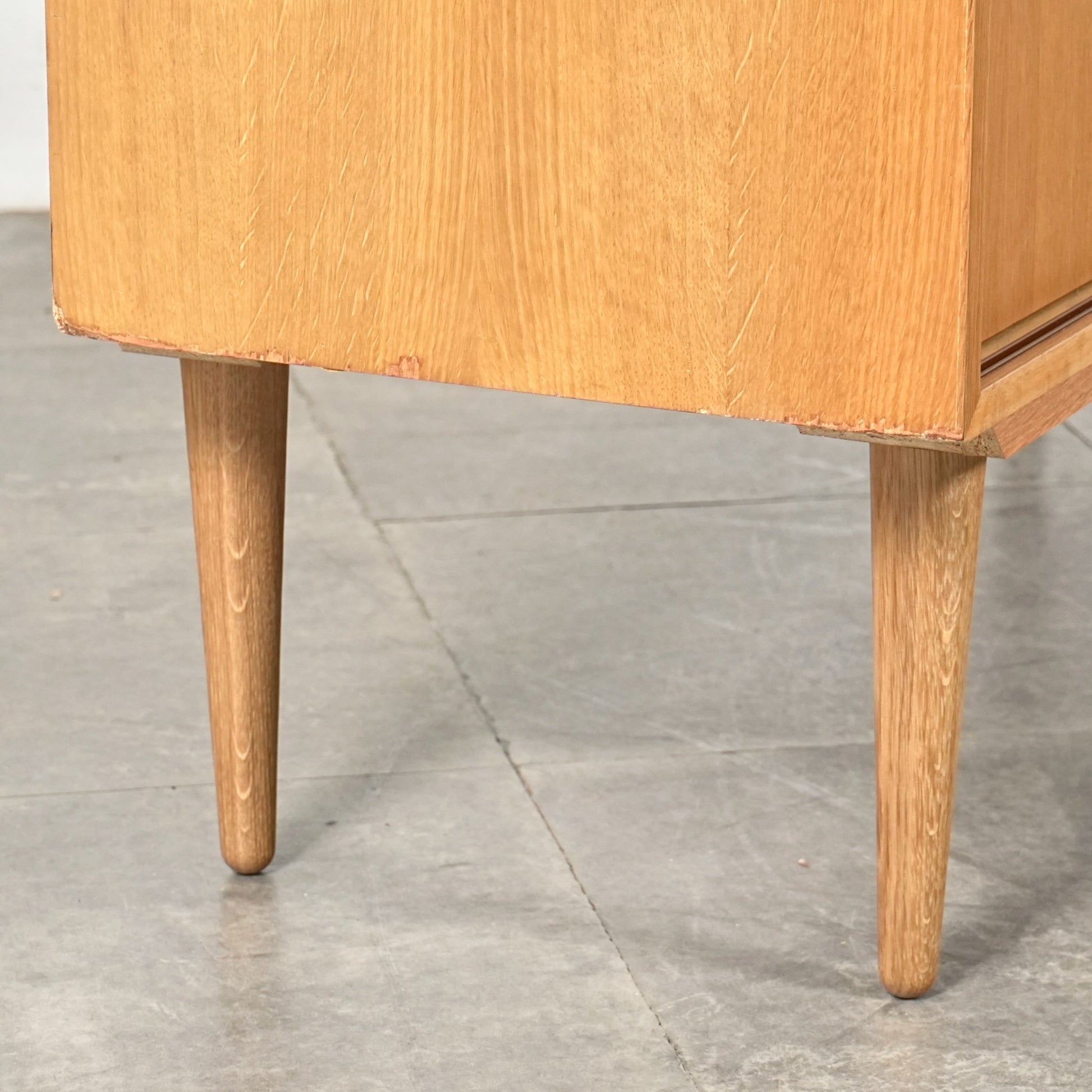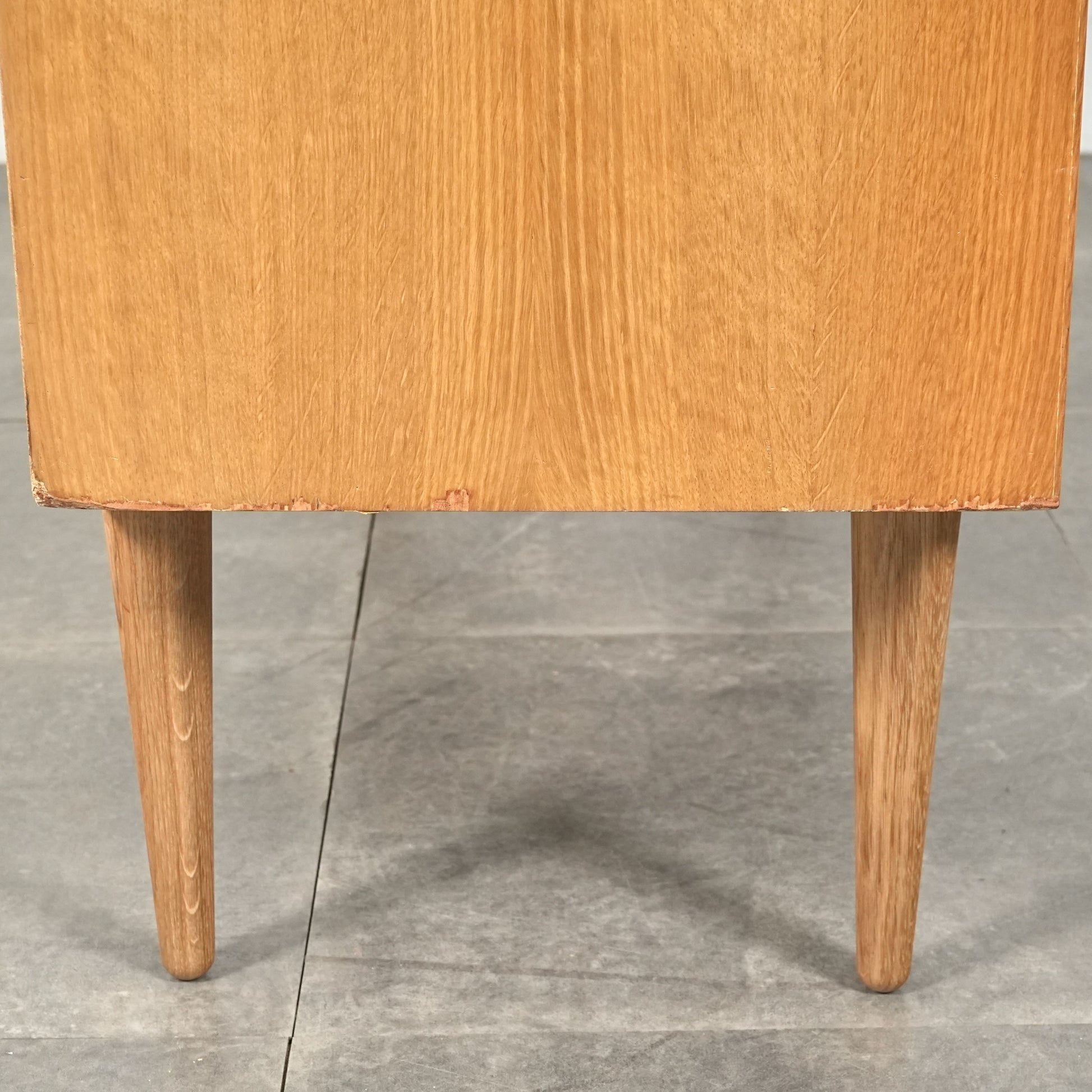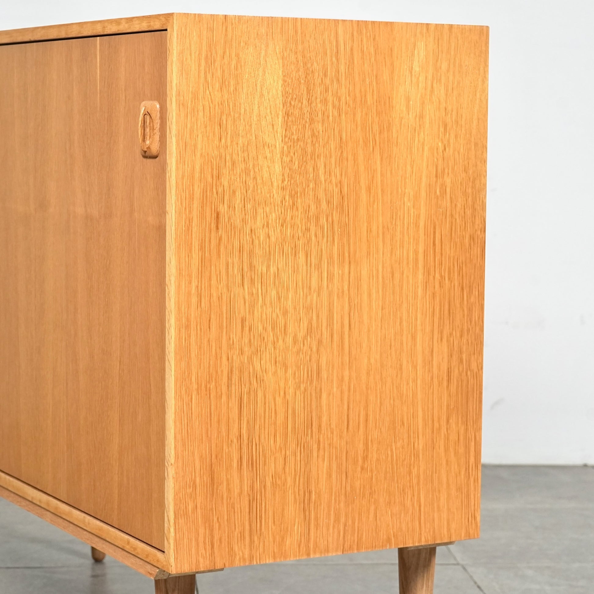 良質なオーク材の質感が際立つミニマルデザインの中に、可愛らしい取手や脚部のシャープなラインがマッチしており、北欧らしい確かな美意識が宿る高品質なヴィンテージアイテムです。