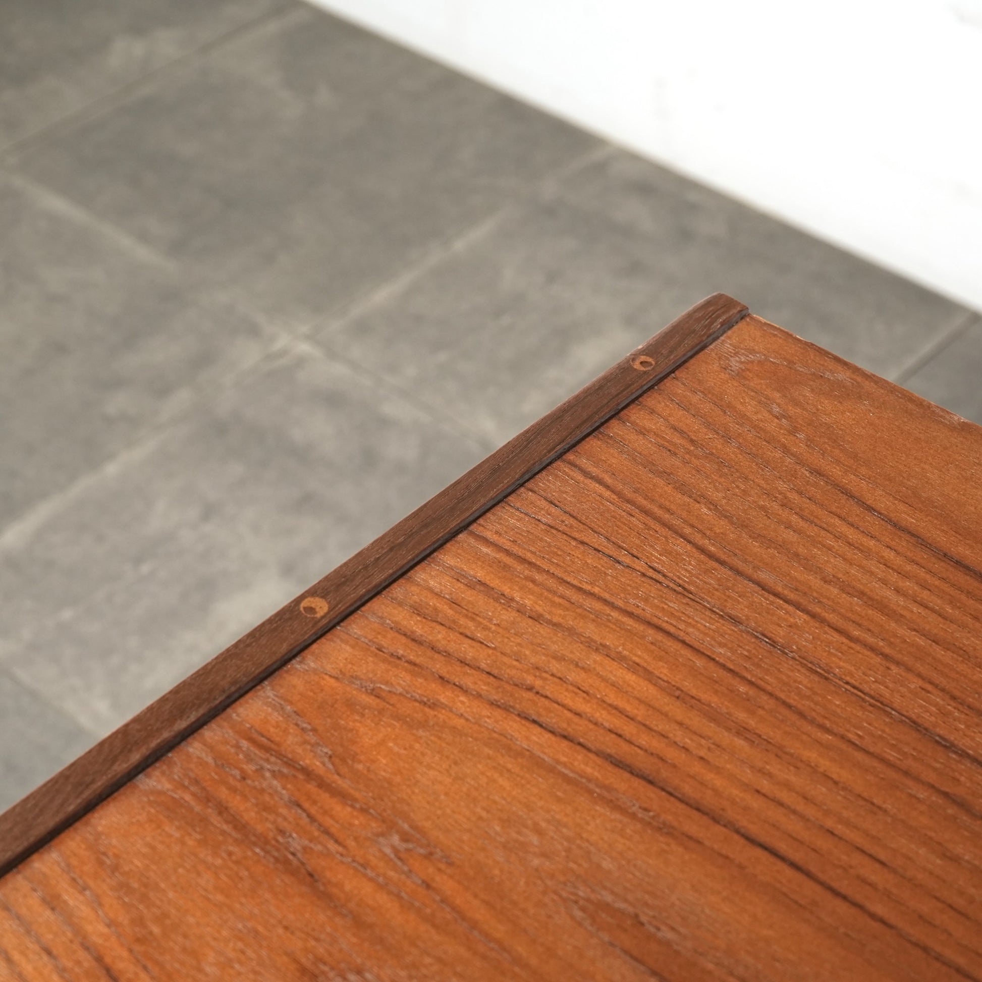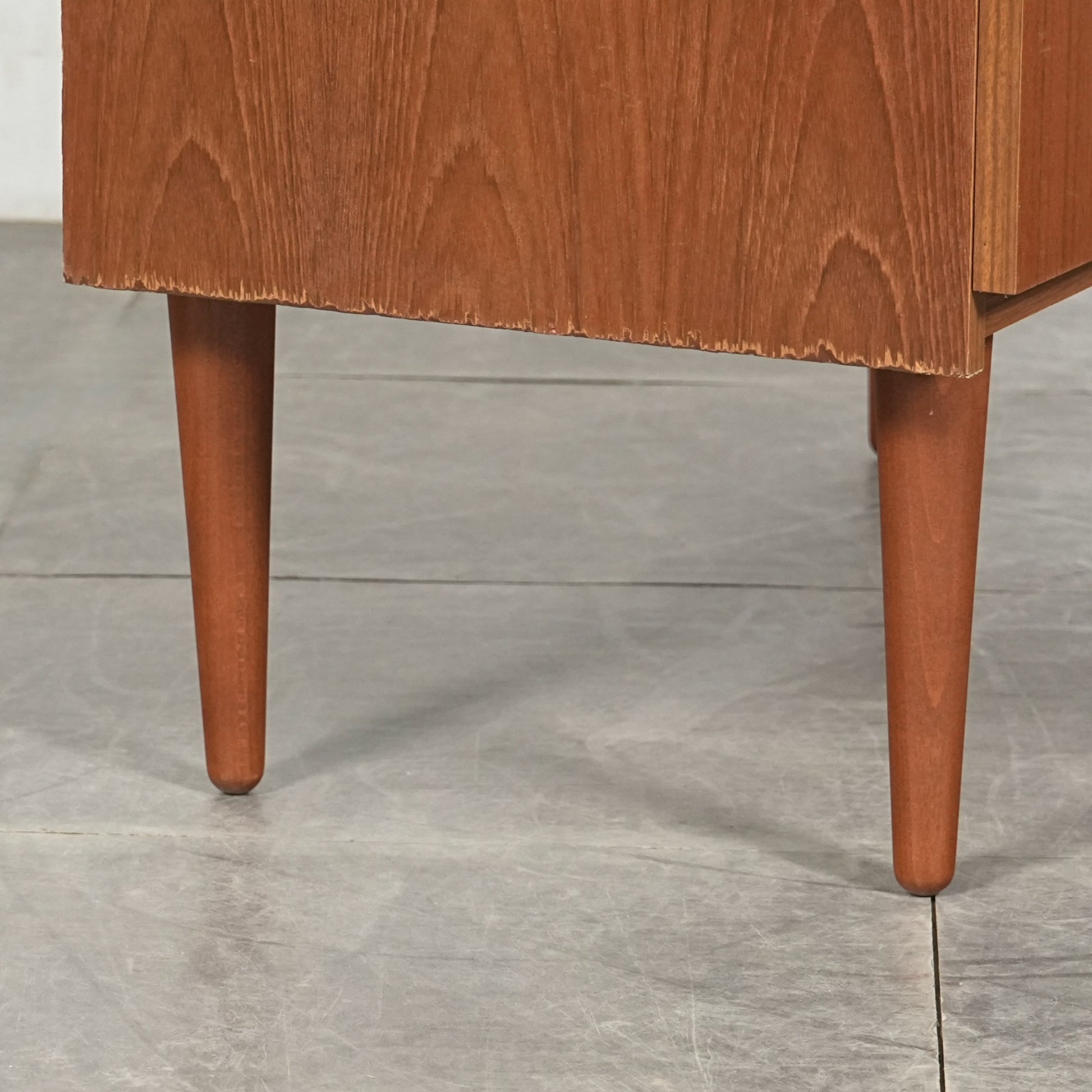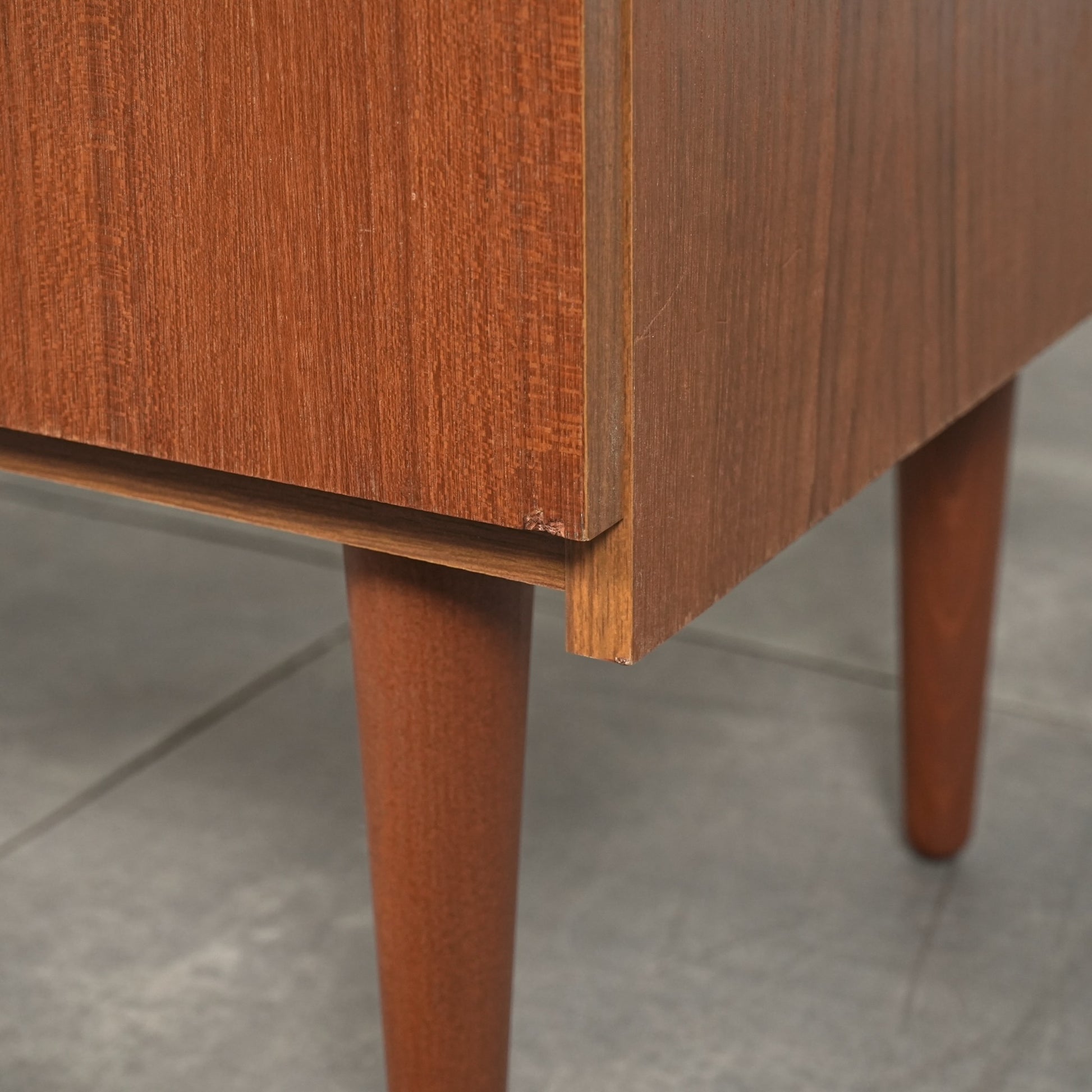 ミッドセンチュリーらしさが詰まった見事なデザインで、削り出しの可愛いらしい取手や、スリムな脚部に使用されたビーチ材とのコントラストも程よいバランス。