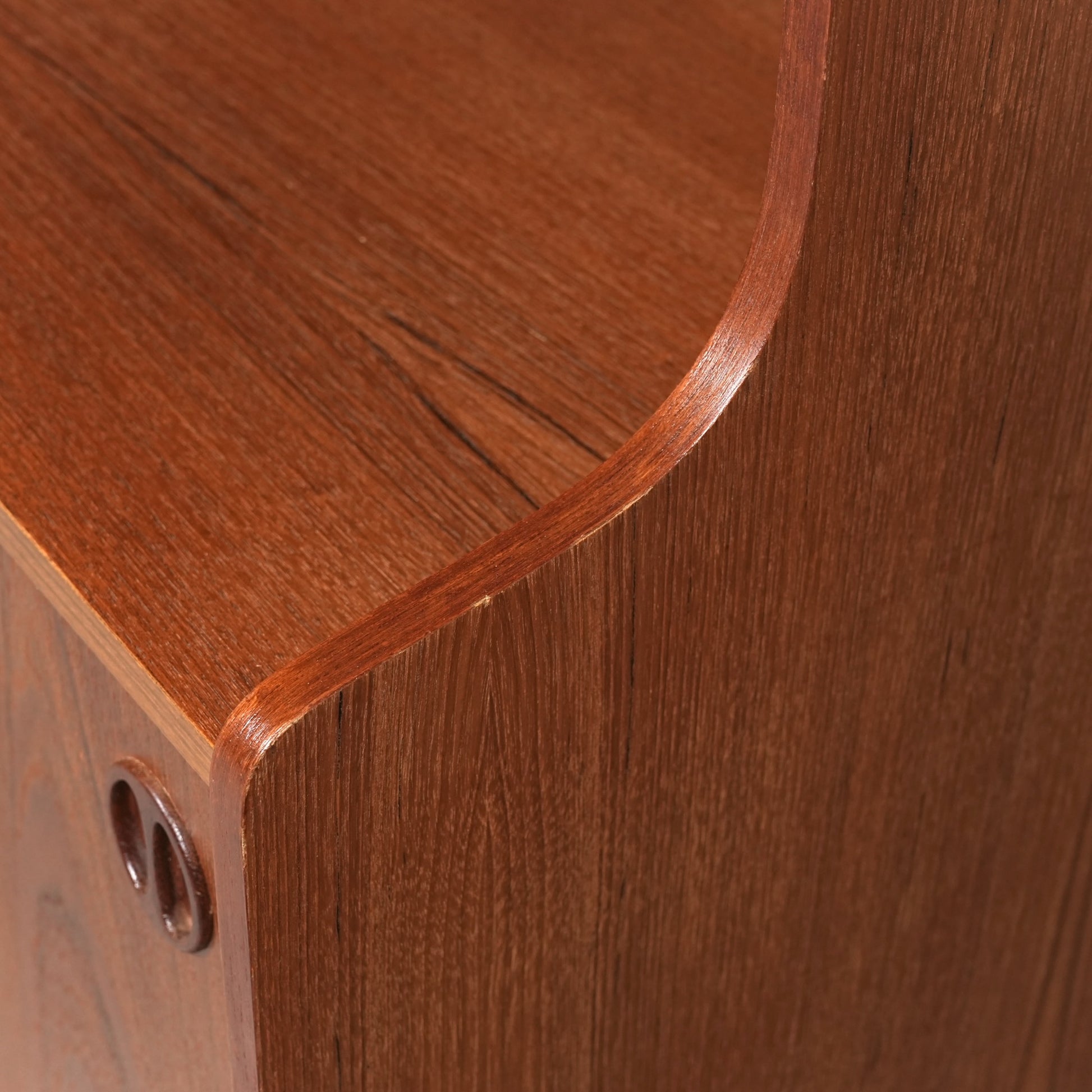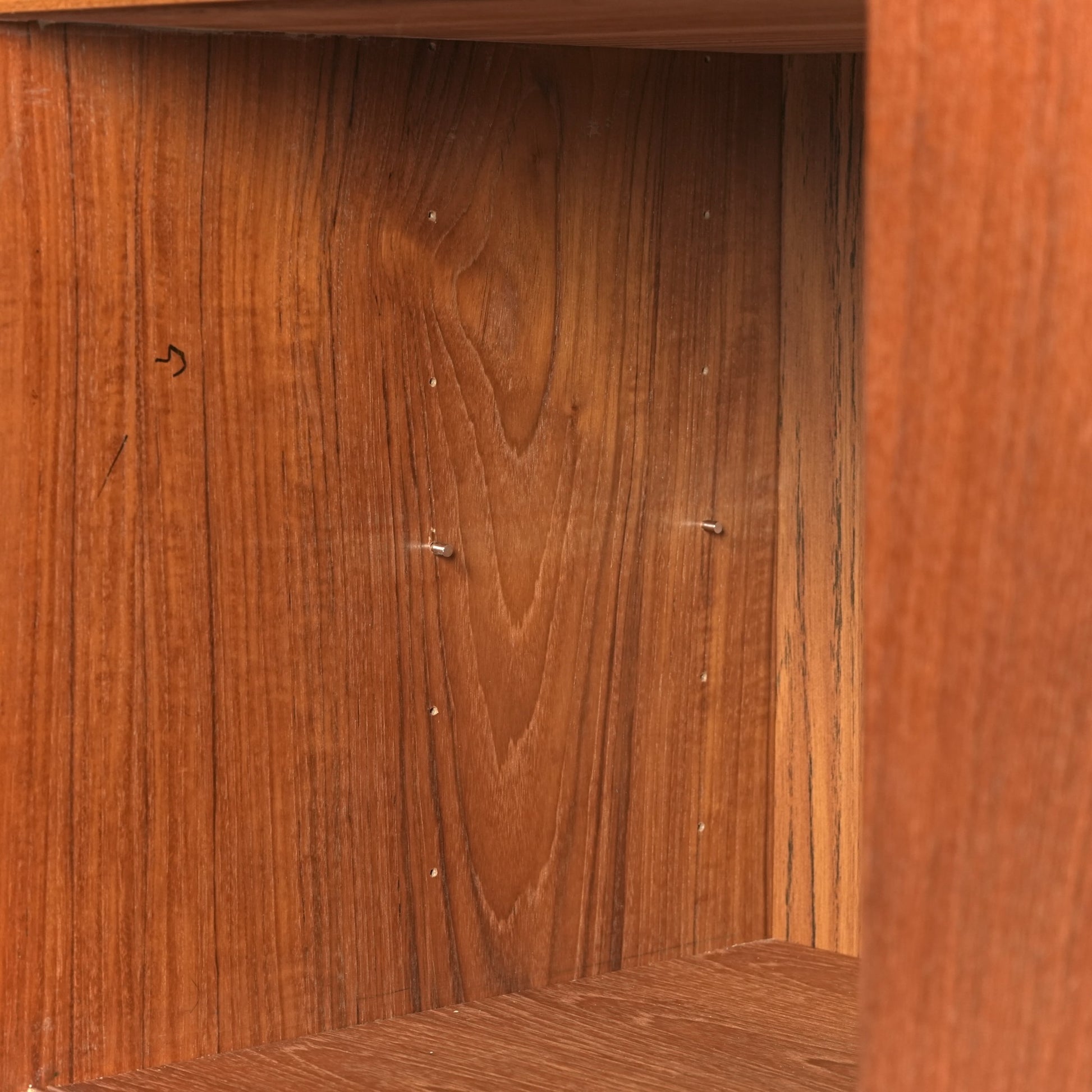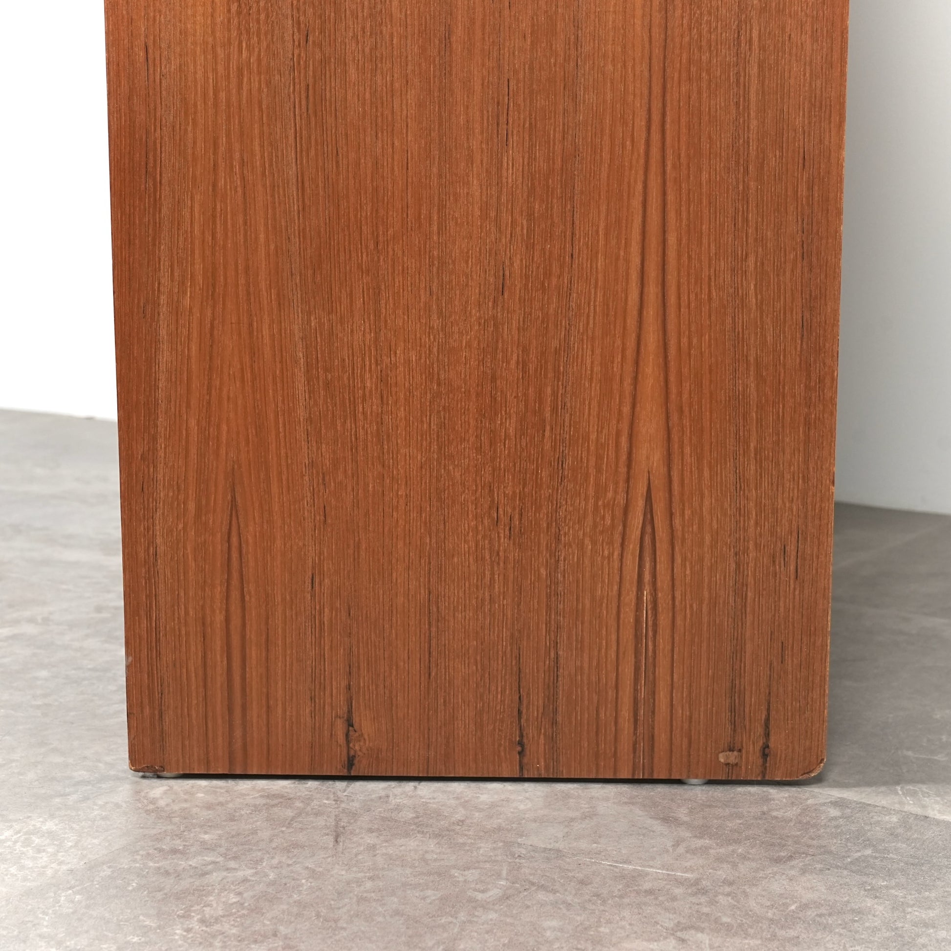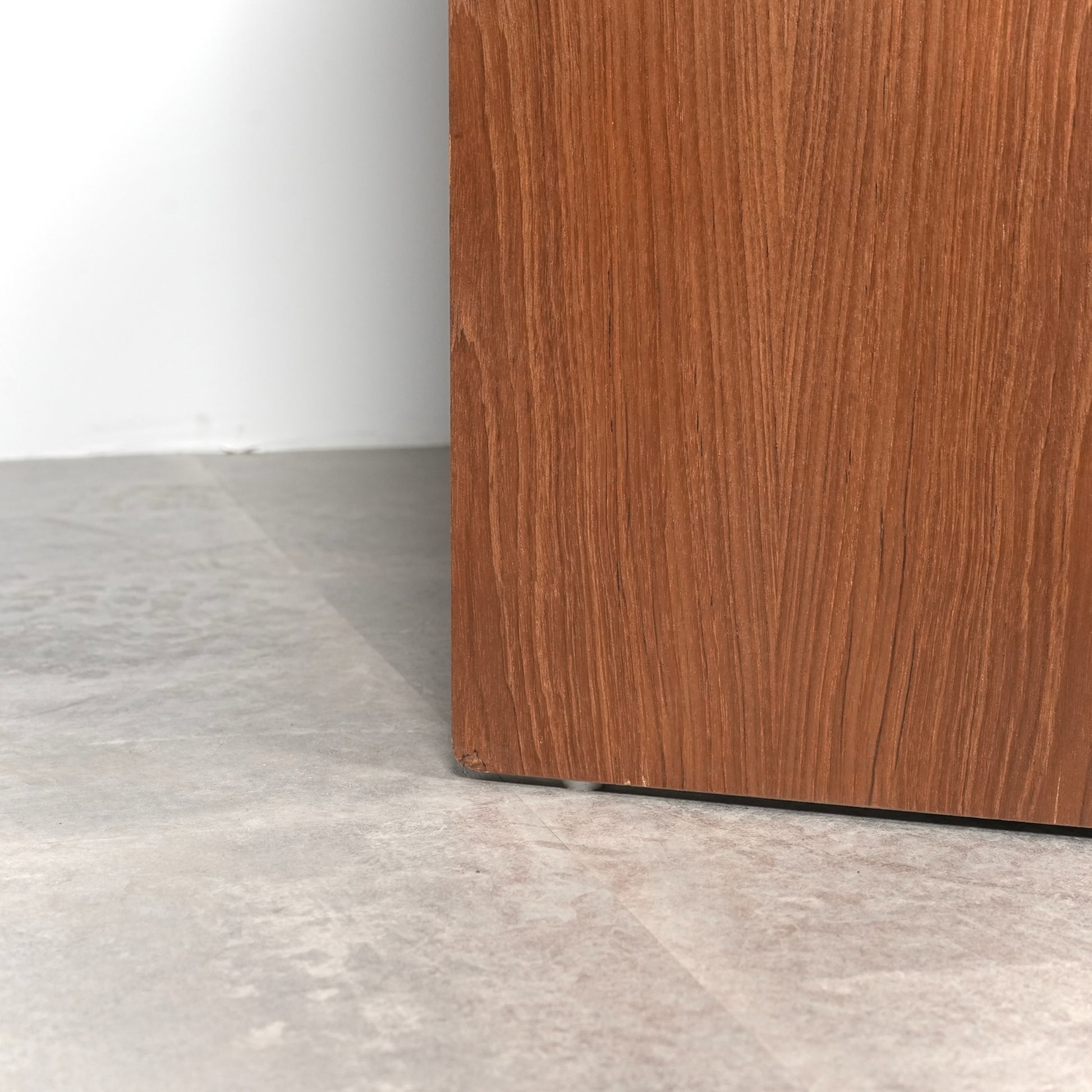 ミッドセンチュリーらしさが詰まった見事なミニマルデザインで、良質なチーク材の質感の中に、削り出しのシャープな取手が良いアクセントとなっています。