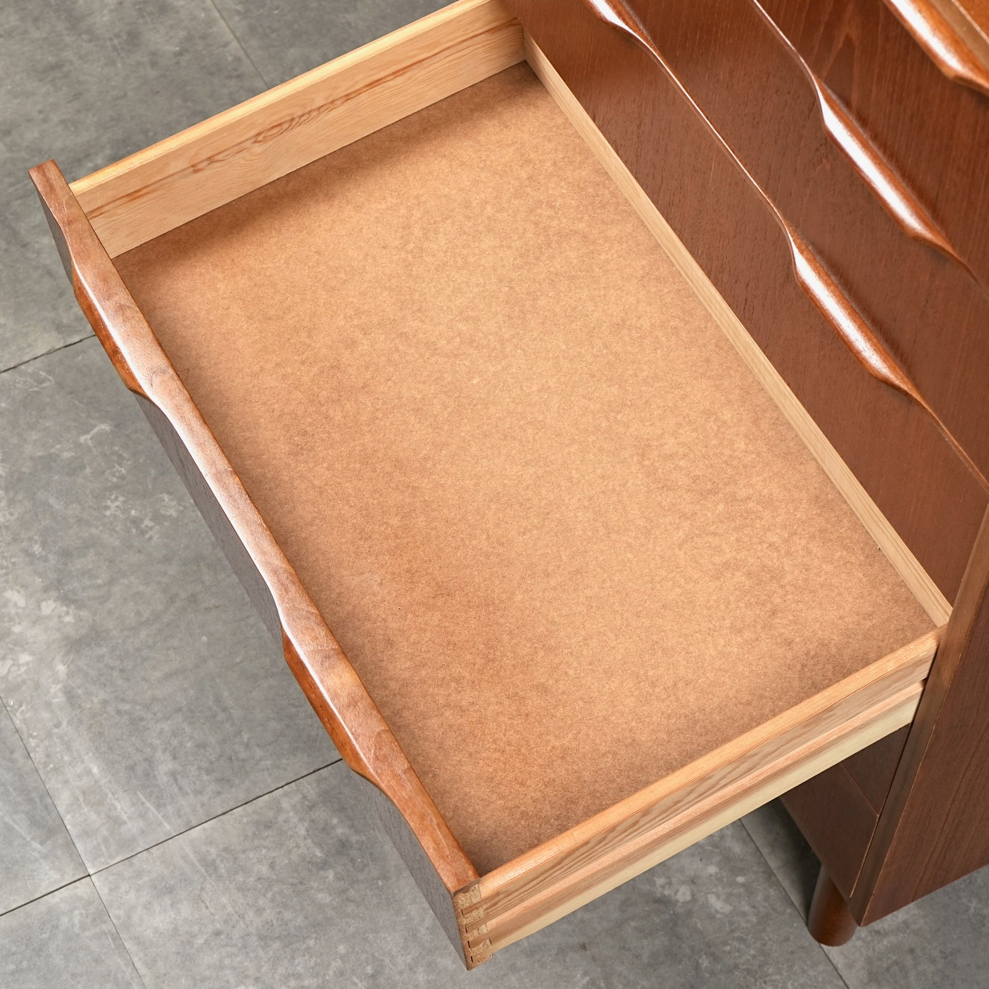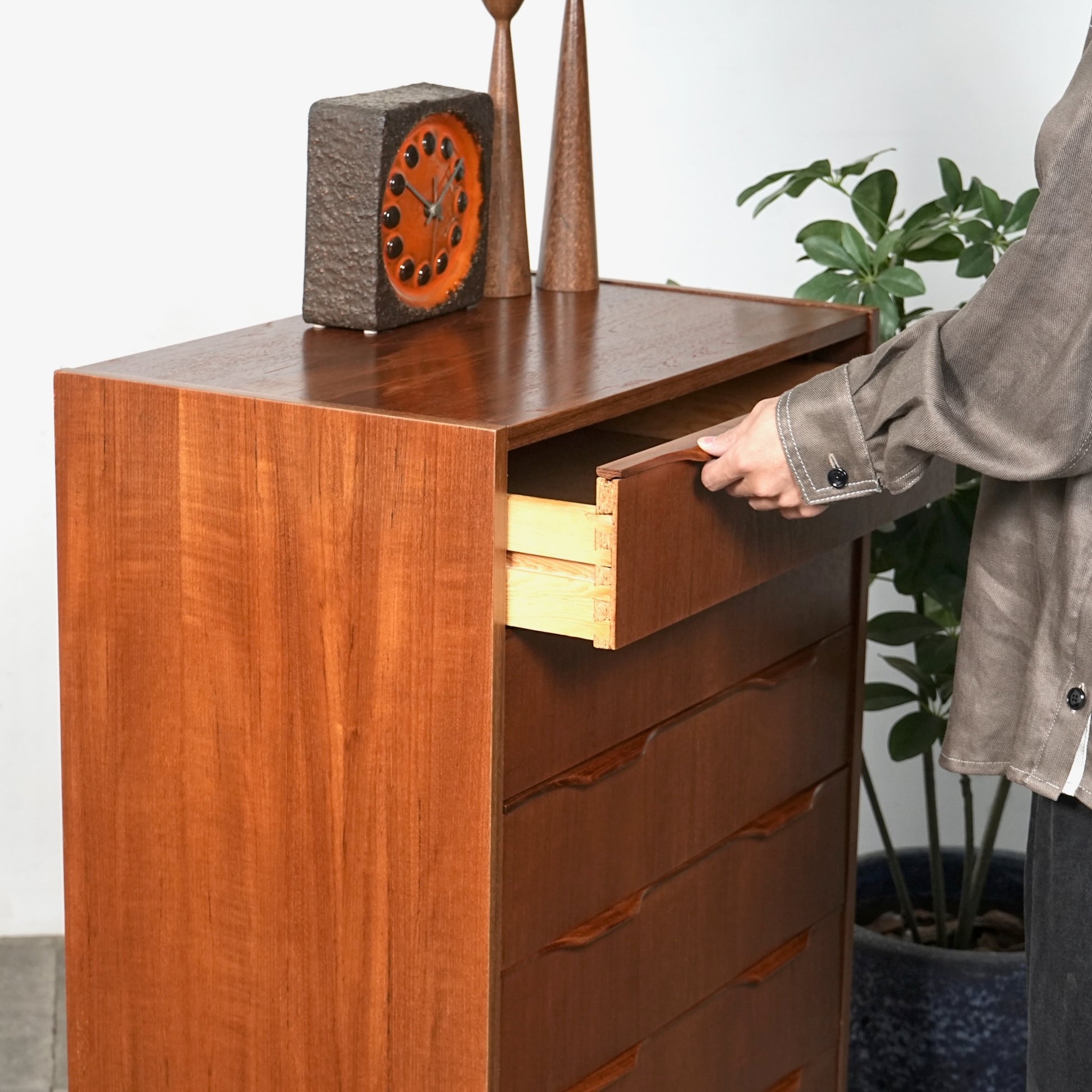 ミッドセンチュリーらしさがギュッと詰まった美しいデザインで、削り出しで作られた見事な取手だけでなく、北欧らしく高いクラフトマンシップによって丁寧に作り込まれたハイクオリティなヴィンテージアイテムです。