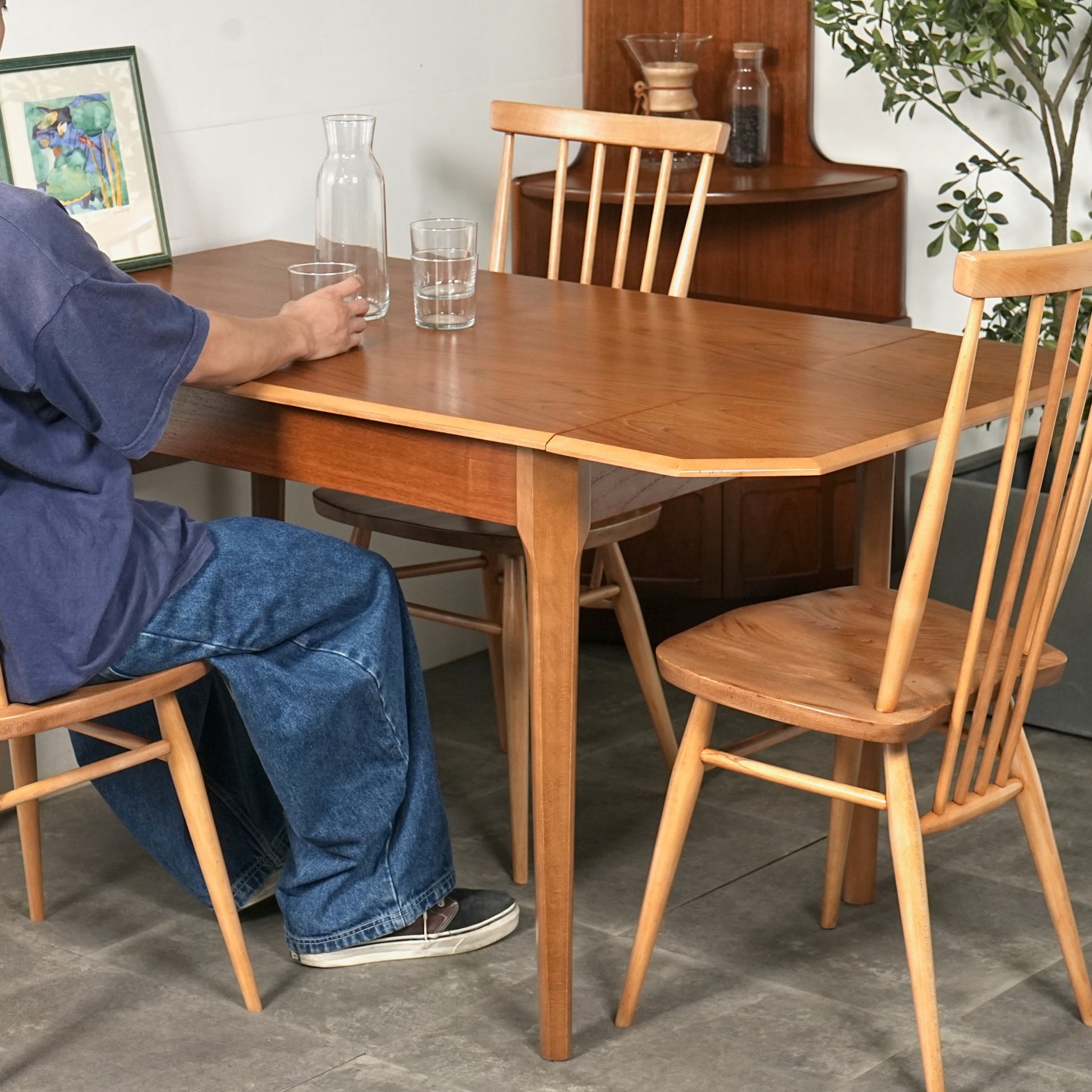 両サイドの天板は跳ね上げ式(ドロップリーフ)で、用途や空間に合わせてサイズを調整できる機能性も備えており、最大で大人4名まで対応可能です。