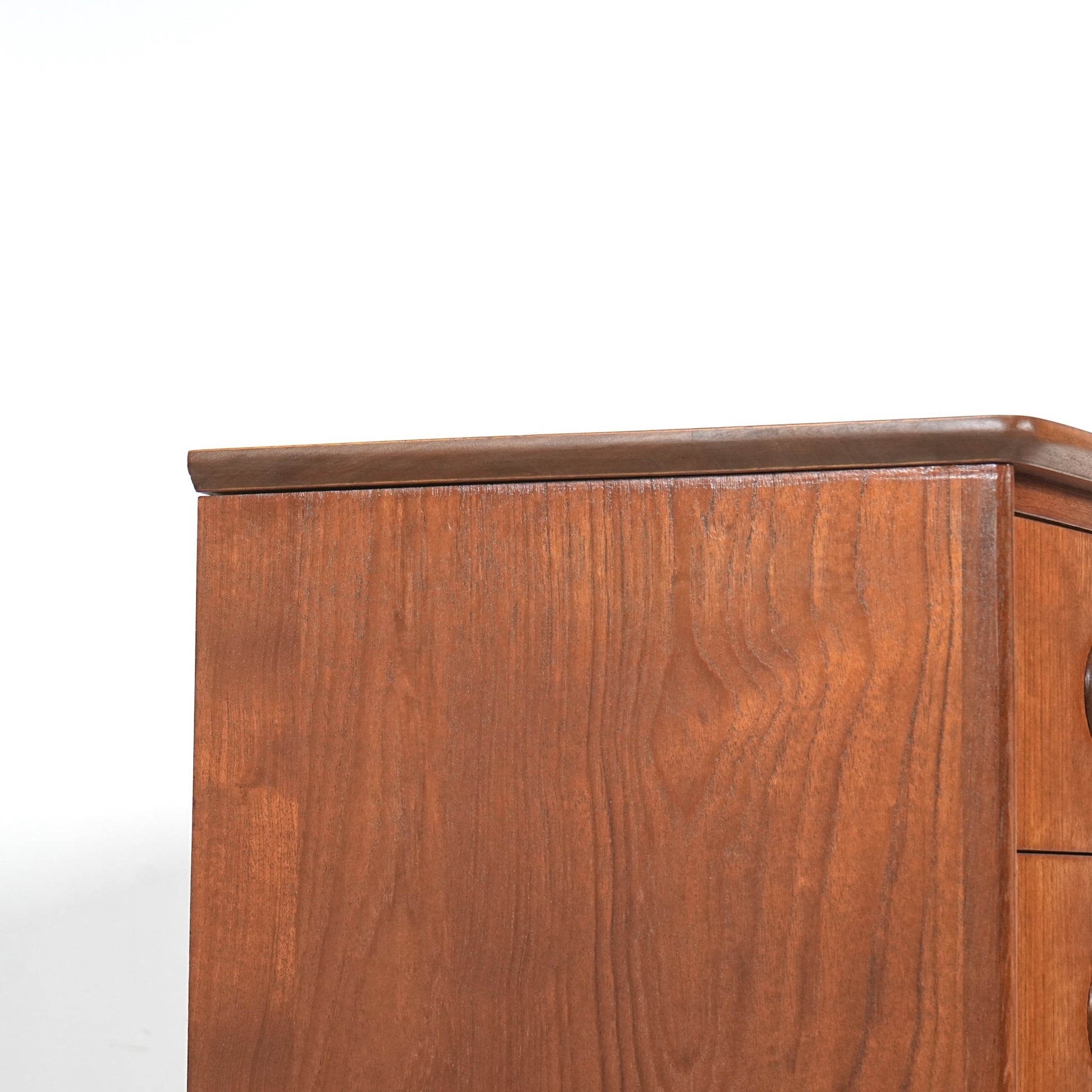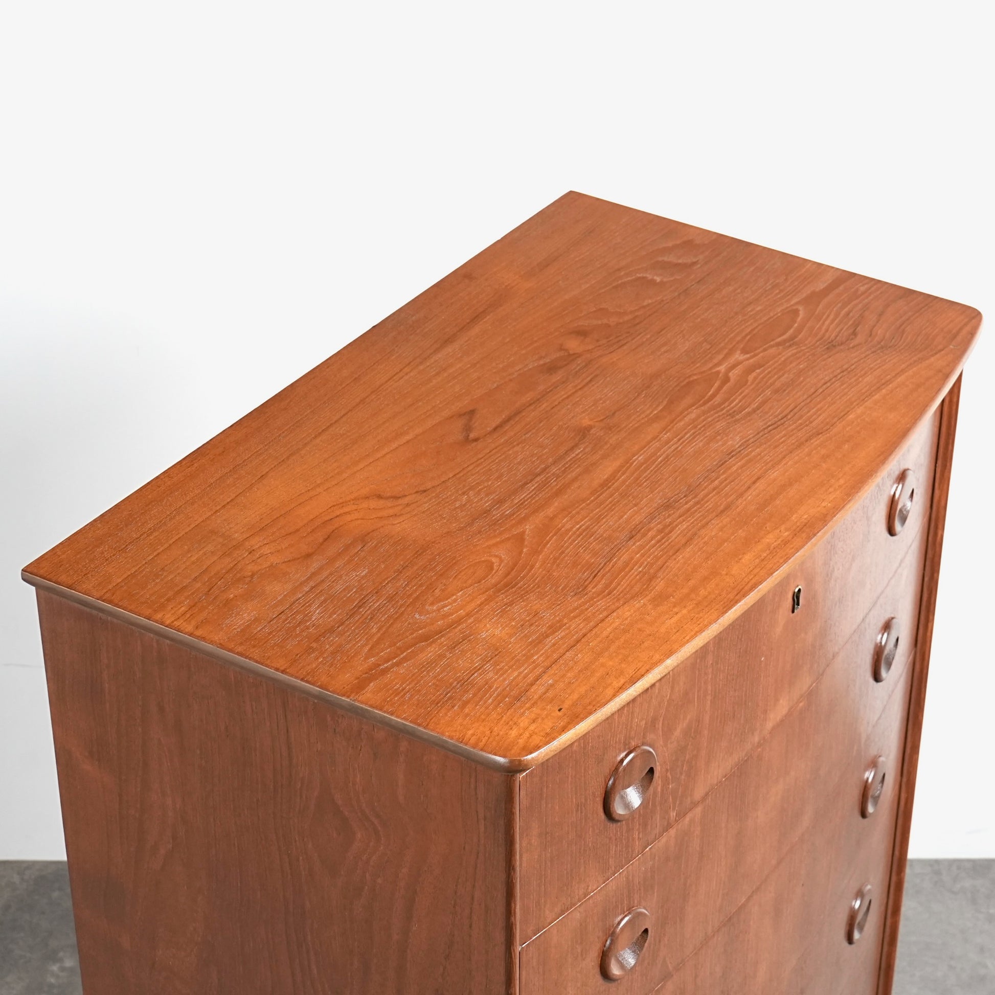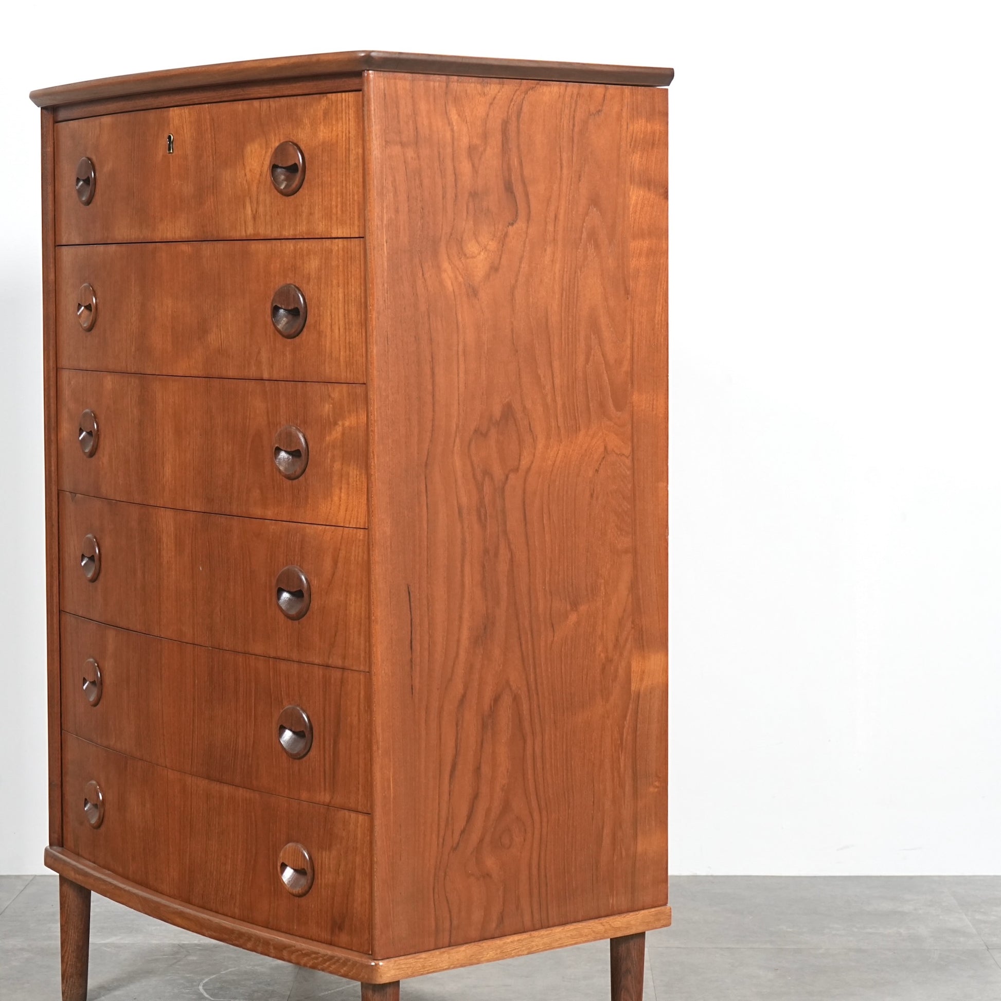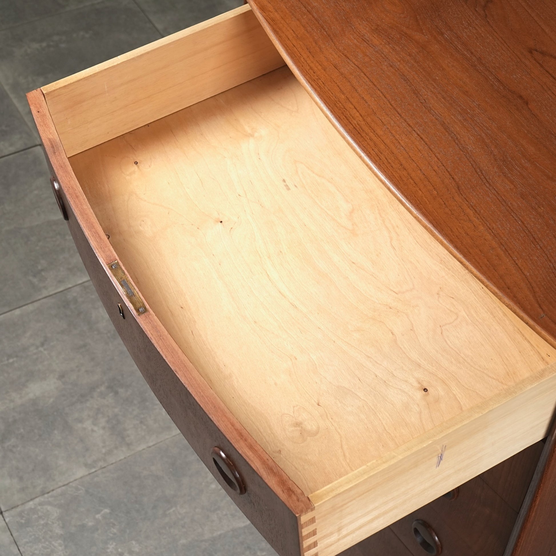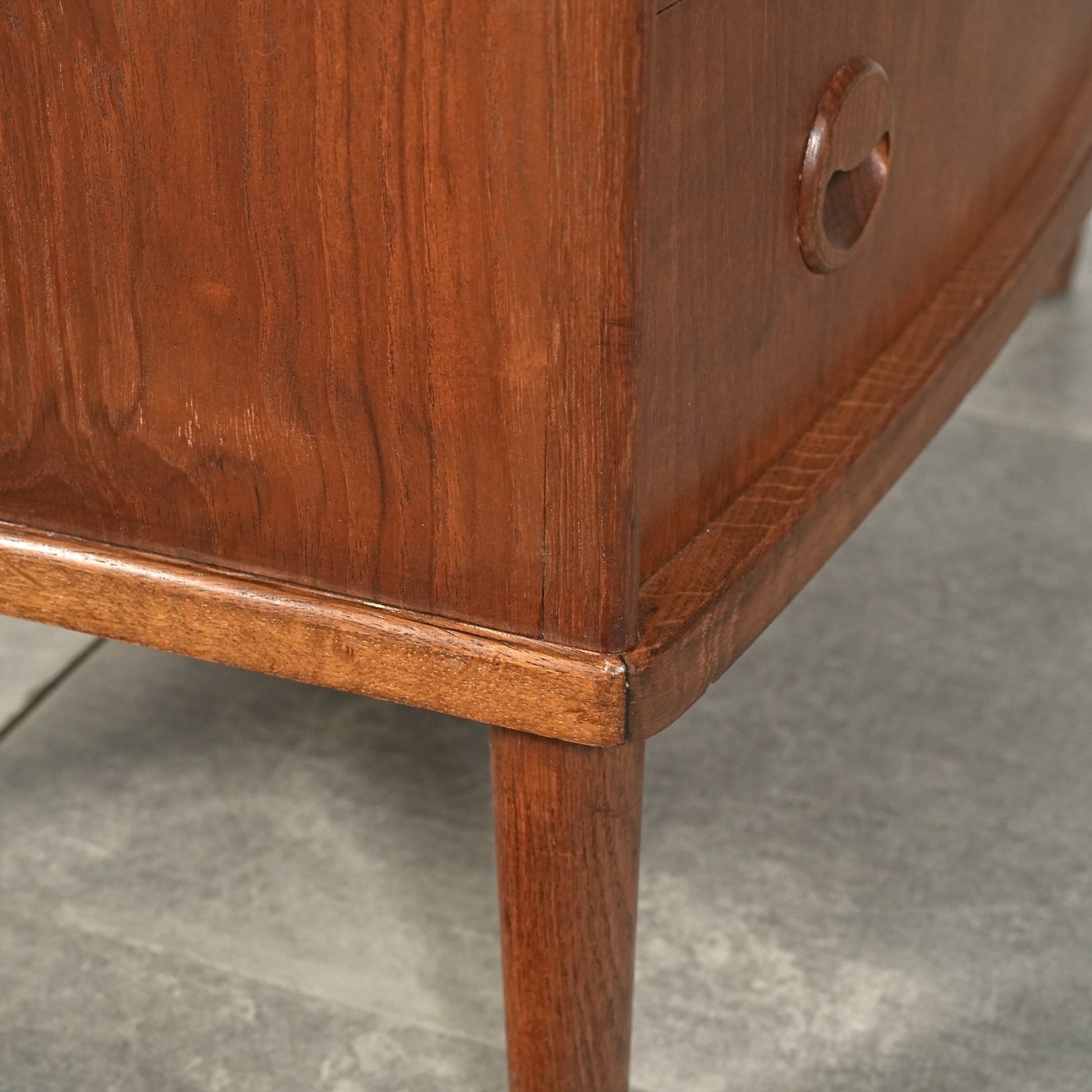 ミッドセンチュリーらしさが詰まった本当に美しいデザインで、削り出しで作られた見事な取手やフロントのさりげない曲面など、北欧らしいクラフトマンシップによって細部まで丁寧に作り込まれており、この時代の美意識が確かに宿るハイグレードなヴィンテージアイテムです。