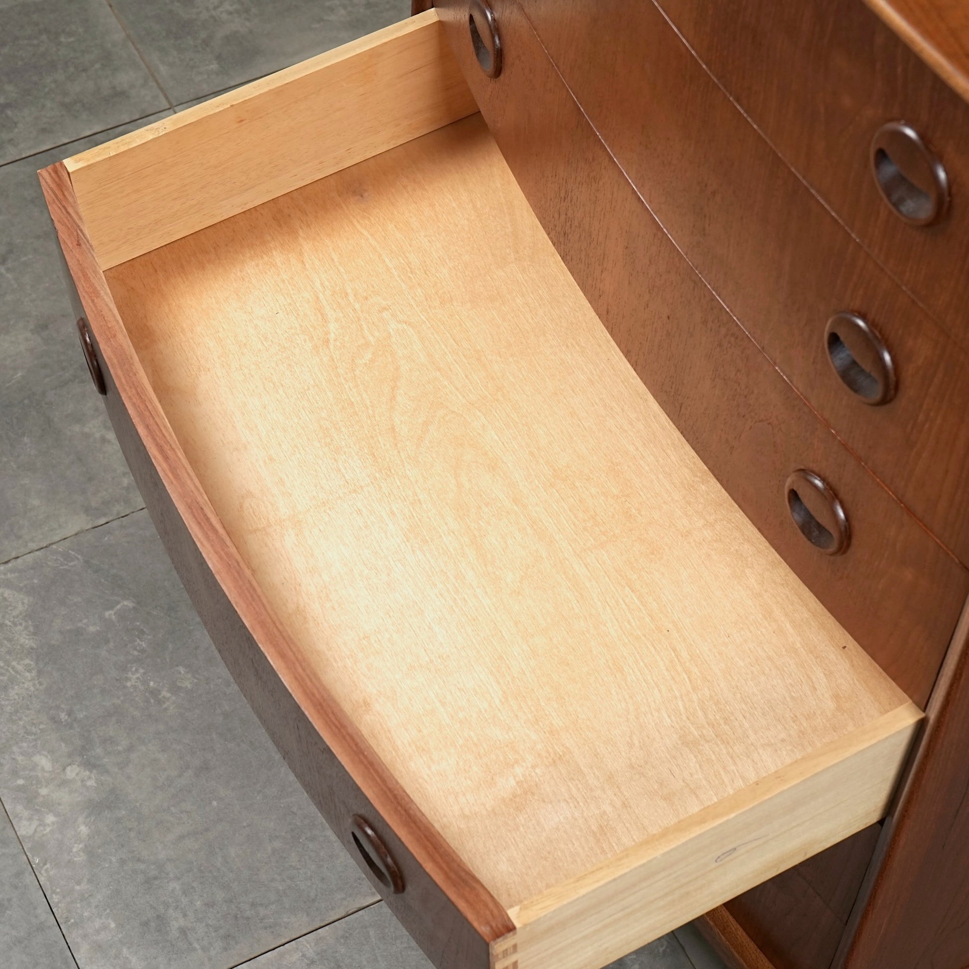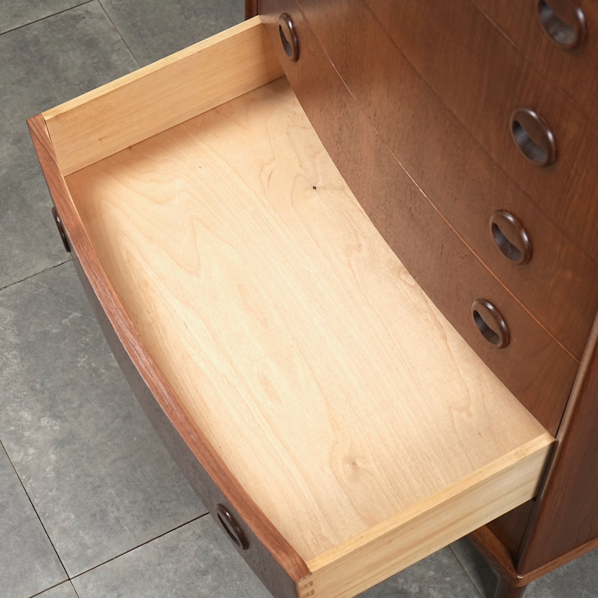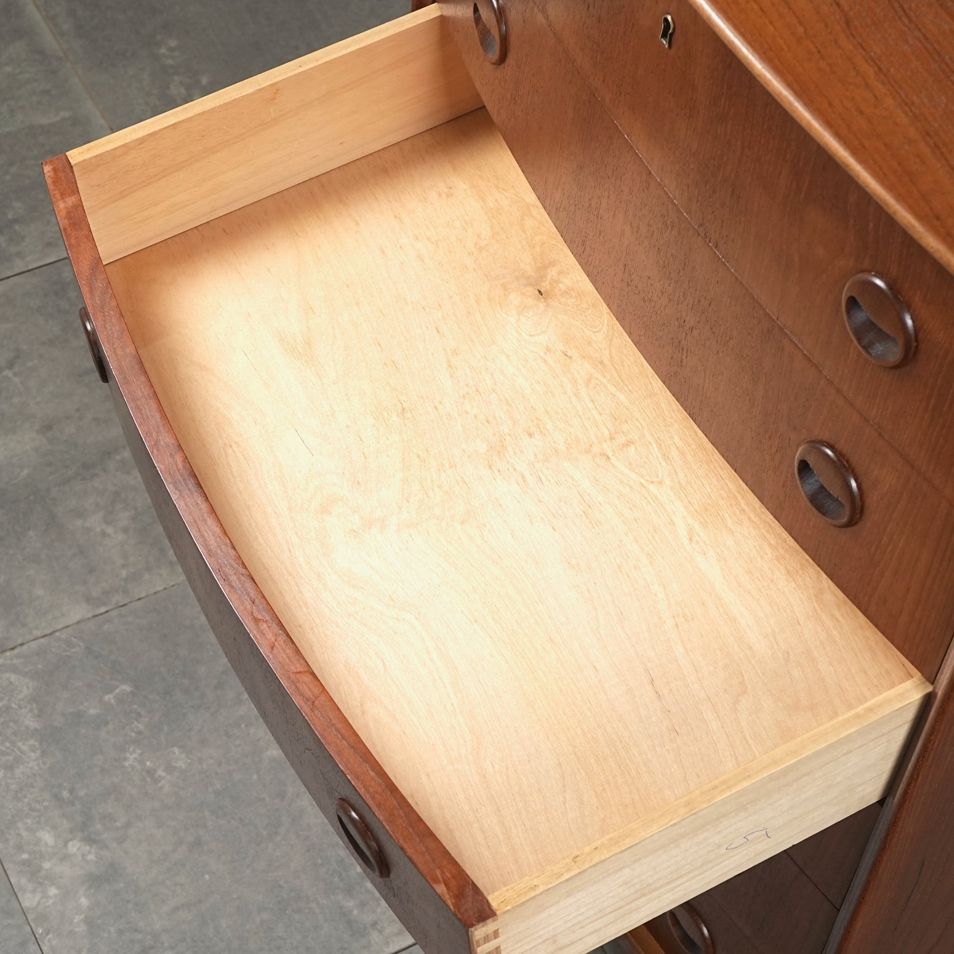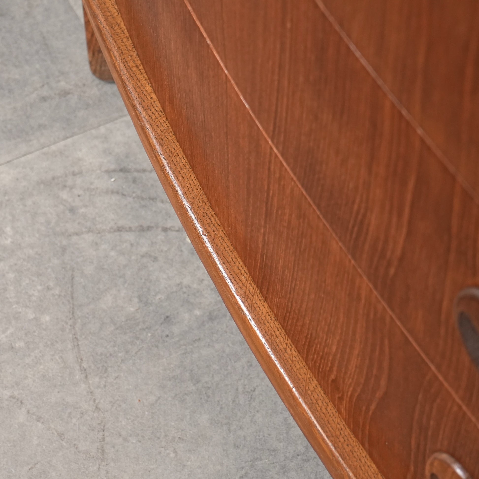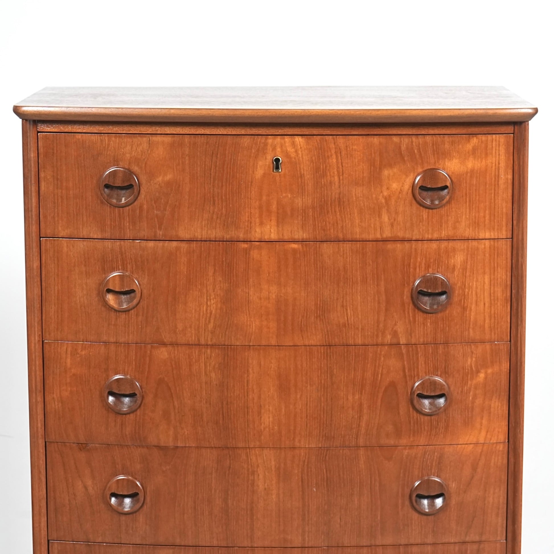 ミッドセンチュリーらしさが詰まった本当に美しいデザインで、削り出しで作られた見事な取手やフロントのさりげない曲面など、北欧らしいクラフトマンシップによって細部まで丁寧に作り込まれており、この時代の美意識が確かに宿るハイグレードなヴィンテージアイテムです。