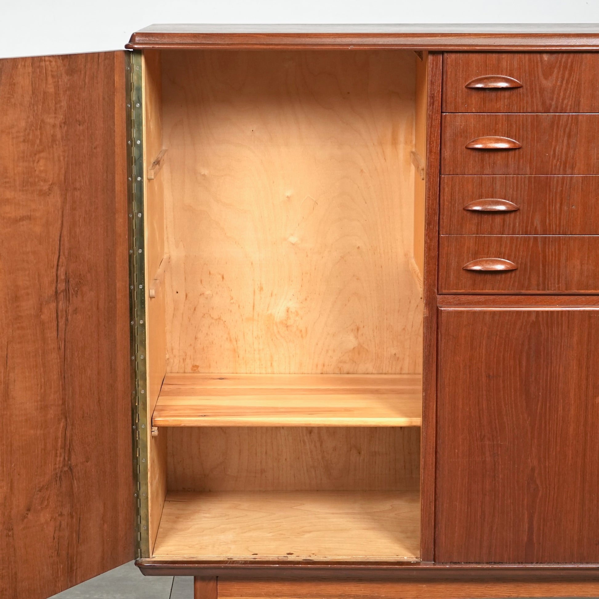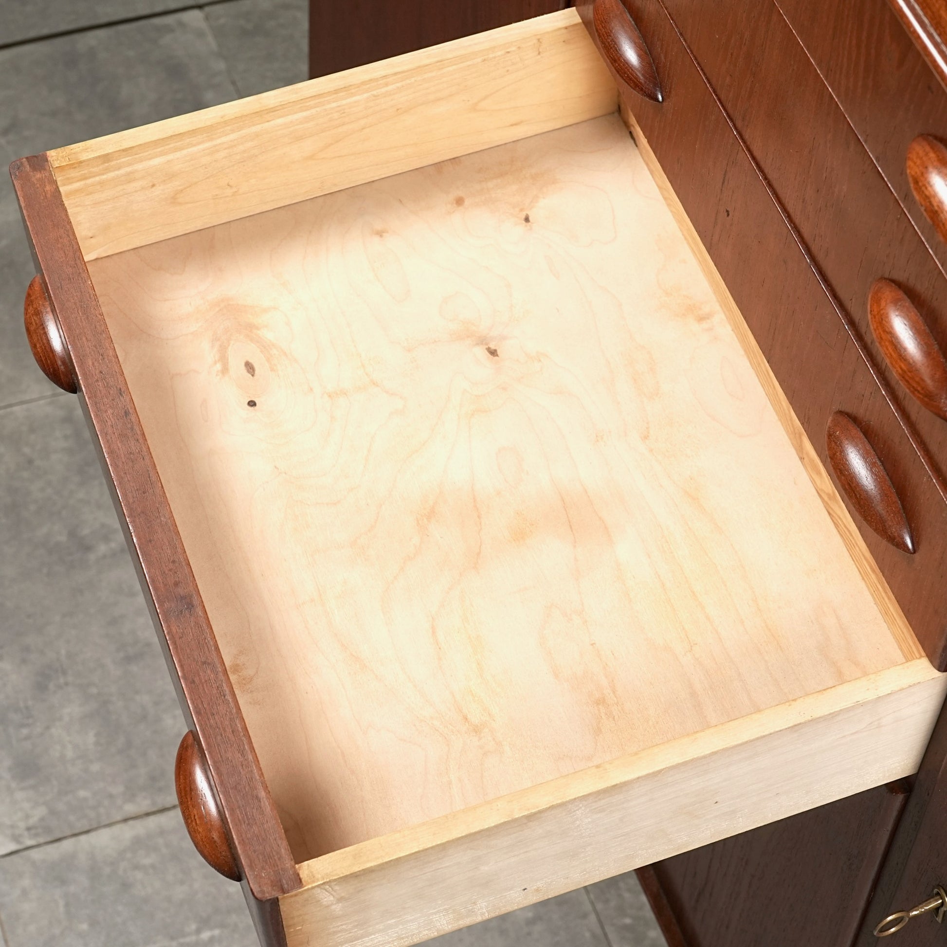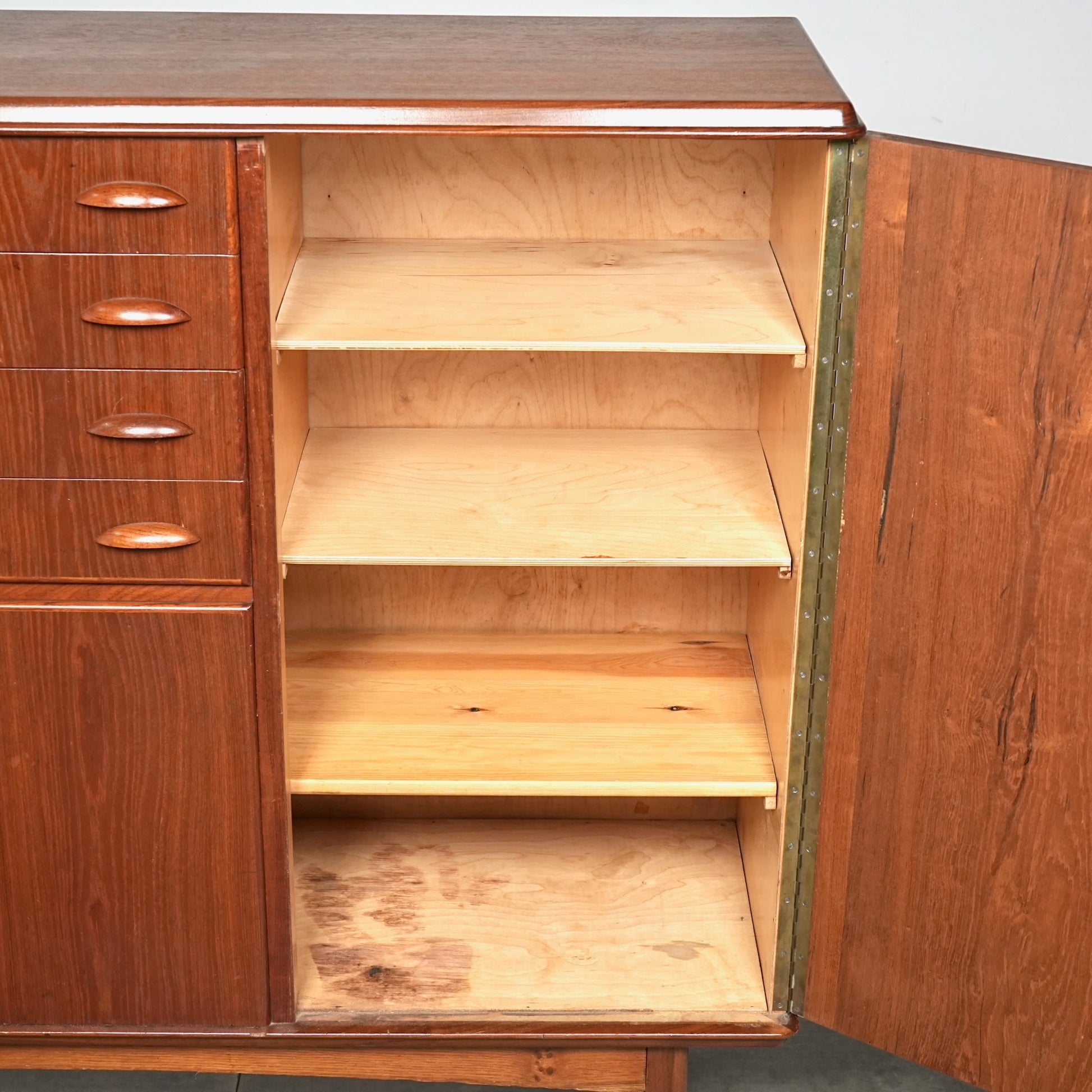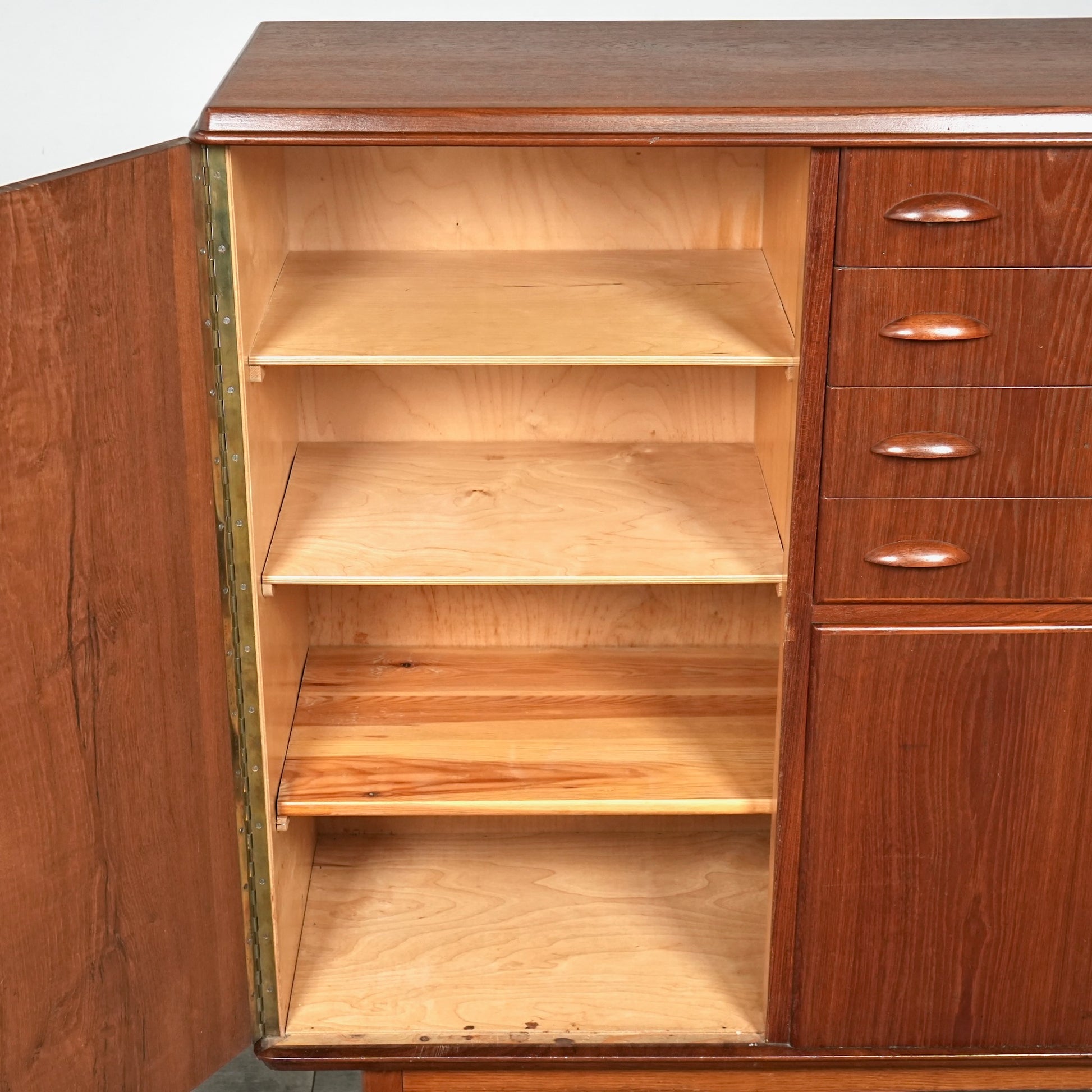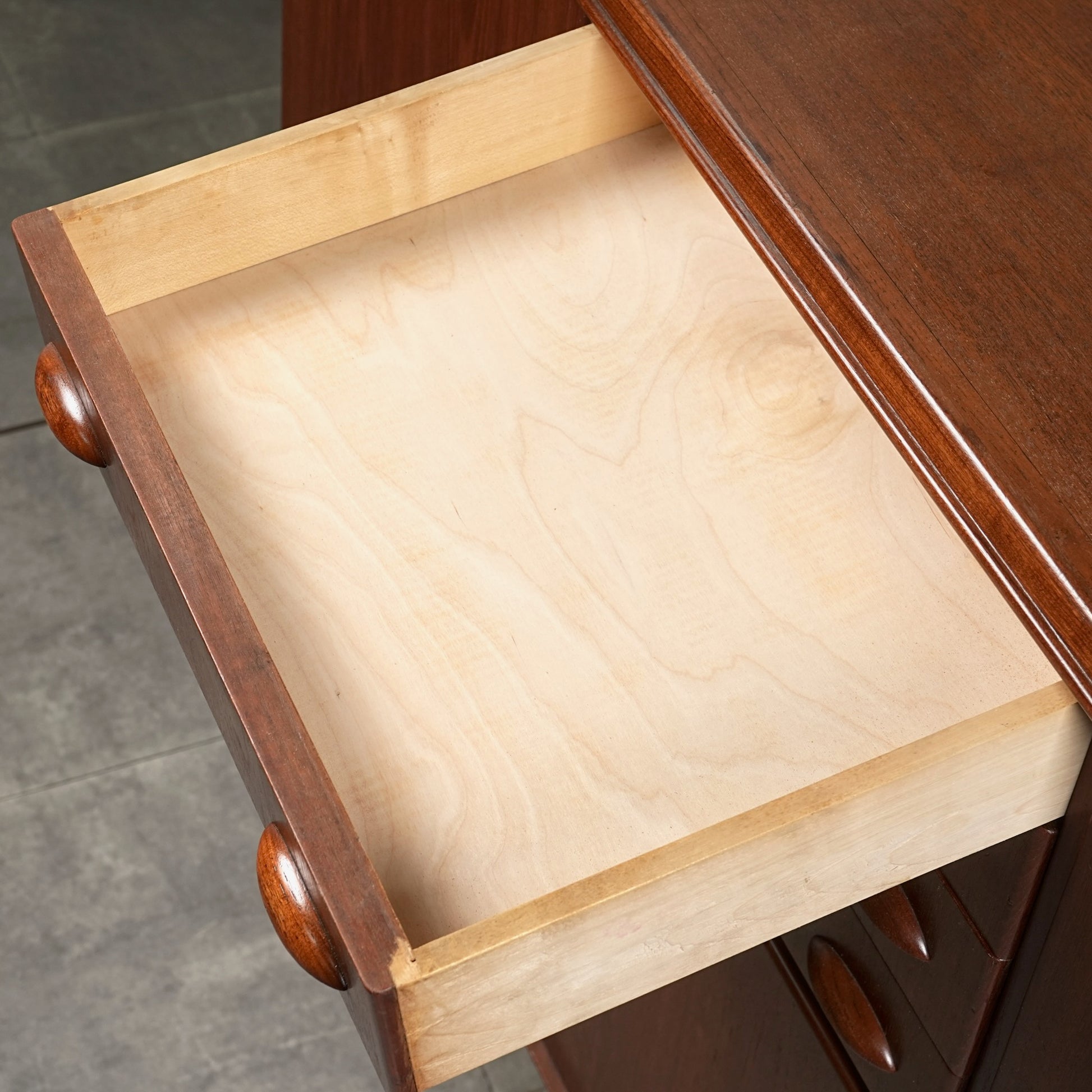 引き出しには手に馴染むチークの取手が用いられ、素材の統一感とミッドセンチュリーらしい落ち着いた表情を感じさせます。