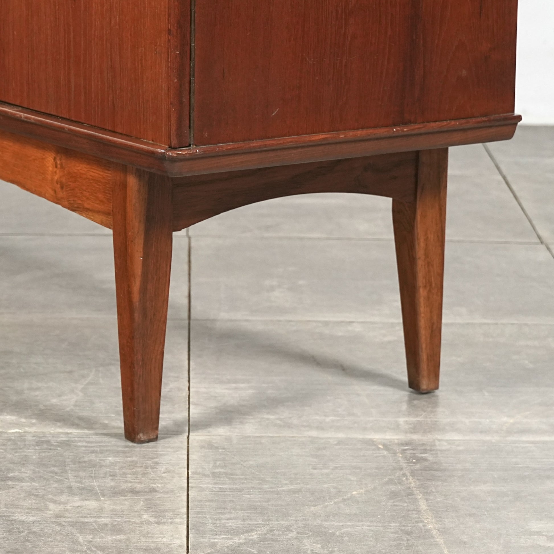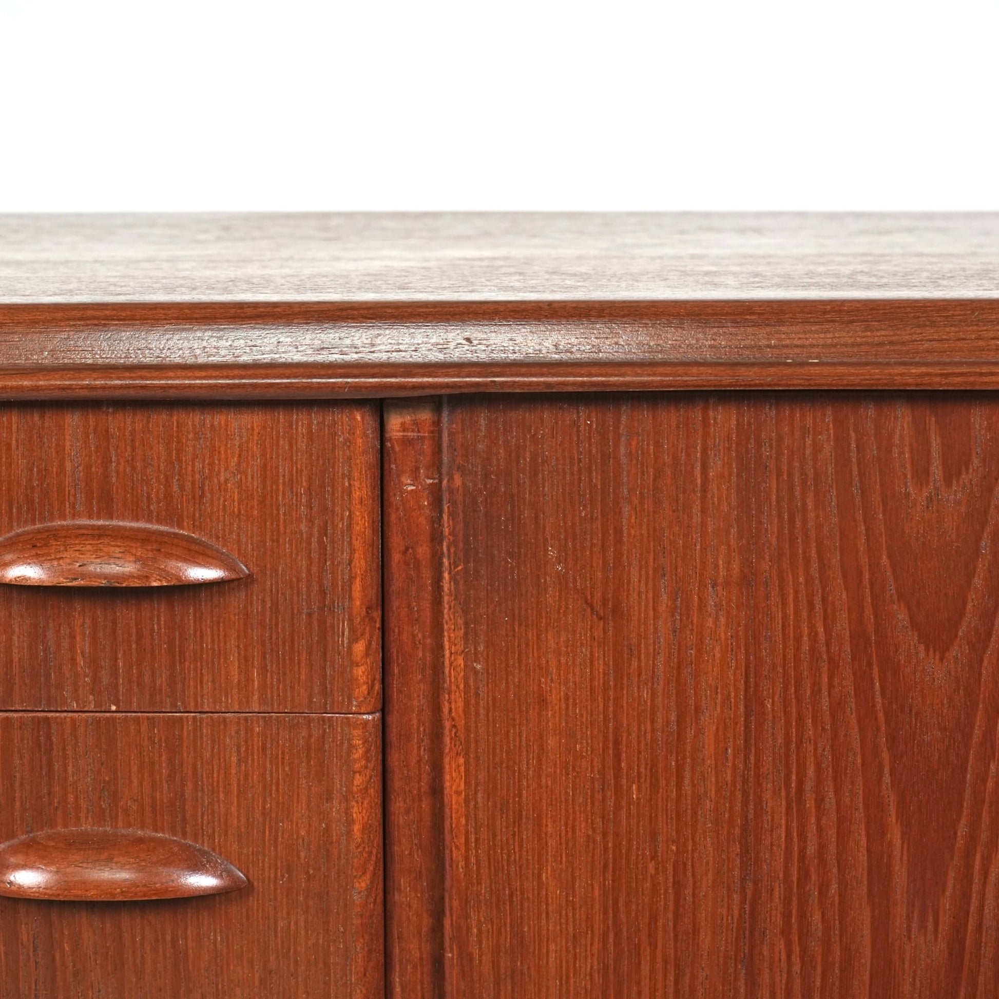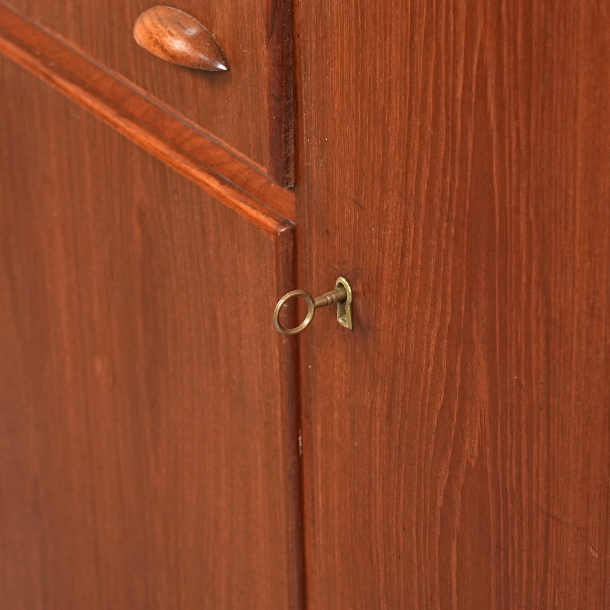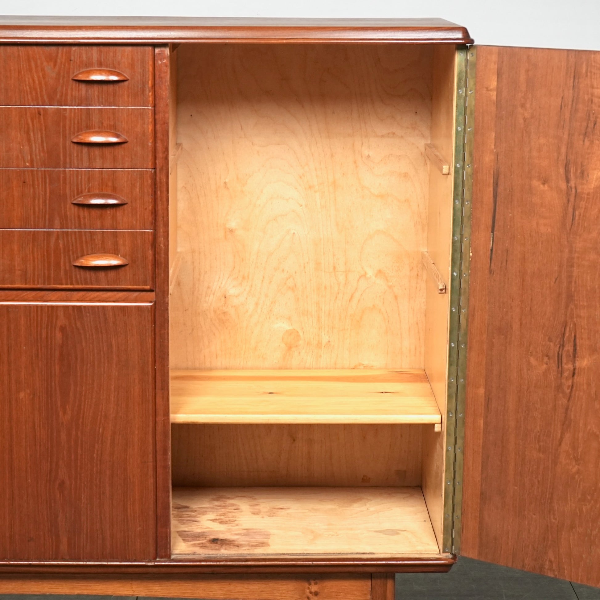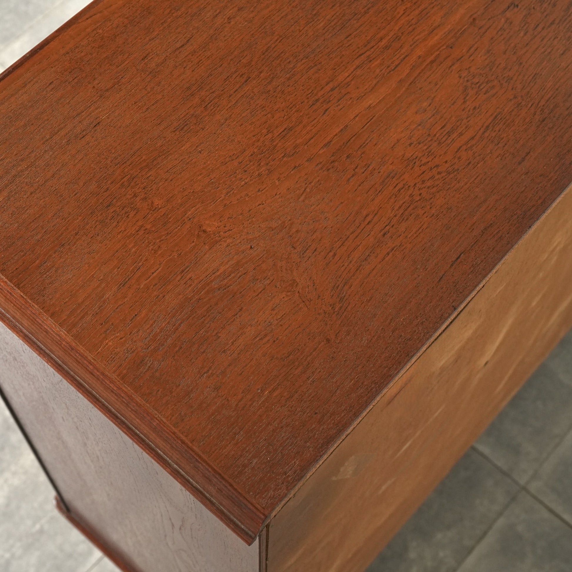 引き出しには手に馴染むチークの取手が用いられ、素材の統一感とミッドセンチュリーらしい落ち着いた表情を感じさせます。