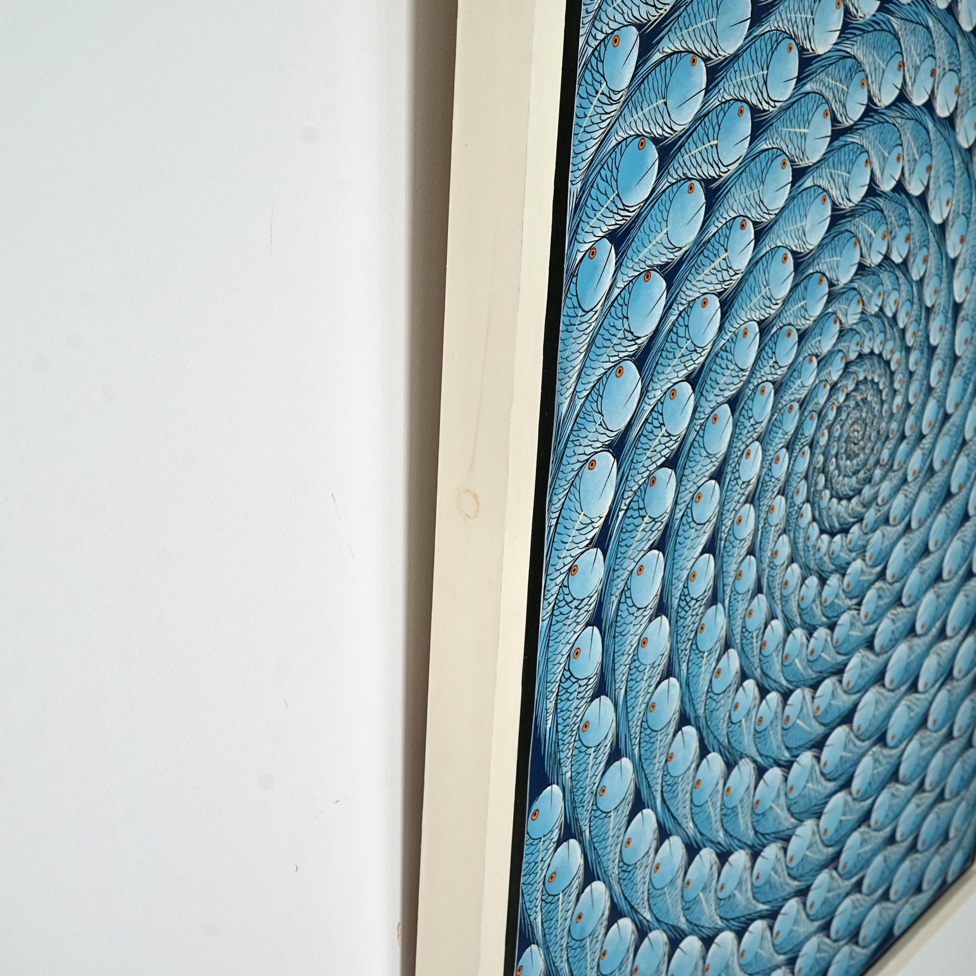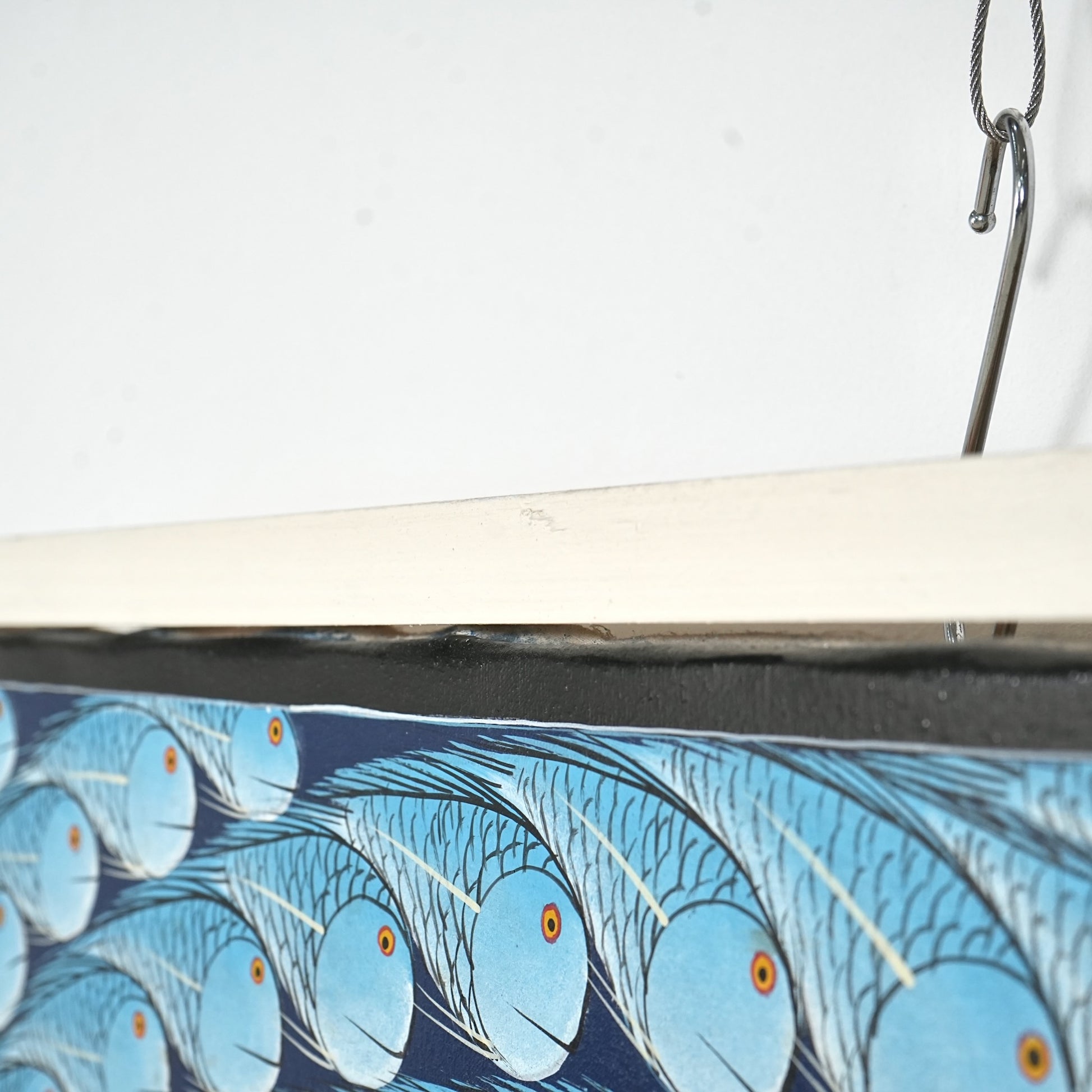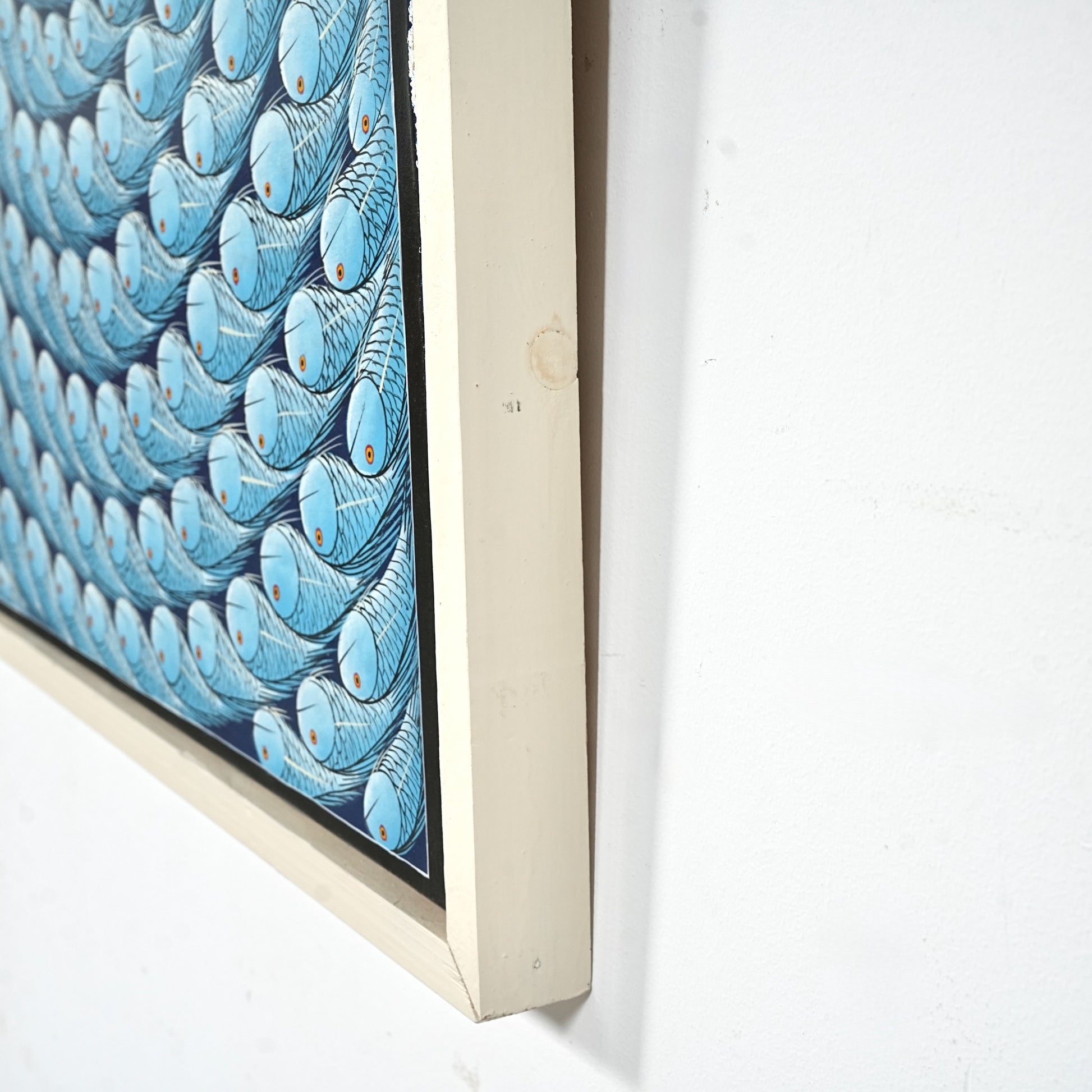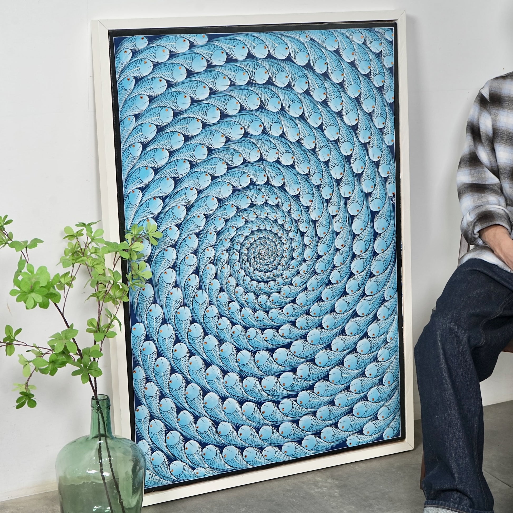 ブルーを基調とした涼やかな色調の中に、繰り返し描かれた魚たちがリズムを生み、どこか音楽的な高揚感すら宿しています。