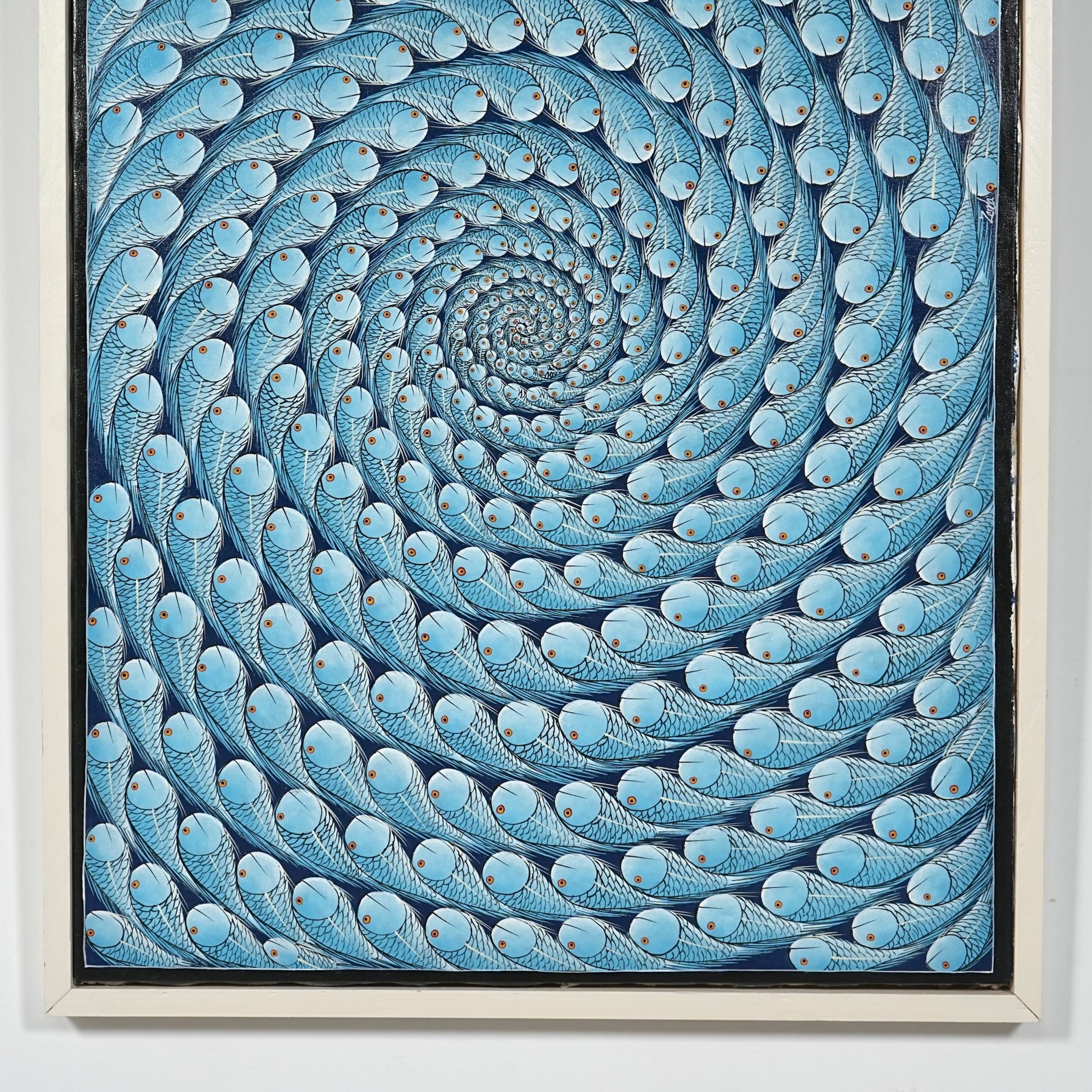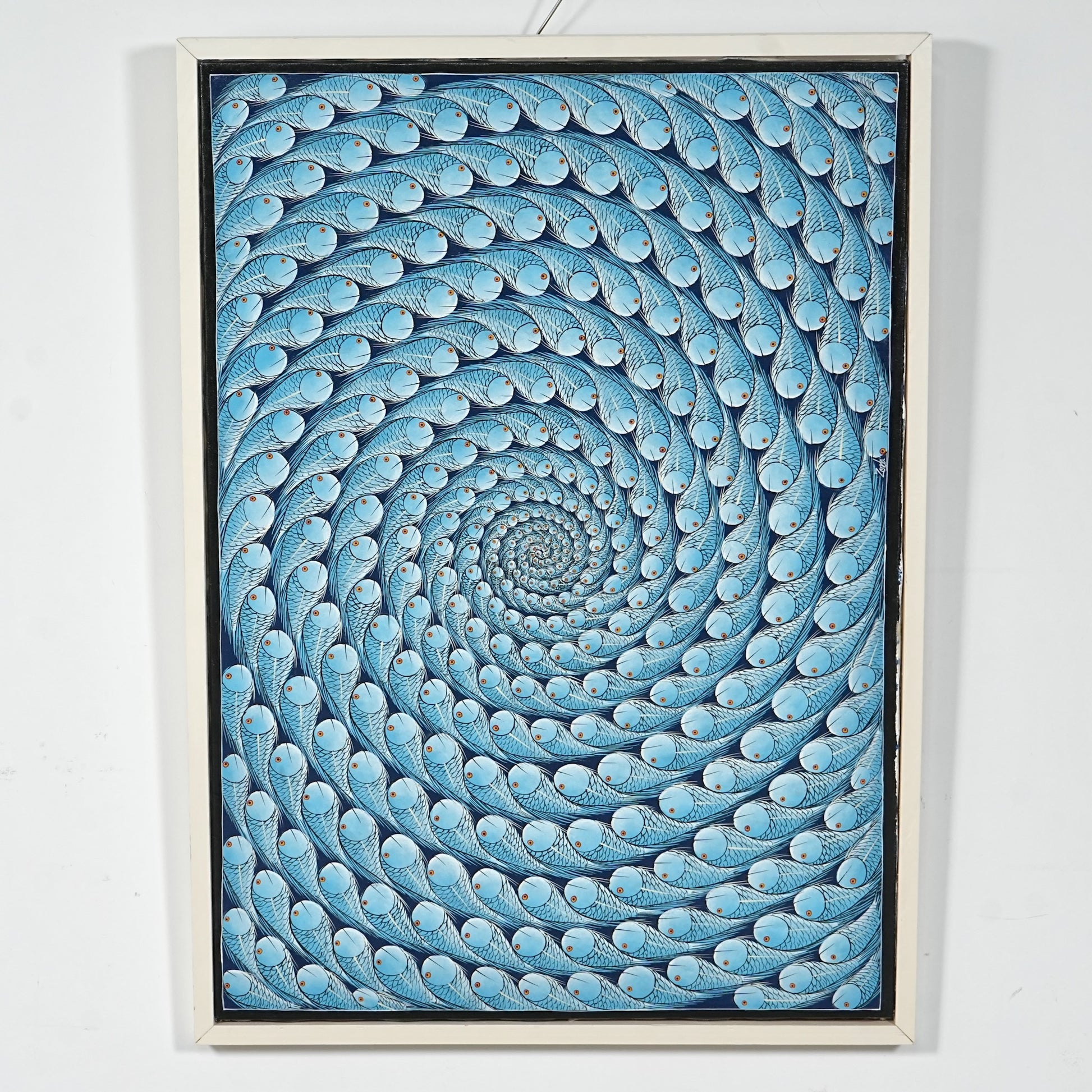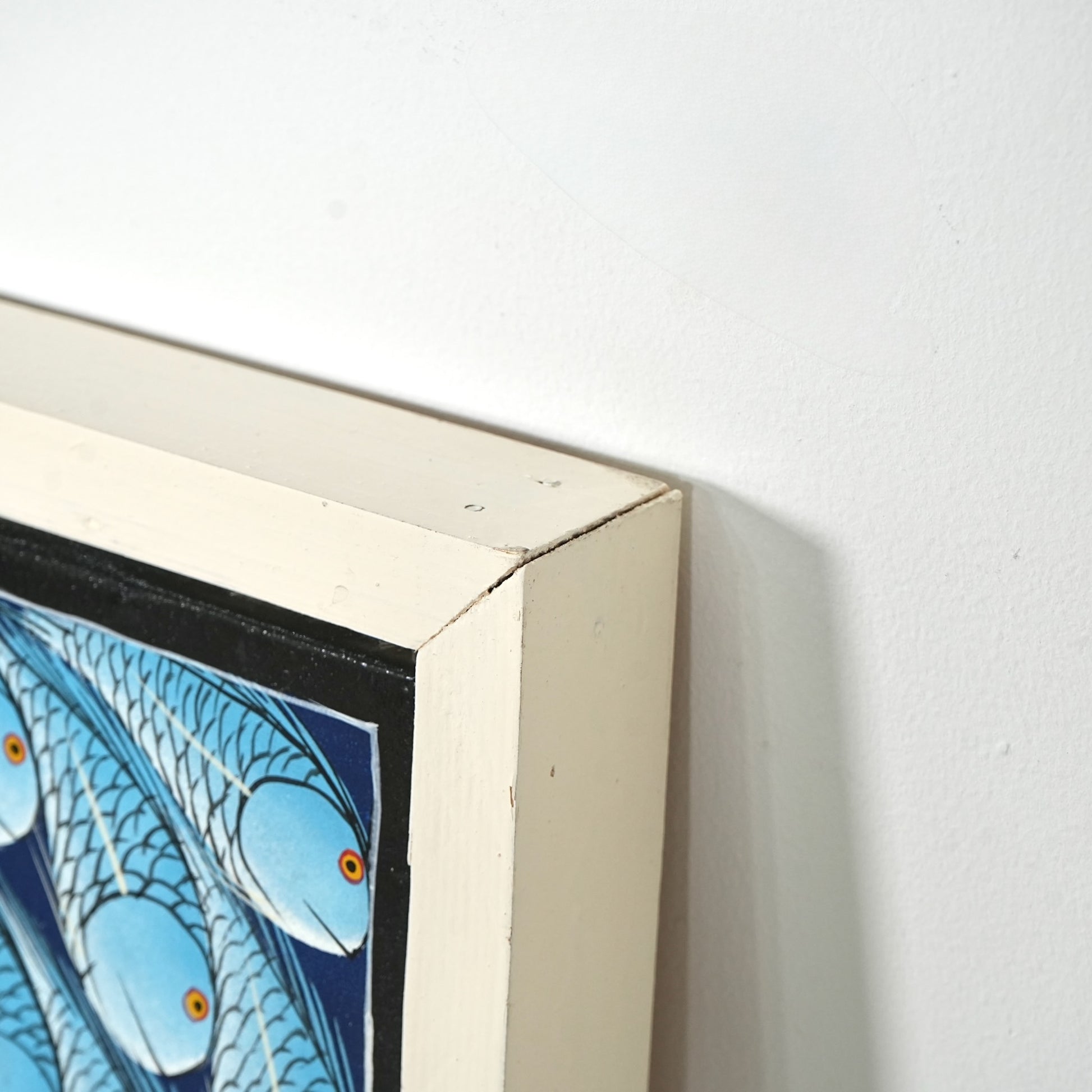 ブルーを基調とした涼やかな色調の中に、繰り返し描かれた魚たちがリズムを生み、どこか音楽的な高揚感すら宿しています。