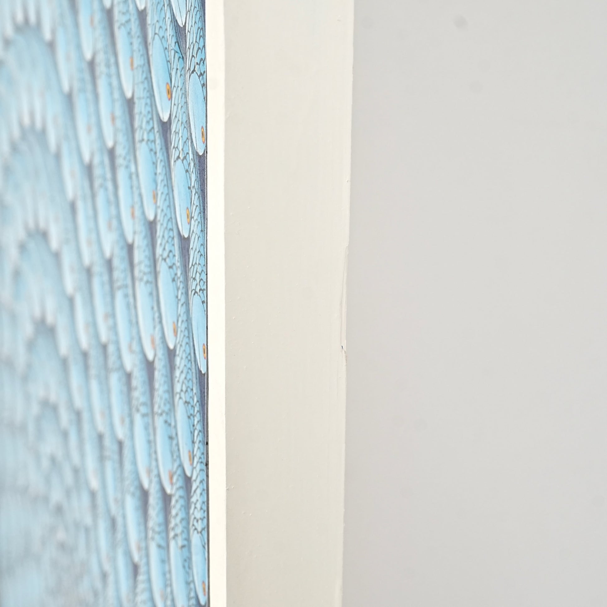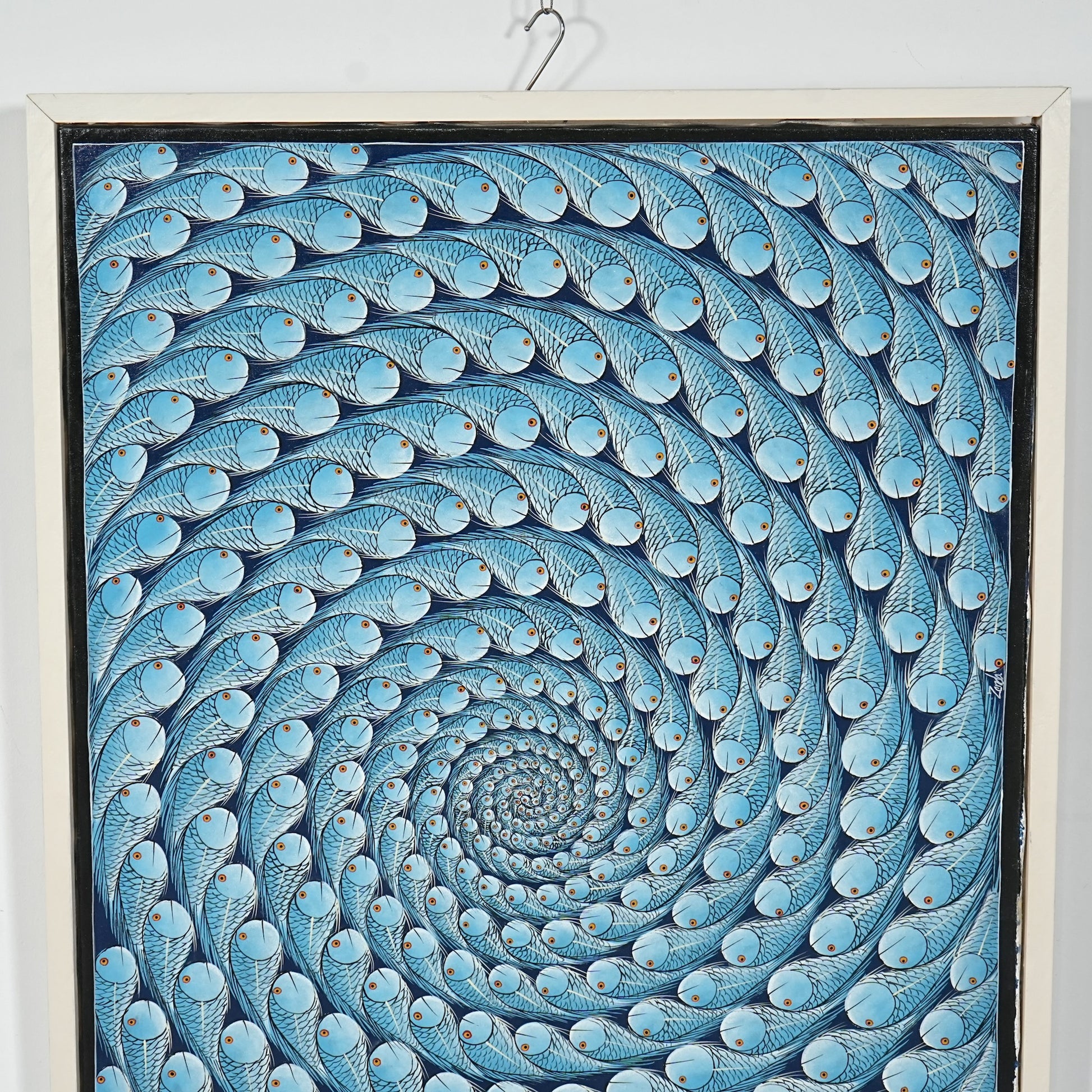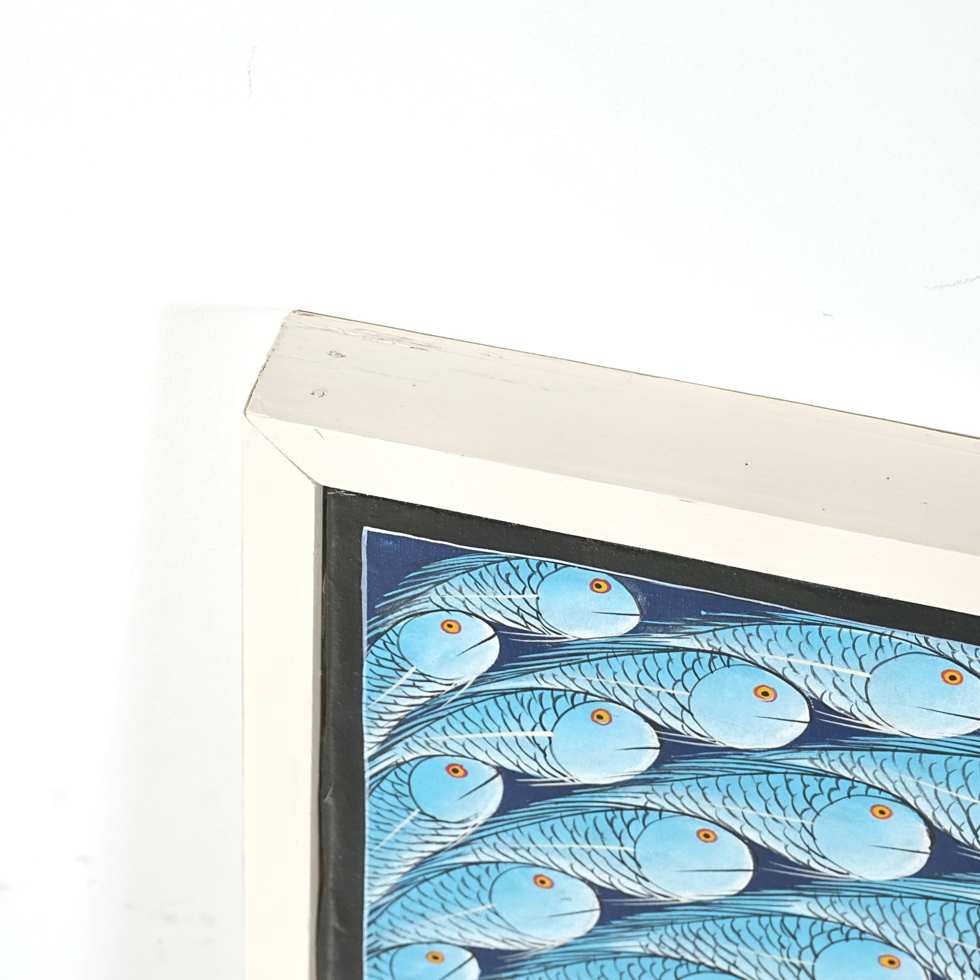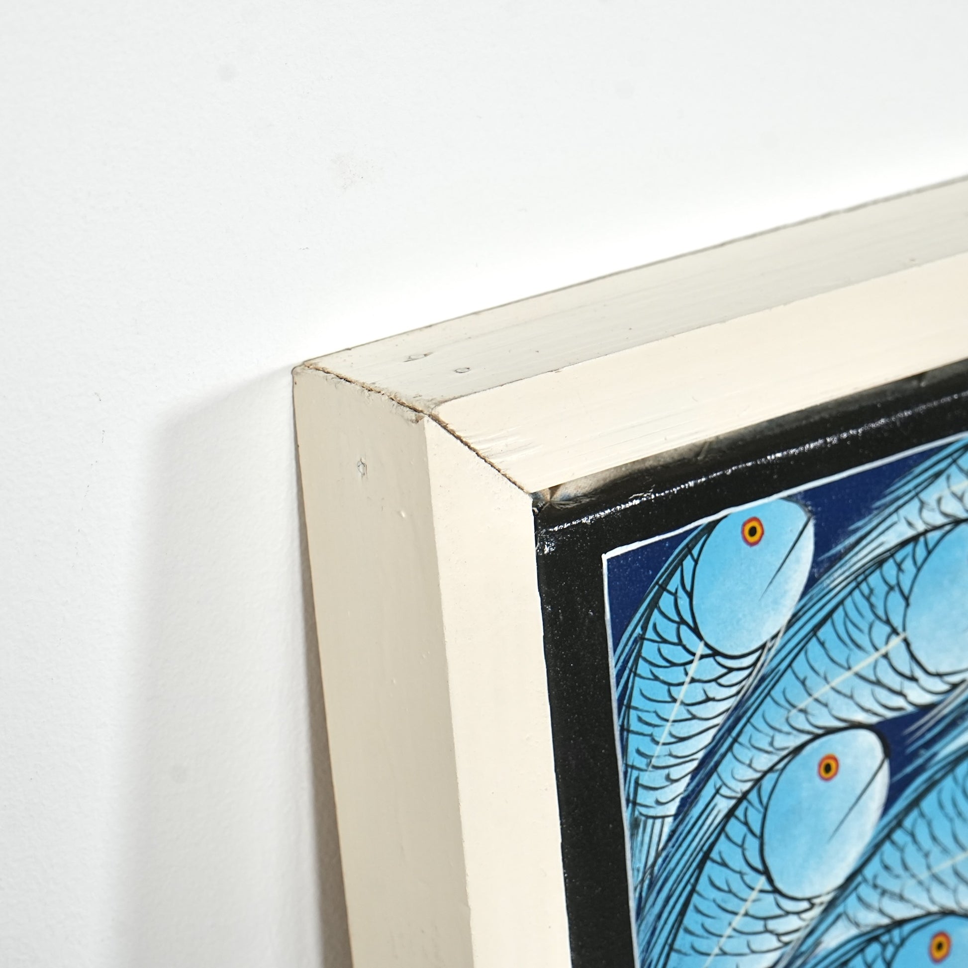 ブルーを基調とした涼やかな色調の中に、繰り返し描かれた魚たちがリズムを生み、どこか音楽的な高揚感すら宿しています。