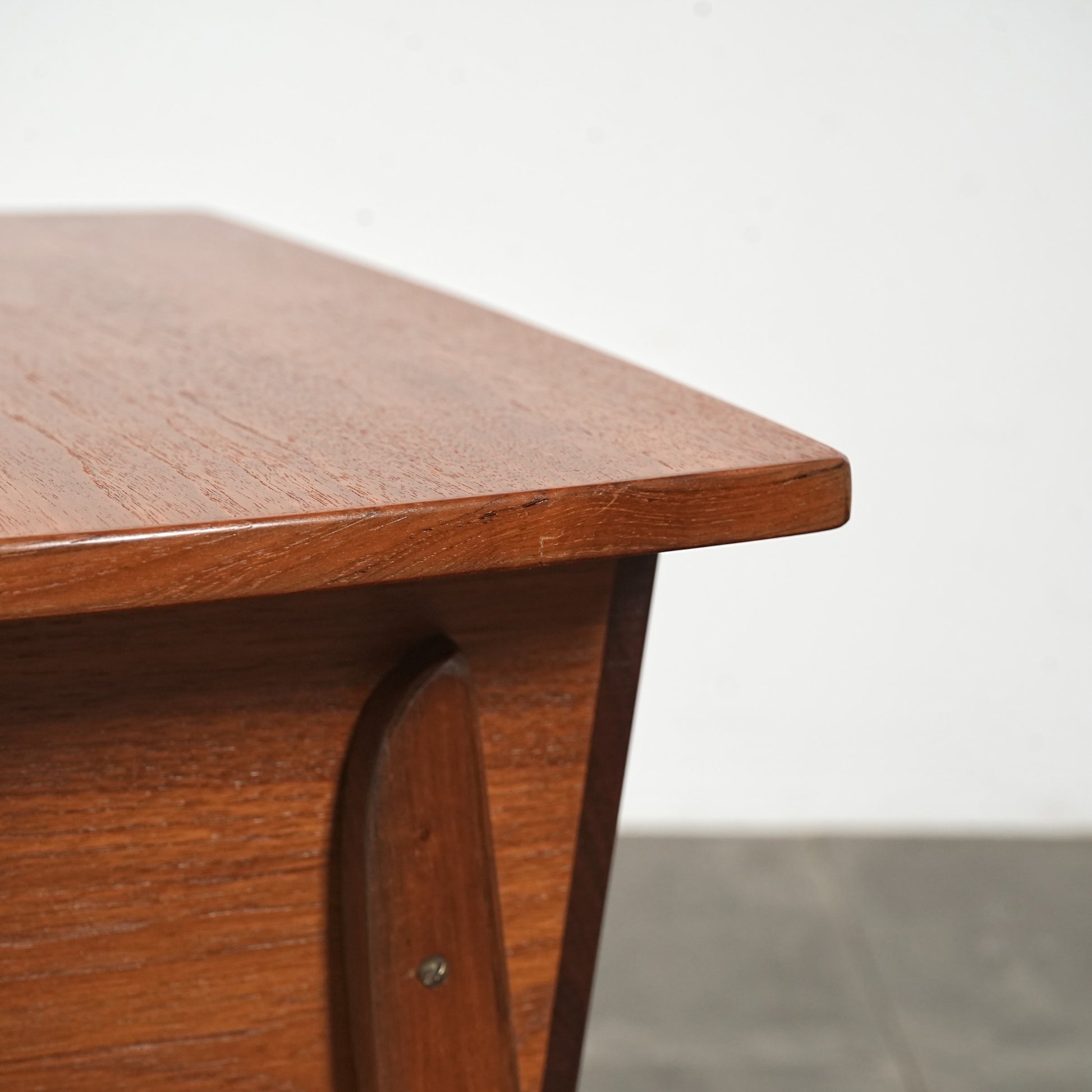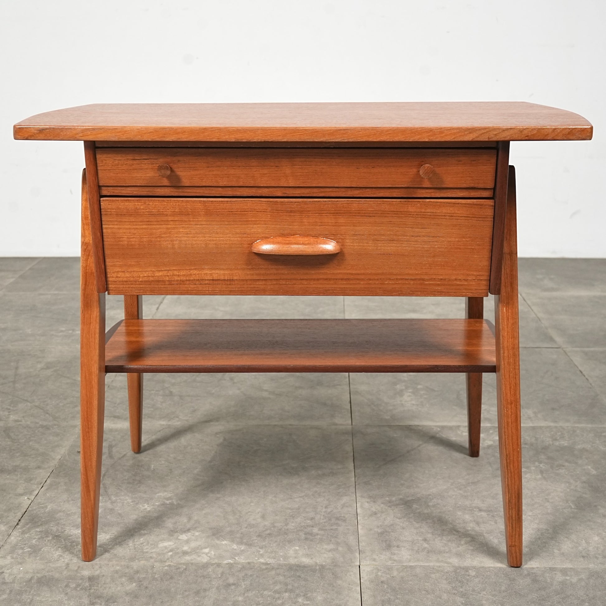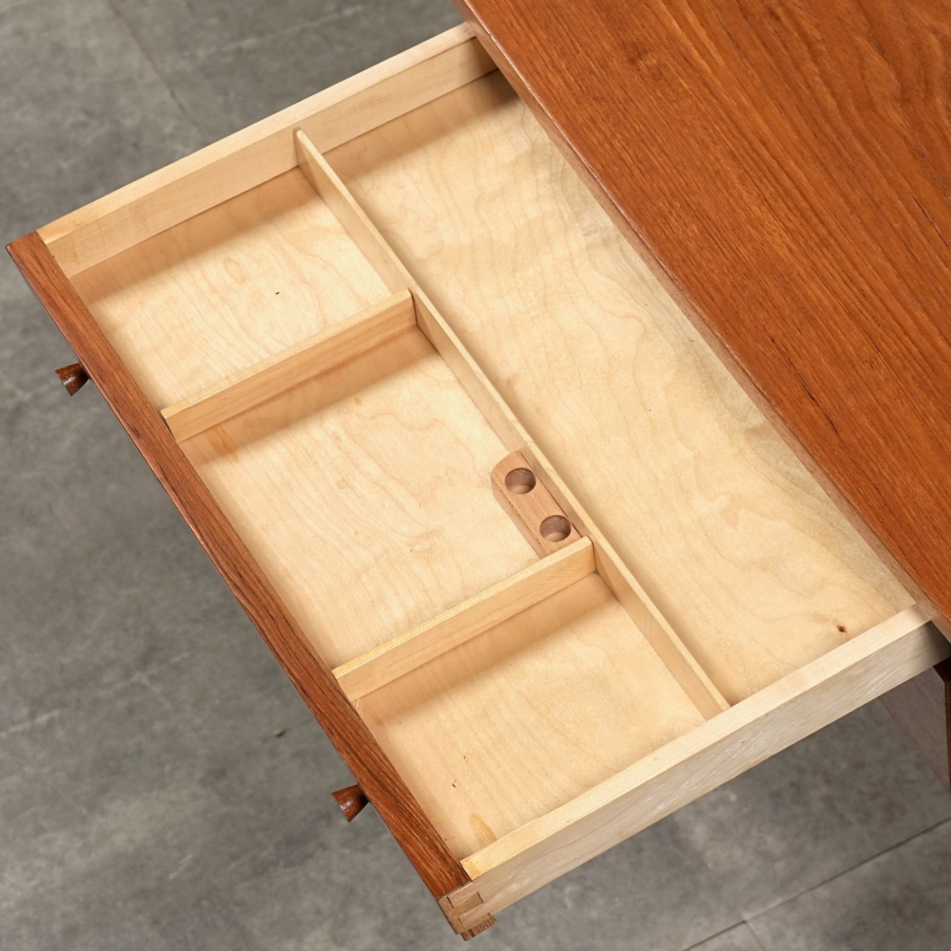 良質なチーク材の質感に加えて、脚部のシャープなフォルムや可愛らしい取手など、北欧ミッドセンチュリー家具らしい見事なデザイン性。
