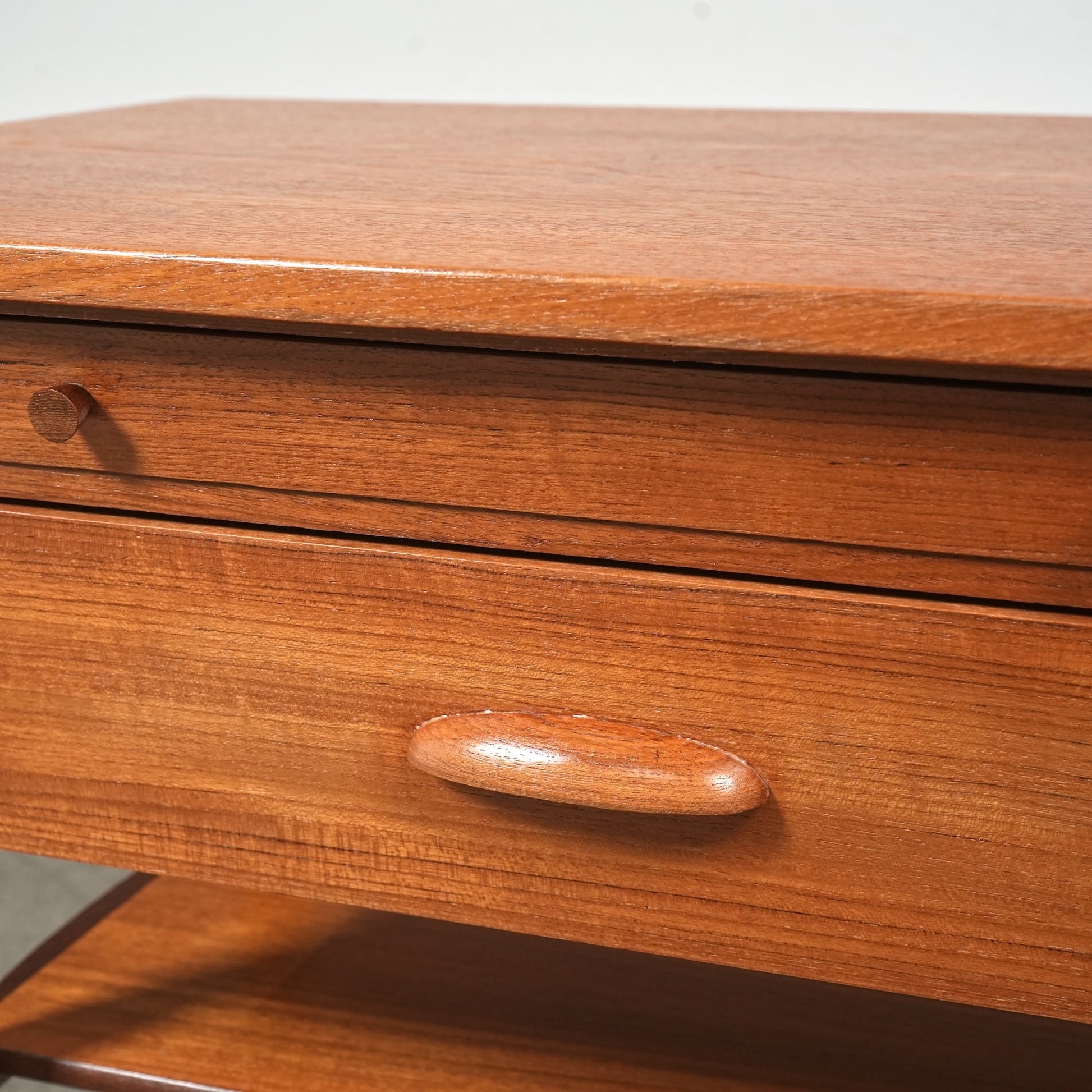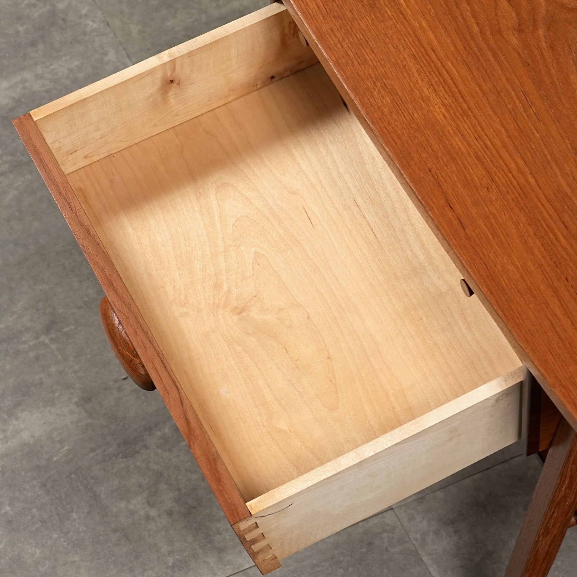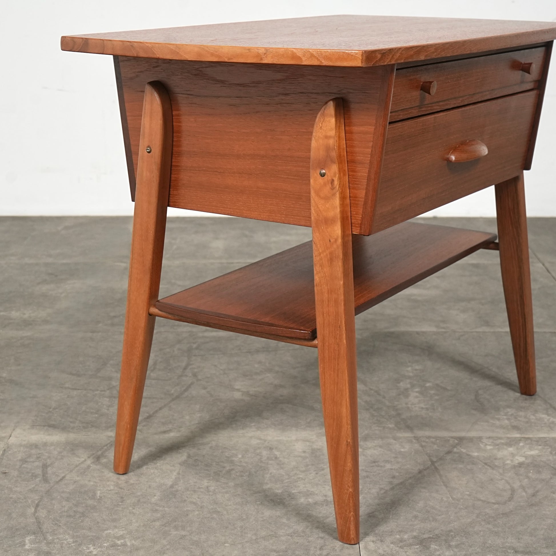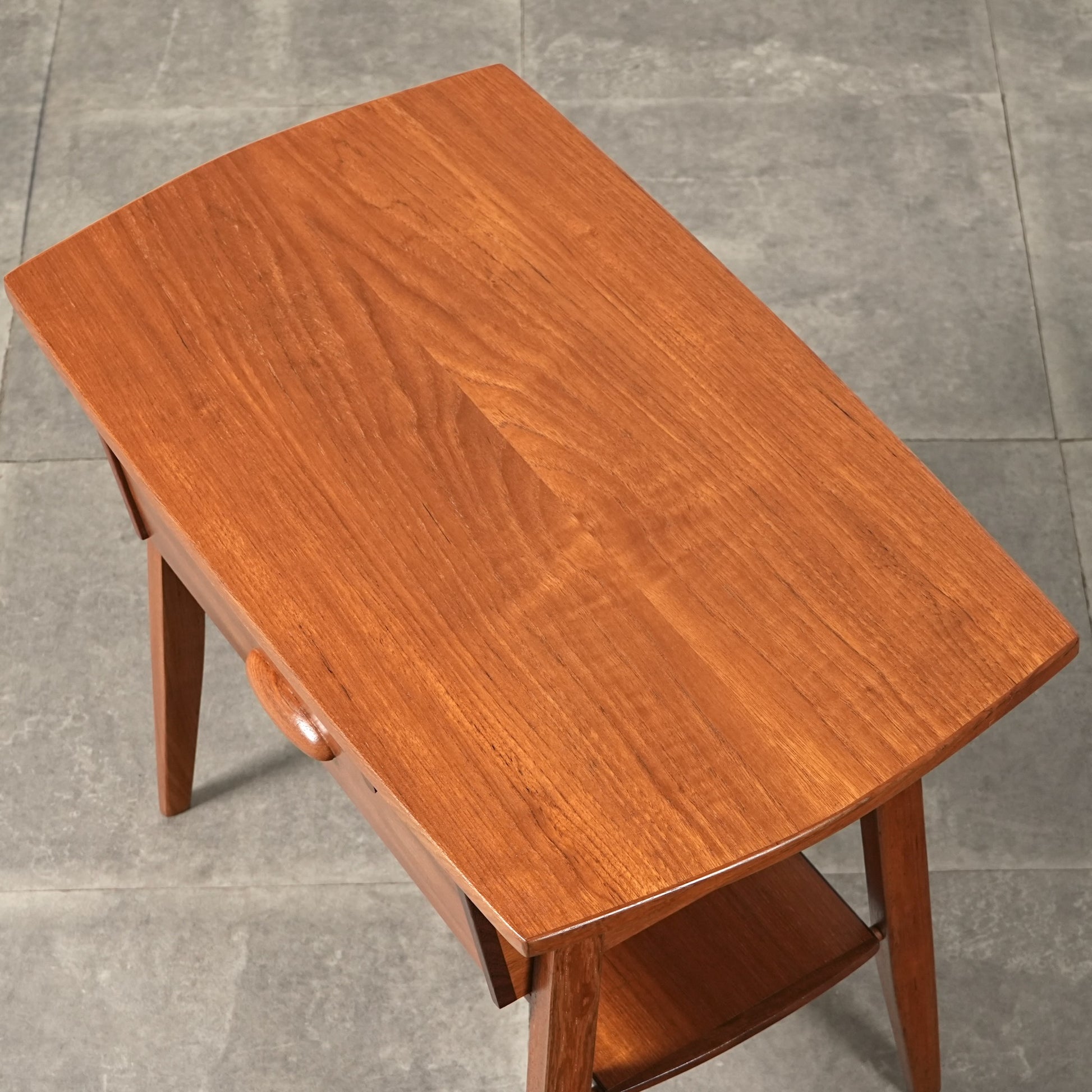 良質なチーク材の質感に加えて、脚部のシャープなフォルムや可愛らしい取手など、北欧ミッドセンチュリー家具らしい見事なデザイン性。