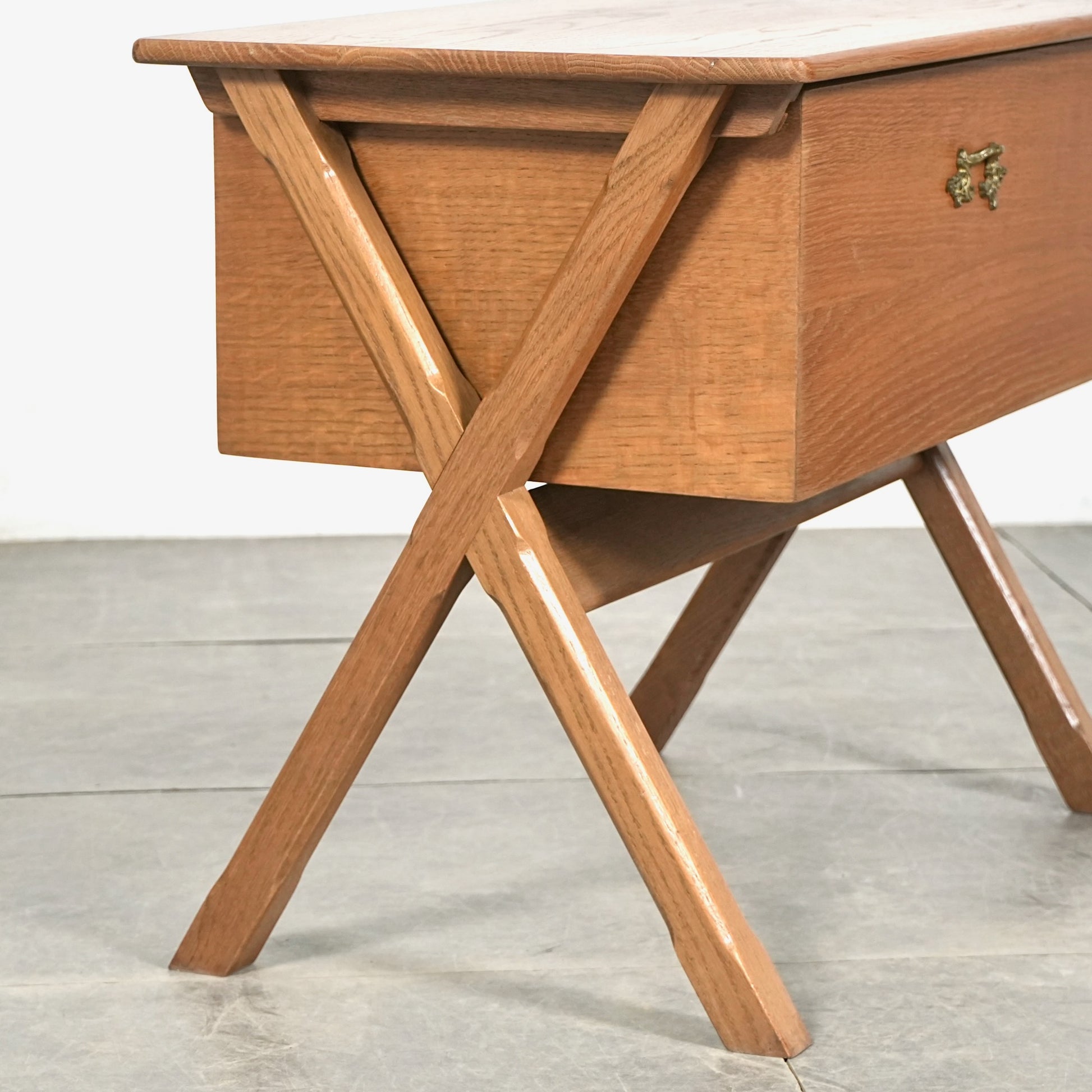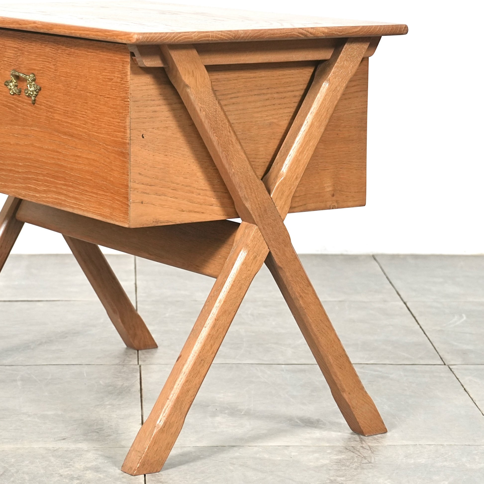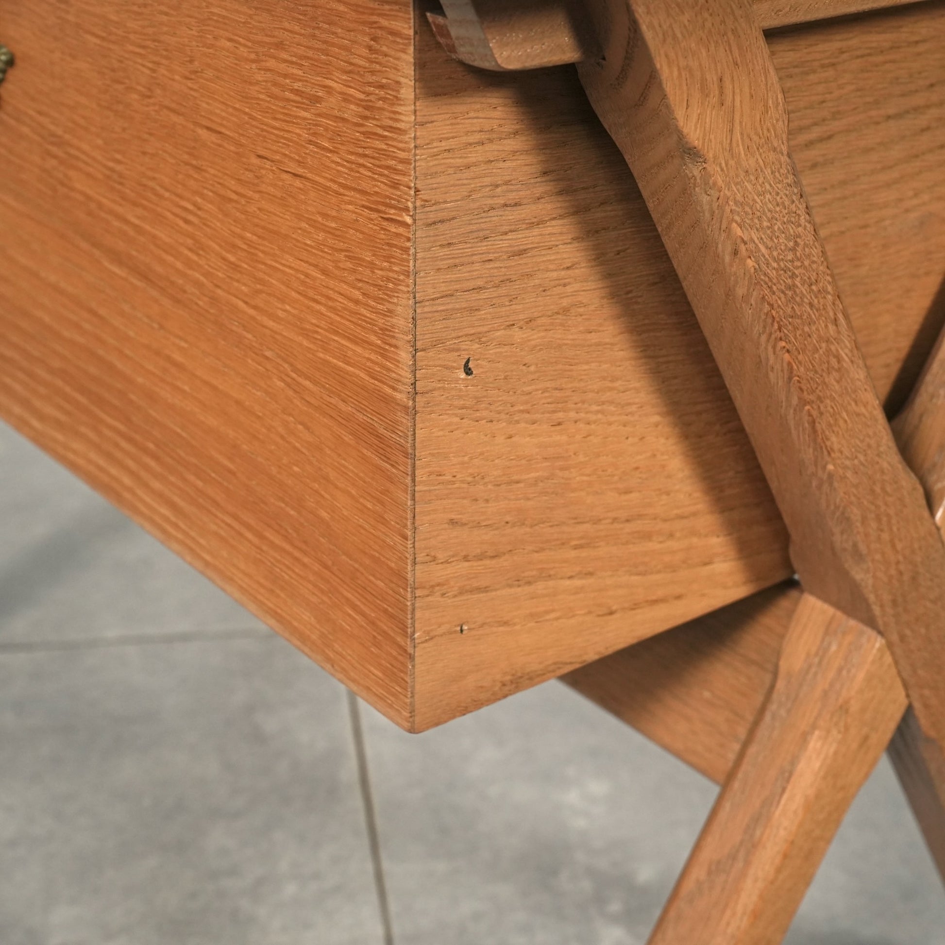 良質なオーク材の質感に加えて、脚部のユニークなフォルムや可愛らしい異素材の取手など、北欧ミッドセンチュリー家具らしい見事なデザイン。