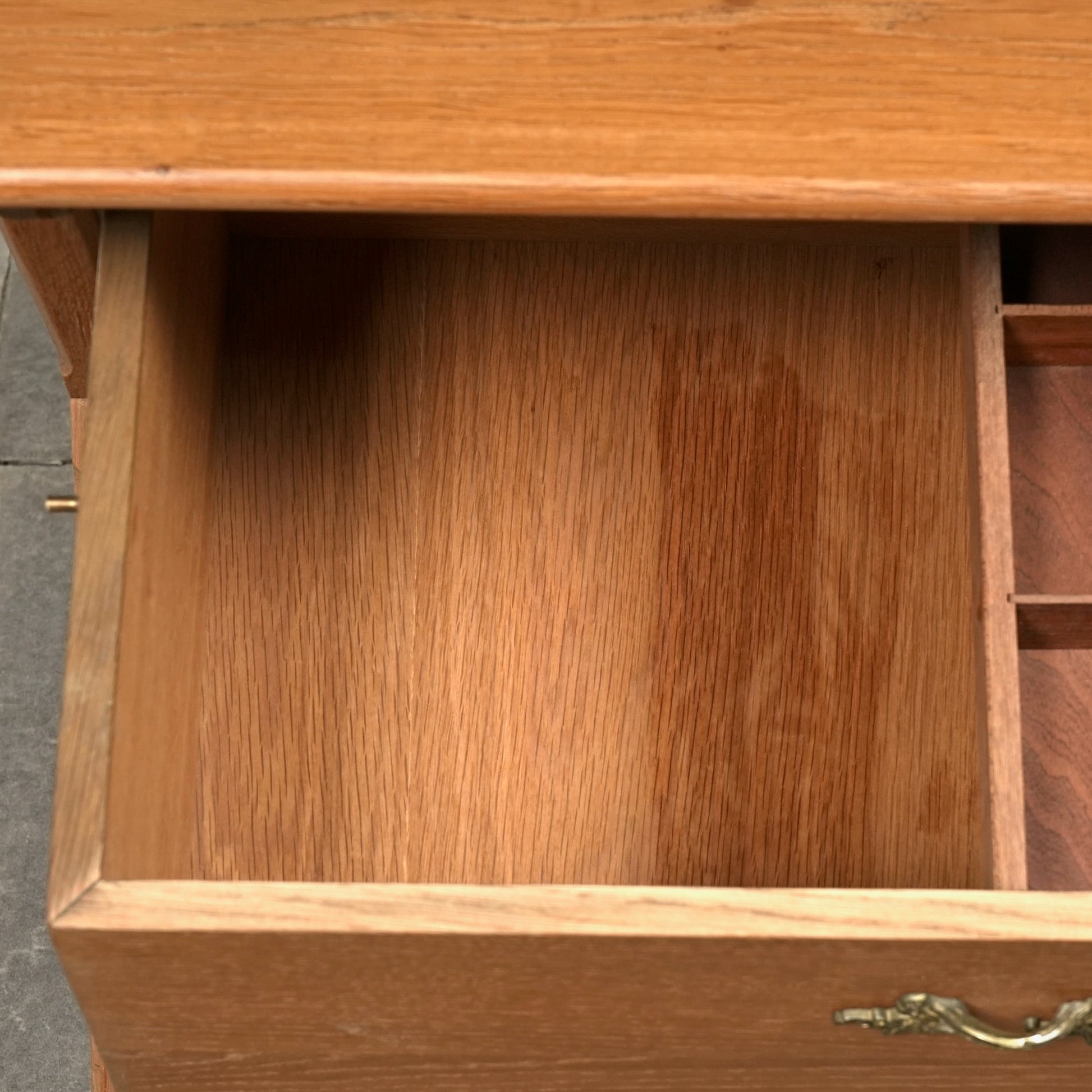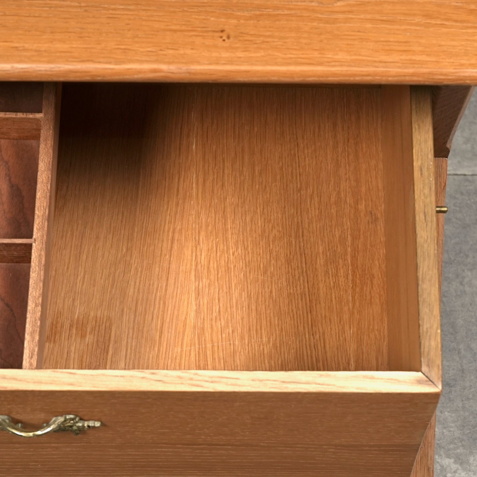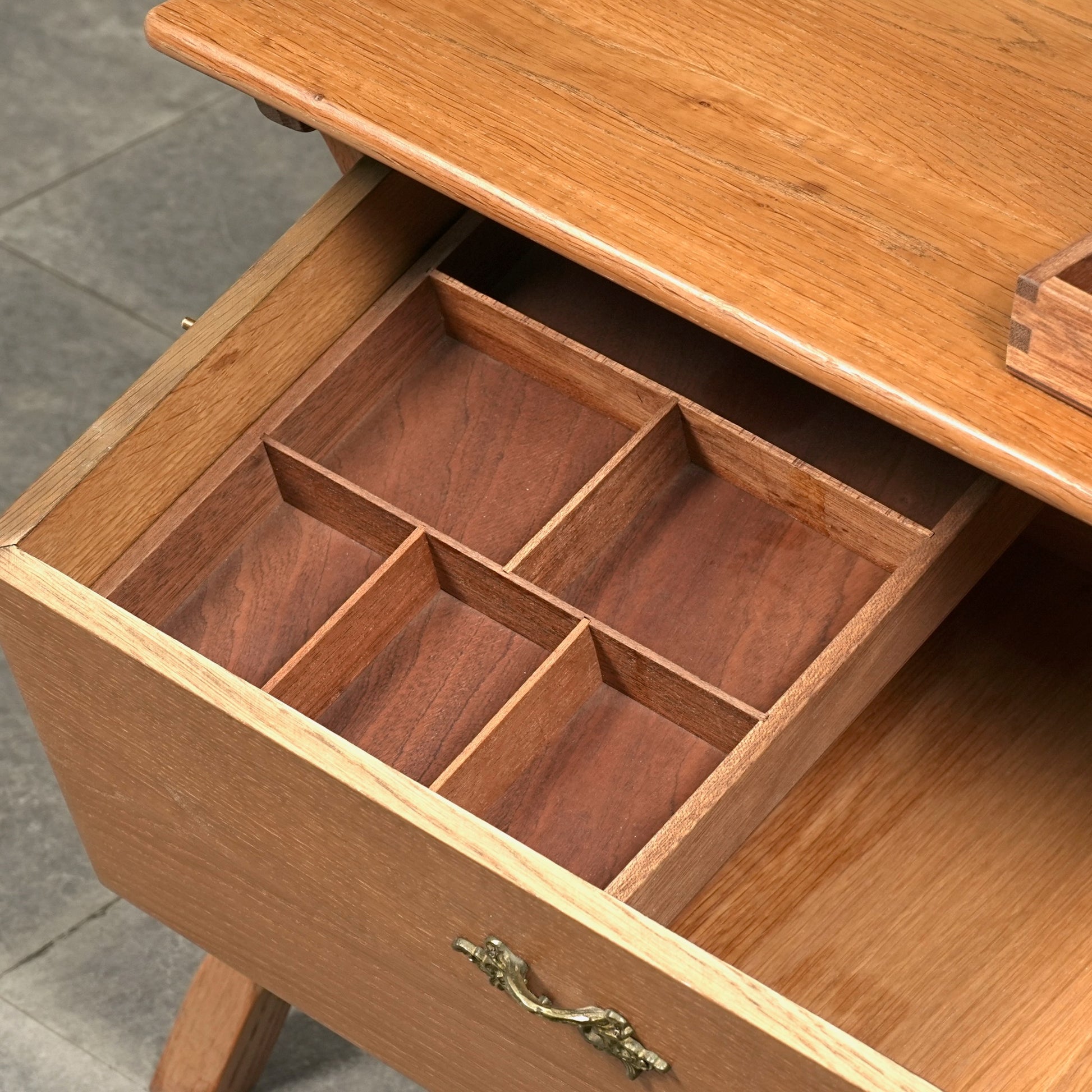良質なオーク材の質感に加えて、脚部のユニークなフォルムや可愛らしい異素材の取手など、北欧ミッドセンチュリー家具らしい見事なデザイン。