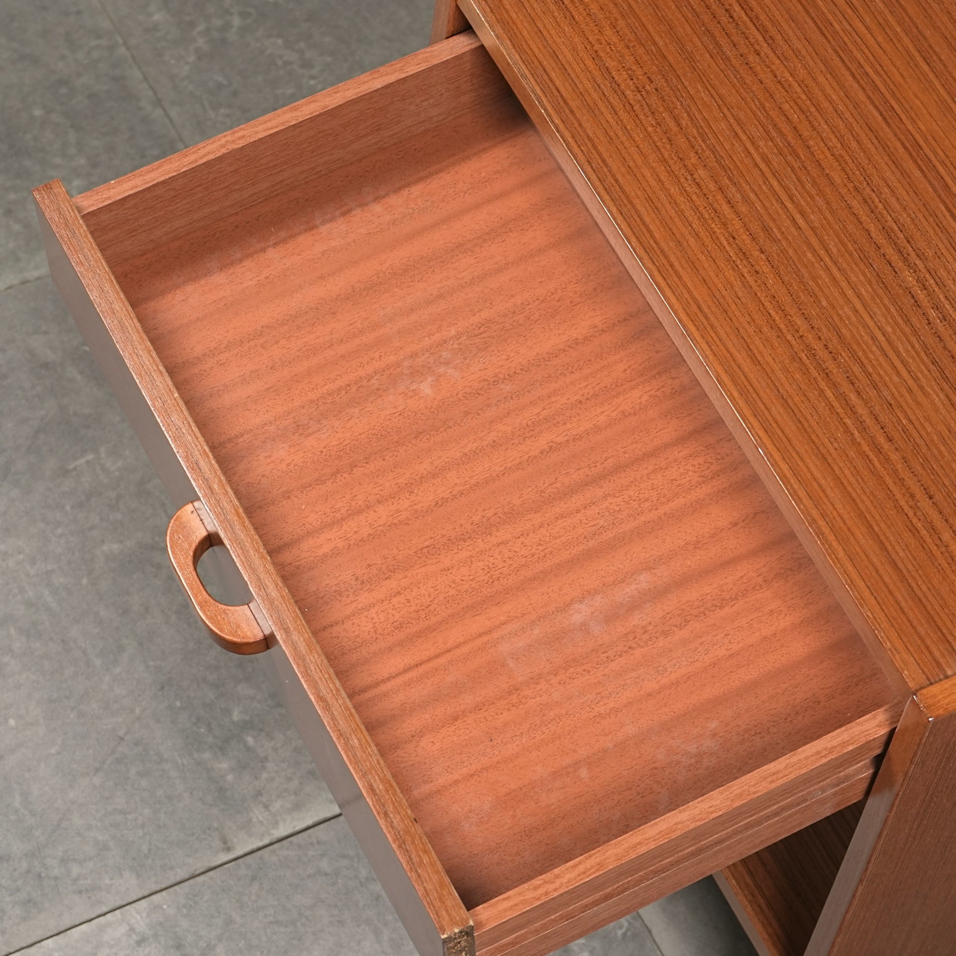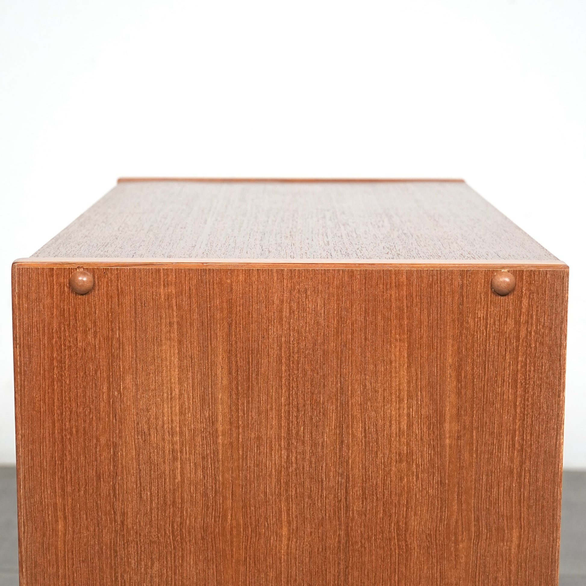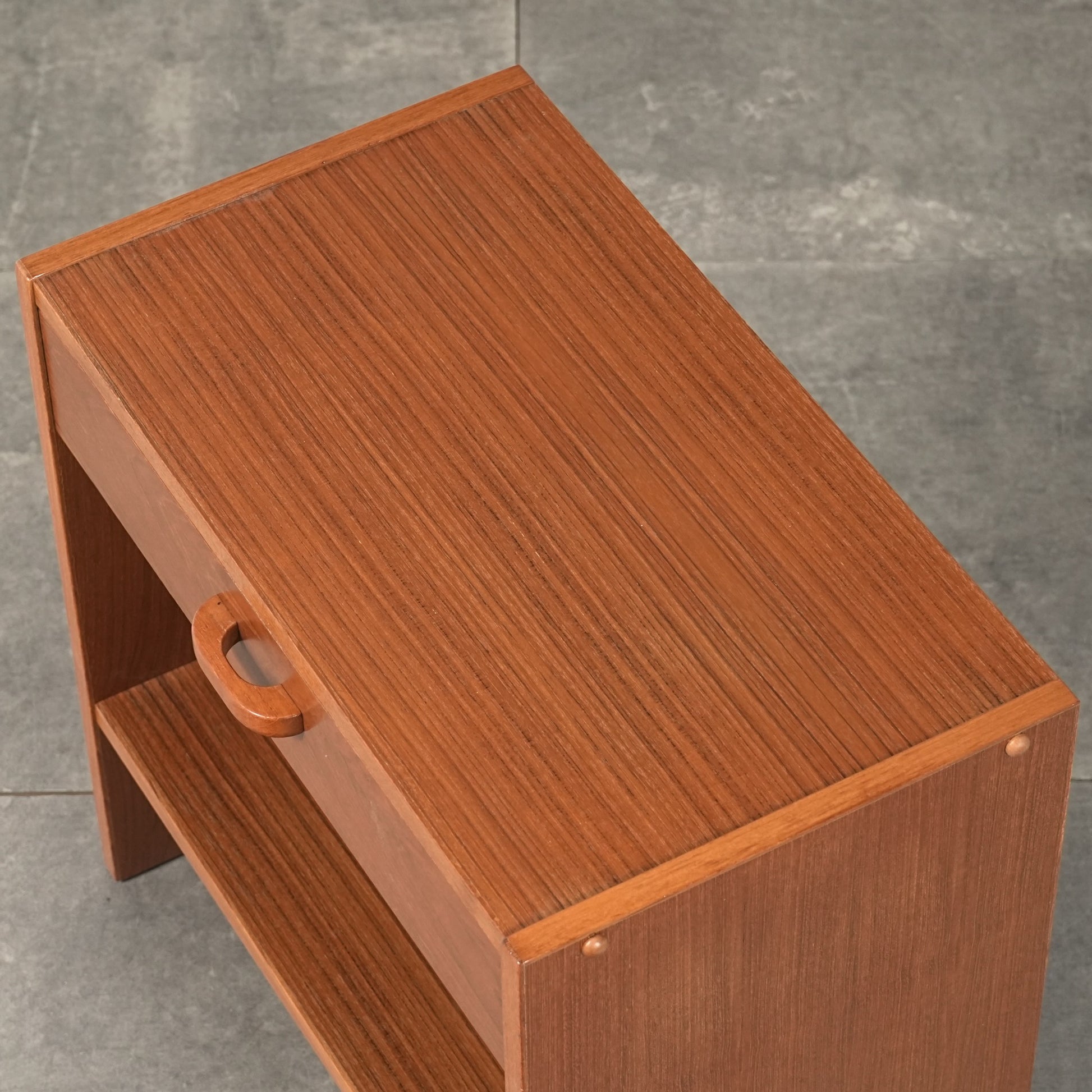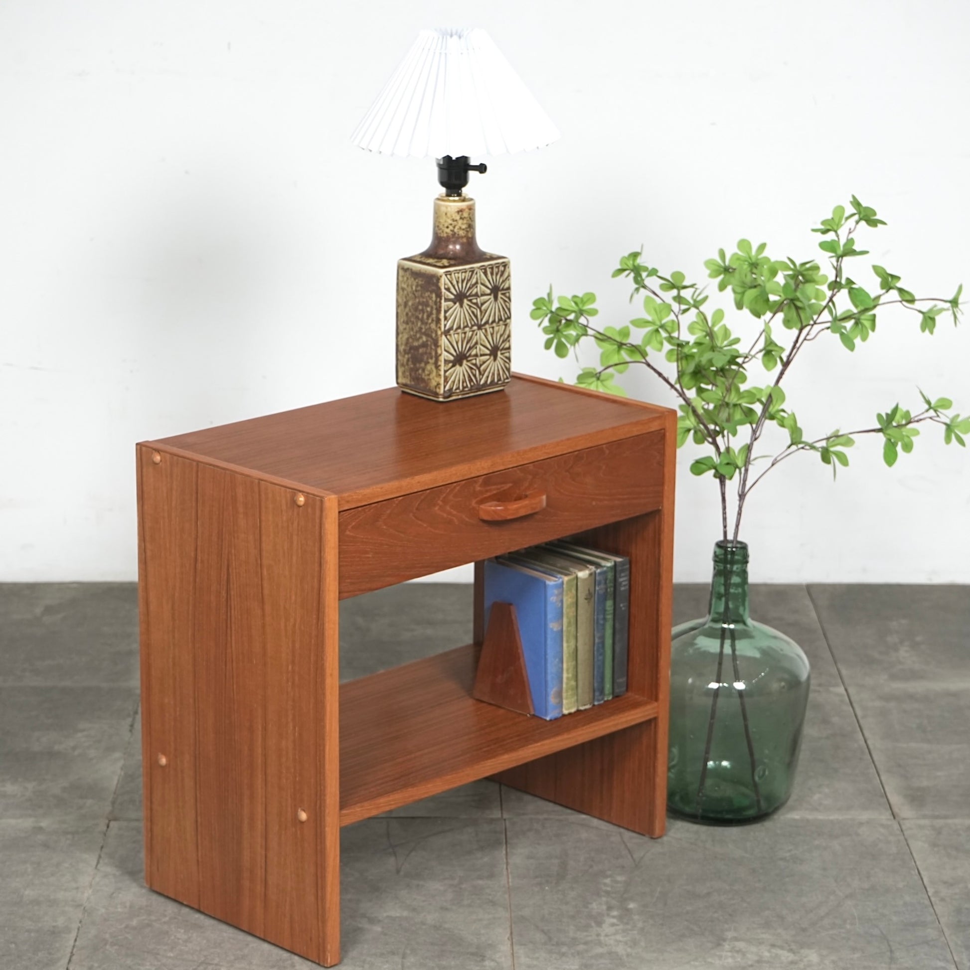 良質なチーク材の質感が際立つミニマルな構成で、削り出しの可愛いらしい取手が良いアクセントになっています。