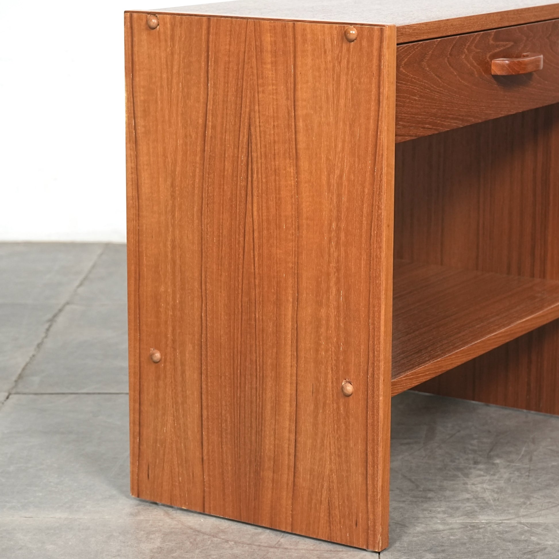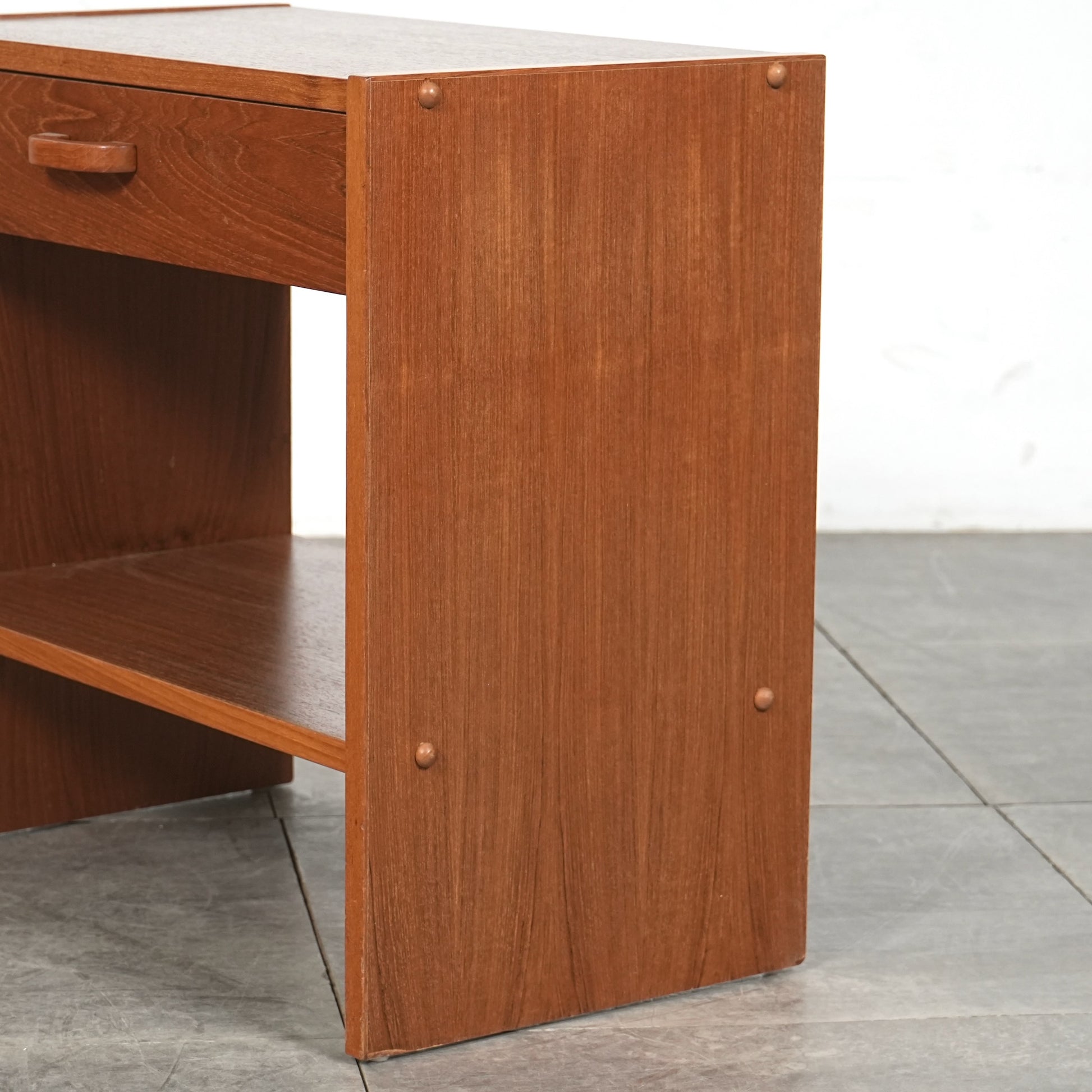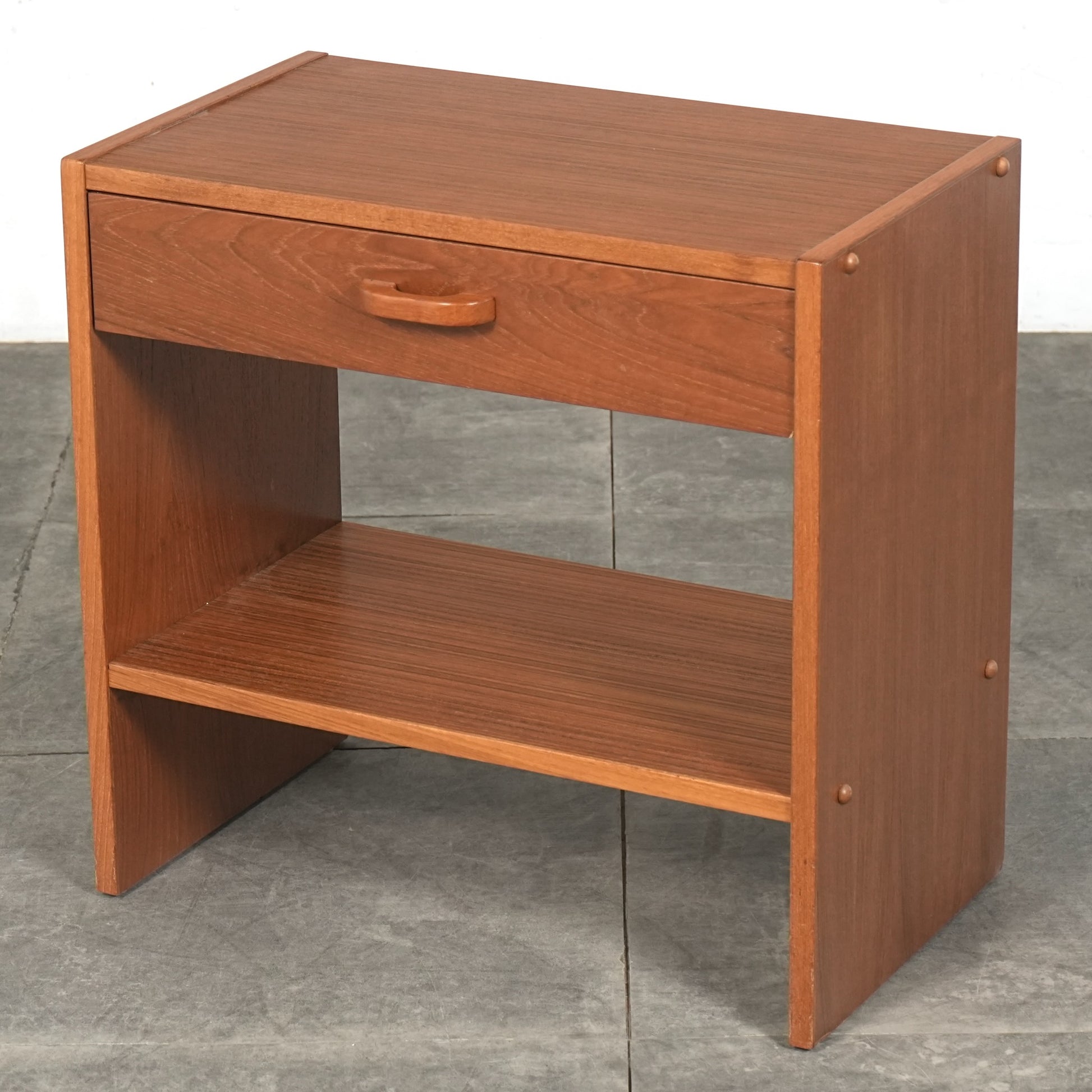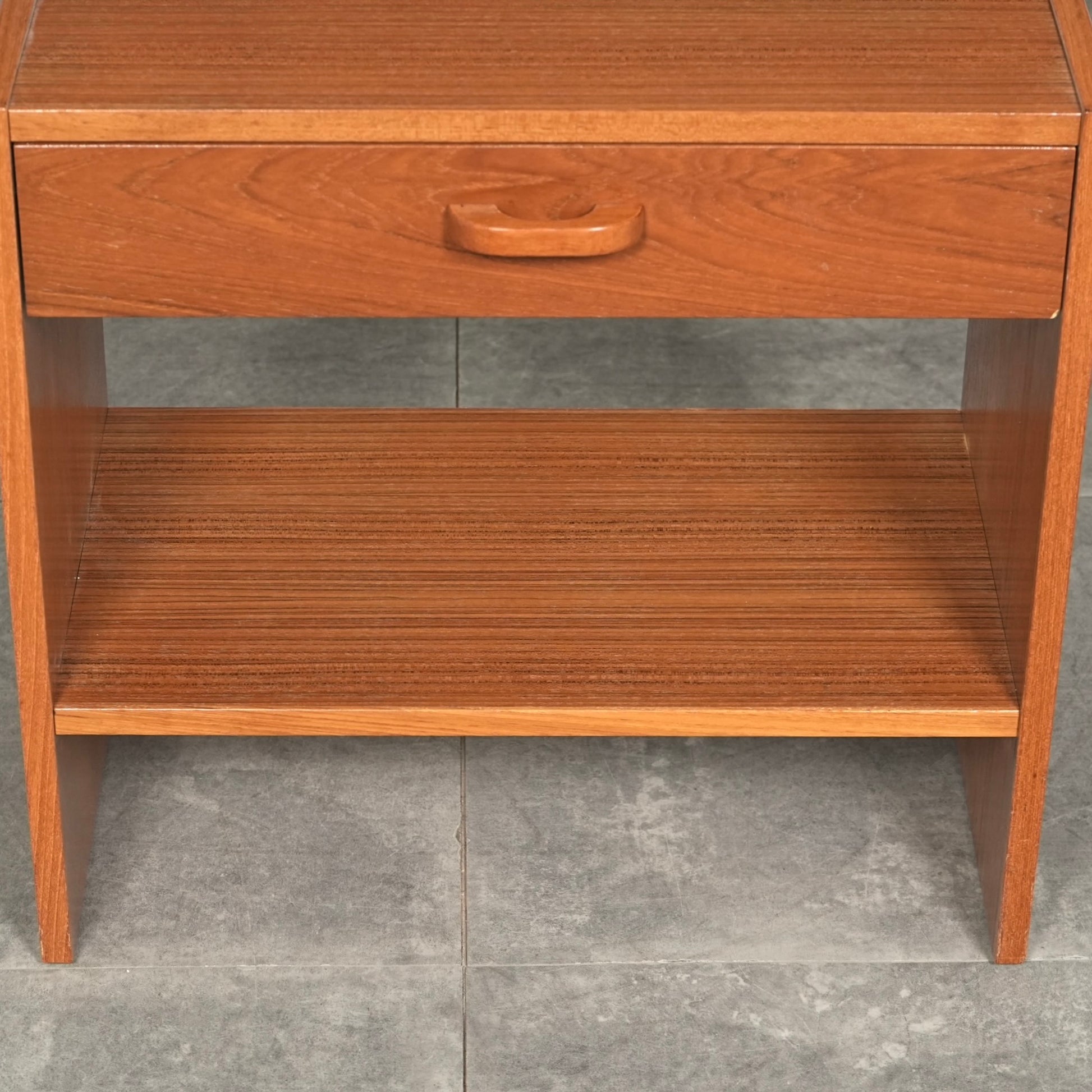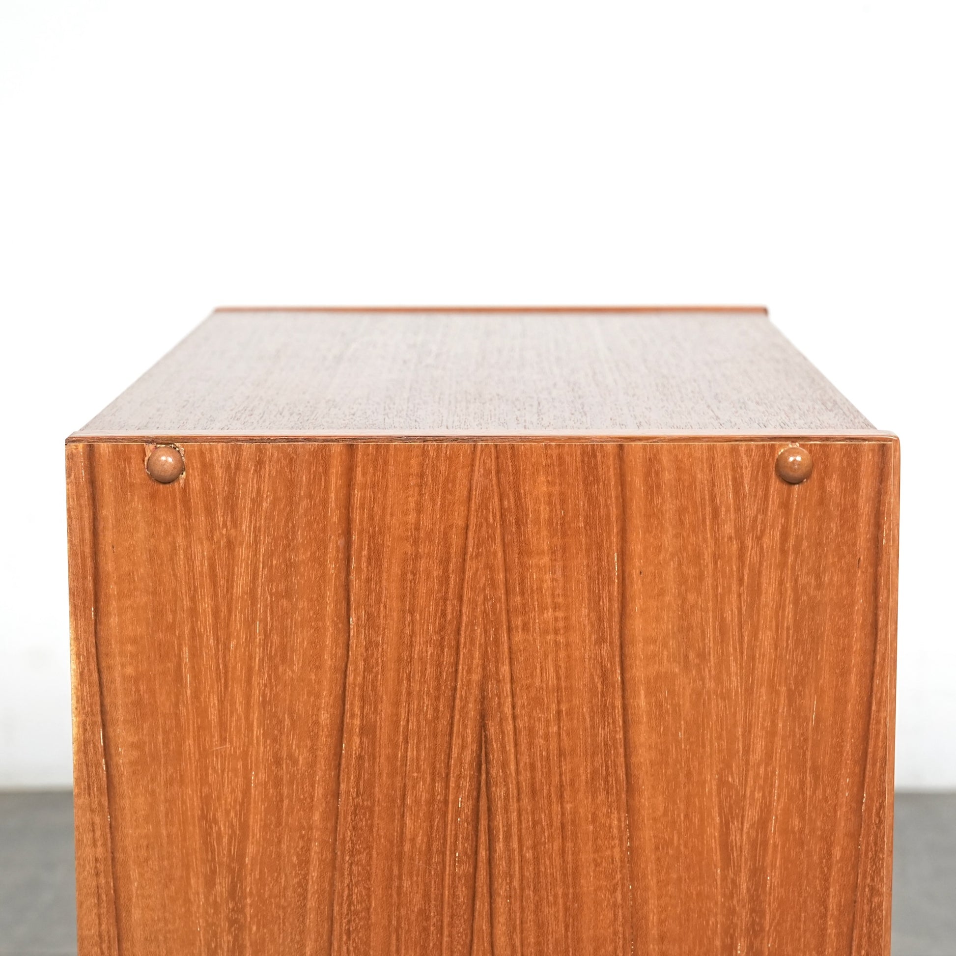 良質なチーク材の質感が際立つミニマルな構成で、削り出しの可愛いらしい取手が良いアクセントになっています。