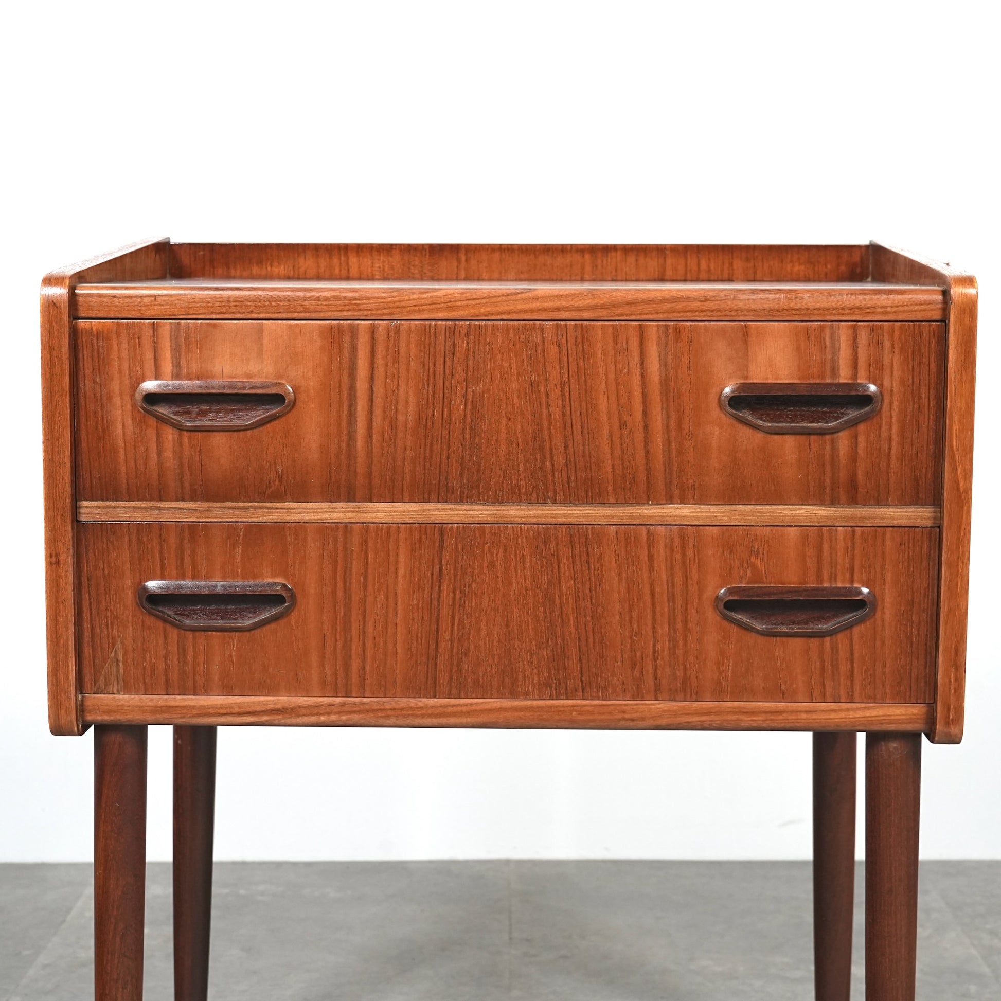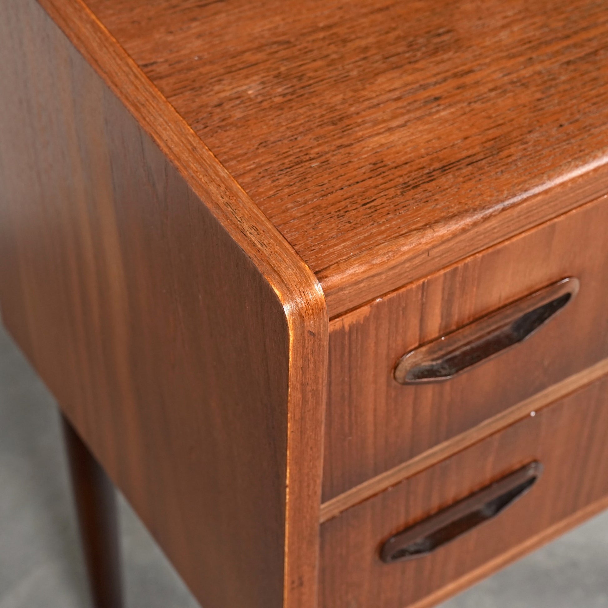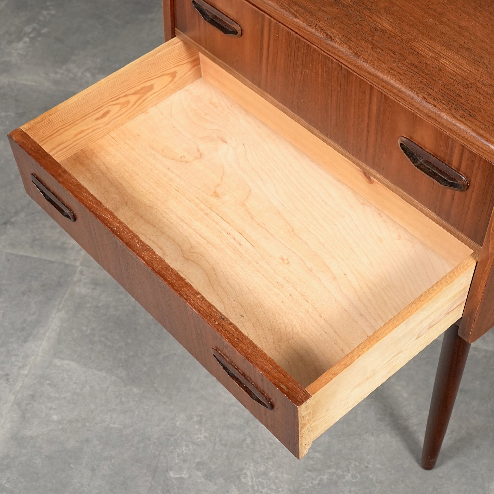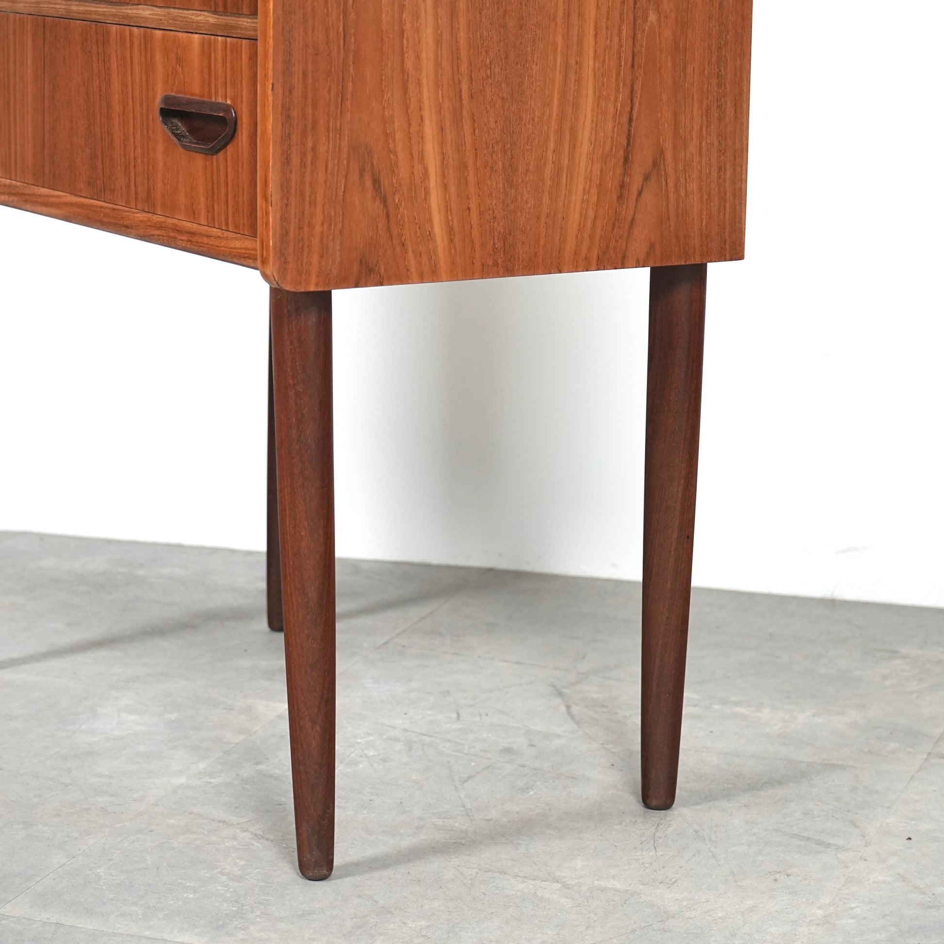ミッドセンチュリーらしさ詰まった見事なデザインで、削り出しで作られた可愛いらしい取手だけでなく、抜け感のあるスリムな脚部も印象的。