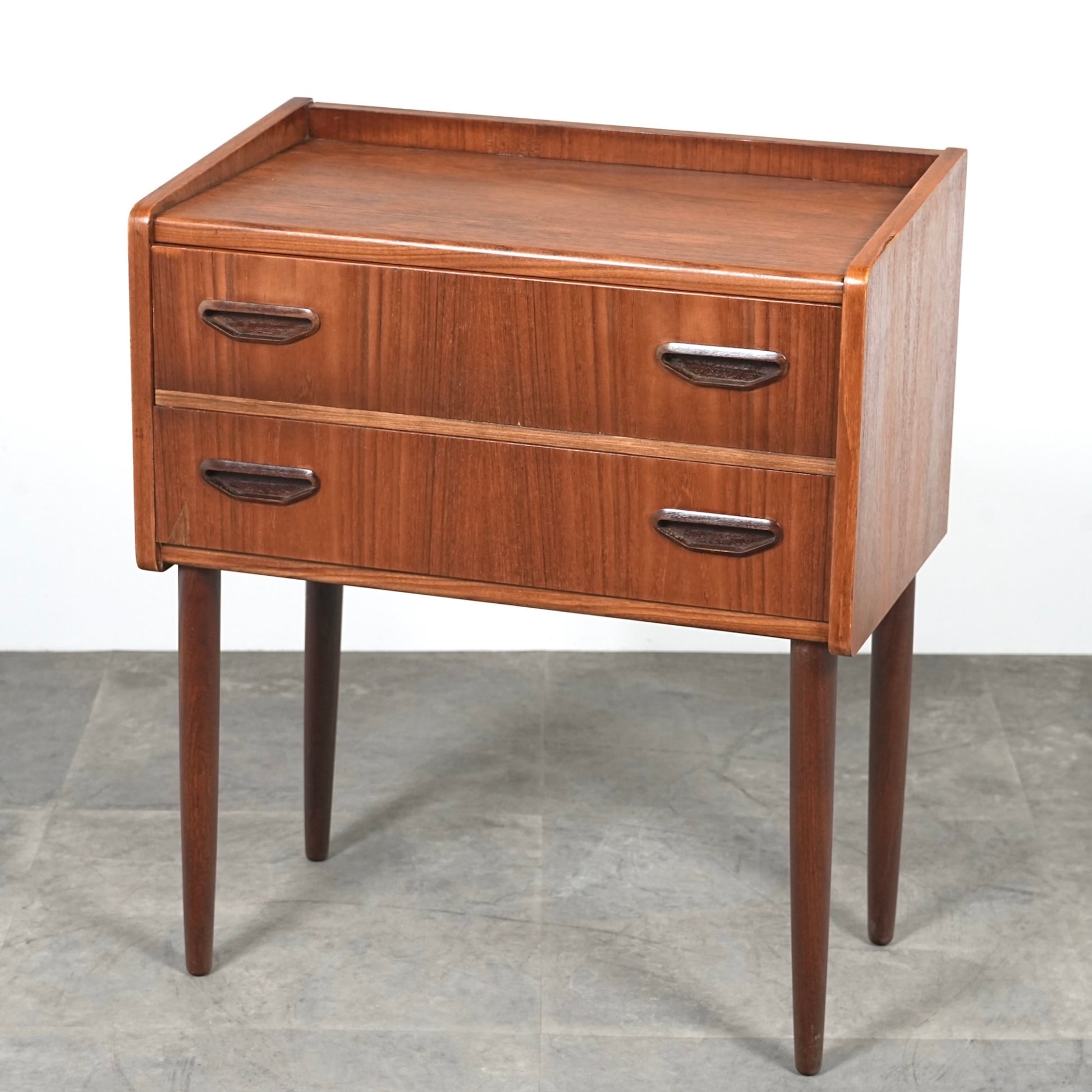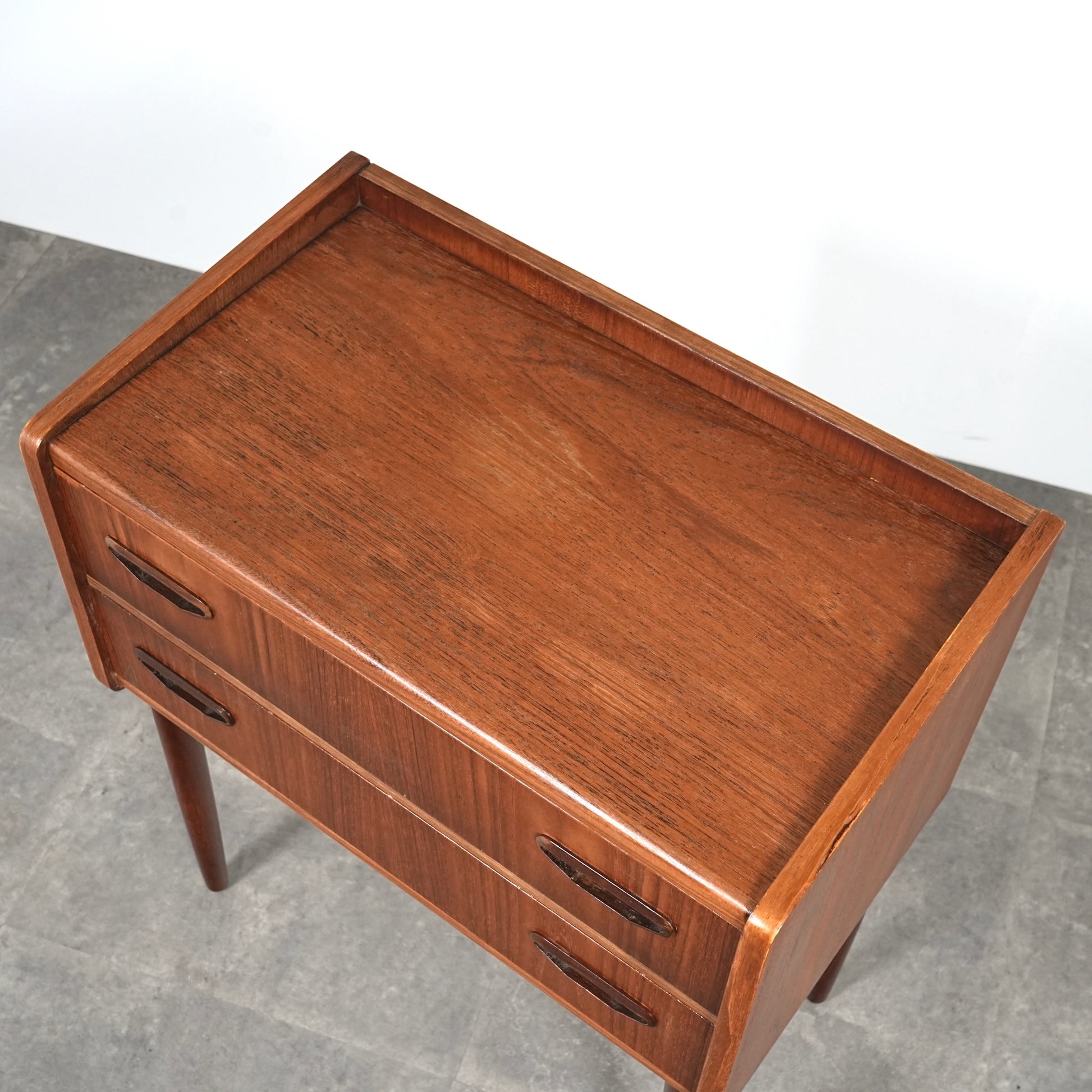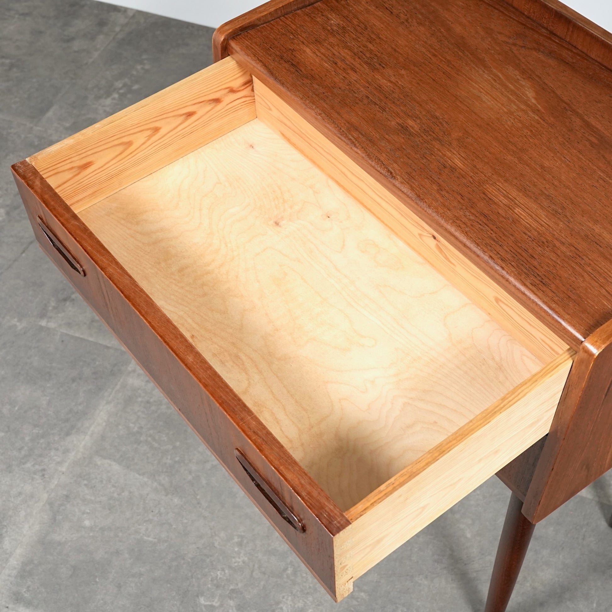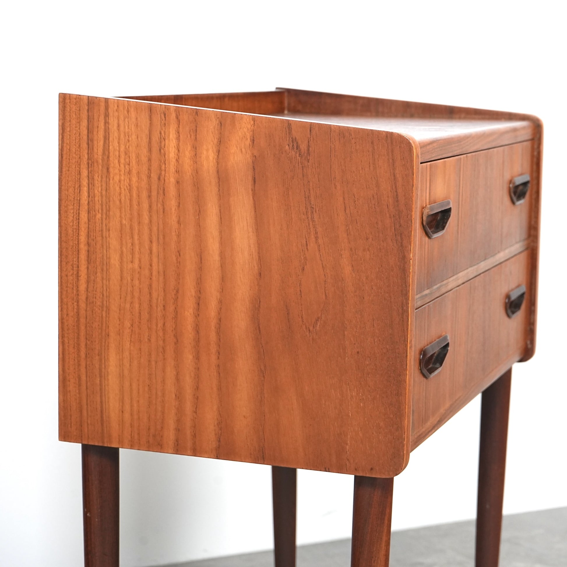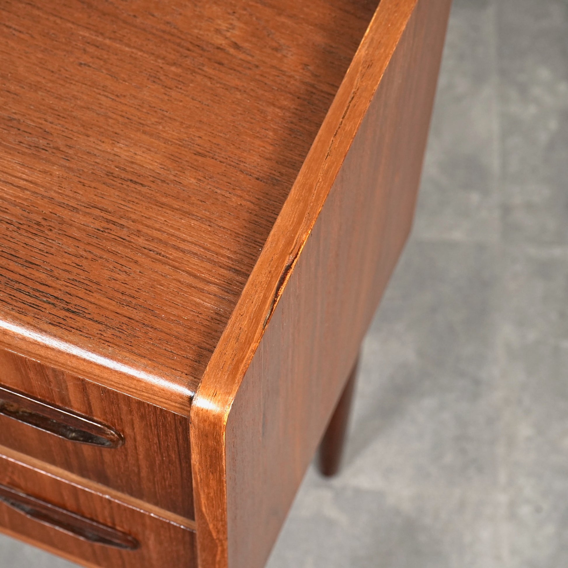 ミッドセンチュリーらしさ詰まった見事なデザインで、削り出しで作られた可愛いらしい取手だけでなく、抜け感のあるスリムな脚部も印象的。
