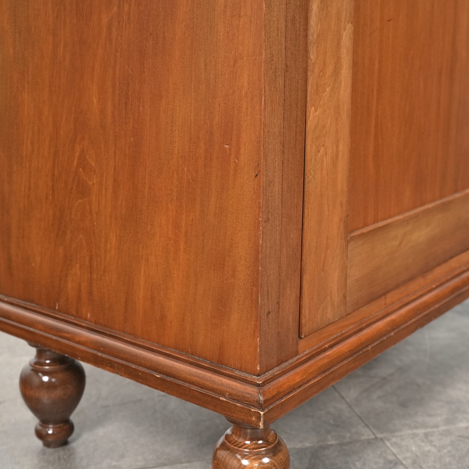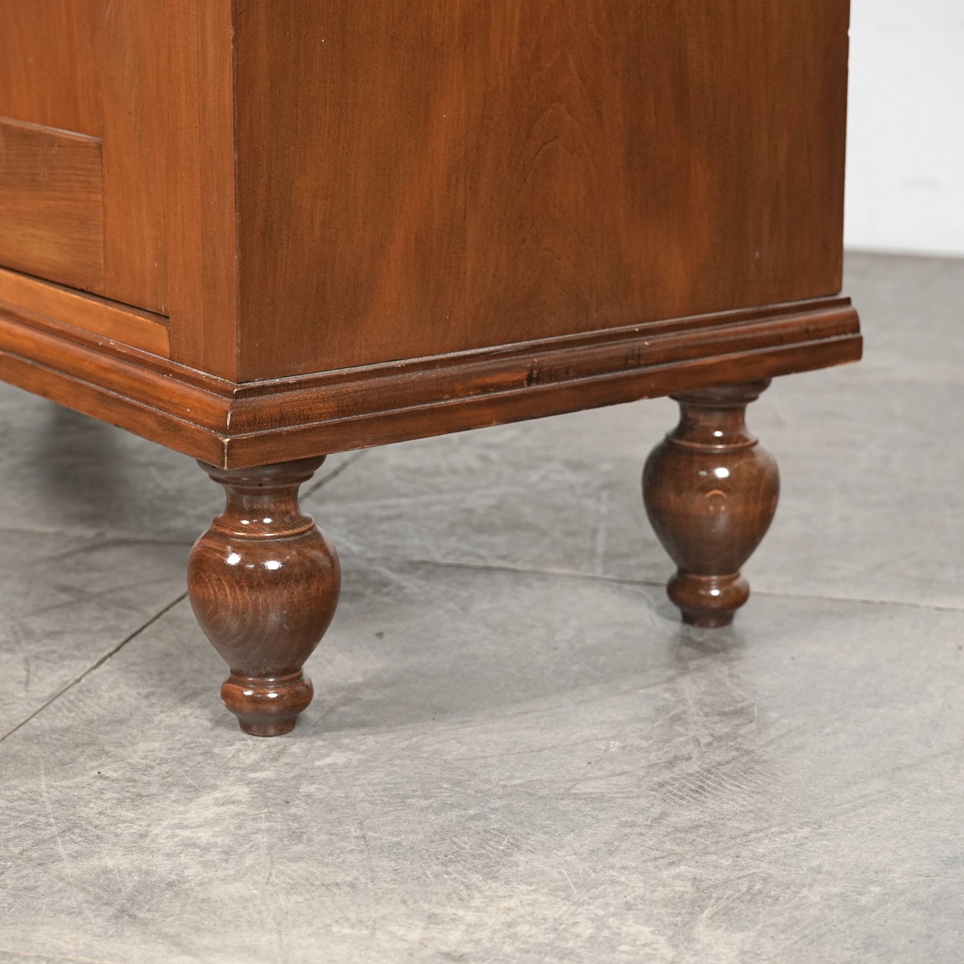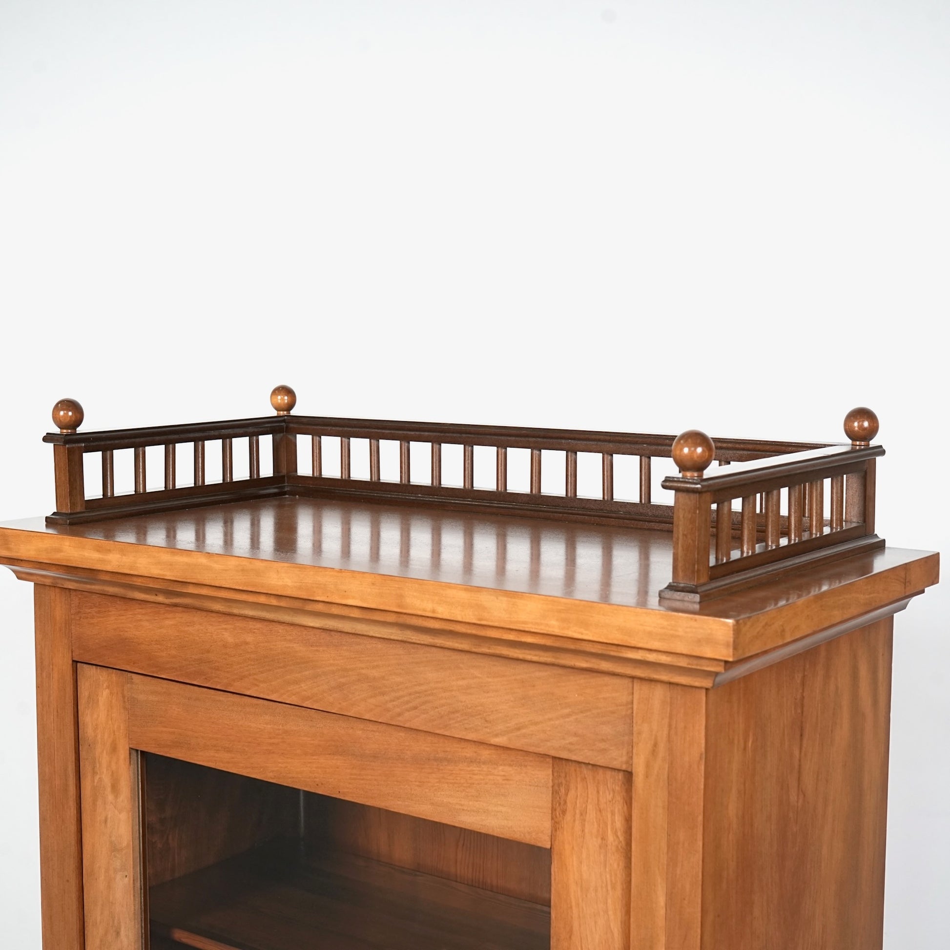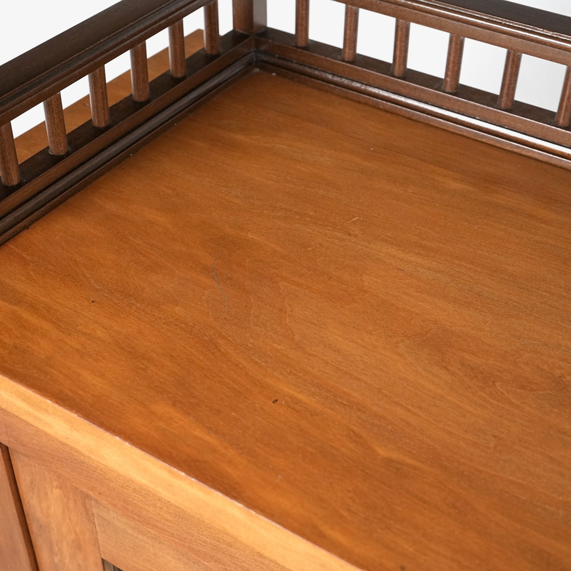 主張しすぎないシンプルかつ上品な佇まいの中に、ろくろ脚や上部のさりげない装飾が程よいアクセントとなった見事なデザイン。