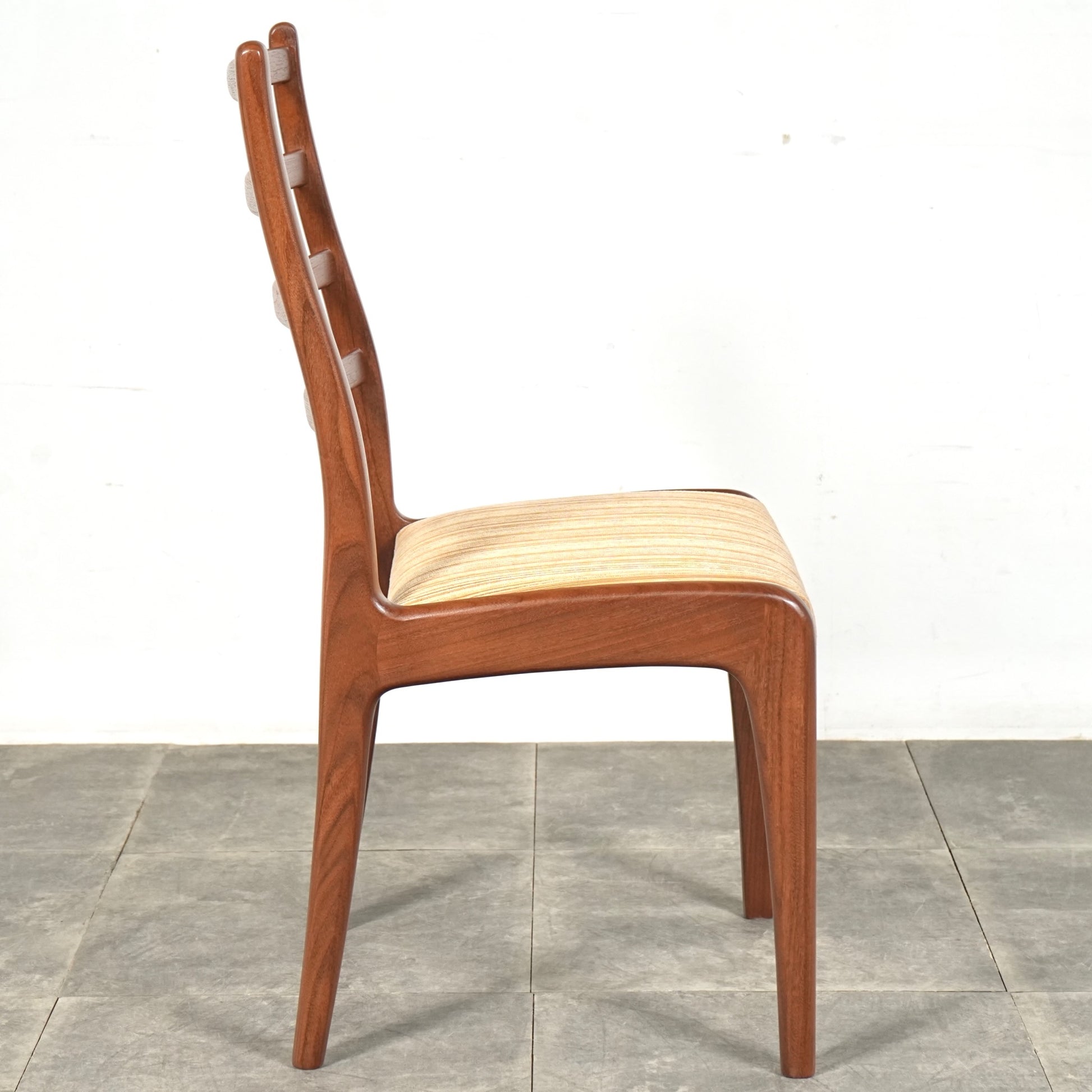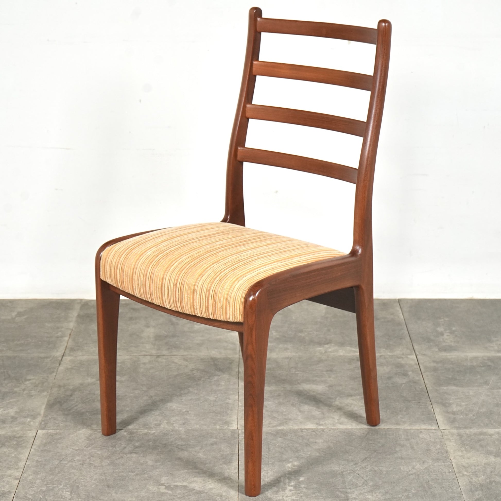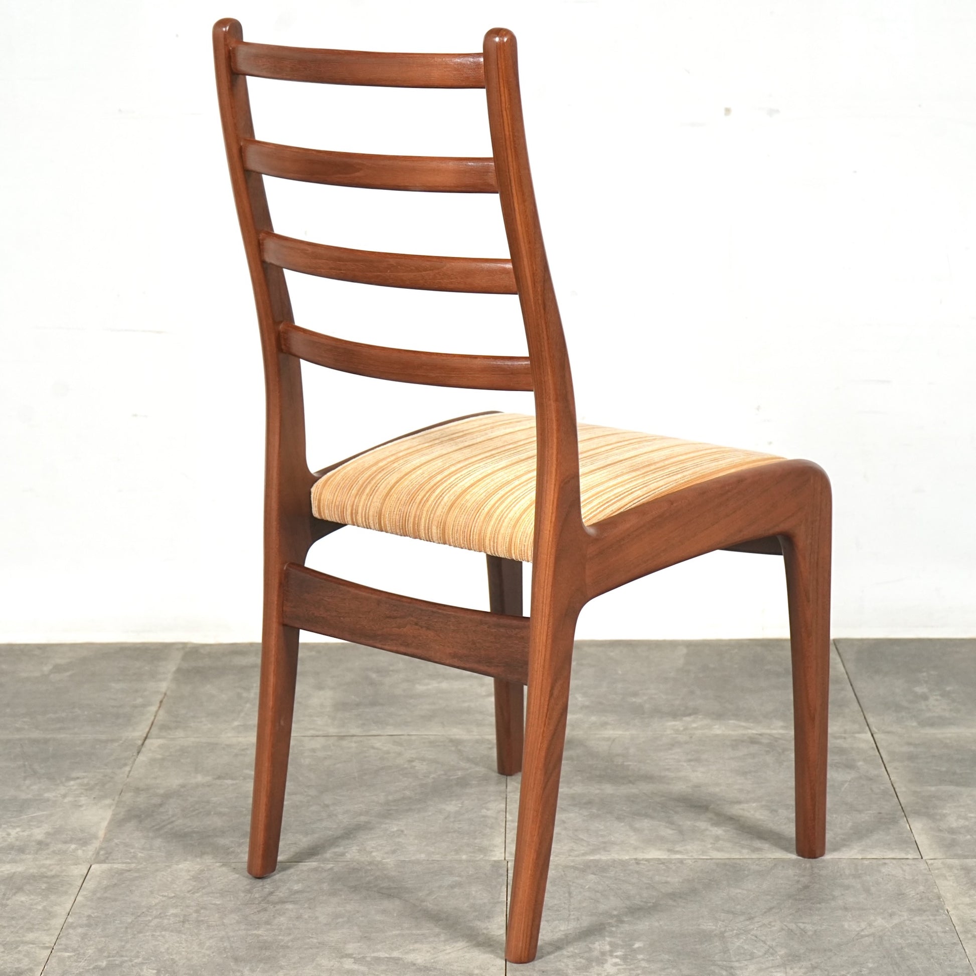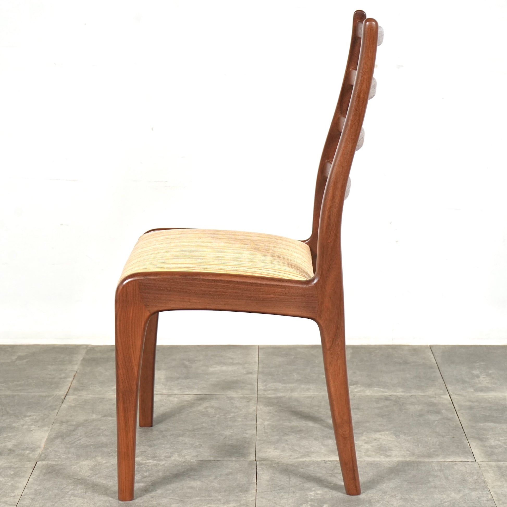 良質なチーク材のフレームはラダーバックとも呼ばれる背もたれが特徴的で、全体の美しい曲線からは当時の流行であった北欧デザインの影響をしっかりと感じ取ることができます。