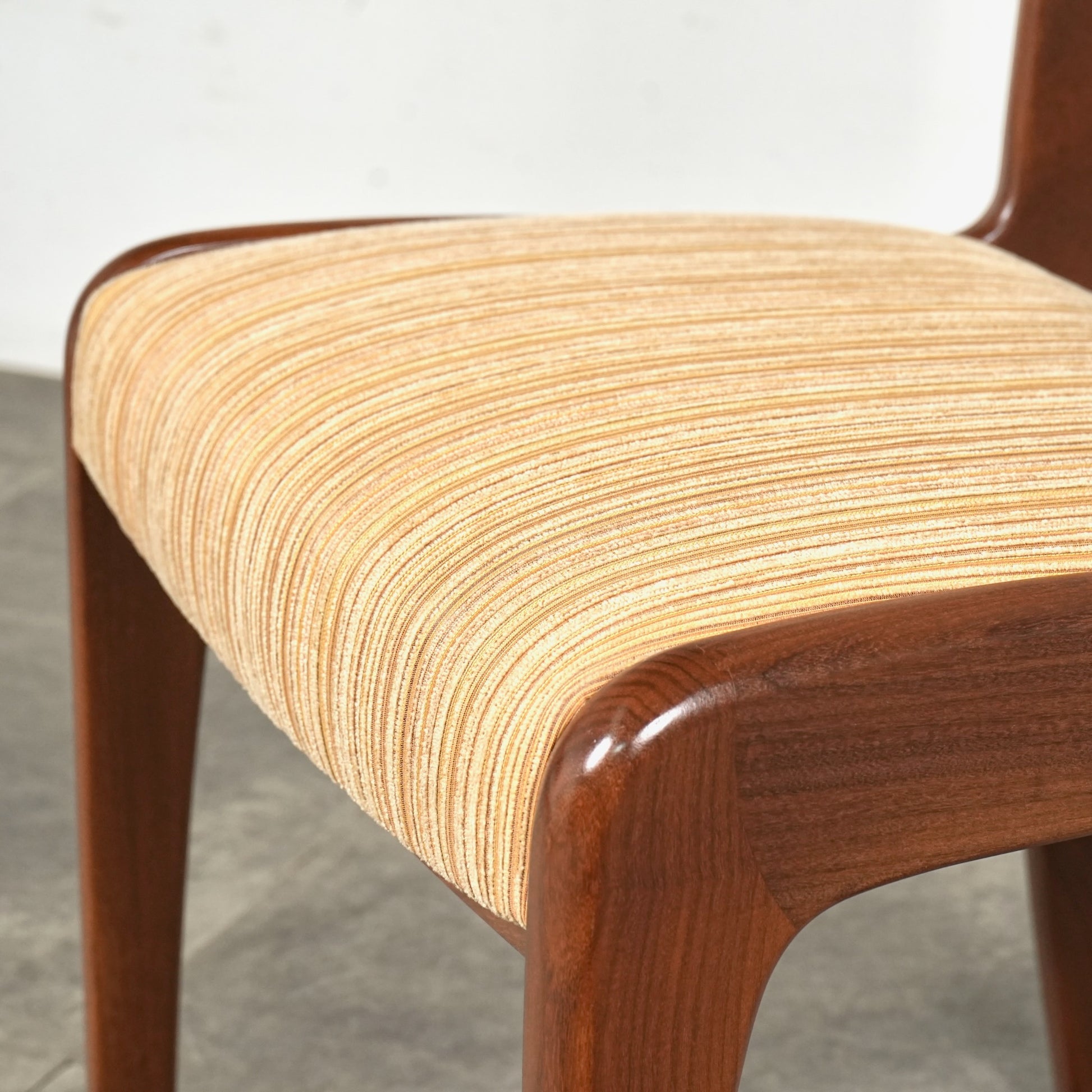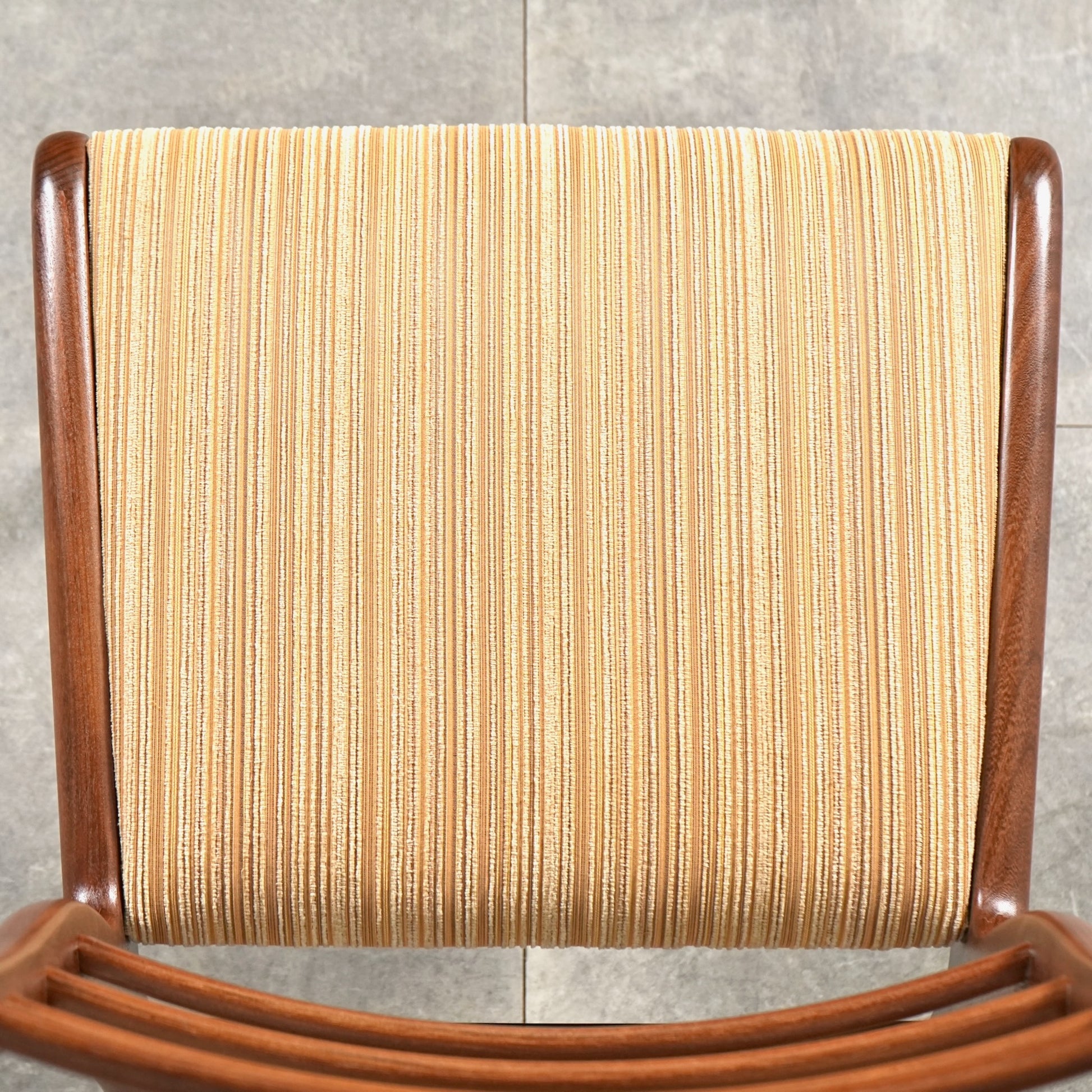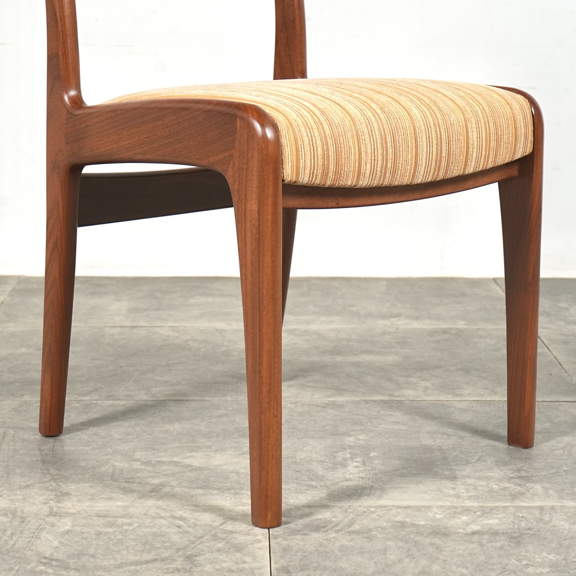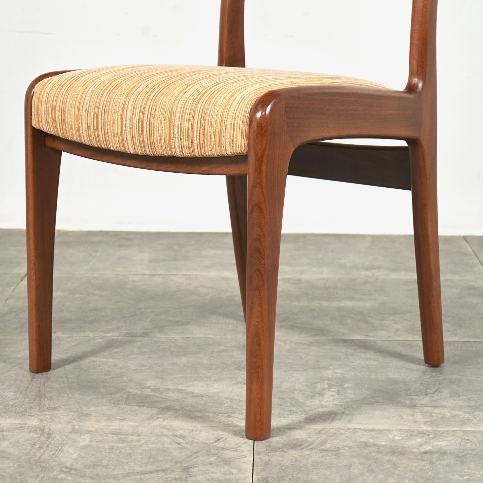 良質なチーク材のフレームはラダーバックとも呼ばれる背もたれが特徴的で、全体の美しい曲線からは当時の流行であった北欧デザインの影響をしっかりと感じ取ることができます。