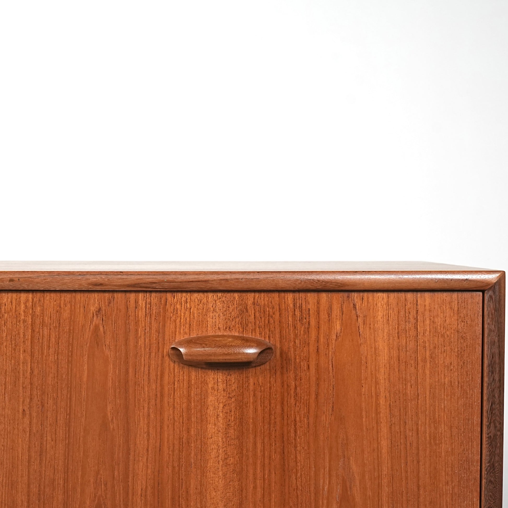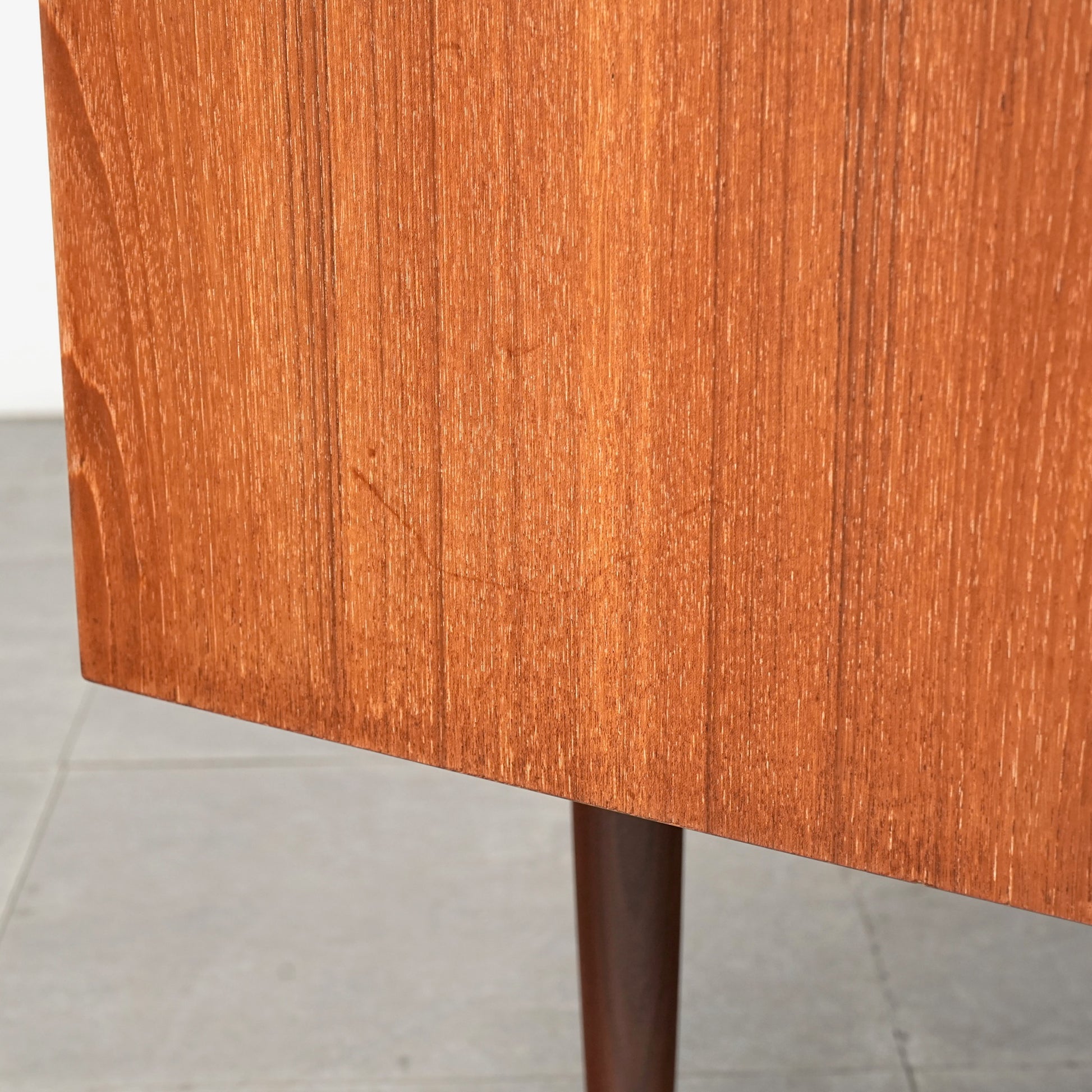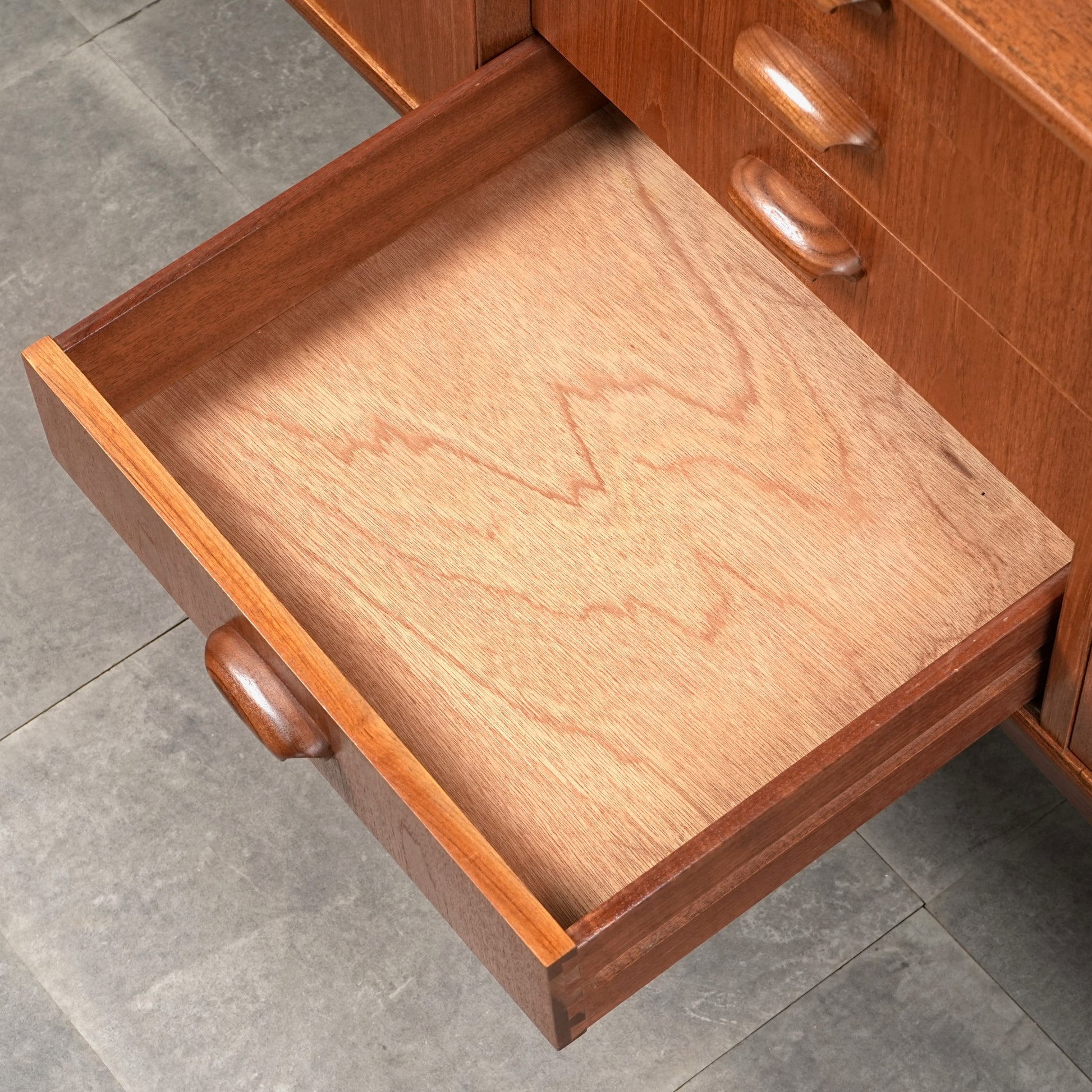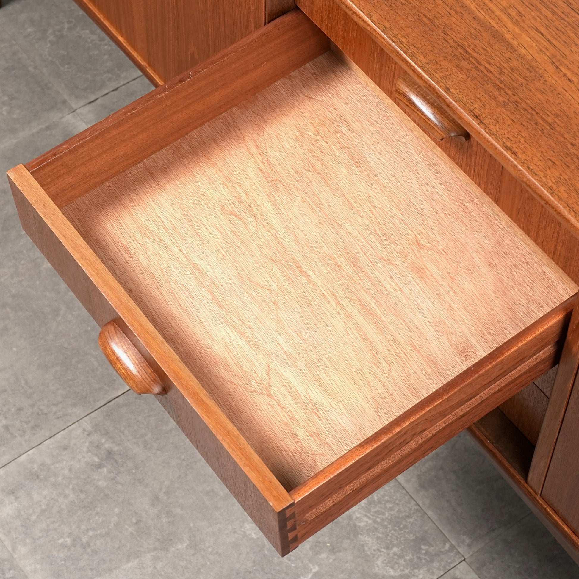 良質なチーク材を全体に使用しており、取手や脚部のシャープで美しいフォルムや細部の丁寧な作り込みなど、英国ヴィンテージの名作と呼ぶに相応しいハイグレードなアイテムです。