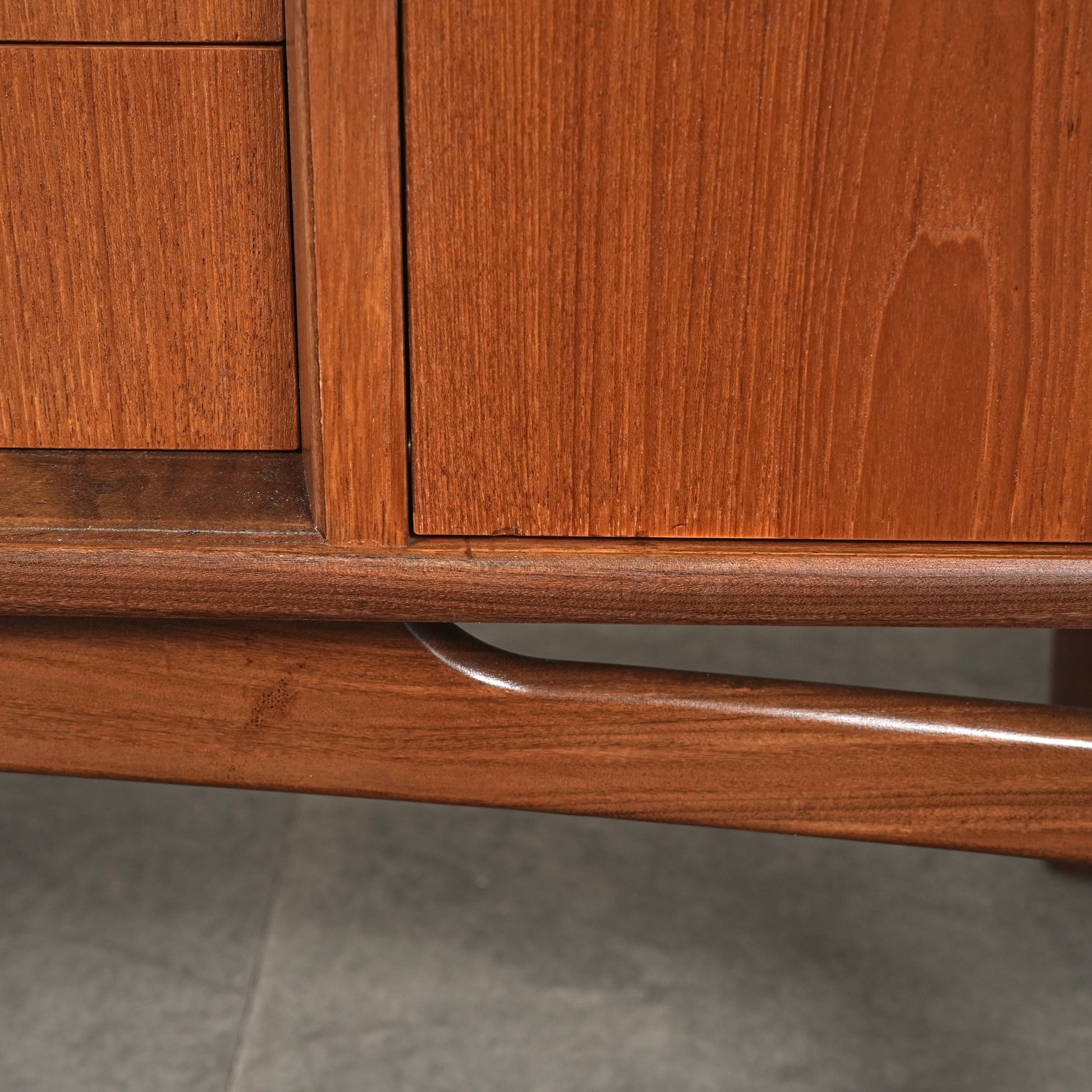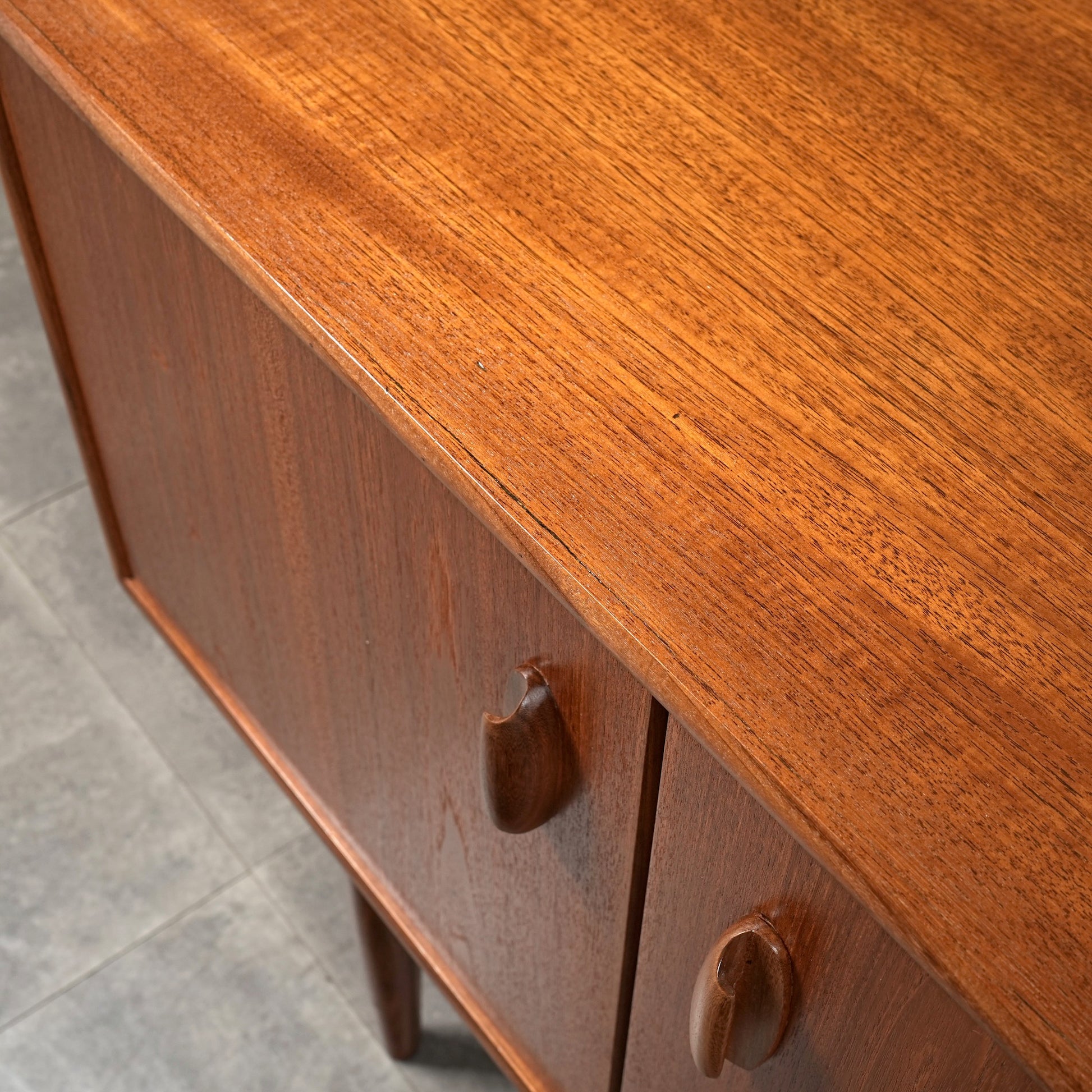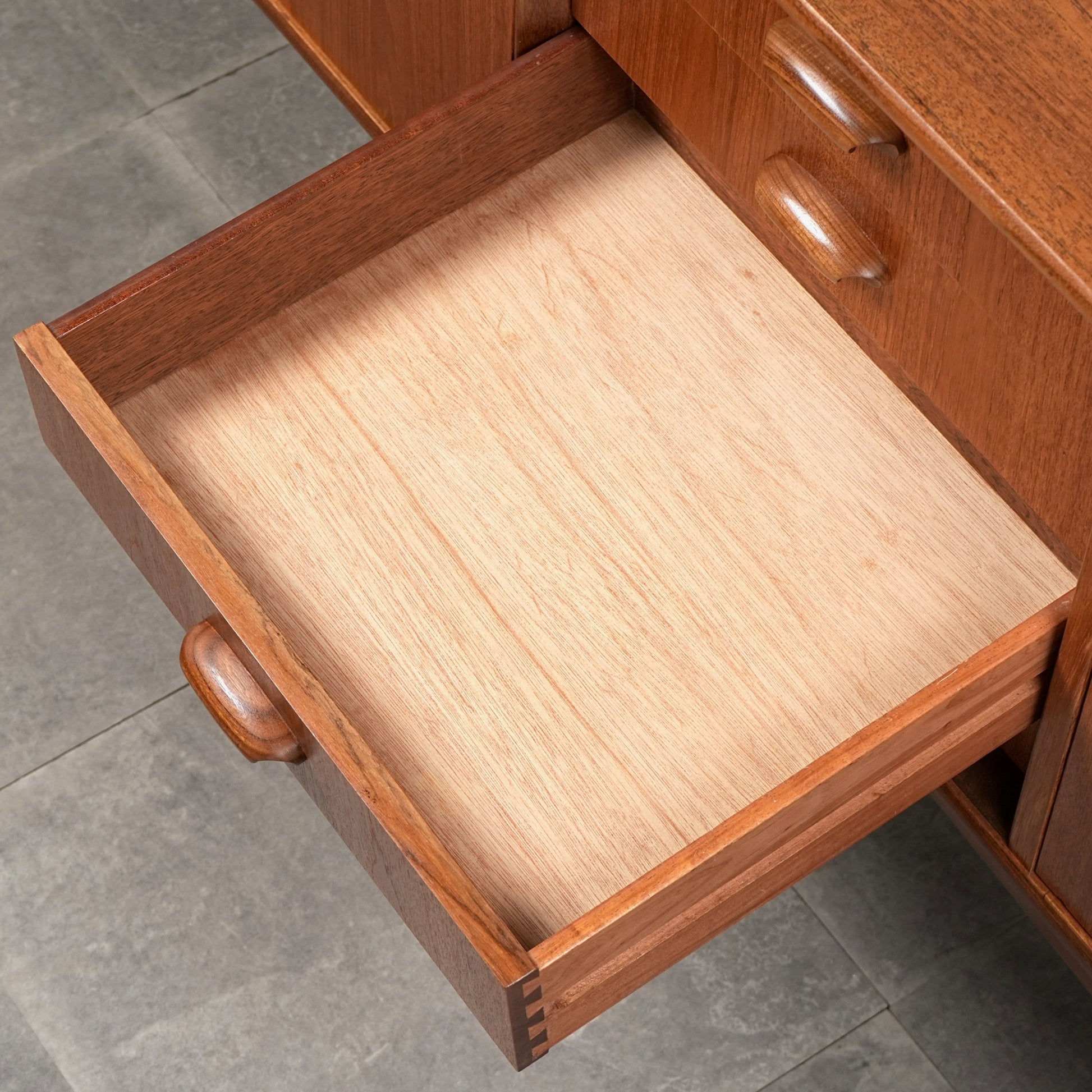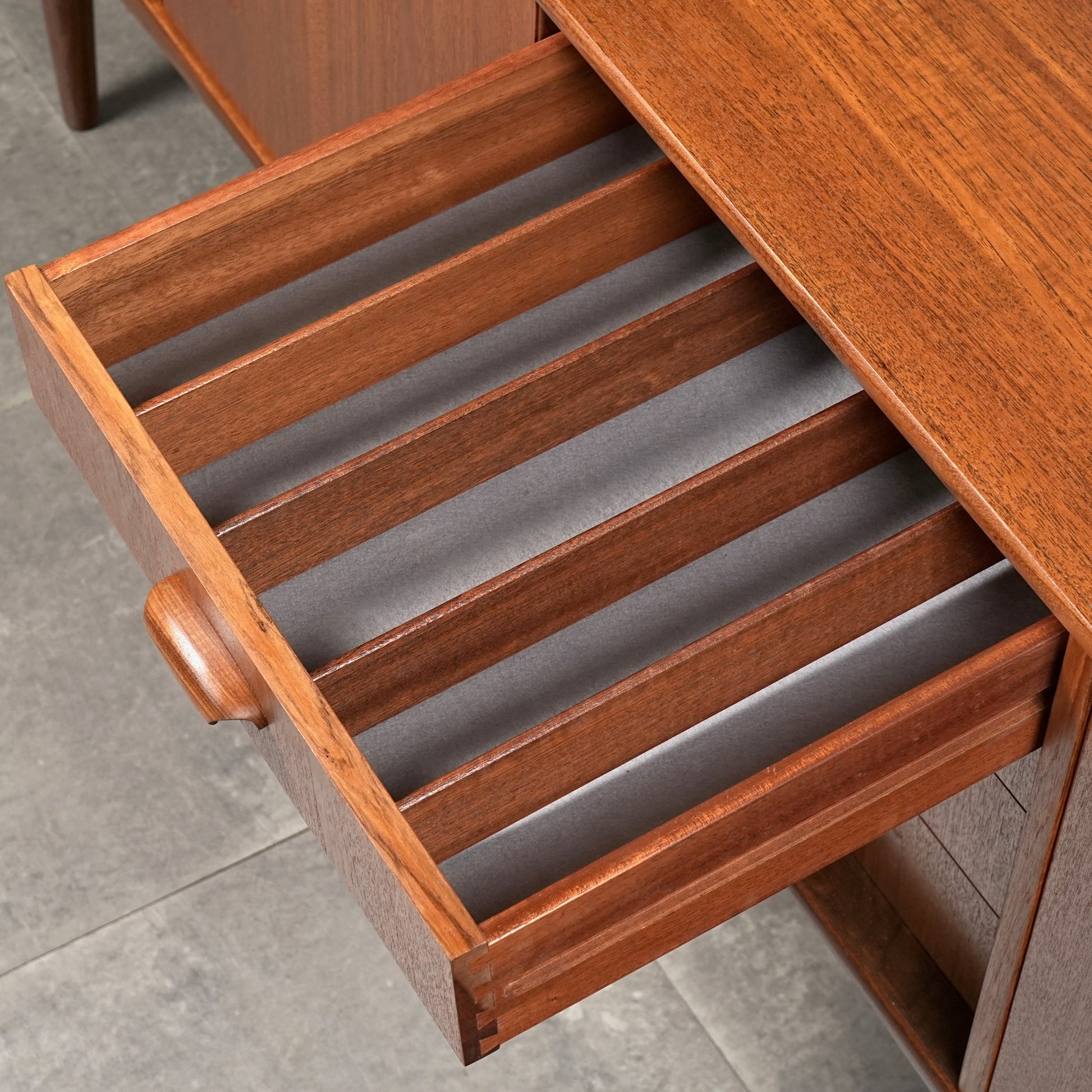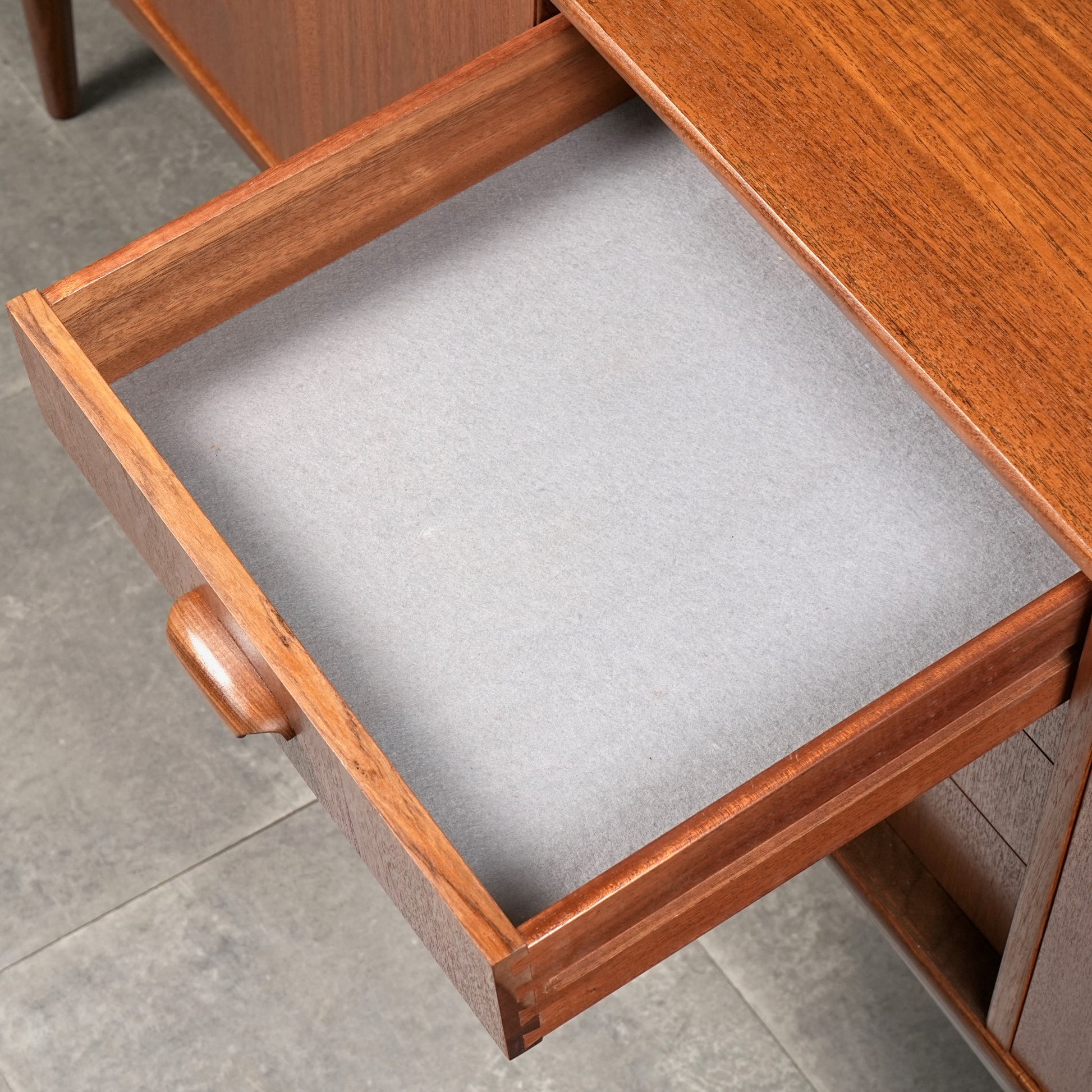 良質なチーク材を全体に使用しており、取手や脚部のシャープで美しいフォルムや細部の丁寧な作り込みなど、英国ヴィンテージの名作と呼ぶに相応しいハイグレードなアイテムです。